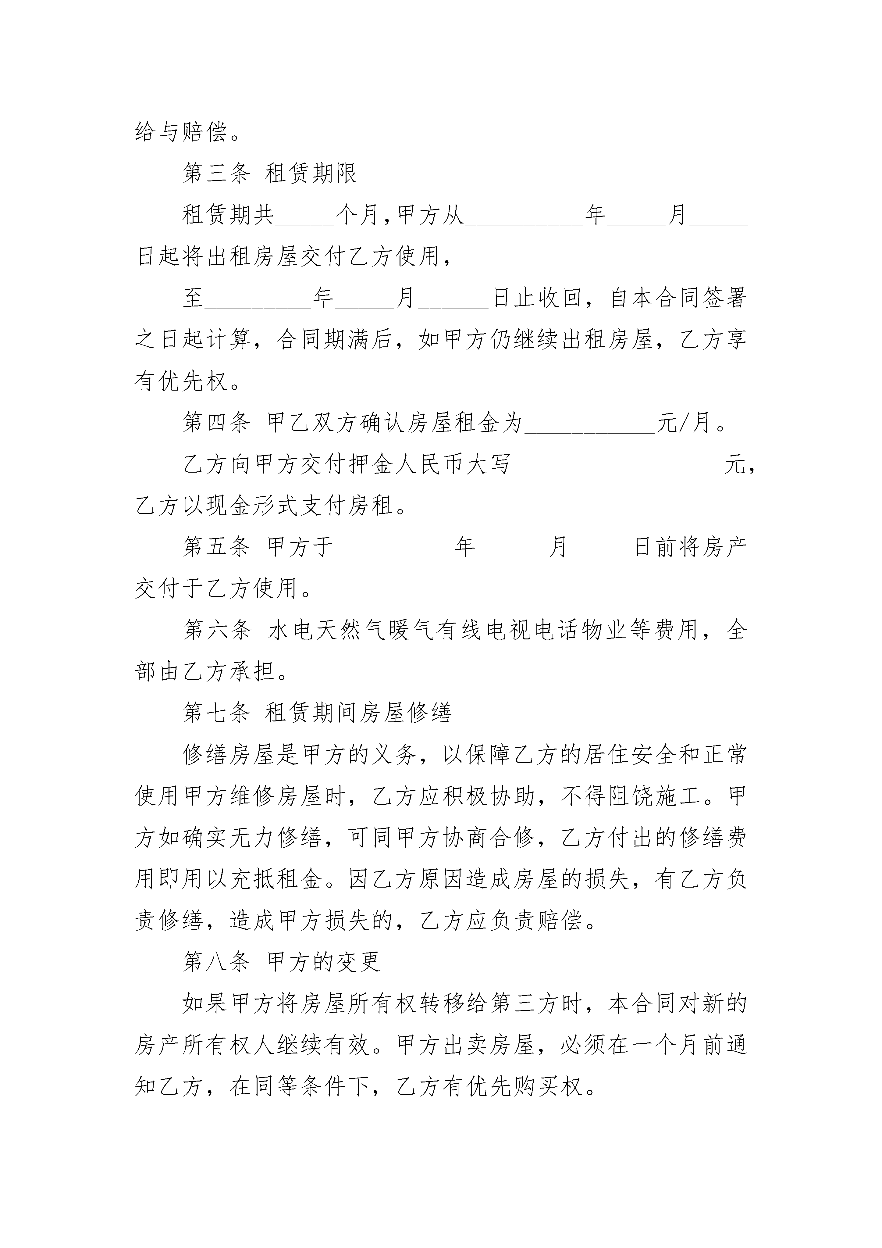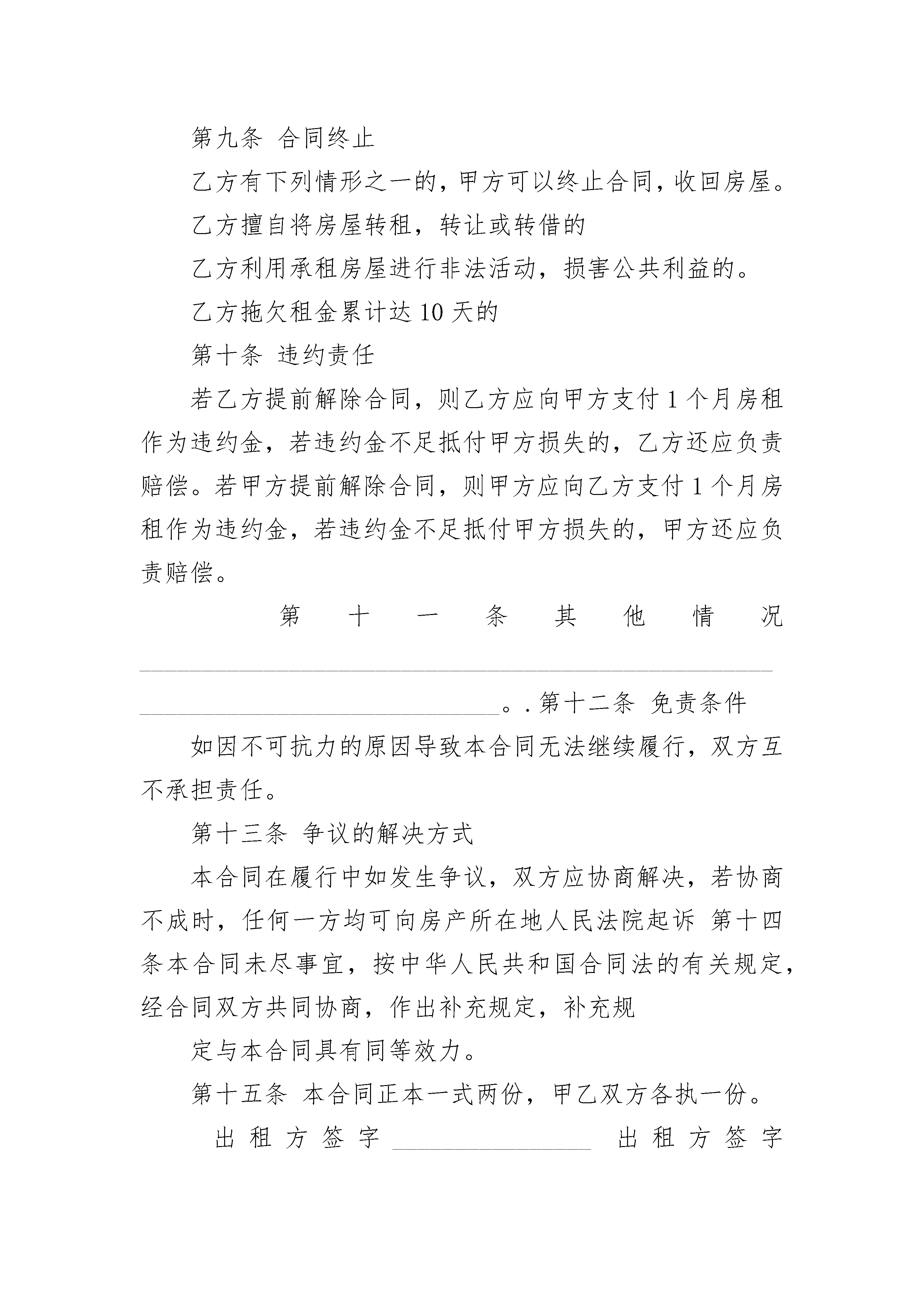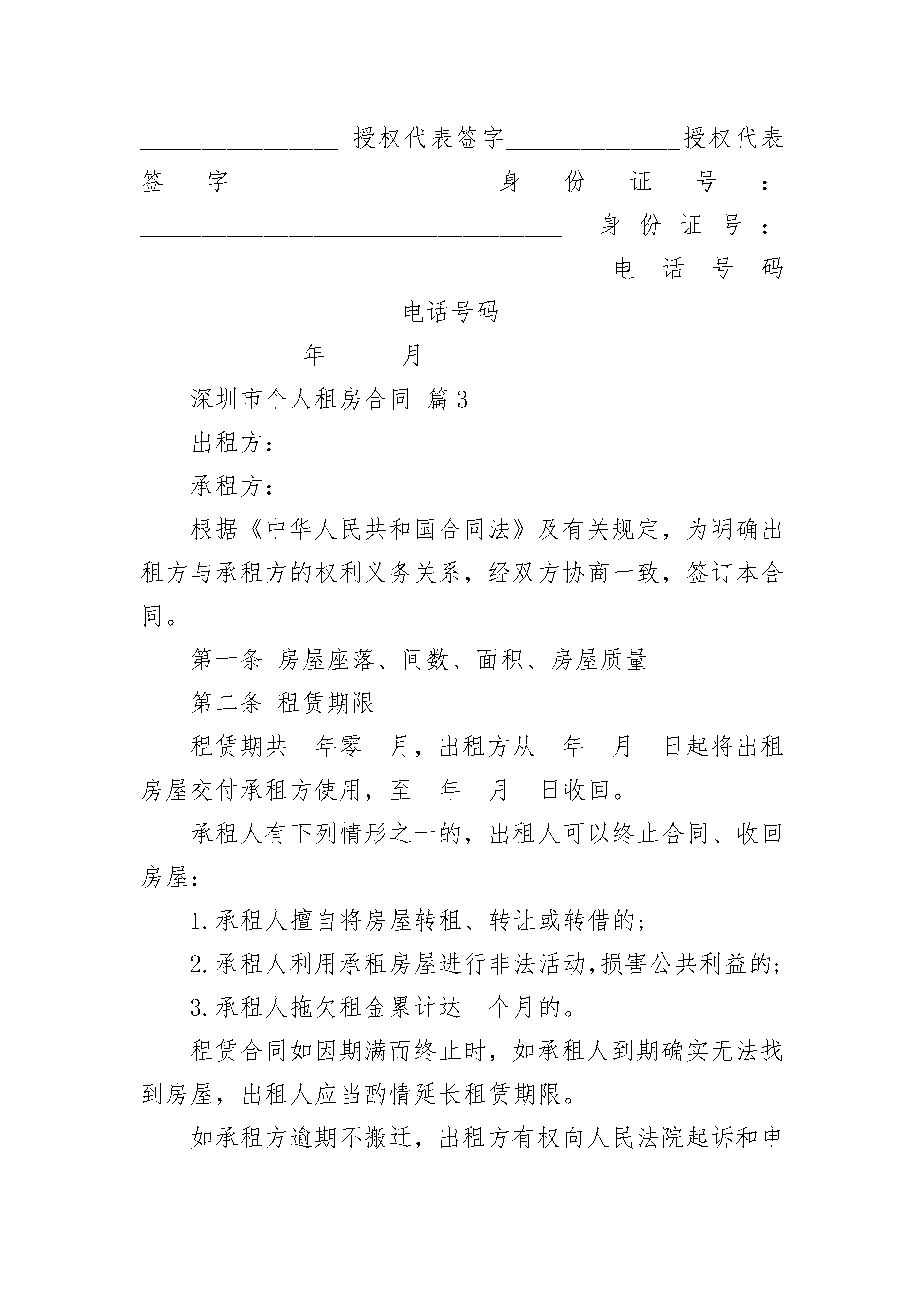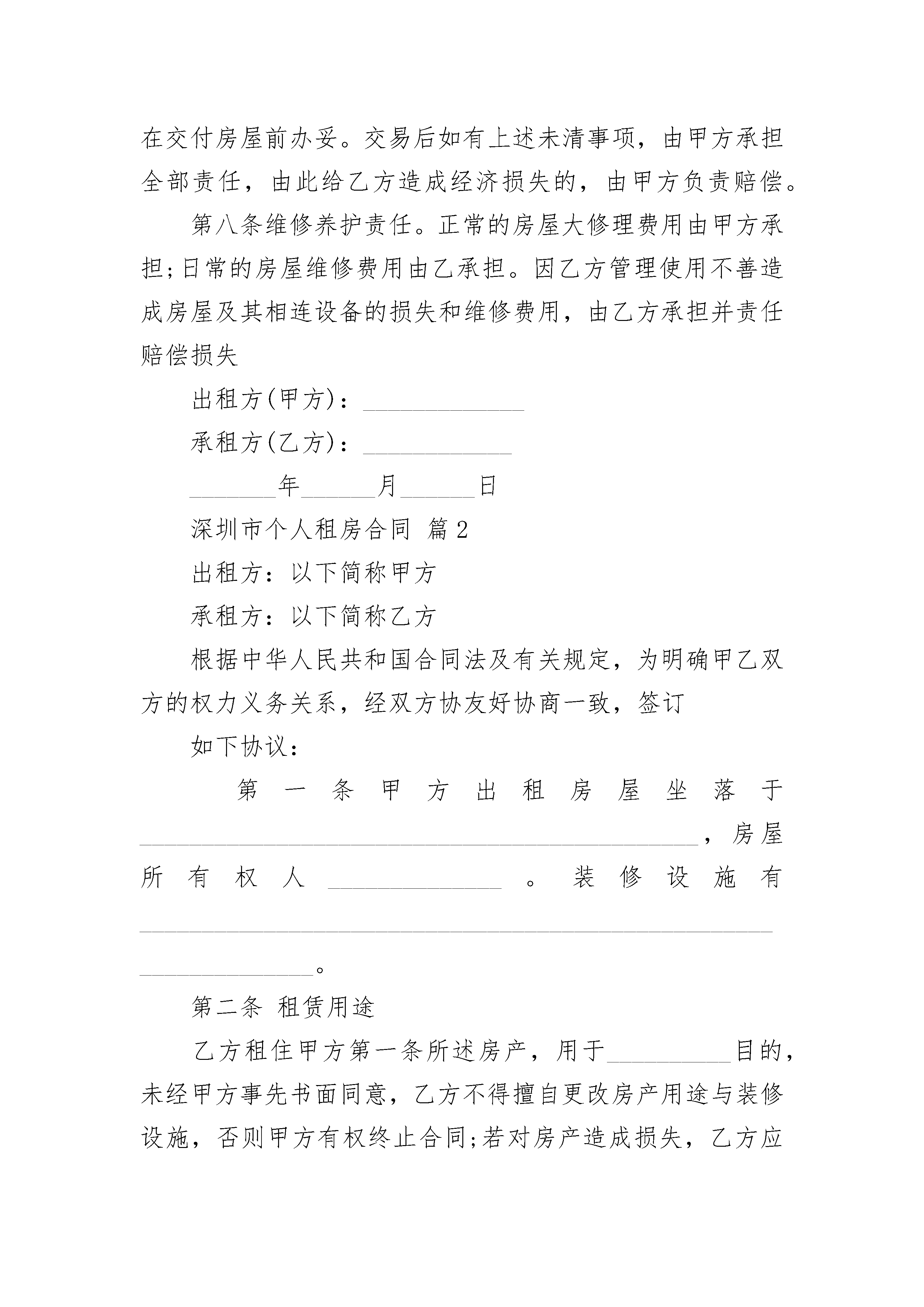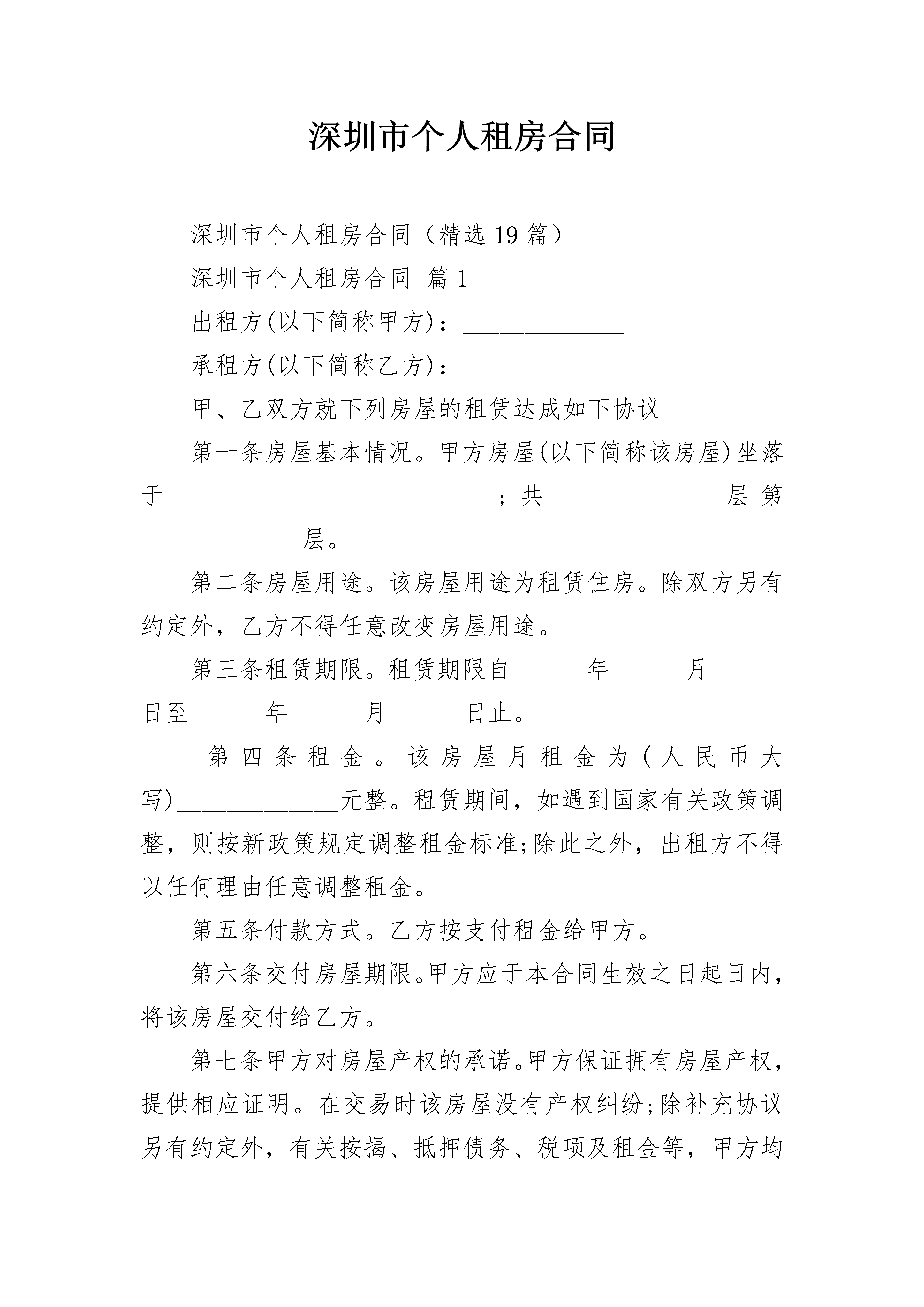 深圳市个人租房合同深圳市个人租房合同(精选19篇)深圳市个人租房合同篇1出租方(以下简称甲方):_____________承租方(以下简称乙方):_____________甲、乙双方就下列房屋的租赁达成如下协议第一条房屋基本情况。甲方房屋(以下简称该房屋)坐落于__________________________;共_____________层第_____________层。第二条房屋用途。该房屋用途为租赁住房。除双方另有约定外,乙方不得任意改变房屋用途。第三条租赁期限。租赁期限自______年______月______日至______年______月______日止。第四条租金。该房屋月租金为(人民币大写)_____________元整。租赁期间,如遇到国家有关政策调整,则按新政策规定调整租金标准;除此之外,出租方不得以任何理由任意调整租金。第五条付款方式。乙方按支付租金给甲方。第六条交付房屋期限。甲方应于本合同生效之日起日内,将该房屋交付给乙方。第七条甲方对房屋产权的承诺。甲方保证拥有房屋产权,提供相应证明。在交易时该房屋没有产权纠纷;除补充协议另有约定外,有关按揭、抵押债务、税项及租金等,甲方均在交付房屋前办妥。交易后如有上述未清事项,由甲方承担全部责任,由此给乙方造成经济损失的,由甲方负责赔偿。第八条维修养护责任。正常的房屋大修理费用由甲方承担;日常的房屋维修费用由乙承担。因乙方管理使用不善造成房屋及其相连设备的损失和维修费用,由乙方承担并责任赔偿损失出租方(甲方):_____________承租方(乙方):___________________年______月______日深圳市个人租房合同篇2出租方:以下简称甲方承租方:以下简称乙方根据中华人民共和国合同法及有关规定,为明确甲乙双方的权力义务关系,经双方协友好协商一致,签订如下协议:第一条甲方出租房屋坐落于_____________________________________________,房屋所有权人______________。装修设施有_________________________________________________________________。第二条租赁用途乙方租住甲方第一条所述房产,用于__________目的,未经甲方事先书面同意,乙方不得擅自更改房产用途与装修设施,否则甲方有权终止合同;若对房产造成损失,乙方应给与赔偿。第三条租赁期限租赁期共_____个月,甲方从__________年_____月_____日起将出租房屋交付乙方使用,至_________年_____月______日止收回,自本合同签署之日起计算,合同期满后,如甲方仍继续出租房屋,乙方享有优先权。第四条甲乙双方确认房屋租金为___________元/月。乙方向甲方交付押金人民币大写__________________元,乙方以现金形式支付房租。第五条甲方于__________年______月_____日前将房产交付于乙方使用。第六条水电天然气暖气有线电视电话物业等费用,全部由乙方承担。第七条租赁期间房屋修缮修缮房屋是甲方的义务,以保障乙方的居住安全和正常使用甲方维修房屋时,乙方应积极协助,不得阻饶施工。甲方如确实无力修缮,可同甲方协商合修,乙方付出的修缮费用即用以充抵租金。因乙方原因造成房屋的损失,有乙方负责修缮,造成甲方损失的,乙方应负责赔偿。第八条甲方的变更如果甲方将房屋所有权转移给第三方时,本合同对新的房产所有权人继续有效。甲方出卖房屋,必须在一个月前通知乙方,在同等条件下,乙方有优先购买权。第九条合同终止乙方有下列情形之一的,甲方可以终止合同,收回房屋。乙方擅自将房屋转租,转让或转借的乙方利用承租房屋进行非法活动,损害公共利益的。乙方拖欠租金累计达10天的第十条违约责任若乙方提前解除合同,则乙方应向甲方支付1个月房租作为违约金,若违约金不足抵付甲方损失的,乙方还应负责赔偿。若甲方提前解除合同,则甲方应向乙方支付1个月房租作为违约金,若违约金不足抵付甲方损失的,甲方还应负责赔偿。第十一条其他情况________________________________________________________________________________。.第十二条免责条件如因不可抗力的原因导致本合同无法继续履行,双方互不承担责任。第十三条争议的解决方式本合同在履行中如发生争议,双方应协商解决,若协商不成时,任何一方均可向房产所在地人民法院起诉第十四条本合同未尽事宜,按中华人民共和国合同法的有关规定,经合同双方共同协商,作出补充规定,补充规定与本合同具有同等效力。第十五条本合同正本一式两份,甲乙双方各执一份。出租方签字________________出租
