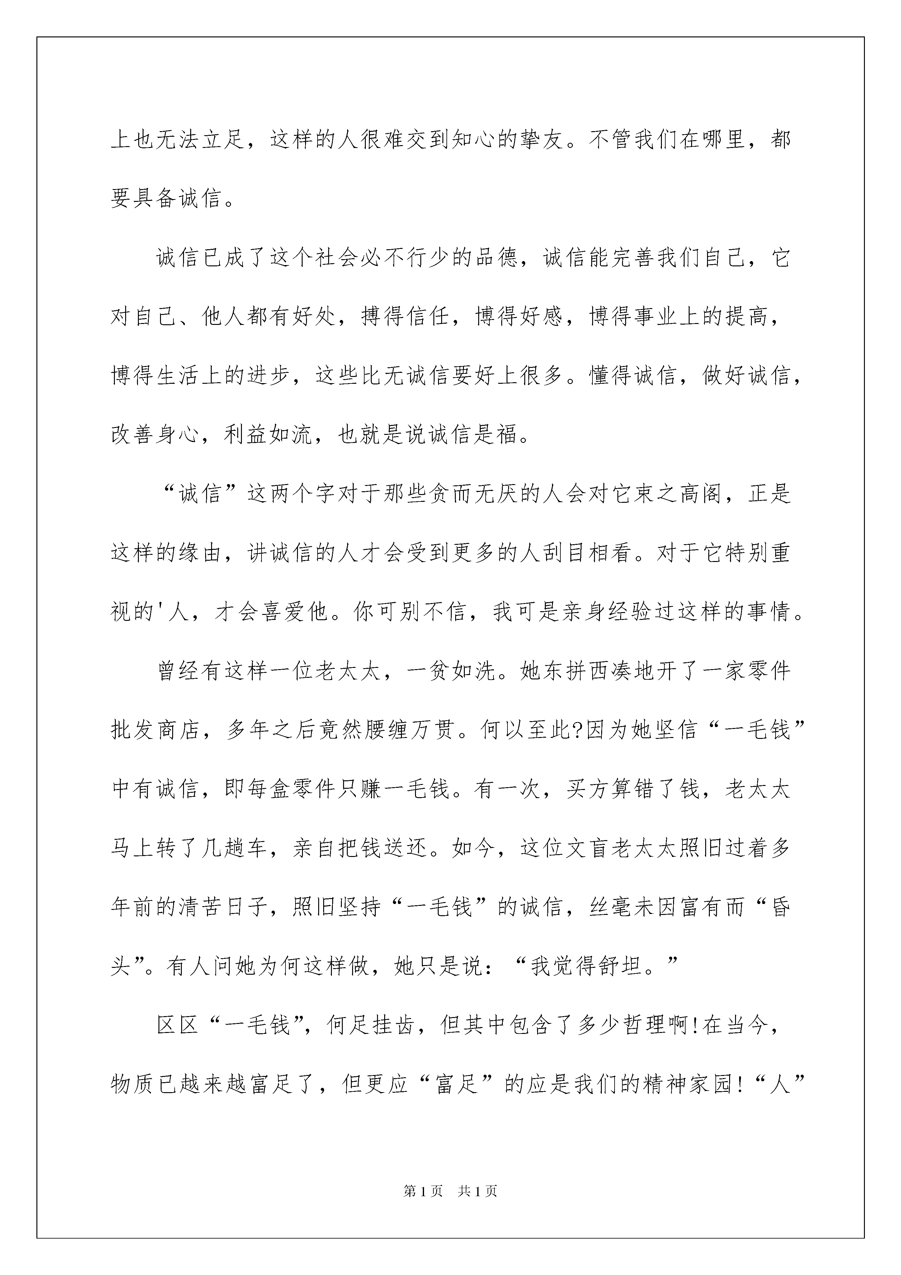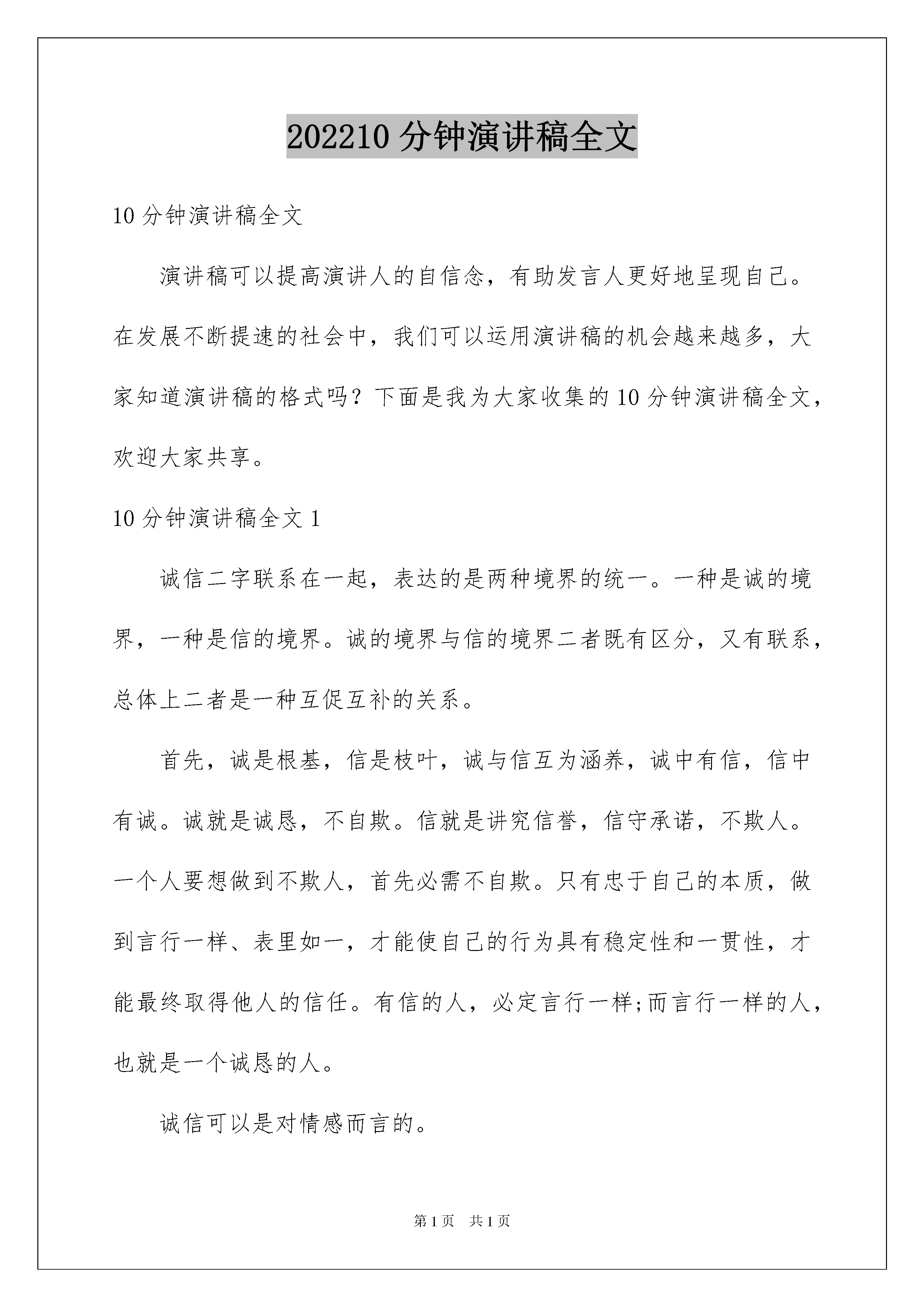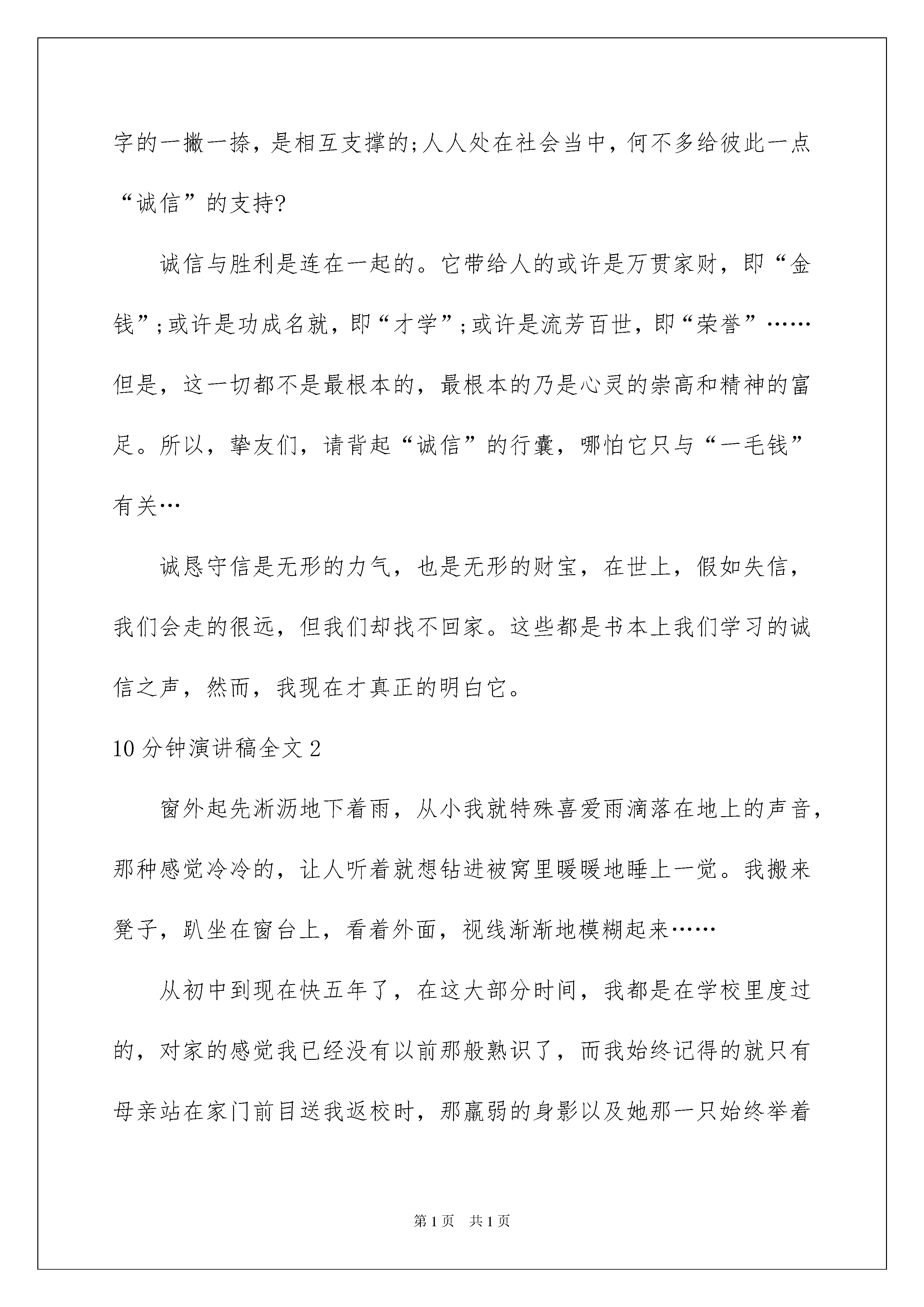 202210分钟演讲稿全文10分钟演讲稿全文演讲稿可以提高演讲人的自信念,有助发言人更好地呈现自己。在发展不断提速的社会中,我们可以运用演讲稿的机会越来越多,大家知道演讲稿的格式吗?下面是我为大家收集的10分钟演讲稿全文,欢迎大家共享。10分钟演讲稿全文1诚信二字联系在一起,表达的是两种境界的统一。一种是诚的境界,一种是信的境界。诚的境界与信的境界二者既有区分,又有联系,总体上二者是一种互促互补的关系。首先,诚是根基,信是枝叶,诚与信互为涵养,诚中有信,信中有诚。诚就是诚恳,不自欺。信就是讲究信誉,信守承诺,不欺人。一个人要想做到不欺人,首先必需不自欺。只有忠于自己的本质,做到言行一样、表里如一,才能使自己的行为具有稳定性和一贯性,才能最终取得他人的信任。有信的人,必定言行一样;而言行一样的人,也就是一个诚恳的人。诚信可以是对情感而言的。诚信是每个人心中的美德,是一种品质,在我们这个人文社会,不管在哪一个方面,都要讲究诚信,诚信是福,一个拥有诚信的人不管在事业方面,还是在生活方面都会取得胜利,所以诚信是一个人最为重要的一项方面。诚信是讲究方方面面的,商业、工作、生活、交友……都要讲究诚信,人们须要诚信维持关系;商业须要诚信来维持自己的生计,维持与其它公司的合作。诚信可以使他人对自己有好感,诚信也可以让自己的事业和生活得到提高。诚信小到可以使自己的身心得到提高,大到可以使自己一举成名。诚信能够帮助自己取得在事业上的成就,也能取得在生活上的欢乐。诚信不仅是说,也要行动。诚信须要坚持,只有坚持才会提高,只有坚持才能保持自己不变的品德,在诚恳中可以改善自己的身心,磨练自己的耐力诚恳须要英勇和谨慎,信用须要坚持和完善,只有做到这样,自己才能完完全全的是诚信的人。诚信最基本的一点就是不欺瞒他人、不守信用,一个无诚信的人就是丢失了品德,是一个身心不健康的人,不仅损害了自己,也损害了他人,可以说就是骗子,这样的人不但得不到他人的信任,在社会上也无法立足,这样的人很难交到知心的挚友。不管我们在哪里,都要具备诚信。诚信已成了这个社会必不行少的品德,诚信能完善我们自己,它对自己、他人都有好处,搏得信任,博得好感,博得事业上的提高,博得生活上的进步,这些比无诚信要好上很多。懂得诚信,做好诚信,改善身心,利益如流,也就是说诚信是福。“诚信”这两个字对于那些贪而无厌的人会对它束之高阁,正是这样的缘由,讲诚信的人才会受到更多的人刮目相看。对于它特别重视的'人,才会喜爱他。你可别不信,我可是亲身经验过这样的事情。曾经有这样一位老太太,一贫如洗。她东拼西凑地开了一家零件批发商店,多年之后竟然腰缠万贯。何以至此?因为她坚信“一毛钱”中有诚信,即每盒零件只赚一毛钱。有一次,买方算错了钱,老太太马上转了几趟车,亲自把钱送还。如今,这位文盲老太太照旧过着多年前的清苦日子,照旧坚持“一毛钱”的诚信,丝毫未因富有而“昏头”。有人问她为何这样做,她只是说:“我觉得舒坦。”区区“一毛钱”,何足挂齿,但其中包含了多少哲理啊!在当今,物质已越来越富足了,但更应“富足”的应是我们的精神家园!“人”字的一撇一捺,是相互支撑的;人人处在社会当中,何不多给彼此一点“诚信”的支持?诚信与胜利是连在一起的。它带给人的或许是万贯家财,即“金钱”;或许是功成名就,即“才学”;或许是流芳百世,即“荣誉”……但是,这一切都不是最根本的,最根本的乃是心灵的崇高和精神的富足。所以,挚友们,请背起“诚信”的行囊,哪怕它只与“一毛钱”有关…诚恳守信是无形的力气,也是无形的财宝,在世上,假如失信,我们会走的很远,但我们却找不回家。这些都是书本上我们学习的诚信之声,然而,我现在才真正的明白它。10分钟演讲稿全文2窗外起先淅沥地下着雨,从小我就特殊喜爱雨滴落在地上的声音,那种感觉冷冷的,让人听着就想钻进被窝里暖暖地睡上一觉。我搬来凳子,趴坐在窗台上,看着外面,视线渐渐地模糊起来……从初中到现在快五年了,在这大部分时间,我都是在学校里度过的,对家的感觉我已经没有以前那般熟识了,而我始终记得的就只有母亲站在家门前目送我返校时,那羸弱的身影以及她那一只始终举着的手。刚上初中的那段生活的确是艰难的。因为家在几十公里外,我起先了寄宿生活。那时侯我们不谙世事,对于新环境即使有再大的新奇心,却也难以在短时间内很好的适应。虽然在家里,我已习惯了做家务活,诸如洗衣服,洗碗筷的活我可以一揽无余,但让我感到艰难的并不是体力劳动,因为想家,我每个星期都会回家一次;因为离不开母亲的暖和,我一次次把那份酸泪忍下,母亲说过:作为她的儿子,就得学会坚毅。母亲也没有常来看我,只是买了一只手电