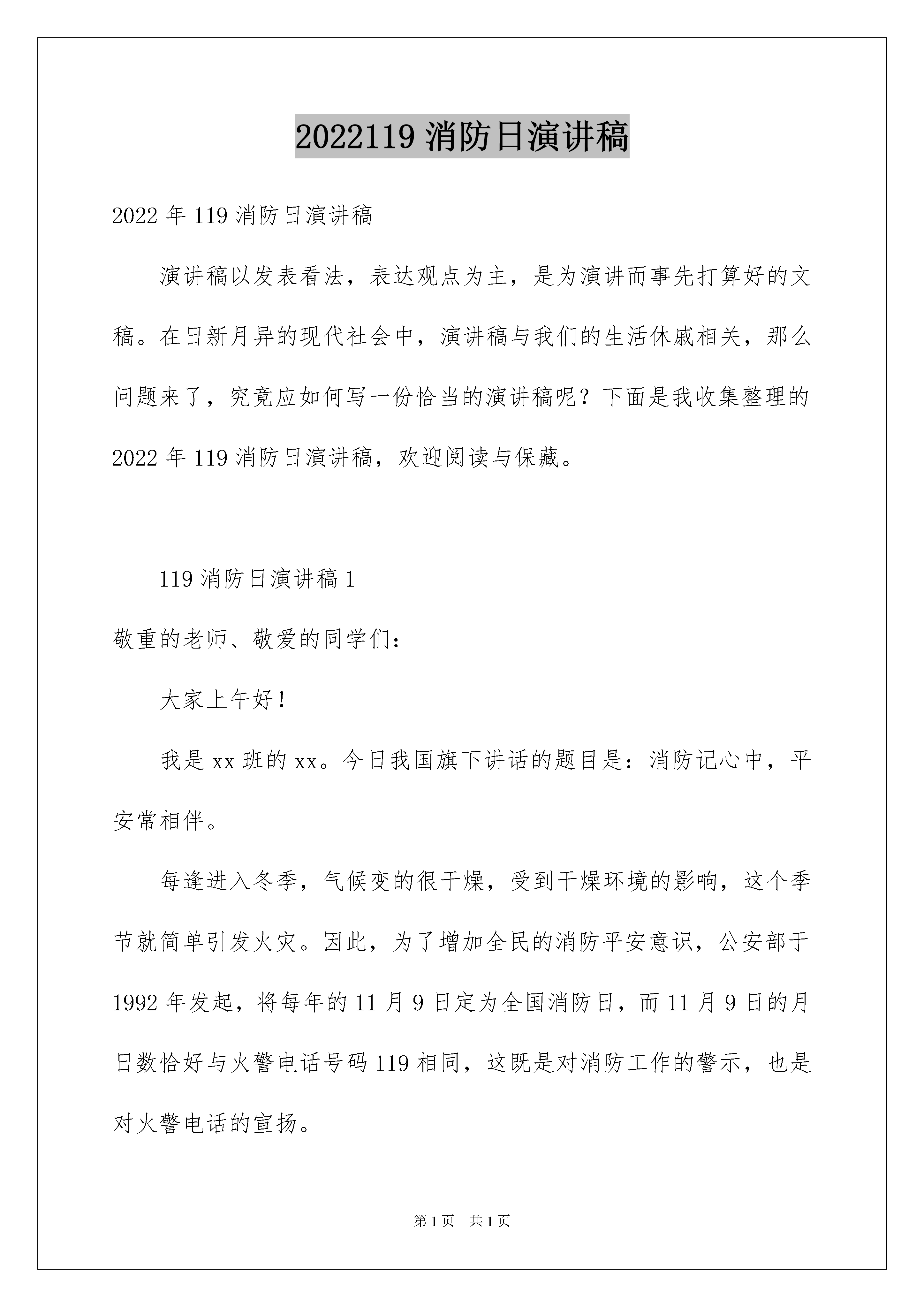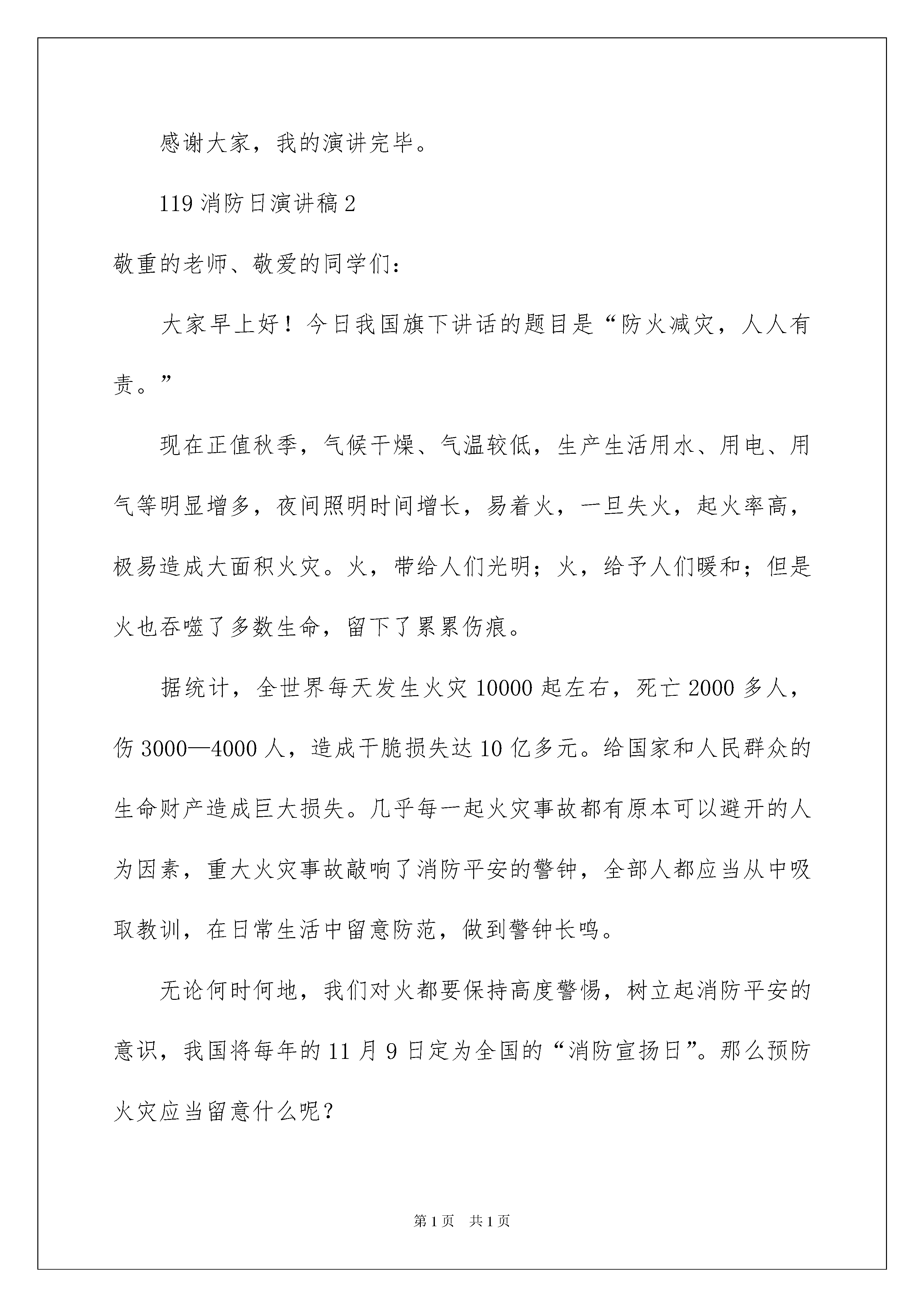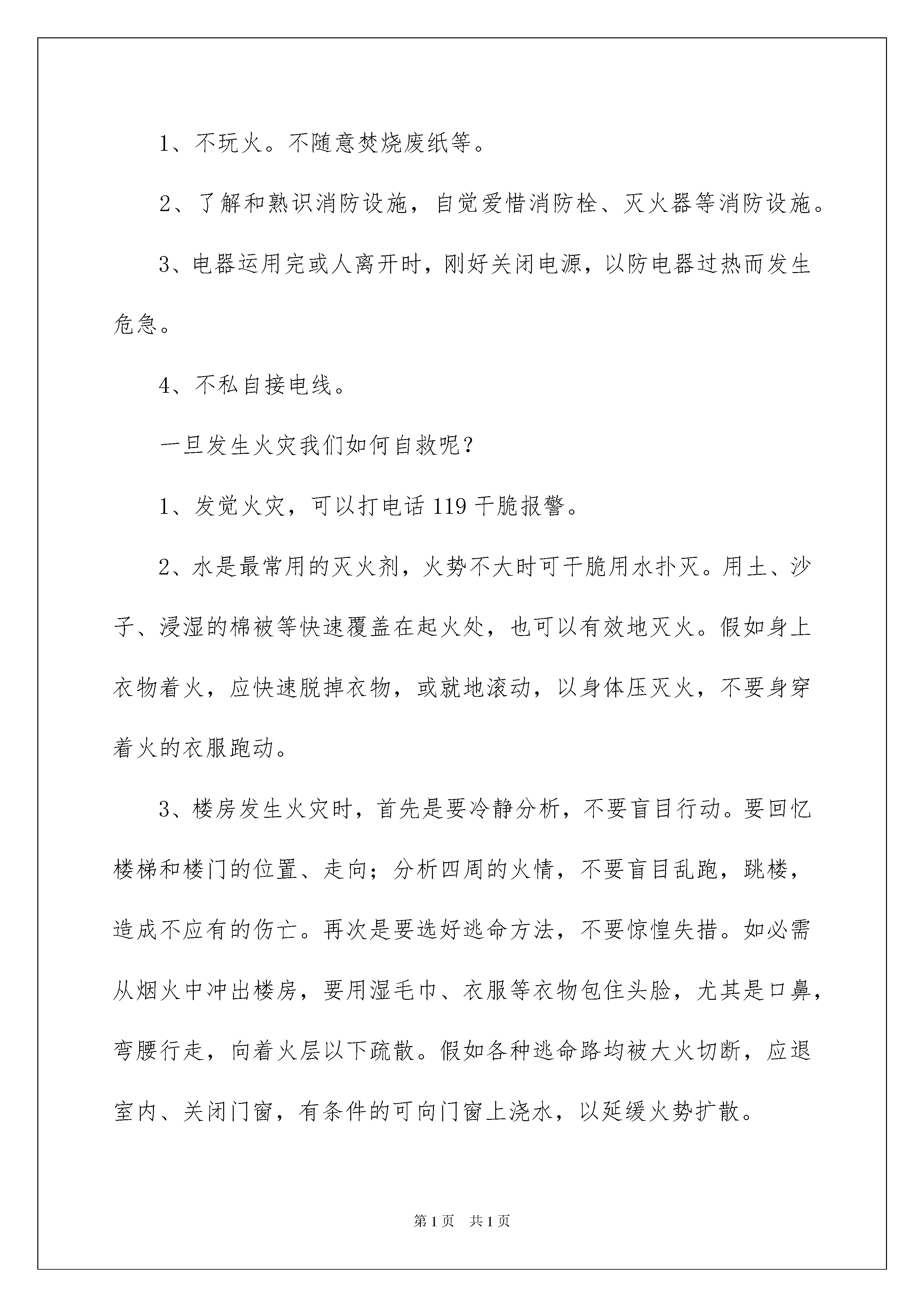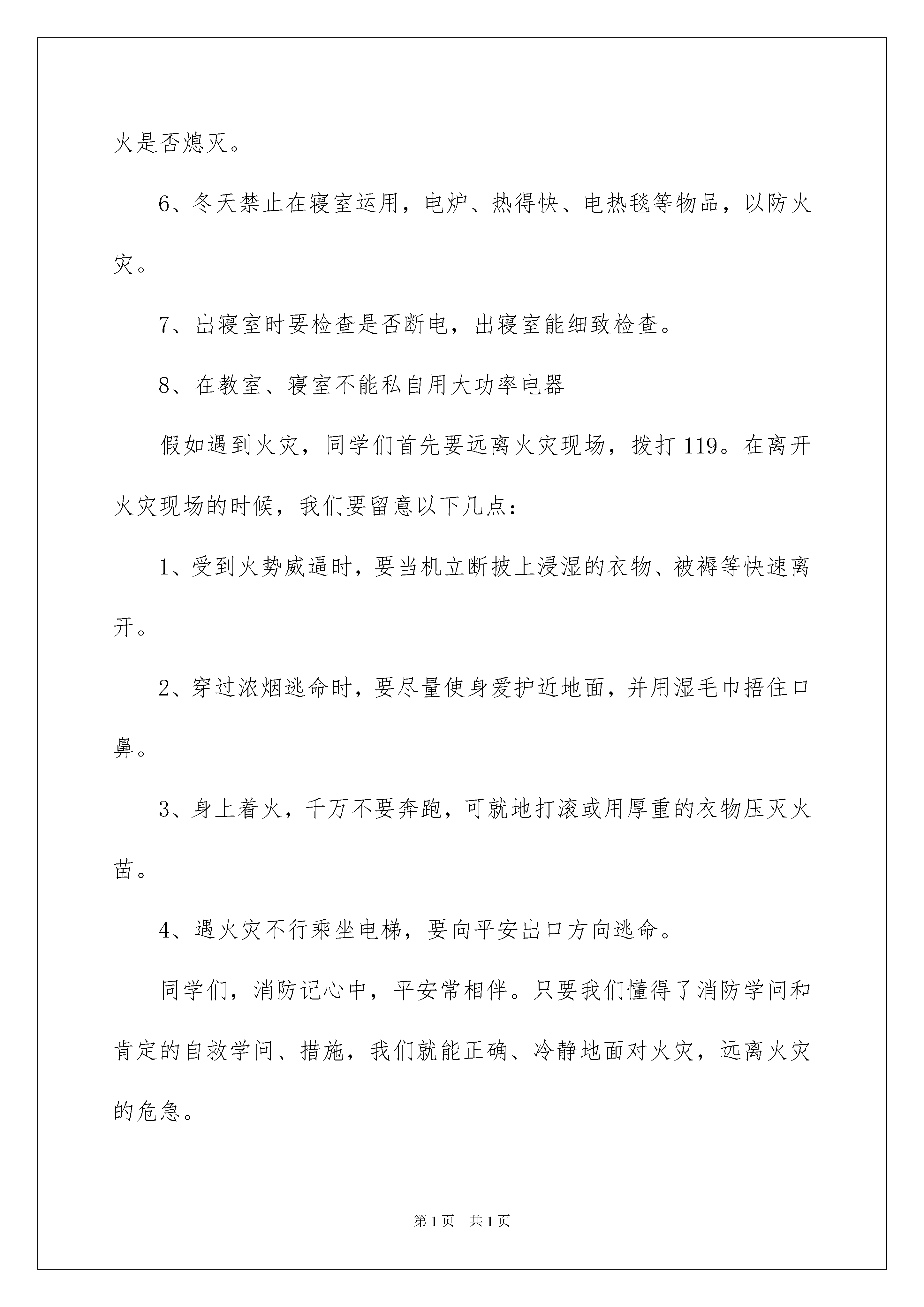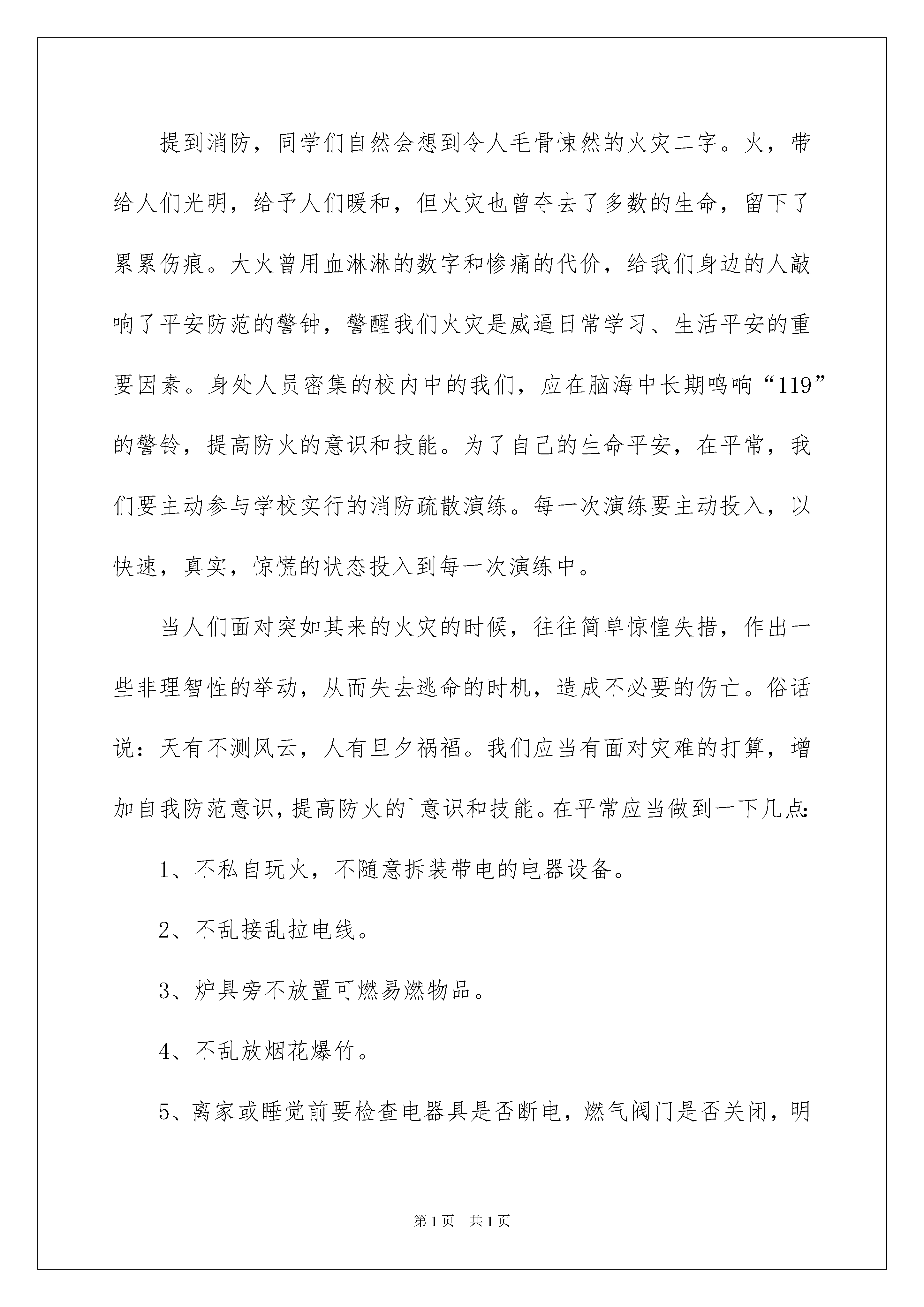 2022119消防日演讲稿2022年119消防日演讲稿演讲稿以发表看法,表达观点为主,是为演讲而事先打算好的文稿。在日新月异的现代社会中,演讲稿与我们的生活休戚相关,那么问题来了,究竟应如何写一份恰当的演讲稿呢?下面是我收集整理的2022年119消防日演讲稿,欢迎阅读与保藏。119消防日演讲稿1敬重的老师、敬爱的同学们:大家上午好!我是xx班的xx。今日我国旗下讲话的题目是:消防记心中,平安常相伴。每逢进入冬季,气候变的很干燥,受到干燥环境的影响,这个季节就简单引发火灾。因此,为了增加全民的消防平安意识,公安部于1992年发起,将每年的11月9日定为全国消防日,而11月9日的月日数恰好与火警电话号码119相同,这既是对消防工作的警示,也是对火警电话的宣扬。提到消防,同学们自然会想到令人毛骨悚然的火灾二字。火,带给人们光明,给予人们暖和,但火灾也曾夺去了多数的生命,留下了累累伤痕。大火曾用血淋淋的数字和惨痛的代价,给我们身边的人敲响了平安防范的警钟,警醒我们火灾是威逼日常学习、生活平安的重要因素。身处人员密集的校内中的我们,应在脑海中长期鸣响“119”的警铃,提高防火的意识和技能。为了自己的生命平安,在平常,我们要主动参与学校实行的消防疏散演练。每一次演练要主动投入,以快速,真实,惊慌的状态投入到每一次演练中。当人们面对突如其来的火灾的时候,往往简单惊惶失措,作出一些非理智性的举动,从而失去逃命的时机,造成不必要的伤亡。俗话说:天有不测风云,人有旦夕祸福。我们应当有面对灾难的打算,增加自我防范意识,提高防火的`意识和技能。在平常应当做到一下几点:1、不私自玩火,不随意拆装带电的电器设备。2、不乱接乱拉电线。3、炉具旁不放置可燃易燃物品。4、不乱放烟花爆竹。5、离家或睡觉前要检查电器具是否断电,燃气阀门是否关闭,明火是否熄灭。6、冬天禁止在寝室运用,电炉、热得快、电热毯等物品,以防火灾。7、出寝室时要检查是否断电,出寝室能细致检查。8、在教室、寝室不能私自用大功率电器假如遇到火灾,同学们首先要远离火灾现场,拨打119。在离开火灾现场的时候,我们要留意以下几点:1、受到火势威逼时,要当机立断披上浸湿的衣物、被褥等快速离开。2、穿过浓烟逃命时,要尽量使身爱护近地面,并用湿毛巾捂住口鼻。3、身上着火,千万不要奔跑,可就地打滚或用厚重的衣物压灭火苗。4、遇火灾不行乘坐电梯,要向平安出口方向逃命。同学们,消防记心中,平安常相伴。只要我们懂得了消防学问和肯定的自救学问、措施,我们就能正确、冷静地面对火灾,远离火灾的危急。感谢大家,我的演讲完毕。119消防日演讲稿2敬重的老师、敬爱的同学们:大家早上好!今日我国旗下讲话的题目是“防火减灾,人人有责。”现在正值秋季,气候干燥、气温较低,生产生活用水、用电、用气等明显增多,夜间照明时间增长,易着火,一旦失火,起火率高,极易造成大面积火灾。火,带给人们光明;火,给予人们暖和;但是火也吞噬了多数生命,留下了累累伤痕。据统计,全世界每天发生火灾10000起左右,死亡2000多人,伤3000—4000人,造成干脆损失达10亿多元。给国家和人民群众的生命财产造成巨大损失。几乎每一起火灾事故都有原本可以避开的人为因素,重大火灾事故敲响了消防平安的警钟,全部人都应当从中吸取教训,在日常生活中留意防范,做到警钟长鸣。无论何时何地,我们对火都要保持高度警惕,树立起消防平安的意识,我国将每年的11月9日定为全国的“消防宣扬日”。那么预防火灾应当留意什么呢?1、不玩火。不随意焚烧废纸等。2、了解和熟识消防设施,自觉爱惜消防栓、灭火器等消防设施。3、电器运用完或人离开时,刚好关闭电源,以防电器过热而发生危急。4、不私自接电线。一旦发生火灾我们如何自救呢?1、发觉火灾,可以打电话119干脆报警。2、水是最常用的灭火剂,火势不大时可干脆用水扑灭。用土、沙子、浸湿的棉被等快速覆盖在起火处,也可以有效地灭火。假如身上衣物着火,应快速脱掉衣物,或就地滚动,以身体压灭火,不要身穿着火的衣服跑动。3、楼房发生火灾时,首先是要冷静分析,不要盲目行动。要回忆楼梯和楼门的位置、走向;分析四周的火情,不要盲目乱跑,跳楼,造成不应有的伤亡。再次是要选好逃命方法,不要惊惶失措。如必需从烟火中冲出楼房,要用湿毛巾、衣服等衣物包住头脸,尤其是口鼻,弯腰行走,向着火层以下疏散。假如各种逃命路均被大火切断,应退室内、关闭门窗,有条件的可向门窗上浇水,以延缓火势扩散。人的生命只有一次,当你来到这个世界上的时候,你是幸运的,但同时你也起先了一趟没有回头的旅程,因为生命不行以重来!生命对于每一个人而言都是珍