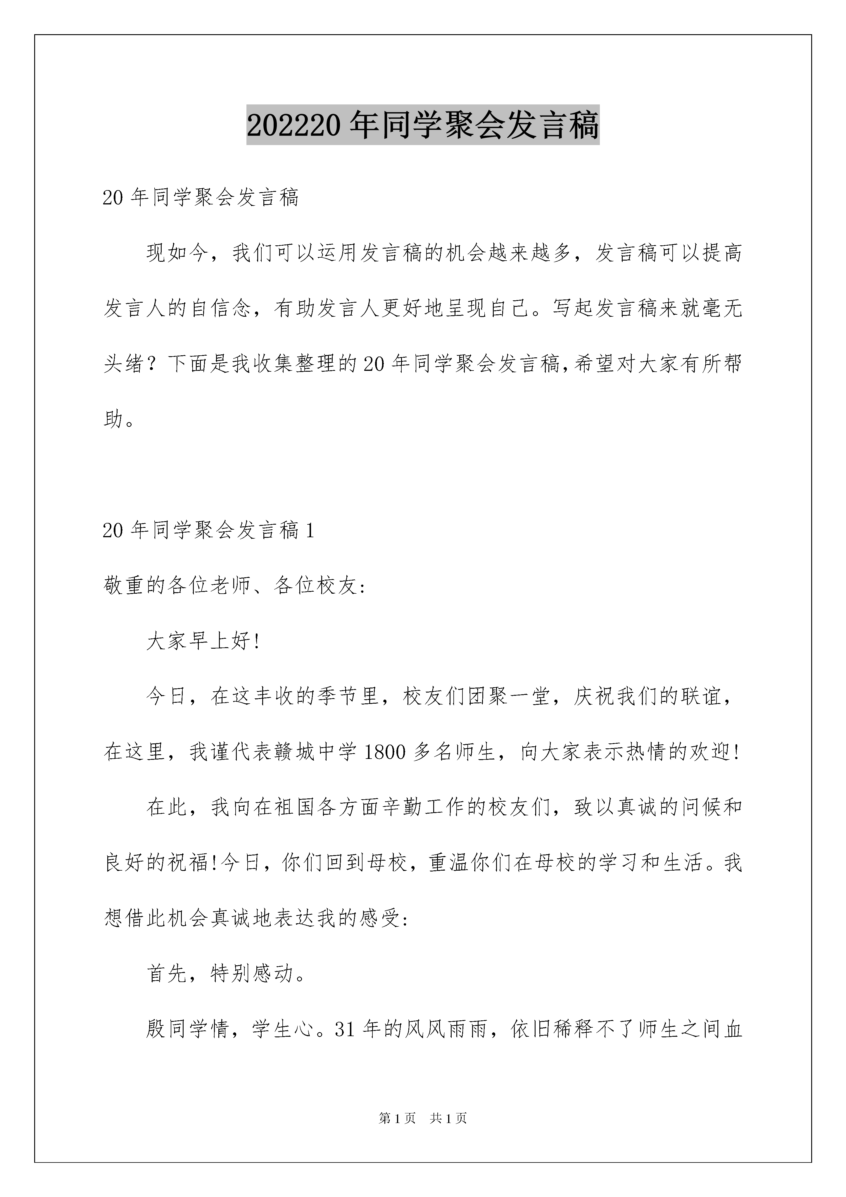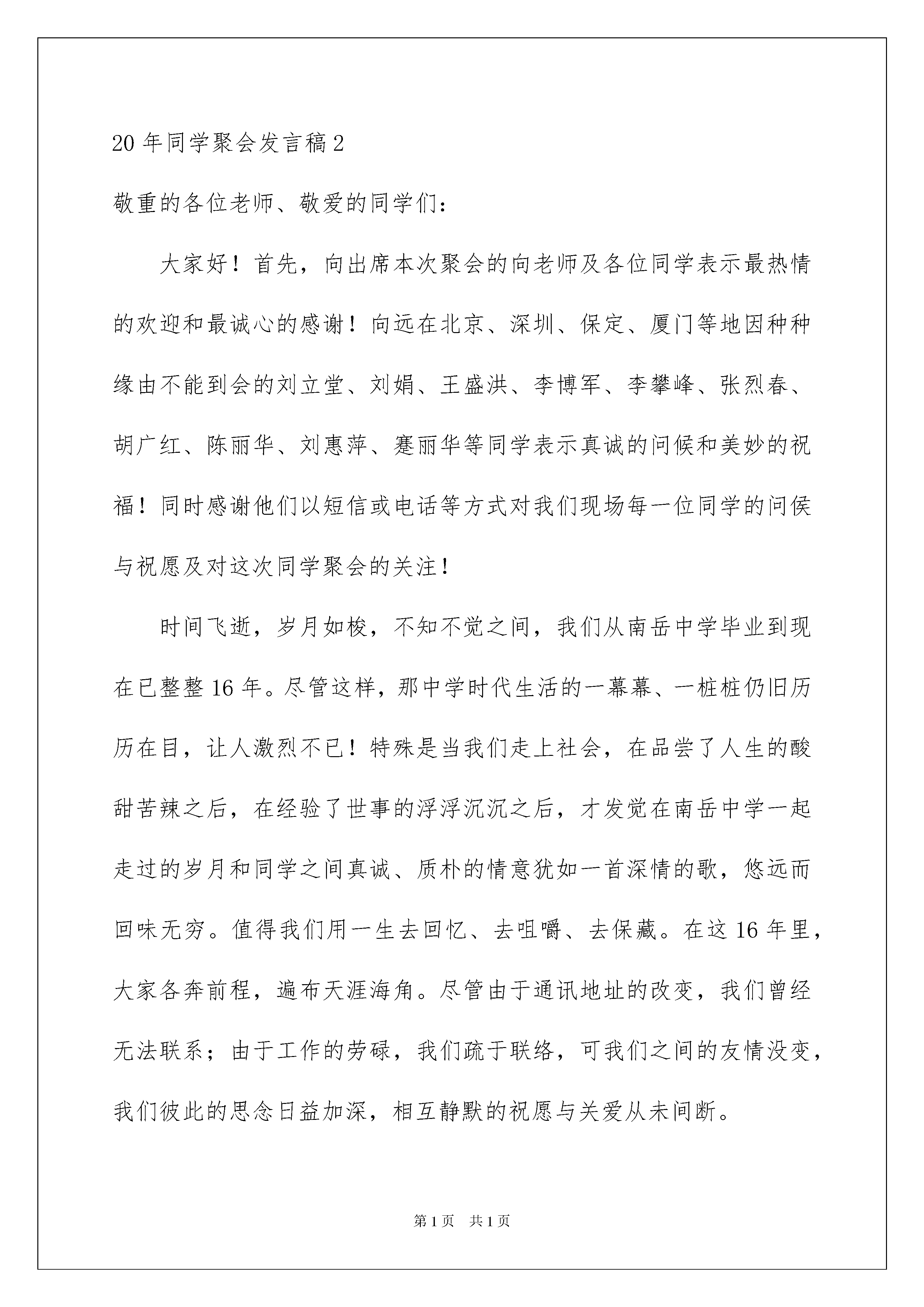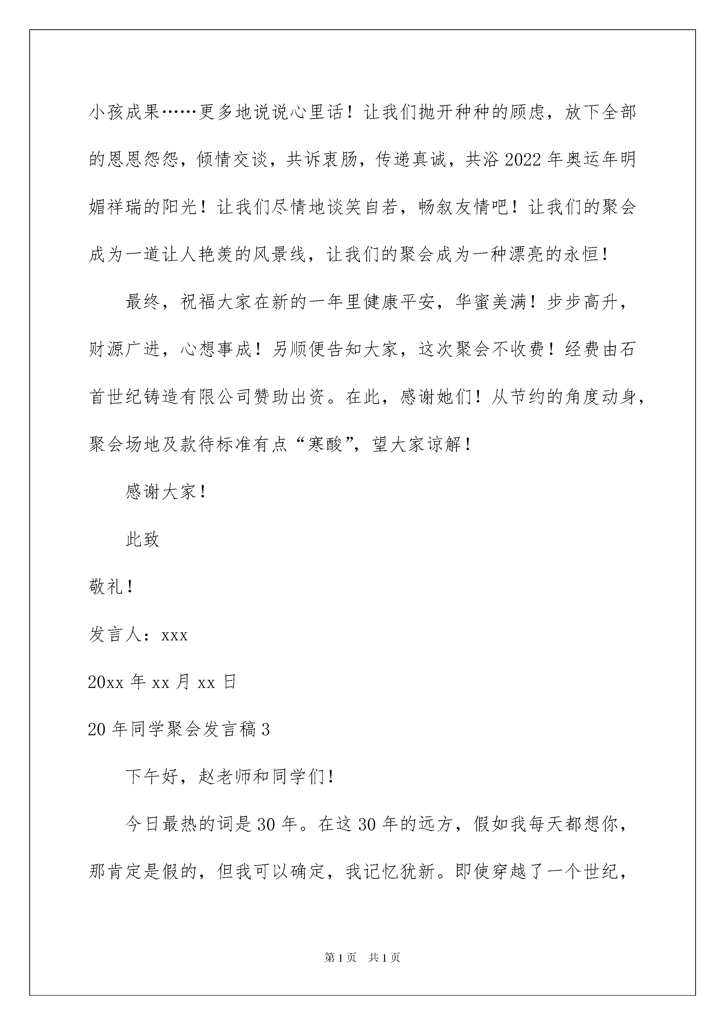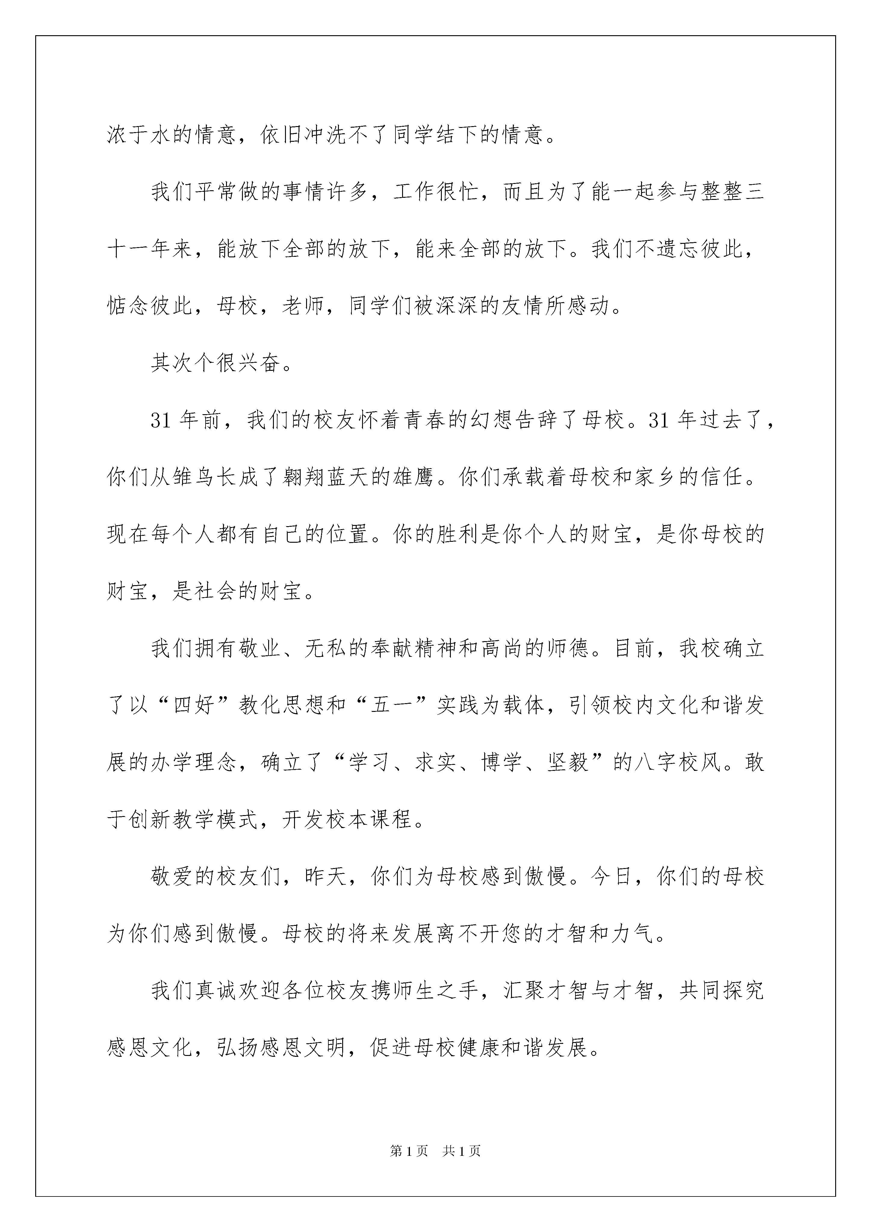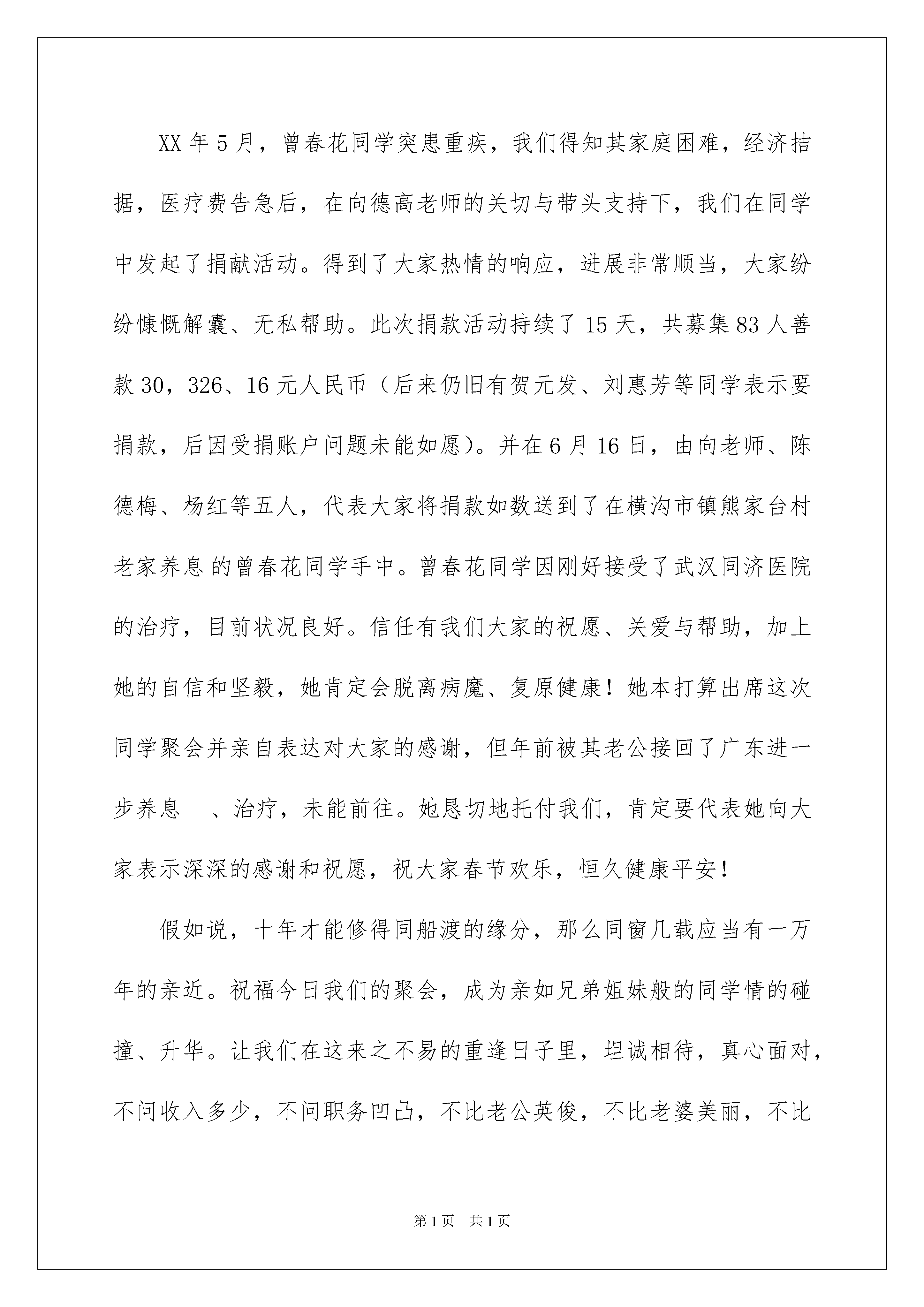 202220年同学聚会发言稿20年同学聚会发言稿现如今,我们可以运用发言稿的机会越来越多,发言稿可以提高发言人的自信念,有助发言人更好地呈现自己。写起发言稿来就毫无头绪?下面是我收集整理的20年同学聚会发言稿,希望对大家有所帮助。20年同学聚会发言稿1敬重的各位老师、各位校友:大家早上好!今日,在这丰收的季节里,校友们团聚一堂,庆祝我们的联谊,在这里,我谨代表赣城中学1800多名师生,向大家表示热情的欢迎!在此,我向在祖国各方面辛勤工作的校友们,致以真诚的问候和良好的祝福!今日,你们回到母校,重温你们在母校的学习和生活。我想借此机会真诚地表达我的感受:首先,特别感动。殷同学情,学生心。31年的风风雨雨,依旧稀释不了师生之间血浓于水的情意,依旧冲洗不了同学结下的情意。我们平常做的事情许多,工作很忙,而且为了能一起参与整整三十一年来,能放下全部的放下,能来全部的放下。我们不遗忘彼此,惦念彼此,母校,老师,同学们被深深的友情所感动。其次个很兴奋。31年前,我们的校友怀着青春的幻想告辞了母校。31年过去了,你们从雏鸟长成了翱翔蓝天的雄鹰。你们承载着母校和家乡的信任。现在每个人都有自己的位置。你的胜利是你个人的财宝,是你母校的财宝,是社会的财宝。我们拥有敬业、无私的奉献精神和高尚的师德。目前,我校确立了以“四好”教化思想和“五一”实践为载体,引领校内文化和谐发展的办学理念,确立了“学习、求实、博学、坚毅”的八字校风。敢于创新教学模式,开发校本课程。敬爱的校友们,昨天,你们为母校感到傲慢。今日,你们的母校为你们感到傲慢。母校的将来发展离不开您的才智和力气。我们真诚欢迎各位校友携师生之手,汇聚才智与才智,共同探究感恩文化,弘扬感恩文明,促进母校健康和谐发展。20年同学聚会发言稿2敬重的各位老师、敬爱的同学们:大家好!首先,向出席本次聚会的向老师及各位同学表示最热情的欢迎和最诚心的感谢!向远在北京、深圳、保定、厦门等地因种种缘由不能到会的刘立堂、刘娟、王盛洪、李博军、李攀峰、张烈春、胡广红、陈丽华、刘惠萍、蹇丽华等同学表示真诚的问候和美妙的祝福!同时感谢他们以短信或电话等方式对我们现场每一位同学的问侯与祝愿及对这次同学聚会的关注!时间飞逝,岁月如梭,不知不觉之间,我们从南岳中学毕业到现在已整整16年。尽管这样,那中学时代生活的一幕幕、一桩桩仍旧历历在目,让人激烈不已!特殊是当我们走上社会,在品尝了人生的酸甜苦辣之后,在经验了世事的浮浮沉沉之后,才发觉在南岳中学一起走过的岁月和同学之间真诚、质朴的情意犹如一首深情的歌,悠远而回味无穷。值得我们用一生去回忆、去咀嚼、去保藏。在这16年里,大家各奔前程,遍布天涯海角。尽管由于通讯地址的改变,我们曾经无法联系;由于工作的劳碌,我们疏于联络,可我们之间的友情没变,我们彼此的思念日益加深,相互静默的祝愿与关爱从未间断。XX年5月,曾春花同学突患重疾,我们得知其家庭困难,经济拮据,医疗费告急后,在向德高老师的关切与带头支持下,我们在同学中发起了捐献活动。得到了大家热情的响应,进展非常顺当,大家纷纷慷慨解囊、无私帮助。此次捐款活动持续了15天,共募集83人善款30,326、16元人民币(后来仍旧有贺元发、刘惠芳等同学表示要捐款,后因受捐账户问题未能如愿)。并在6月16日,由向老师、陈德梅、杨红等五人,代表大家将捐款如数送到了在横沟市镇熊家台村老家养息的曾春花同学手中。曾春花同学因刚好接受了武汉同济医院的治疗,目前状况良好。信任有我们大家的祝愿、关爱与帮助,加上她的自信和坚毅,她肯定会脱离病魔、复原健康!她本打算出席这次同学聚会并亲自表达对大家的感谢,但年前被其老公接回了广东进一步养息、治疗,未能前往。她恳切地托付我们,肯定要代表她向大家表示深深的感谢和祝愿,祝大家春节欢乐,恒久健康平安!假如说,十年才能修得同船渡的缘分,那么同窗几载应当有一万年的亲近。祝福今日我们的聚会,成为亲如兄弟姐妹般的同学情的碰撞、升华。让我们在这来之不易的重逢日子里,坦诚相待,真心面对,不问收入多少,不问职务凹凸,不比老公英俊,不比老婆美丽,不比小孩成果……更多地说说心里话!让我们抛开种种的顾虑,放下全部的恩恩怨怨,倾情交谈,共诉衷肠,传递真诚,共浴2022年奥运年明媚祥瑞的阳光!让我们尽情地谈笑自若,畅叙友情吧!让我们的聚会成为一道让人艳羡的风景线,让我们的聚会成为一种漂亮的永恒!最终,祝福大家在新的一年里健康平安,华蜜美满!步步高升,财源广进,心想事成!另顺便告知大家,这次聚会不收费!经费由石首世纪铸造有限公司赞助出资。在此,感谢她们!从节约的角度动身,聚会场地及款待标准有点