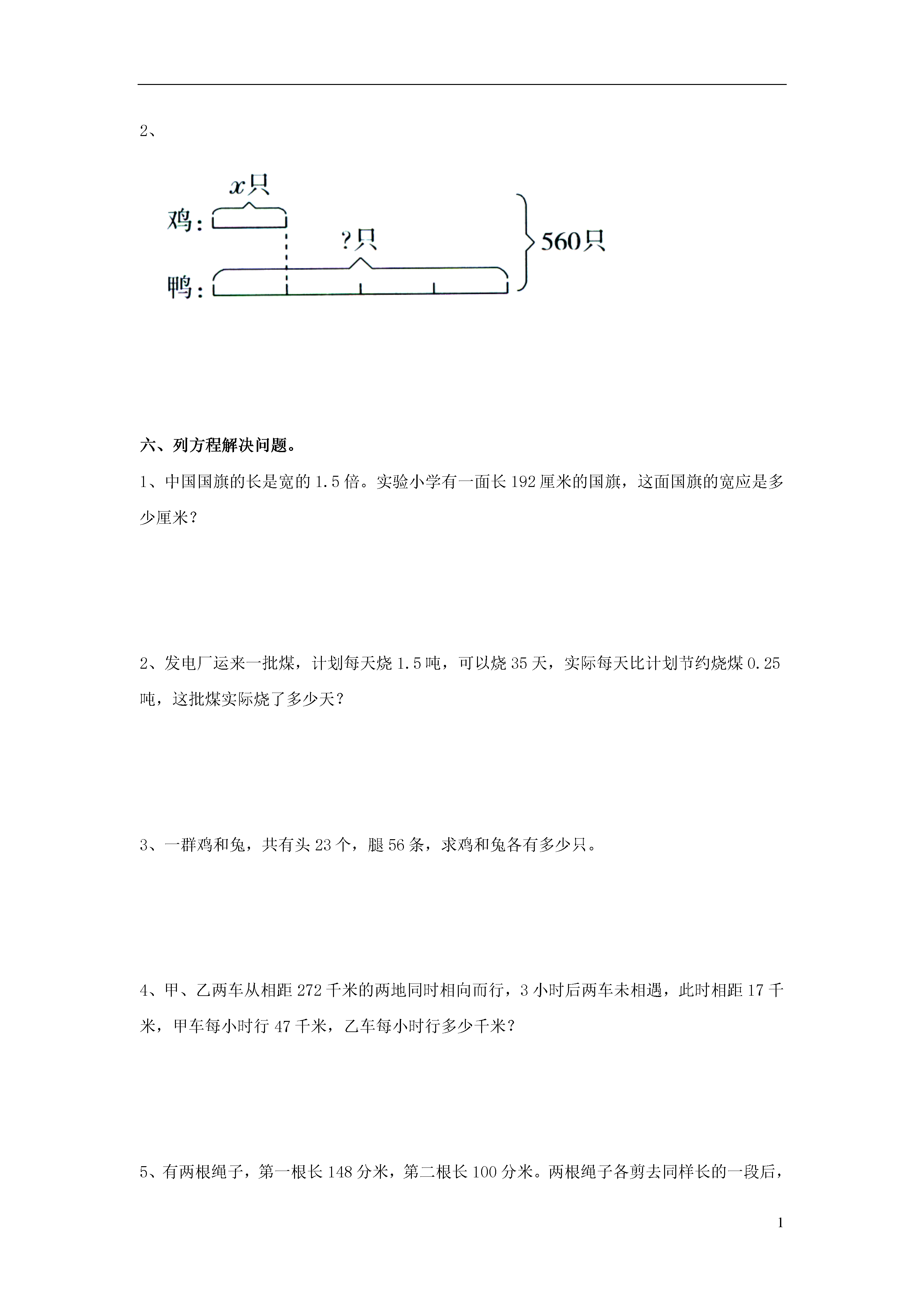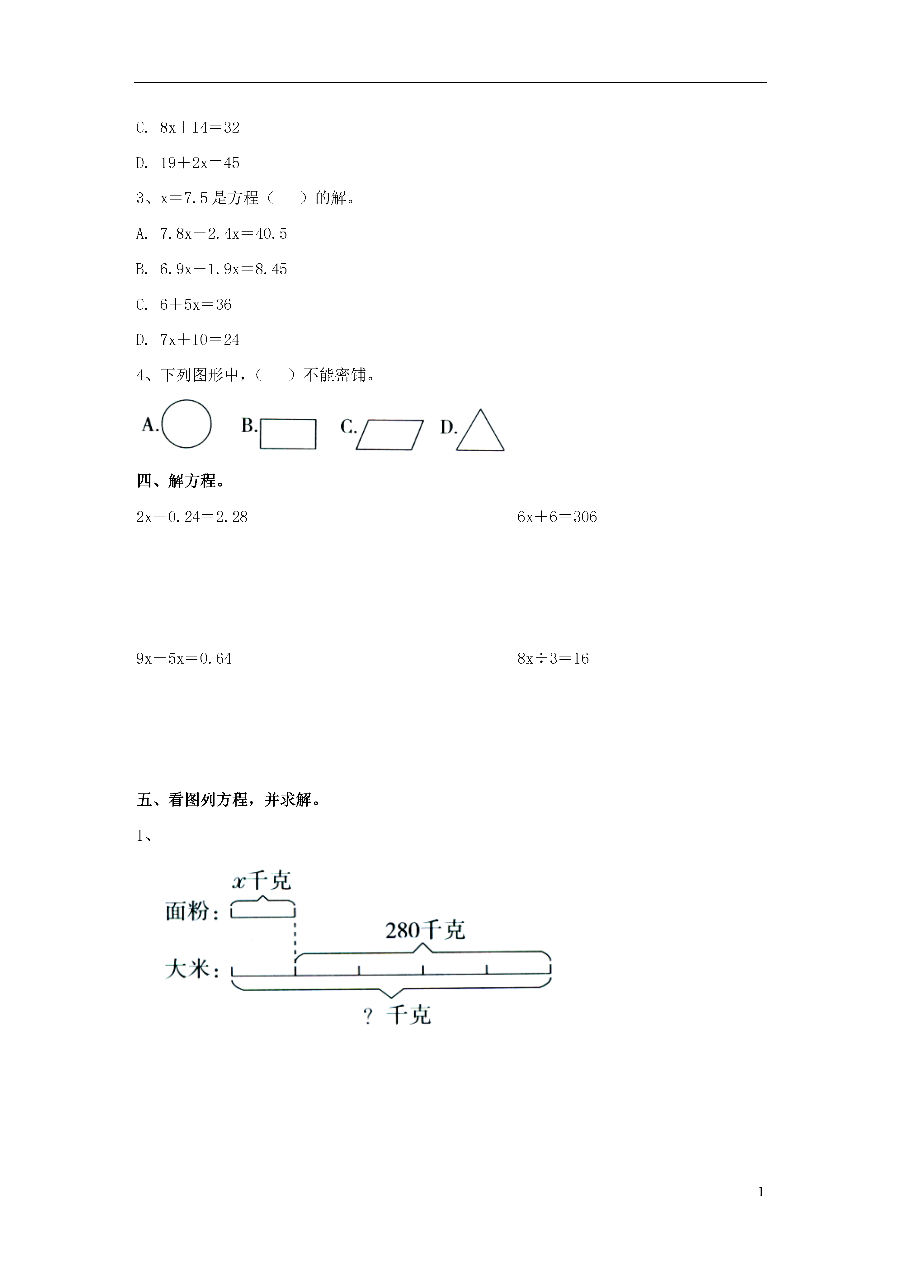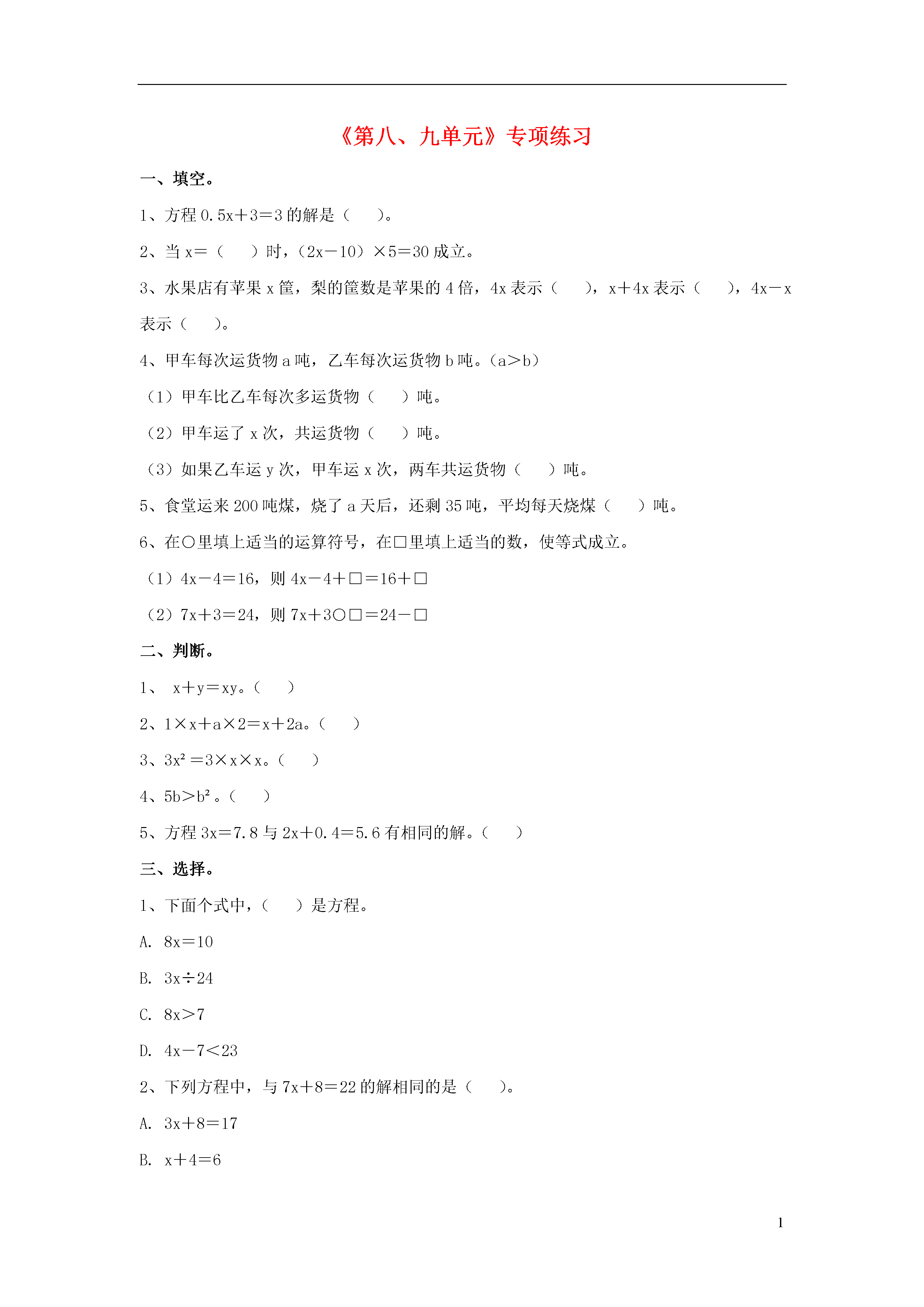 1《第八、九单元》专项练习一、填空。1、方程0.5x+3=3的解是()。2、当x=()时,(2x-10)×5=30成立。3、水果店有苹果x筐,梨的筐数是苹果的4倍,4x表示(),x+4x表示(),4x-x表示()。4、甲车每次运货物a吨,乙车每次运货物b吨。(a>b)(1)甲车比乙车每次多运货物()吨。(2)甲车运了x次,共运货物()吨。(3)如果乙车运y次,甲车运x次,两车共运货物()吨。5、食堂运来200吨煤,烧了a天后,还剩35吨,平均每天烧煤()吨。6、在○里填上适当的运算符号,在□里填上适当的数,使等式成立。(1)4x-4=16,则4x-4+□=16+□(2)7x+3=24,则7x+3○□=24-□二、判断。1、x+y=xy。()2、1×x+a×2=x+2a。()3、3x²=3×x×x。()4、5b>b²。()5、方程3x=7.8与2x+0.4=5.6有相同的解。()三、选择。1、下面个式中,()是方程。A.8x=10B.3x÷24C.8x>7D.4x-7<232、下列方程中,与7x+8=22的解相同的是()。A.3x+8=17B.x+4=6C.8x+14=32D.19+2x=453、x=7.5是方程()的解。A.7.8x-2.4x=40.5B.6.9x-1.9x=8.45C.6+5x=36D.7x+10=244、下列图形中,()不能密铺。四、解方程。2x-0.24=2.286x+6=3069x-5x=0.648x÷3=16五、看图列方程,并求解。1、2、六、列方程解决问题。1、中国国旗的长是宽的1.5倍。实验小学有一面长192厘米的国旗,这面国旗的宽应是多少厘米?2、发电厂运来一批煤,计划每天烧1.5吨,可以烧35天,实际每天比计划节约烧煤0.25吨,这批煤实际烧了多少天?3、一群鸡和兔,共有头23个,腿56条,求鸡和兔各有多少只。4、甲、乙两车从相距272千米的两地同时相向而行,3小时后两车未相遇,此时相距17千米,甲车每小时行47千米,乙车每小时行多少千米?5、有两根绳子,第一根长148分米,第二根长100分米。两根绳子各剪去同样长的一段后,第一根剩下的长度是第二根的3倍。两根绳子各剩下多少米?