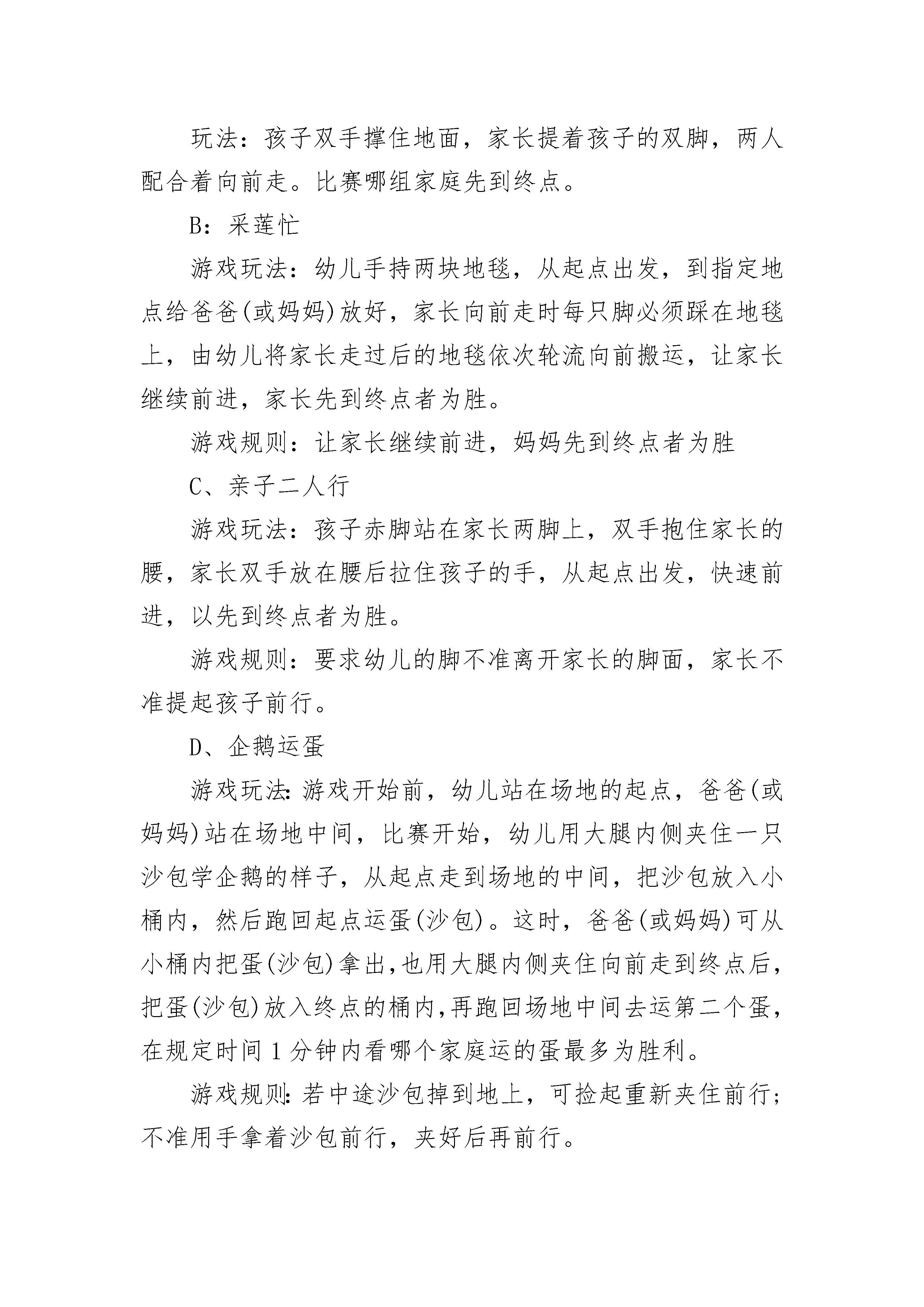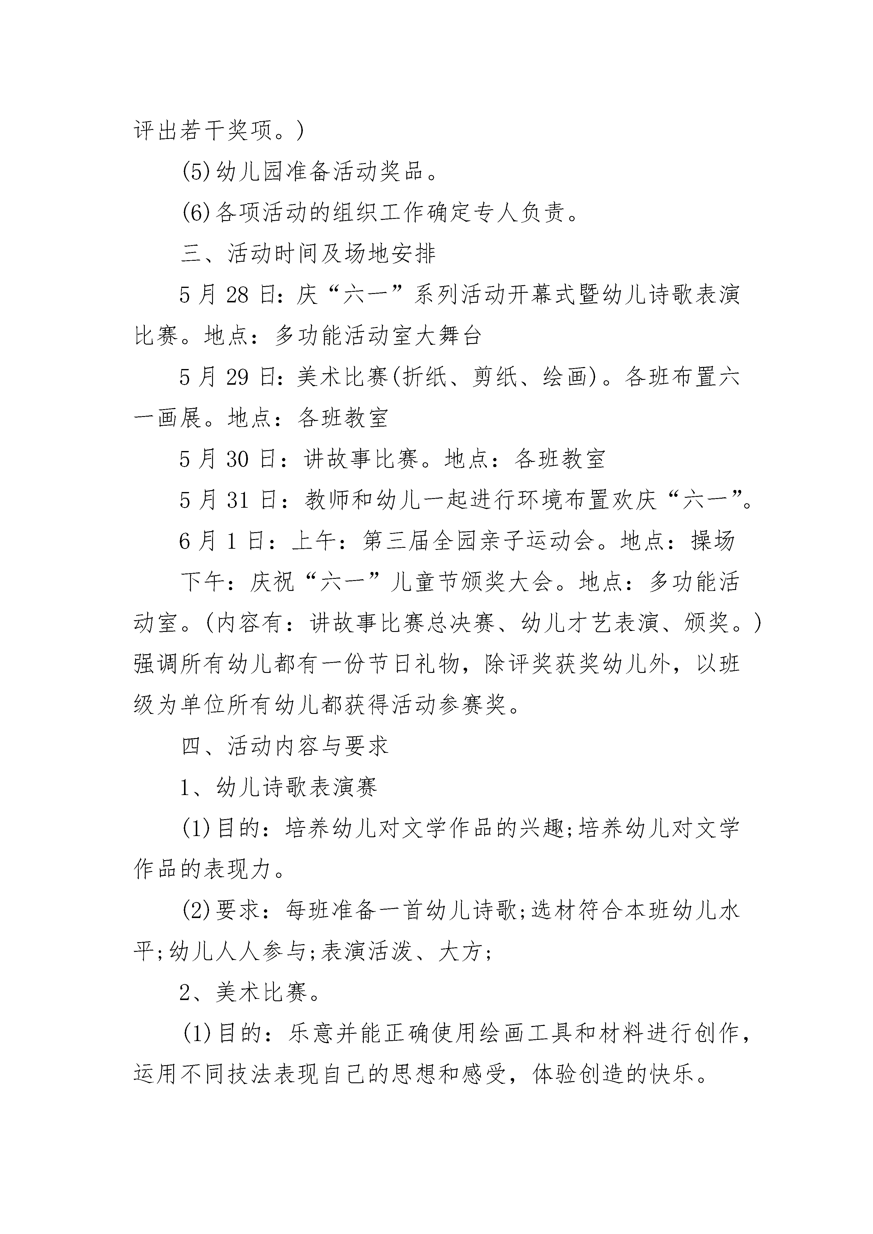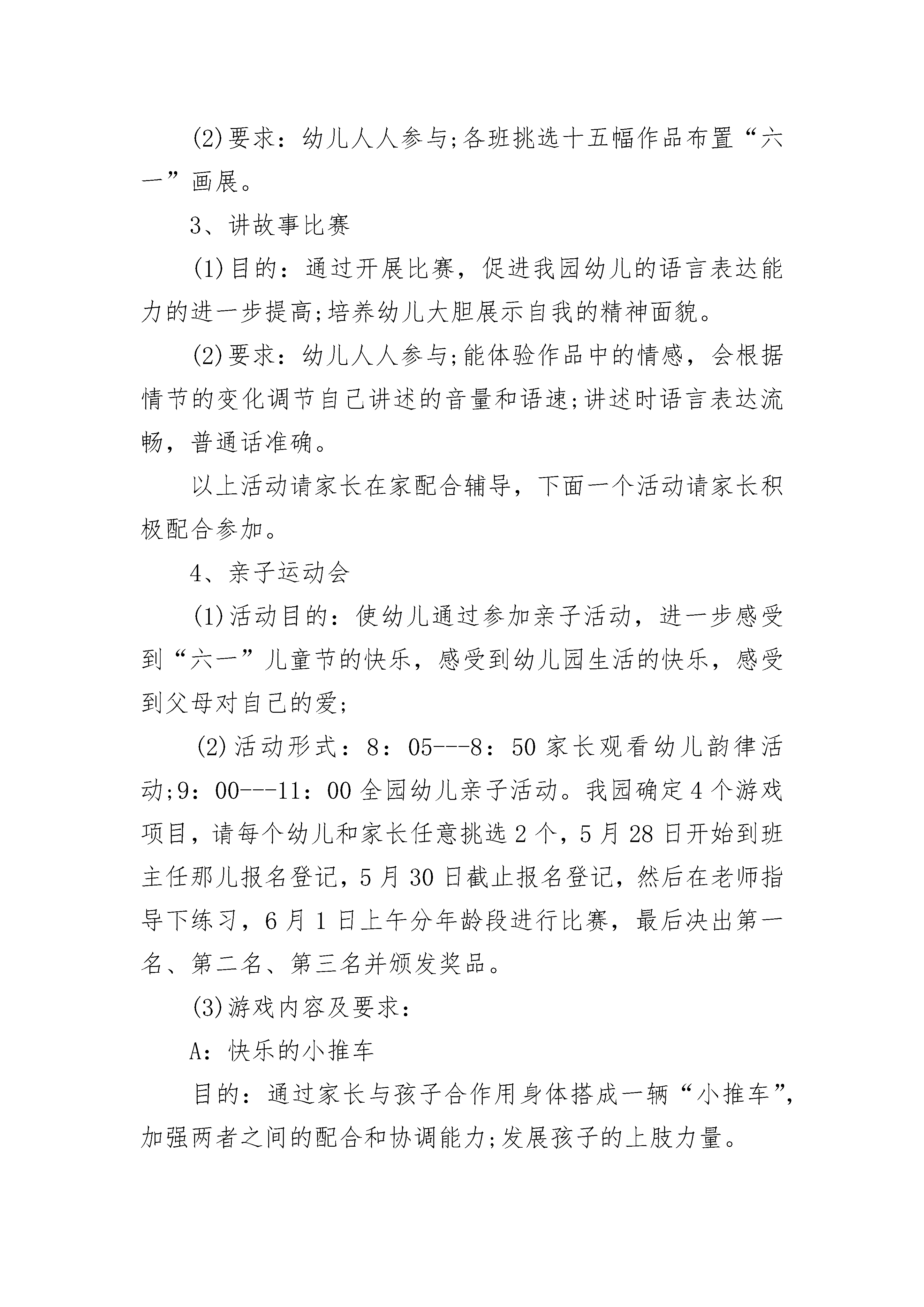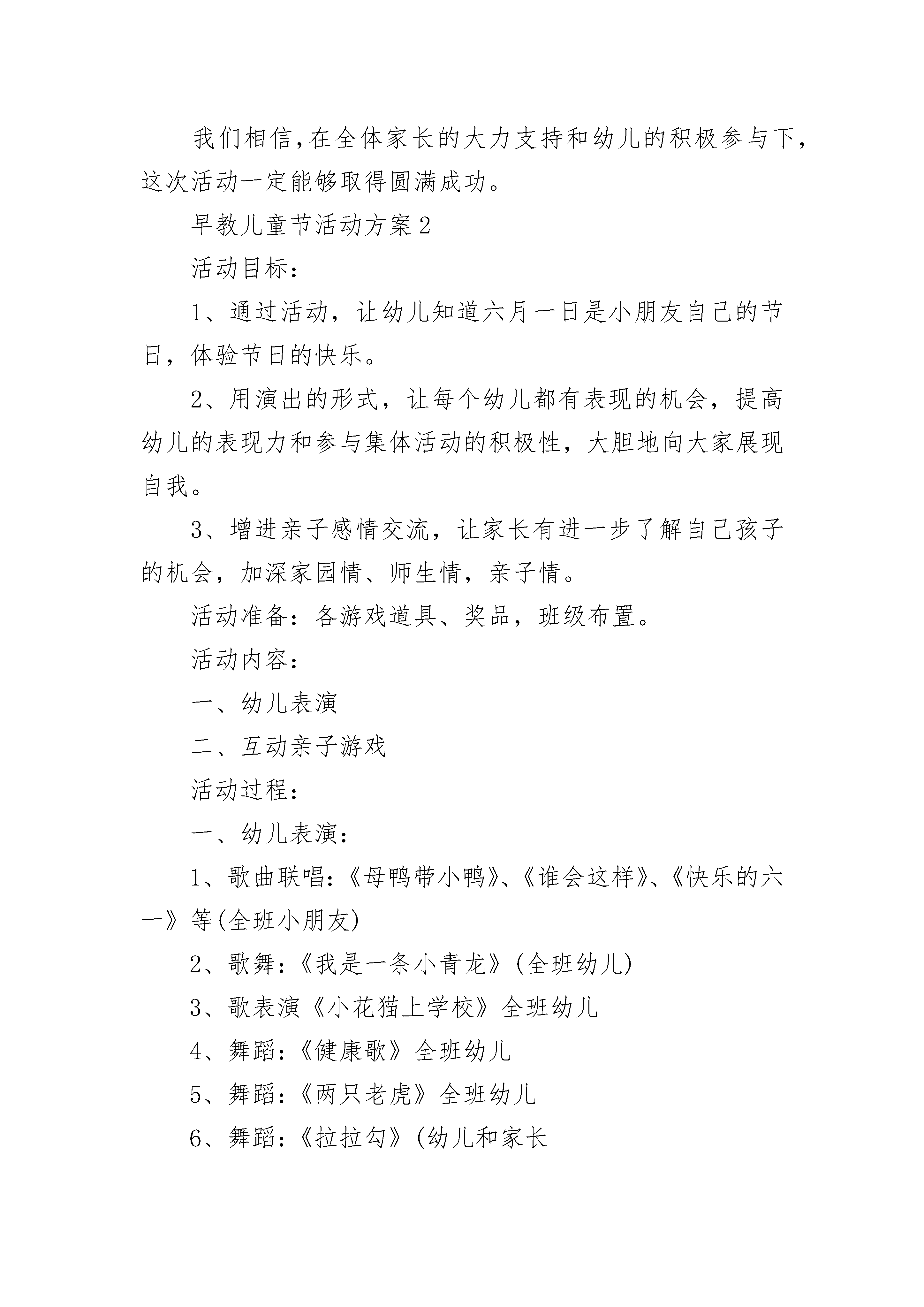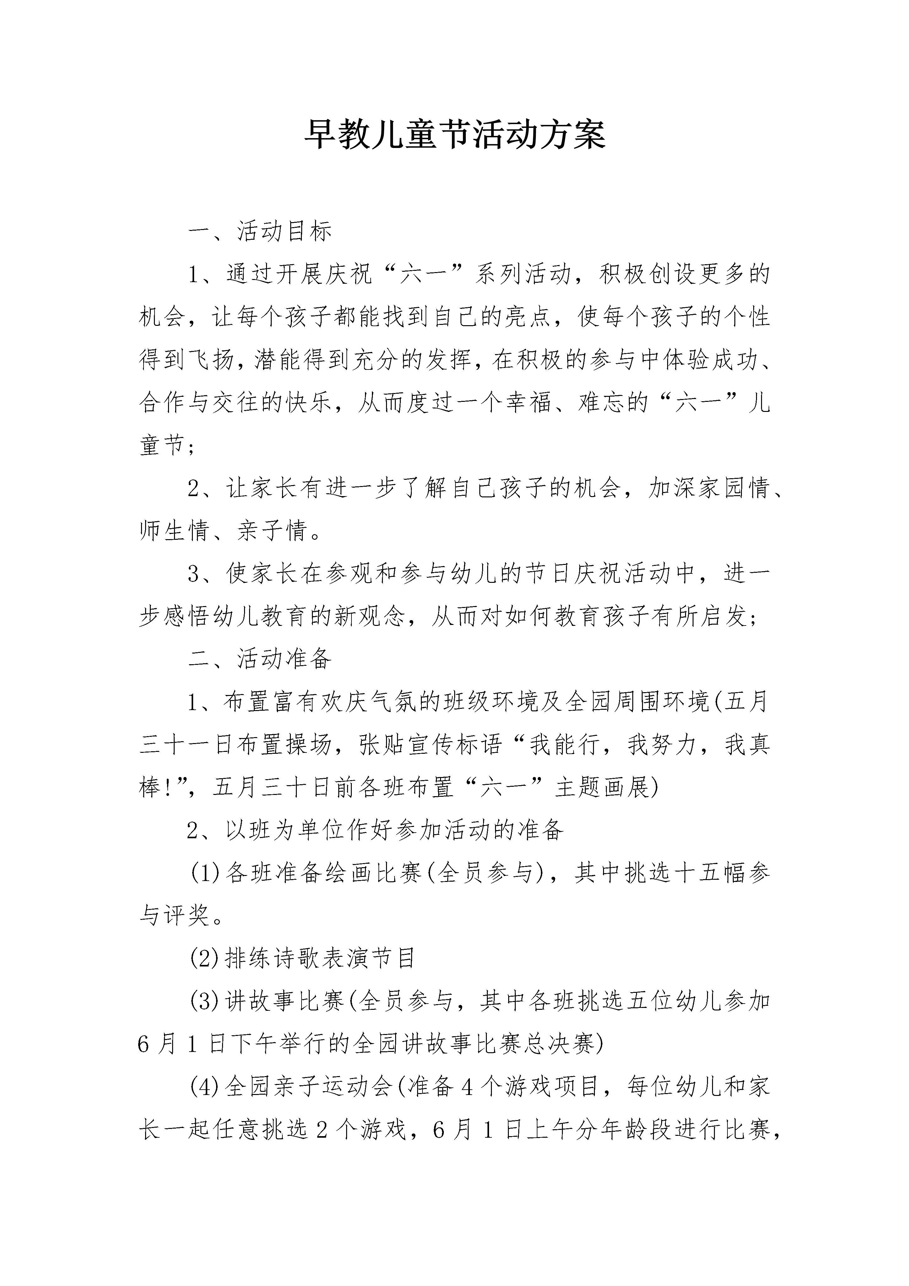 早教儿童节活动方案一、活动目标1、通过开展庆祝“六一”系列活动,积极创设更多的机会,让每个孩子都能找到自己的亮点,使每个孩子的个性得到飞扬,潜能得到充分的发挥,在积极的参与中体验成功、合作与交往的快乐,从而度过一个幸福、难忘的“六一”儿童节;2、让家长有进一步了解自己孩子的机会,加深家园情、师生情、亲子情。3、使家长在参观和参与幼儿的节日庆祝活动中,进一步感悟幼儿教育的新观念,从而对如何教育孩子有所启发;二、活动准备1、布置富有欢庆气氛的班级环境及全园周围环境(五月三十一日布置操场,张贴宣传标语“我能行,我努力,我真棒!”,五月三十日前各班布置“六一”主题画展)2、以班为单位作好参加活动的准备(1)各班准备绘画比赛(全员参与),其中挑选十五幅参与评奖。(2)排练诗歌表演节目(3)讲故事比赛(全员参与,其中各班挑选五位幼儿参加6月1日下午举行的全园讲故事比赛总决赛)(4)全园亲子运动会(准备4个游戏项目,每位幼儿和家长一起任意挑选2个游戏,6月1日上午分年龄段进行比赛,评出若干奖项。)(5)幼儿园准备活动奖品。(6)各项活动的组织工作确定专人负责。三、活动时间及场地安排5月28日:庆“六一”系列活动开幕式暨幼儿诗歌表演比赛。地点:多功能活动室大舞台5月29日:美术比赛(折纸、剪纸、绘画)。各班布置六一画展。地点:各班教室5月30日:讲故事比赛。地点:各班教室5月31日:教师和幼儿一起进行环境布置欢庆“六一”。6月1日:上午:第三届全园亲子运动会。地点:操场下午:庆祝“六一”儿童节颁奖大会。地点:多功能活动室。(内容有:讲故事比赛总决赛、幼儿才艺表演、颁奖。)强调所有幼儿都有一份节日礼物,除评奖获奖幼儿外,以班级为单位所有幼儿都获得活动参赛奖。四、活动内容与要求1、幼儿诗歌表演赛(1)目的:培养幼儿对文学作品的兴趣;培养幼儿对文学作品的表现力。(2)要求:每班准备一首幼儿诗歌;选材符合本班幼儿水平;幼儿人人参与;表演活泼、大方;2、美术比赛。(1)目的:乐意并能正确使用绘画工具和材料进行创作,运用不同技法表现自己的思想和感受,体验创造的快乐。(2)要求:幼儿人人参与;各班挑选十五幅作品布置“六一”画展。3、讲故事比赛(1)目的:通过开展比赛,促进我园幼儿的语言表达能力的进一步提高;培养幼儿大胆展示自我的精神面貌。(2)要求:幼儿人人参与;能体验作品中的情感,会根据情节的变化调节自己讲述的音量和语速;讲述时语言表达流畅,普通话准确。以上活动请家长在家配合辅导,下面一个活动请家长积极配合参加。4、亲子运动会(1)活动目的:使幼儿通过参加亲子活动,进一步感受到“六一”儿童节的快乐,感受到幼儿园生活的快乐,感受到父母对自己的爱;(2)活动形式:8:05---8:50家长观看幼儿韵律活动;9:00---11:00全园幼儿亲子活动。我园确定4个游戏项目,请每个幼儿和家长任意挑选2个,5月28日开始到班主任那儿报名登记,5月30日截止报名登记,然后在老师指导下练习,6月1日上午分年龄段进行比赛,最后决出第一名、第二名、第三名并颁发奖品。(3)游戏内容及要求:A:快乐的小推车目的:通过家长与孩子合作用身体搭成一辆“小推车”,加强两者之间的配合和协调能力;发展孩子的上肢力量。玩法:孩子双手撑住地面,家长提着孩子的双脚,两人配合着向前走。比赛哪组家庭先到终点。B:采莲忙游戏玩法:幼儿手持两块地毯,从起点出发,到指定地点给爸爸(或妈妈)放好,家长向前走时每只脚必须踩在地毯上,由幼儿将家长走过后的地毯依次轮流向前搬运,让家长继续前进,家长先到终点者为胜。游戏规则:让家长继续前进,妈妈先到终点者为胜C、亲子二人行游戏玩法:孩子赤脚站在家长两脚上,双手抱住家长的腰,家长双手放在腰后拉住孩子的手,从起点出发,快速前进,以先到终点者为胜。游戏规则:要求幼儿的脚不准离开家长的脚面,家长不准提起孩子前行。D、企鹅运蛋游戏玩法:游戏开始前,幼儿站在场地的起点,爸爸(或妈妈)站在场地中间,比赛开始,幼儿用大腿内侧夹住一只沙包学企鹅的样子,从起点走到场地的中间,把沙包放入小桶内,然后跑回起点运蛋(沙包)。这时,爸爸(或妈妈)可从小桶内把蛋(沙包)拿出,也用大腿内侧夹住向前走到终点后,把蛋(沙包)放入终点的桶内,再跑回场地中间去运第二个蛋,在规定时间1分钟内看哪个家庭运的蛋最多为胜利。游戏规则:若中途沙包掉到地上,可捡起重新夹住前行;不准用手拿着沙包前行,夹好后再前行。我们相信,在全体家长的大力支持和幼儿的积极参与下,这次活动一定能够取得圆满成功。早教儿童节活动方案2活动目标:1、通过活动,让幼儿知道六月一日是小朋友自己的节日,体验节日的快乐。2、用演出的形式,让每个幼儿都有表现的机会,提高幼儿的表现力和参与集体活动的积极性,大胆地向大家展现自我。3、增进亲子感情交流,