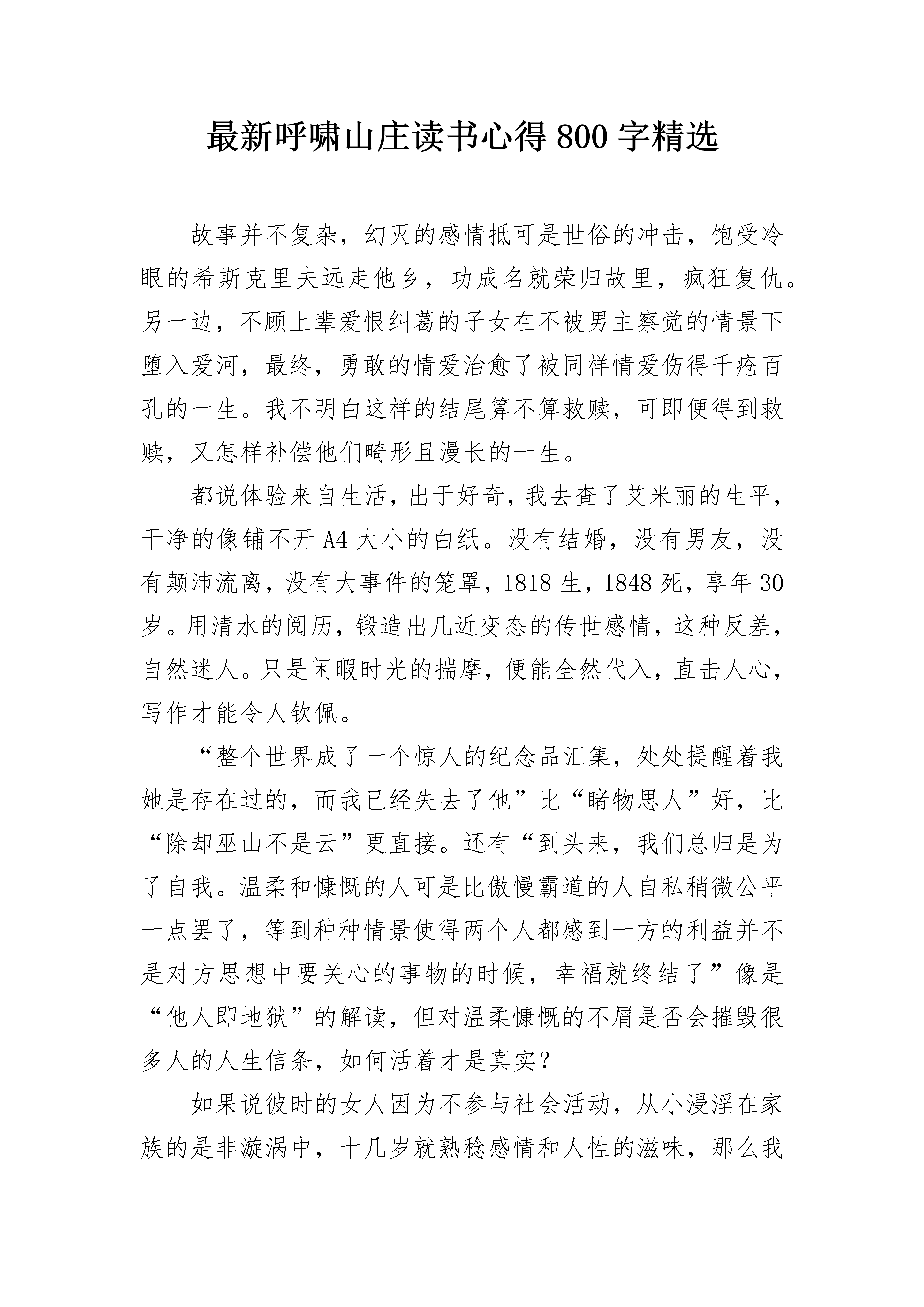 最新呼啸山庄读书心得800字精选故事并不复杂,幻灭的感情抵可是世俗的冲击,饱受冷眼的希斯克里夫远走他乡,功成名就荣归故里,疯狂复仇。另一边,不顾上辈爱恨纠葛的子女在不被男主察觉的情景下堕入爱河,最终,勇敢的情爱治愈了被同样情爱伤得千疮百孔的一生。我不明白这样的结尾算不算救赎,可即便得到救赎,又怎样补偿他们畸形且漫长的一生。都说体验来自生活,出于好奇,我去查了艾米丽的生平,干净的像铺不开A4大小的白纸。没有结婚,没有男友,没有颠沛流离,没有大事件的笼罩,1818生,1848死,享年30岁。用清水的阅历,锻造出几近变态的传世感情,这种反差,自然迷人。只是闲暇时光的揣摩,便能全然代入,直击人心,写作才能令人钦佩。“整个世界成了一个惊人的纪念品汇集,处处提醒着我她是存在过的,而我已经失去了他”比“睹物思人”好,比“除却巫山不是云”更直接。还有“到头来,我们总归是为了自我。温柔和慷慨的人可是比傲慢霸道的人自私稍微公平一点罢了,等到种种情景使得两个人都感到一方的利益并不是对方思想中要关心的事物的时候,幸福就终结了”像是“他人即地狱”的解读,但对温柔慷慨的不屑是否会摧毁很多人的人生信条,如何活着才是真实?如果说彼时的女人因为不参与社会活动,从小浸淫在家族的是非漩涡中,十几岁就熟稔感情和人性的滋味,那么我此刻的浑噩,只是因为社会太繁杂么。寻到头来还是那个结论,要想活得坦然,得时不时的想想准备如何去死,至少能够肃清下身边的诱惑,让自我干净些。当然,如果大家都能更隐忍些,稍微收敛些欲望,那便更好了。不要因为纠葛而长牙舞爪,不必说,这每一爪,都会抓碎读书人的体面和温柔。