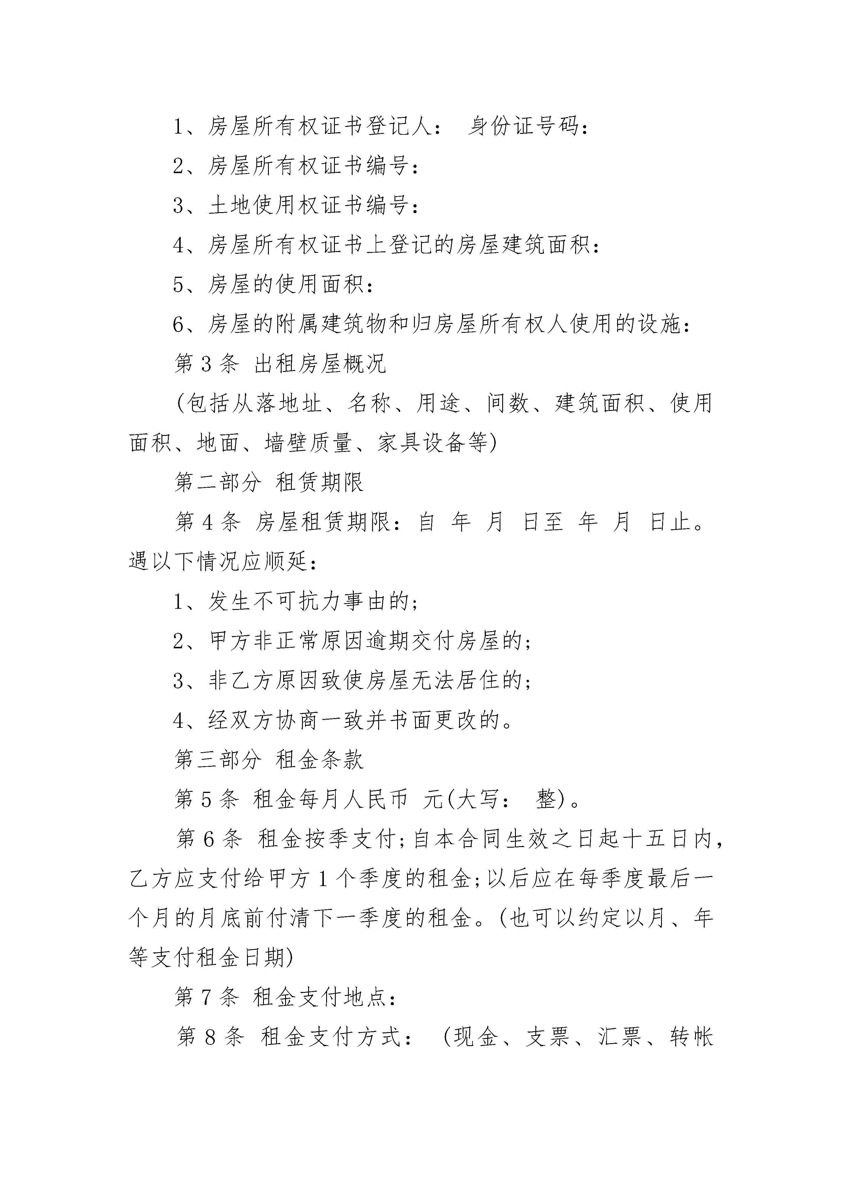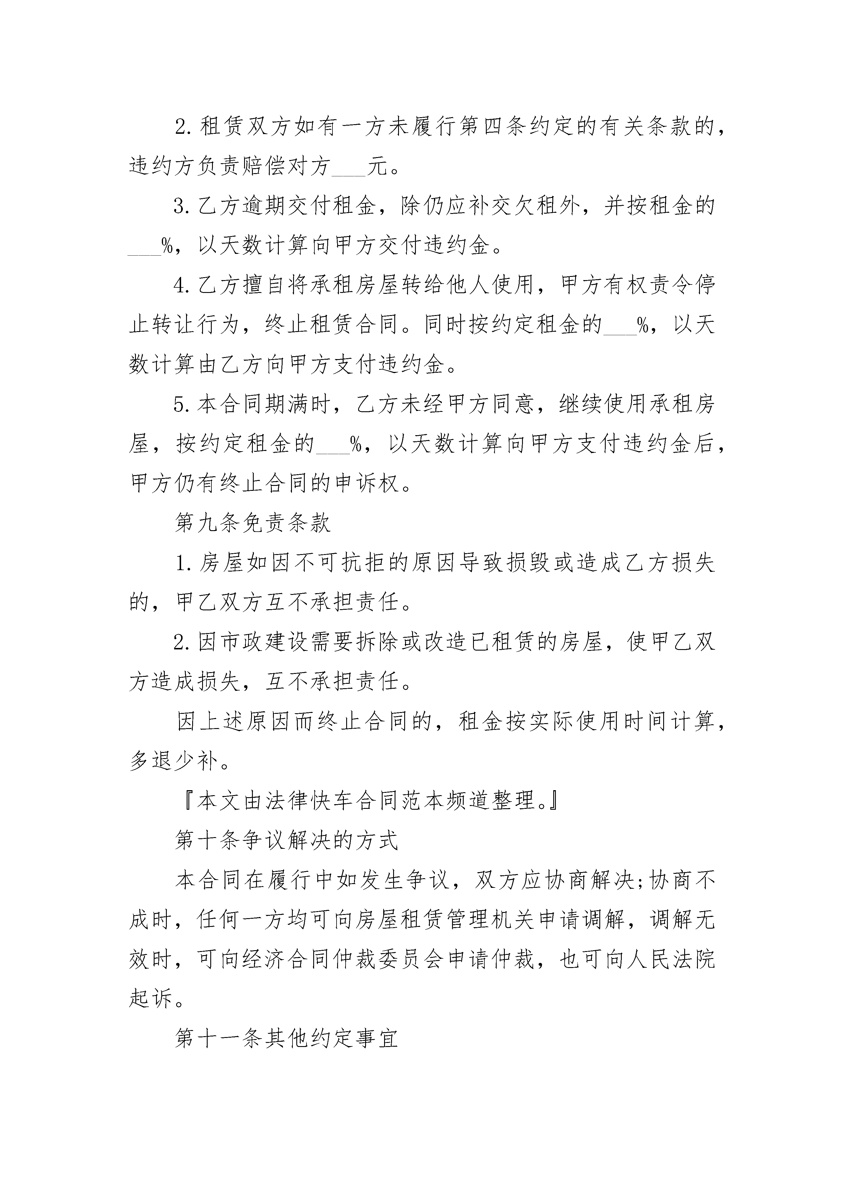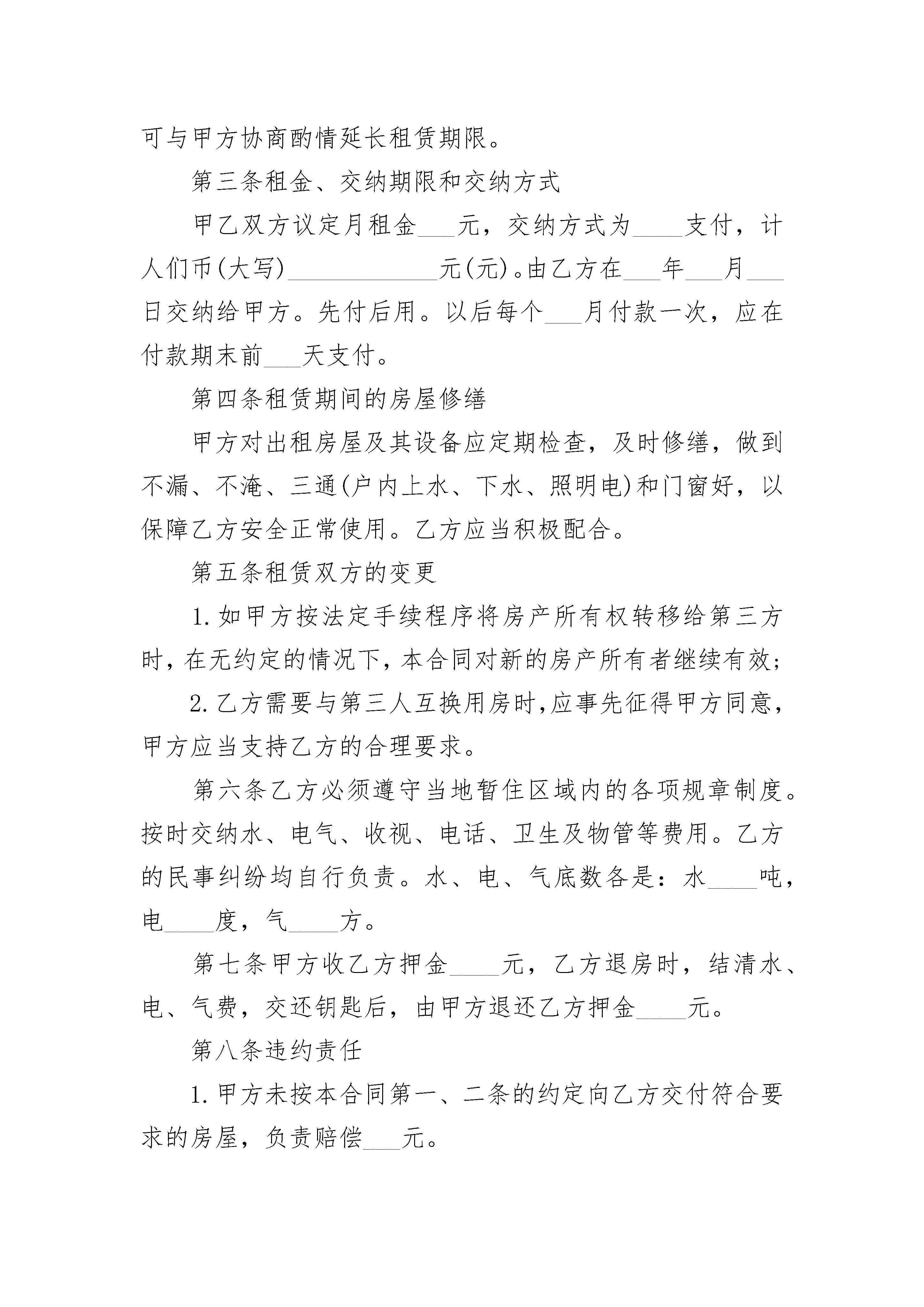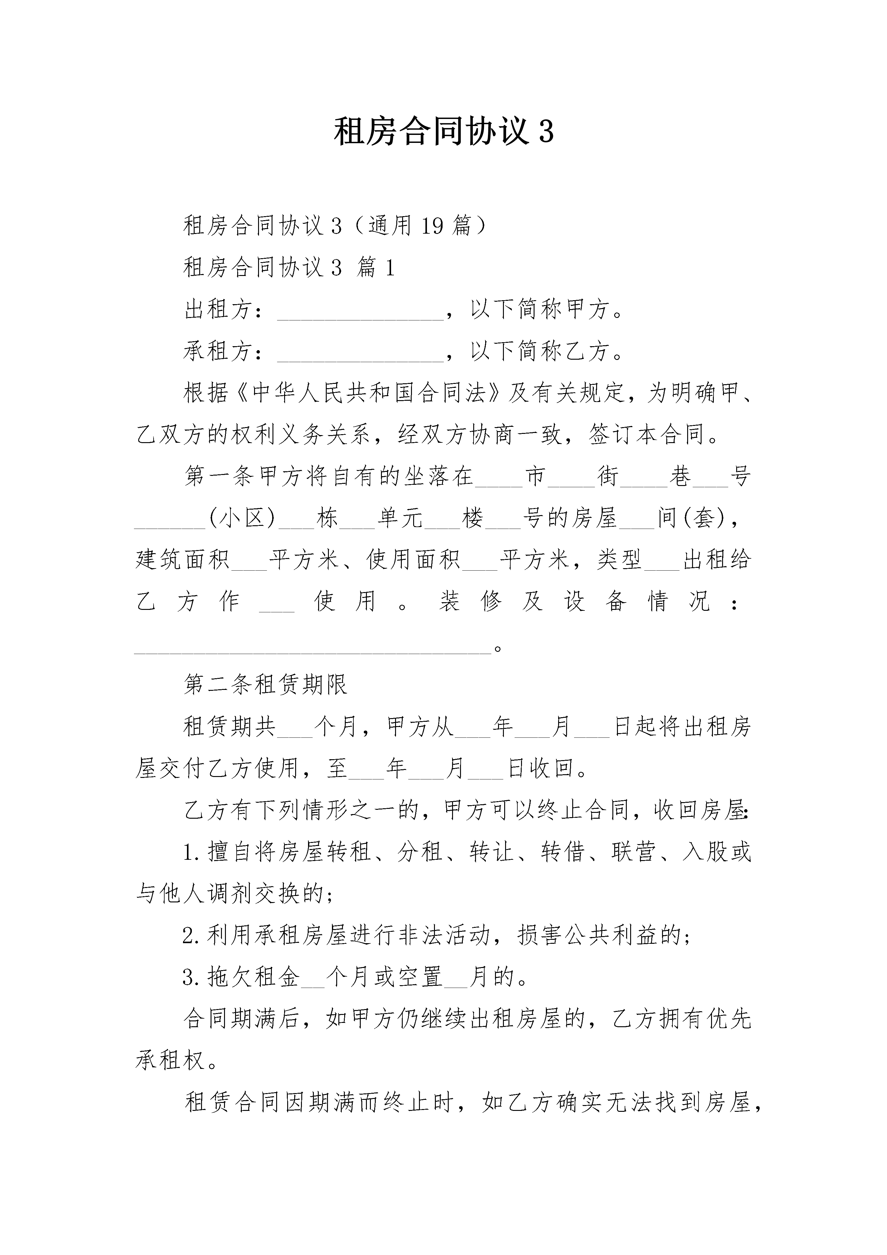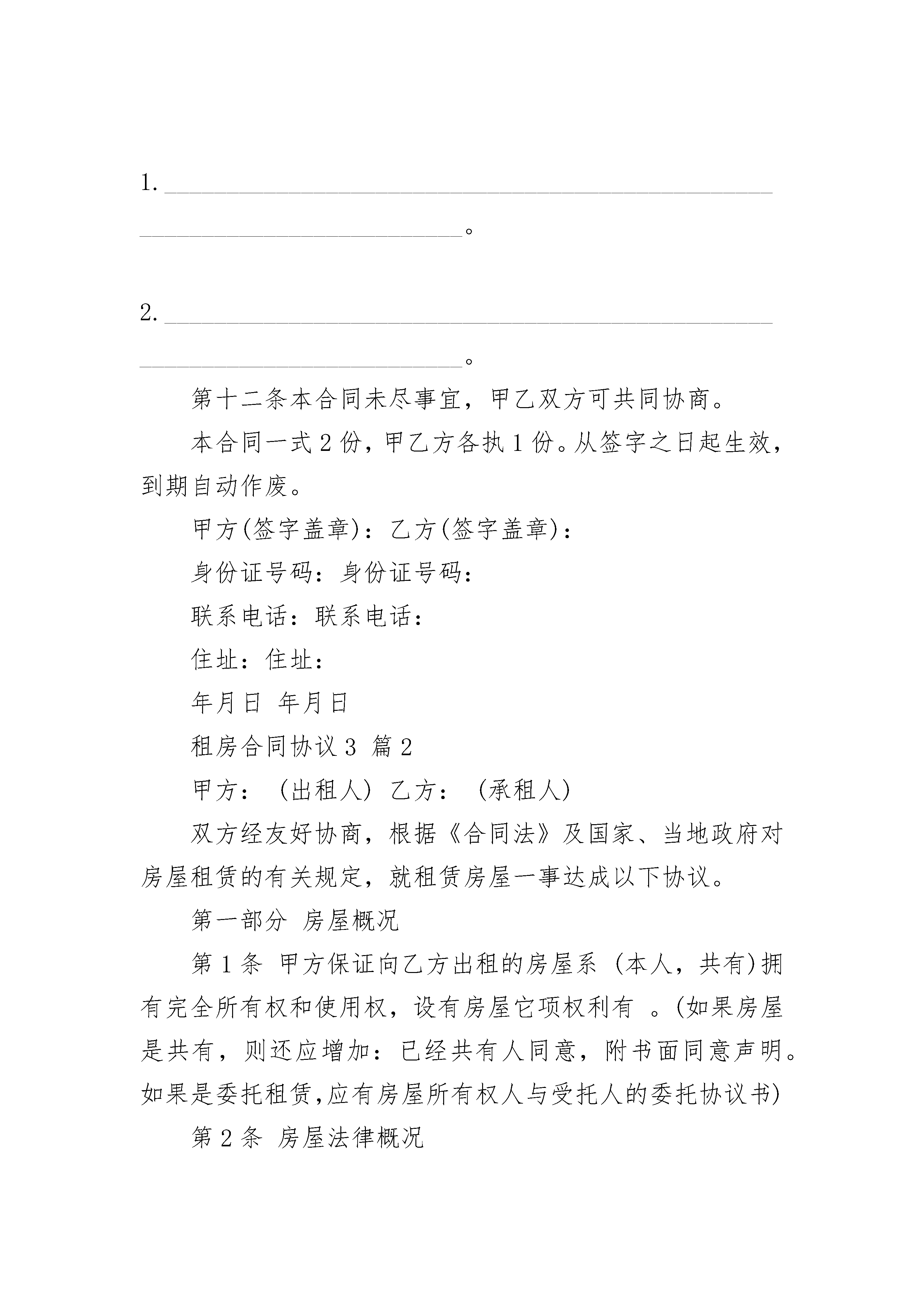 租房合同协议3租房合同协议3(通用19篇)租房合同协议3篇1出租方:______________,以下简称甲方。承租方:______________,以下简称乙方。根据《中华人民共和国合同法》及有关规定,为明确甲、乙双方的权利义务关系,经双方协商一致,签订本合同。第一条甲方将自有的坐落在____市____街____巷___号______(小区)___栋___单元___楼___号的房屋___间(套),建筑面积___平方米、使用面积___平方米,类型___出租给乙方作___使用。装修及设备情况:______________________________。第二条租赁期限租赁期共___个月,甲方从___年___月___日起将出租房屋交付乙方使用,至___年___月___日收回。乙方有下列情形之一的,甲方可以终止合同,收回房屋:1.擅自将房屋转租、分租、转让、转借、联营、入股或与他人调剂交换的;2.利用承租房屋进行非法活动,损害公共利益的;3.拖欠租金__个月或空置__月的。合同期满后,如甲方仍继续出租房屋的,乙方拥有优先承租权。租赁合同因期满而终止时,如乙方确实无法找到房屋,可与甲方协商酌情延长租赁期限。第三条租金、交纳期限和交纳方式甲乙双方议定月租金___元,交纳方式为____支付,计人们币(大写)____________元(元)。由乙方在___年___月___日交纳给甲方。先付后用。以后每个___月付款一次,应在付款期末前___天支付。第四条租赁期间的房屋修缮甲方对出租房屋及其设备应定期检查,及时修缮,做到不漏、不淹、三通(户内上水、下水、照明电)和门窗好,以保障乙方安全正常使用。乙方应当积极配合。第五条租赁双方的变更1.如甲方按法定手续程序将房产所有权转移给第三方时,在无约定的情况下,本合同对新的房产所有者继续有效;2.乙方需要与第三人互换用房时,应事先征得甲方同意,甲方应当支持乙方的合理要求。第六条乙方必须遵守当地暂住区域内的各项规章制度。按时交纳水、电气、收视、电话、卫生及物管等费用。乙方的民事纠纷均自行负责。水、电、气底数各是:水____吨,电____度,气____方。第七条甲方收乙方押金____元,乙方退房时,结清水、电、气费,交还钥匙后,由甲方退还乙方押金____元。第八条违约责任1.甲方未按本合同第一、二条的约定向乙方交付符合要求的房屋,负责赔偿___元。2.租赁双方如有一方未履行第四条约定的有关条款的,违约方负责赔偿对方___元。3.乙方逾期交付租金,除仍应补交欠租外,并按租金的___%,以天数计算向甲方交付违约金。4.乙方擅自将承租房屋转给他人使用,甲方有权责令停止转让行为,终止租赁合同。同时按约定租金的___%,以天数计算由乙方向甲方支付违约金。5.本合同期满时,乙方未经甲方同意,继续使用承租房屋,按约定租金的___%,以天数计算向甲方支付违约金后,甲方仍有终止合同的申诉权。第九条免责条款1.房屋如因不可抗拒的原因导致损毁或造成乙方损失的,甲乙双方互不承担责任。2.因市政建设需要拆除或改造已租赁的房屋,使甲乙双方造成损失,互不承担责任。因上述原因而终止合同的,租金按实际使用时间计算,多退少补。『本文由法律快车合同范本频道整理。』第十条争议解决的方式本合同在履行中如发生争议,双方应协商解决;协商不成时,任何一方均可向房屋租赁管理机关申请调解,调解无效时,可向经济合同仲裁委员会申请仲裁,也可向人民法院起诉。第十一条其他约定事宜1.___________________________________________________________________________。2.___________________________________________________________________________。第十二条本合同未尽事宜,甲乙双方可共同协商。本合同一式2份,甲乙方各执1份。从签字之日起生效,到期自动作废。甲方(签字盖章):乙方(签字盖章):身份证号码:身份证号码:联系电话:联系电话:住址:住址:年月日年月日租房合同协议3篇2甲方:(出租人)乙方:(承租人)双方经友好协商,根据《合同法》及国家、当地政府对房屋租赁的有关规定,就租赁房屋一事达成以下协议。第一部分房屋概况第1条甲方保证向乙方出租的房屋系(本人,共有)拥有完全所有权和使用权,设有房屋它项权利有。(如果房屋是共有,则还应增加:已经共有人同意,附书面同意声明。如果是委托租赁,应有房屋所有权人与受托人的委托协议书)第2条房屋法律概况1、房屋所有权证书登记人:身份证号码:2、房屋所有权证书编号:3、土地使用权证书编号:4、房屋所有权证书上登记的房屋建筑面积:5、房屋的使用面积:6、房屋的附属建筑物和归房屋所有权人使用的设施:
