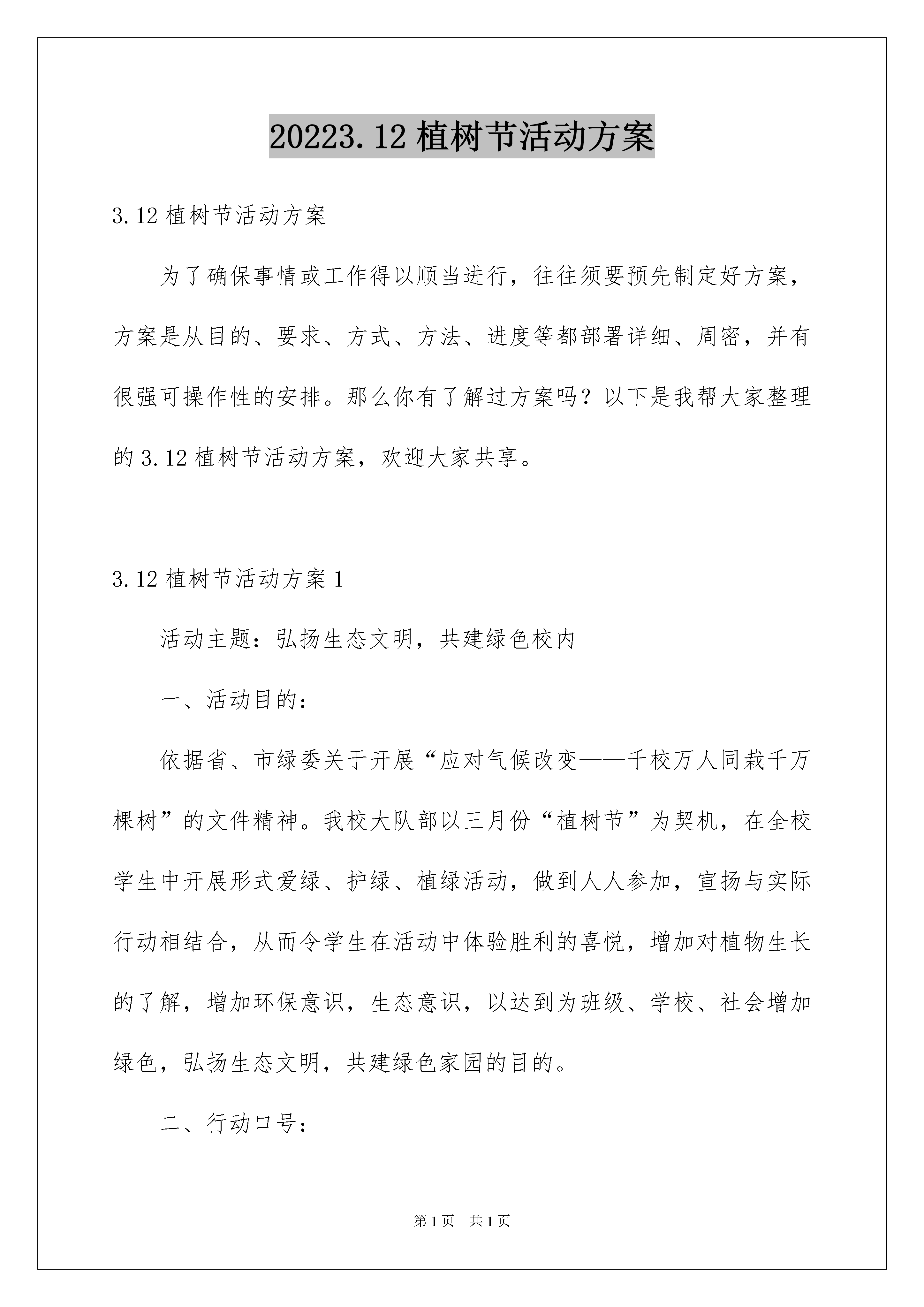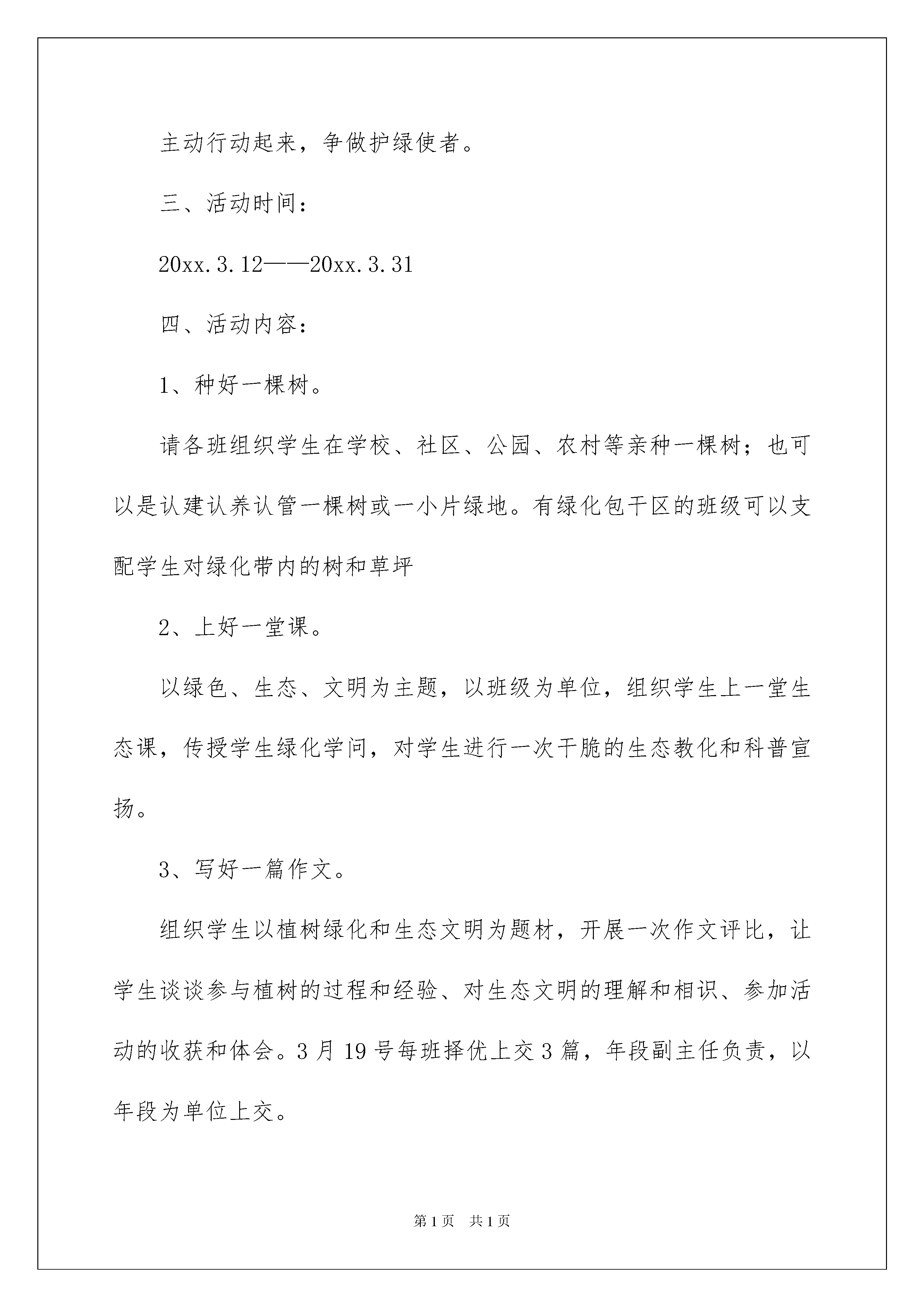 20223.12植树节活动方案3.12植树节活动方案为了确保事情或工作得以顺当进行,往往须要预先制定好方案,方案是从目的、要求、方式、方法、进度等都部署详细、周密,并有很强可操作性的安排。那么你有了解过方案吗?以下是我帮大家整理的3.12植树节活动方案,欢迎大家共享。3.12植树节活动方案1活动主题:弘扬生态文明,共建绿色校内一、活动目的:依据省、市绿委关于开展“应对气候改变——千校万人同栽千万棵树”的文件精神。我校大队部以三月份“植树节”为契机,在全校学生中开展形式爱绿、护绿、植绿活动,做到人人参加,宣扬与实际行动相结合,从而令学生在活动中体验胜利的喜悦,增加对植物生长的了解,增加环保意识,生态意识,以达到为班级、学校、社会增加绿色,弘扬生态文明,共建绿色家园的目的。二、行动口号:主动行动起来,争做护绿使者。三、活动时间:20xx.3.12——20xx.3.31四、活动内容:1、种好一棵树。请各班组织学生在学校、社区、公园、农村等亲种一棵树;也可以是认建认养认管一棵树或一小片绿地。有绿化包干区的班级可以支配学生对绿化带内的树和草坪2、上好一堂课。以绿色、生态、文明为主题,以班级为单位,组织学生上一堂生态课,传授学生绿化学问,对学生进行一次干脆的生态教化和科普宣扬。3、写好一篇作文。组织学生以植树绿化和生态文明为题材,开展一次作文评比,让学生谈谈参与植树的过程和经验、对生态文明的理解和相识、参加活动的收获和体会。3月19号每班择优上交3篇,年段副主任负责,以年段为单位上交。4、高段操场边的黑板报以“绿色环保”为主题,由年段主任支配班级在3月19号之前出好。五、活动反馈:活动结束后,各年段要将植树节参加学生数、植树株数、认养认管株数、生态课数、作文篇数,表彰人数,进行统计,并将统计表上交大队部。3.12植树节活动方案2一、活动目的以3月12日植树节为契机,在全校少先队员中开展形式多样的护绿行动和植物种植实践体验活动,增加对植物生长的了解,增加植绿护绿的环保意识,提高少先队员的主子翁意识和社会责任感。二、行动口号播种绿色,我与小树共成长三、活动时间20xx年3月9日—3月13日四、活动内容(一)宣扬发动。通过3月9日升旗仪式上的讲话,向全体少先队员宣扬环保学问,并发出号召:人人参加植树节护绿、养绿系列活动,为美化、净化环境尽一份力。(二)实践1、“小手添新绿”,美化校内环境。各中队辅导员发动学生把好的花苗,带到班级,进行视察、养殖,班级成立“植物角”,美化班级。也可发动学生自带种子进行动手种植实践,视察植物生长过程,激发爱好。2、环境爱护,我的心声。三至六年级少先队员先以中队为单位,中队辅导员组织开展以“植树节”为主题的征文活动,内容要结合环境爱护教化,星期五前每中队由中队辅导员评比出2篇优秀作品上送少先队大队部,少先队大队将会进行优秀作品展览。活动要求:各中队要做好主题班会的资料收集,利用好40分钟,确保每位少先队员从中得到环境爱护的教化,增加环保意识。3、动手参加,爱绿护绿。四、五、六年级的同学对校内内的全部的植物园进行“红领巾护绿除草保洁”活动,让校内内到处呈现出漂亮和谐的景象。各中队成立护绿小队,认养校内绿化植物,将学校足球场旁边的小树划分到各班,让各班负责进行养护。开展清扫校内树下和植物园的落叶,擦花坛,养护绿化等活动。(三)沟通学生自带种子进行动手种植的实践,撰写视察日记或试验报告,收集有关植物生长学问在非常钟队会上沟通、宣扬,进行成果展示。(四)“植物角”评比充分发挥同学的创新实力,将绿化、生物养殖、植物种植等融为一体,进行评比。3.12植树节活动方案3春天来临,一年一度的植树节也随着春天的脚步走来,为了给大家亲近大自然,为我们的世界装饰绿色的机会,我们为此举办意义重大的植树活动。一、主旨与主题:贡献力气,奉献绿色,以植树节为契机,奉献我们的力气,进行植树节活动。二、活动时间:20xx年xx月xx日星期xx。三、活动对象:公司团体、各企事业单位。四、活动意义:为了创建蓝天碧波的绿色环境,开展本次志愿者绿色行动。以三月份植树节为契机,做到人人参加,宣扬与实际行动相结合,从而令职员在活动中体验胜利的喜悦,增加对植物生长的了解,增加环保相识,生态相识,以达到为“北京的后花园”增加绿色,净化、美化环境的目的。五、活动打算事宜:1、活动宣扬:网站。2、活动所需物品的打算:铁锹、锄头、尖头镐、水桶等由校供应。3、活动的组织:通过由各公司宣扬并统一进行协调支配。六、活动经费预算:1、树苗的购置:杨树30棵。2、劳动工具:由我公司供应。3、宣扬:合影纪念。3.12植树节活动方案
