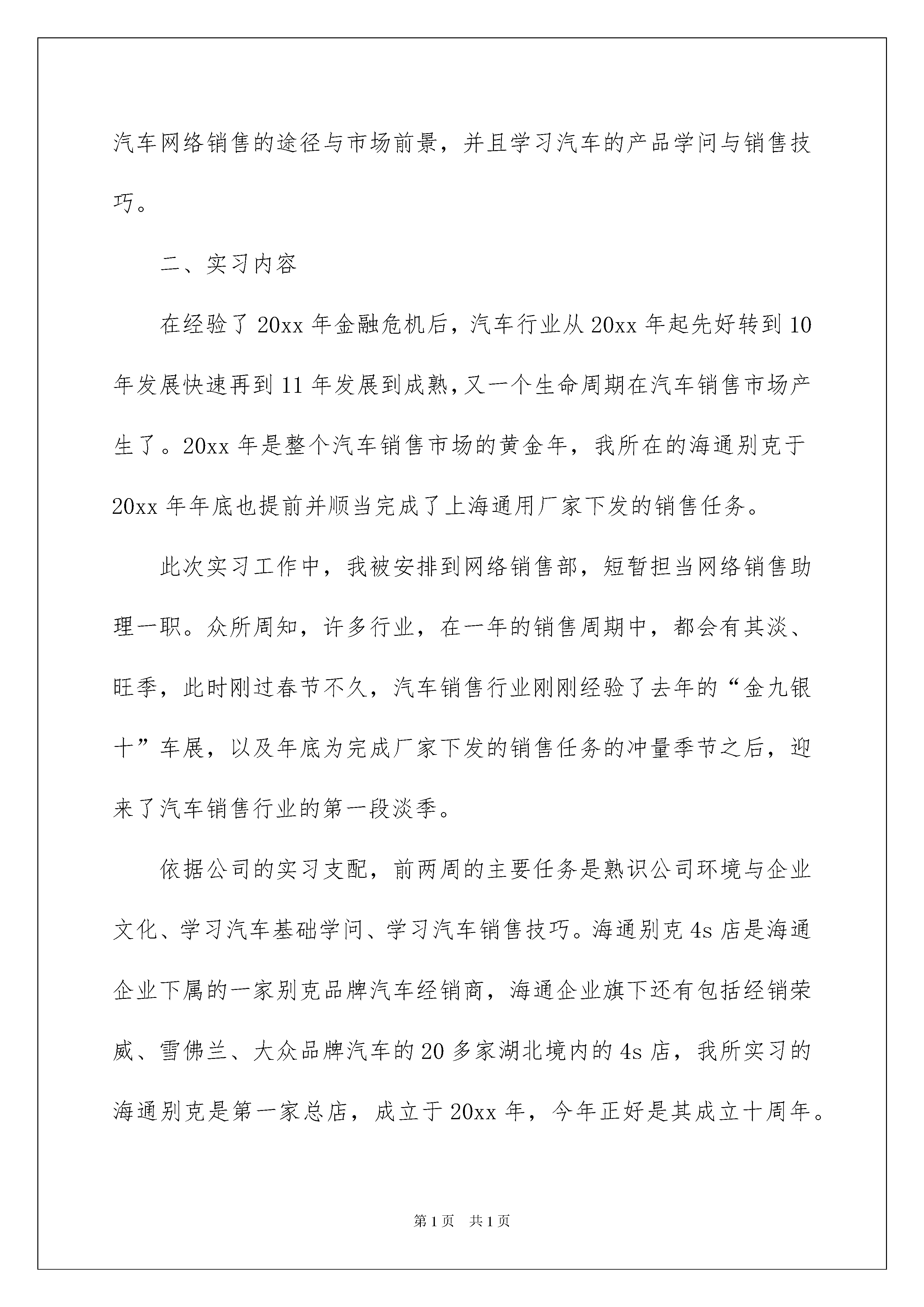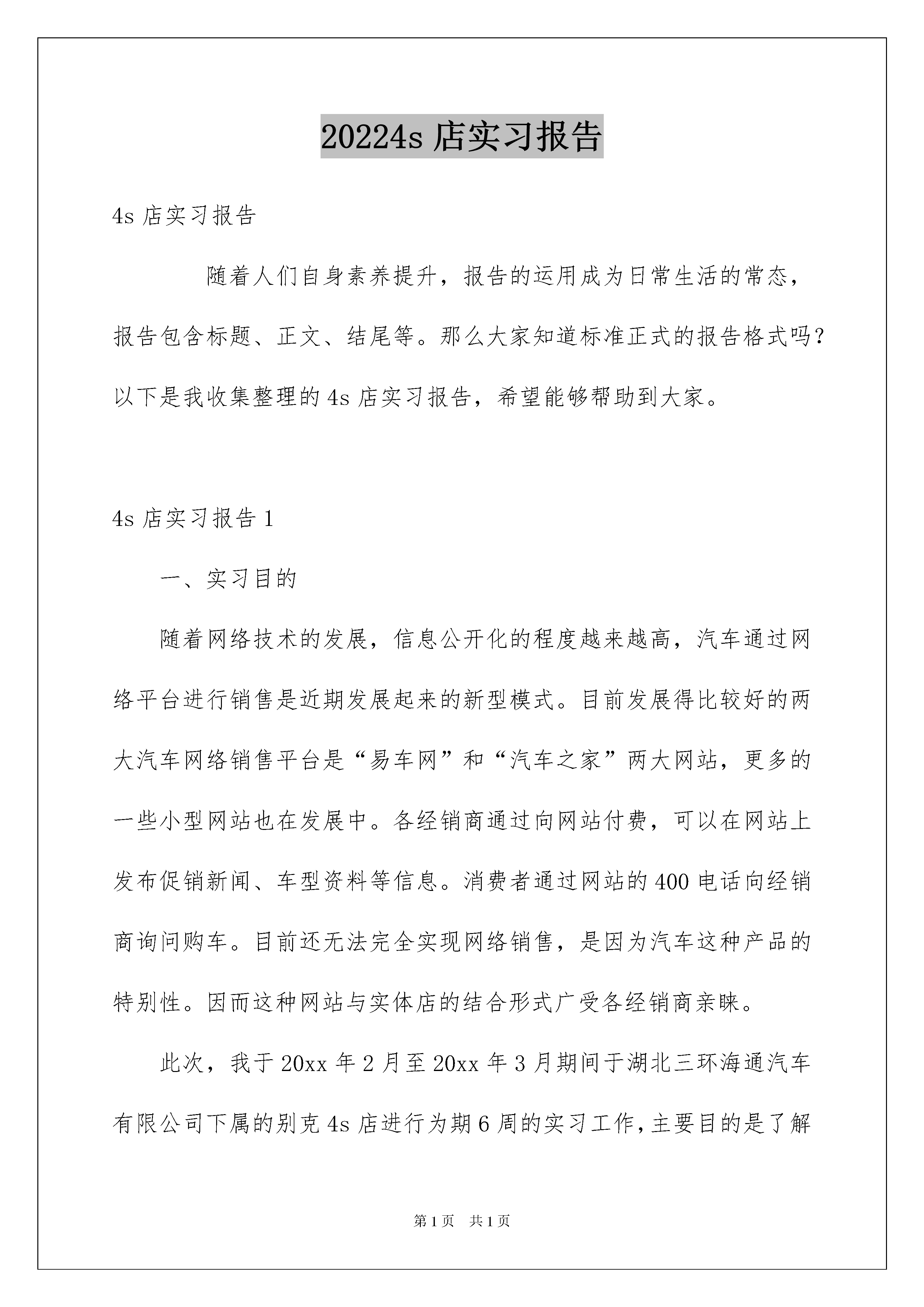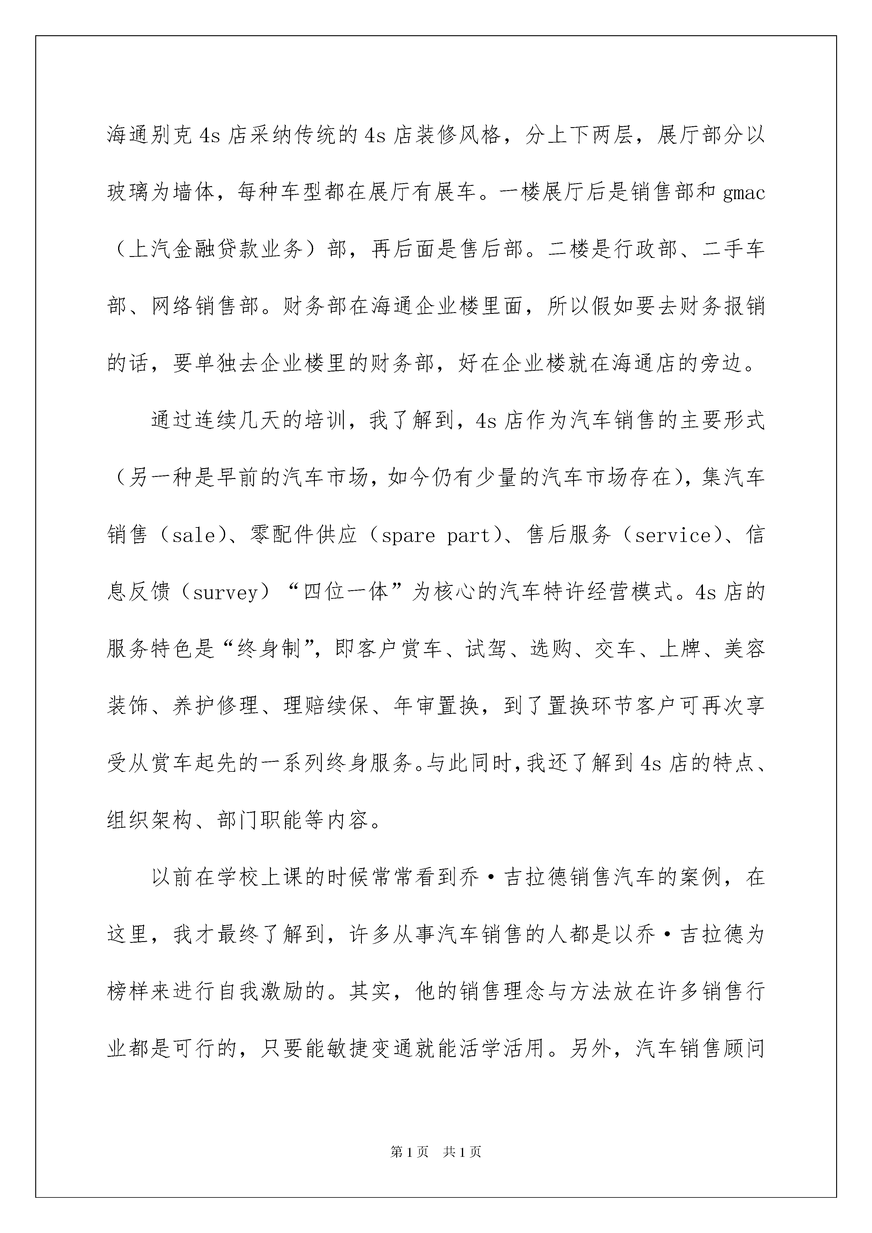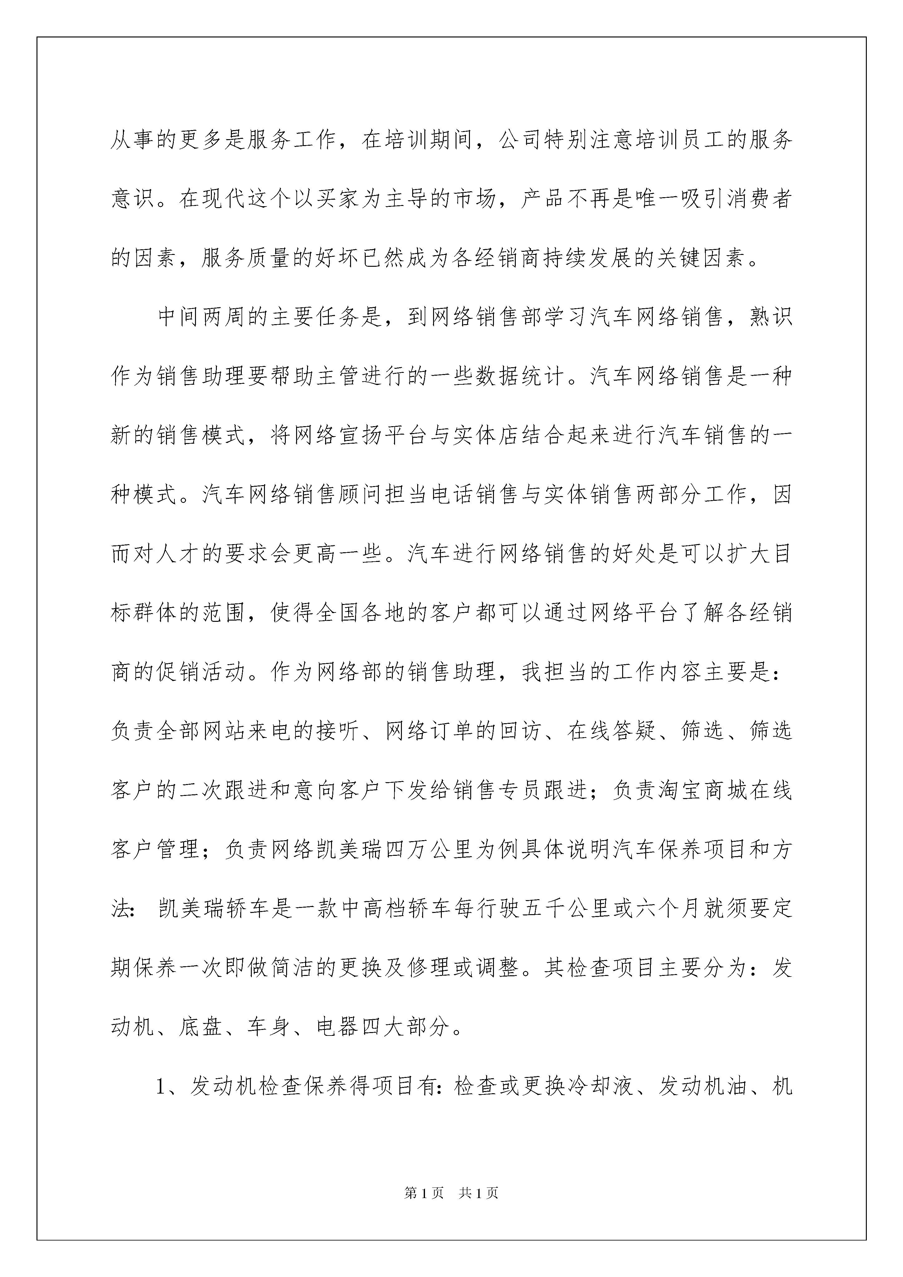 20224s店实习报告4s店实习报告随着人们自身素养提升,报告的运用成为日常生活的常态,报告包含标题、正文、结尾等。那么大家知道标准正式的报告格式吗?以下是我收集整理的4s店实习报告,希望能够帮助到大家。4s店实习报告1一、实习目的随着网络技术的发展,信息公开化的程度越来越高,汽车通过网络平台进行销售是近期发展起来的新型模式。目前发展得比较好的两大汽车网络销售平台是“易车网”和“汽车之家”两大网站,更多的一些小型网站也在发展中。各经销商通过向网站付费,可以在网站上发布促销新闻、车型资料等信息。消费者通过网站的400电话向经销商询问购车。目前还无法完全实现网络销售,是因为汽车这种产品的特别性。因而这种网站与实体店的结合形式广受各经销商亲睐。此次,我于20xx年2月至20xx年3月期间于湖北三环海通汽车有限公司下属的别克4s店进行为期6周的实习工作,主要目的是了解汽车网络销售的途径与市场前景,并且学习汽车的产品学问与销售技巧。二、实习内容在经验了20xx年金融危机后,汽车行业从20xx年起先好转到10年发展快速再到11年发展到成熟,又一个生命周期在汽车销售市场产生了。20xx年是整个汽车销售市场的黄金年,我所在的海通别克于20xx年年底也提前并顺当完成了上海通用厂家下发的销售任务。此次实习工作中,我被安排到网络销售部,短暂担当网络销售助理一职。众所周知,许多行业,在一年的销售周期中,都会有其淡、旺季,此时刚过春节不久,汽车销售行业刚刚经验了去年的“金九银十”车展,以及年底为完成厂家下发的销售任务的冲量季节之后,迎来了汽车销售行业的第一段淡季。依据公司的实习支配,前两周的主要任务是熟识公司环境与企业文化、学习汽车基础学问、学习汽车销售技巧。海通别克4s店是海通企业下属的一家别克品牌汽车经销商,海通企业旗下还有包括经销荣威、雪佛兰、大众品牌汽车的20多家湖北境内的4s店,我所实习的海通别克是第一家总店,成立于20xx年,今年正好是其成立十周年。海通别克4s店采纳传统的4s店装修风格,分上下两层,展厅部分以玻璃为墙体,每种车型都在展厅有展车。一楼展厅后是销售部和gmac(上汽金融贷款业务)部,再后面是售后部。二楼是行政部、二手车部、网络销售部。财务部在海通企业楼里面,所以假如要去财务报销的话,要单独去企业楼里的财务部,好在企业楼就在海通店的旁边。通过连续几天的培训,我了解到,4s店作为汽车销售的主要形式(另一种是早前的汽车市场,如今仍有少量的汽车市场存在),集汽车销售(sale)、零配件供应(sparepart)、售后服务(service)、信息反馈(survey)“四位一体”为核心的汽车特许经营模式。4s店的服务特色是“终身制”,即客户赏车、试驾、选购、交车、上牌、美容装饰、养护修理、理赔续保、年审置换,到了置换环节客户可再次享受从赏车起先的一系列终身服务。与此同时,我还了解到4s店的特点、组织架构、部门职能等内容。以前在学校上课的时候常常看到乔·吉拉德销售汽车的案例,在这里,我才最终了解到,许多从事汽车销售的人都是以乔·吉拉德为榜样来进行自我激励的。其实,他的销售理念与方法放在许多销售行业都是可行的,只要能敏捷变通就能活学活用。另外,汽车销售顾问从事的更多是服务工作,在培训期间,公司特别注意培训员工的服务意识。在现代这个以买家为主导的市场,产品不再是唯一吸引消费者的因素,服务质量的好坏已然成为各经销商持续发展的关键因素。中间两周的主要任务是,到网络销售部学习汽车网络销售,熟识作为销售助理要帮助主管进行的一些数据统计。汽车网络销售是一种新的销售模式,将网络宣扬平台与实体店结合起来进行汽车销售的一种模式。汽车网络销售顾问担当电话销售与实体销售两部分工作,因而对人才的要求会更高一些。汽车进行网络销售的好处是可以扩大目标群体的范围,使得全国各地的客户都可以通过网络平台了解各经销商的促销活动。作为网络部的销售助理,我担当的工作内容主要是:负责全部网站来电的接听、网络订单的回访、在线答疑、筛选、筛选客户的二次跟进和意向客户下发给销售专员跟进;负责淘宝商城在线客户管理;负责网络凯美瑞四万公里为例具体说明汽车保养项目和方法:凯美瑞轿车是一款中高档轿车每行驶五千公里或六个月就须要定期保养一次即做简洁的更换及修理或调整。其检查项目主要分为:发动机、底盘、车身、电器四大部分。1、发动机检查保养得项目有:检查或更换冷却液、发动机油、机油滤清器、放油螺栓垫片、刹车油、变速器油、玻璃水、汽油泵滤网、蓄电池或电解液等。(1)发动机油、机油滤清器、放油轮栓垫片的更换周期为每五千公里或六个月更换一次,它们都是一