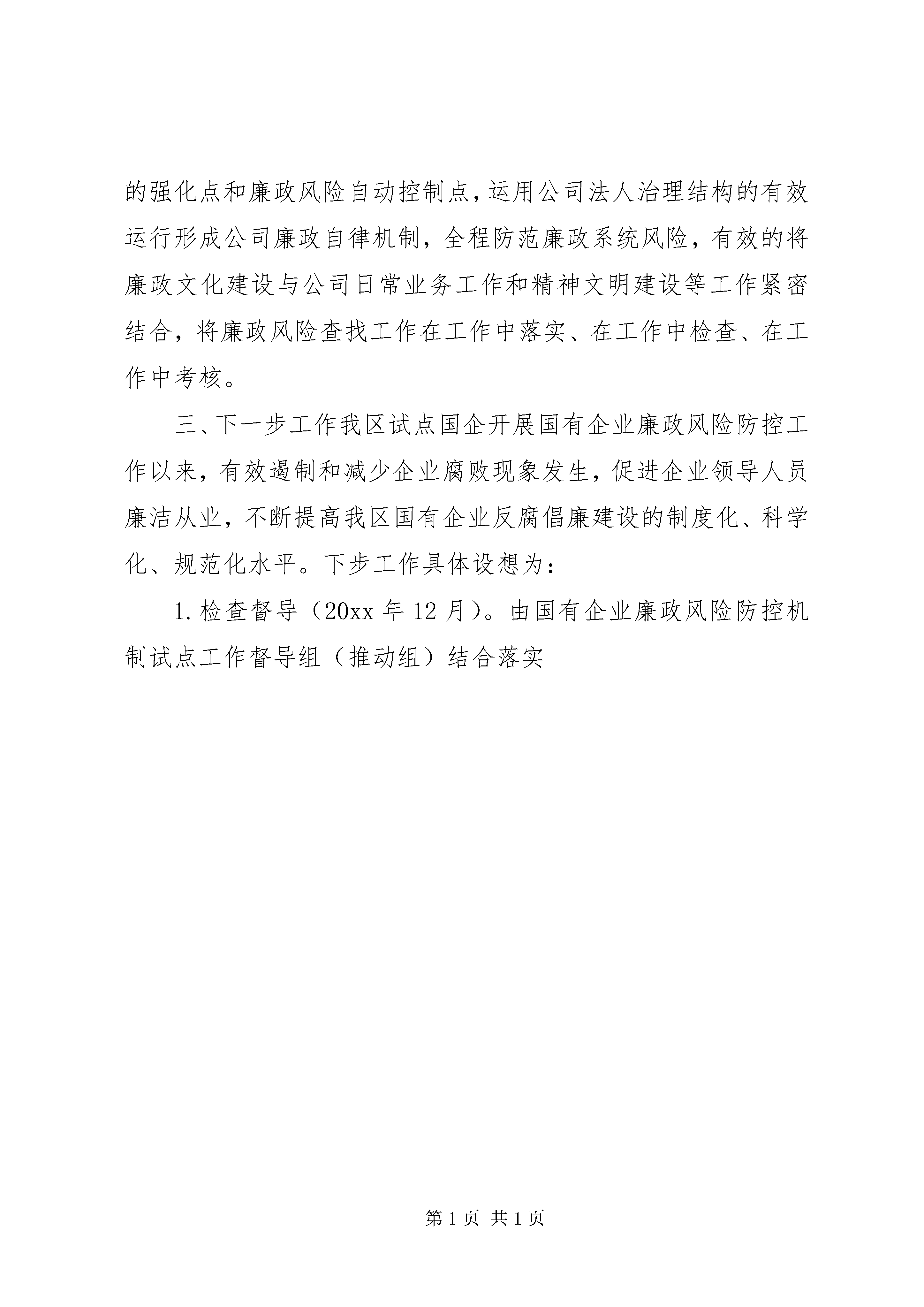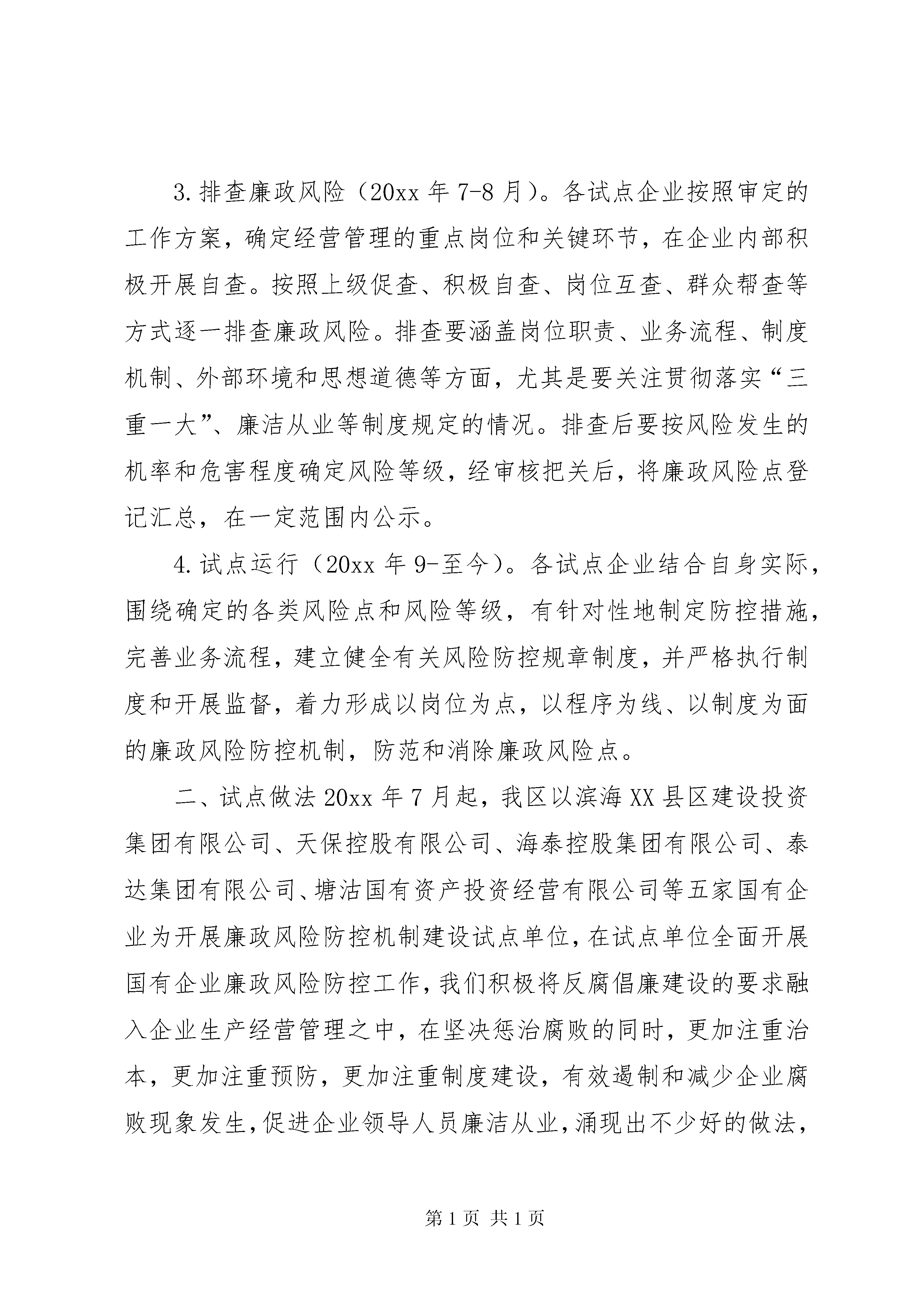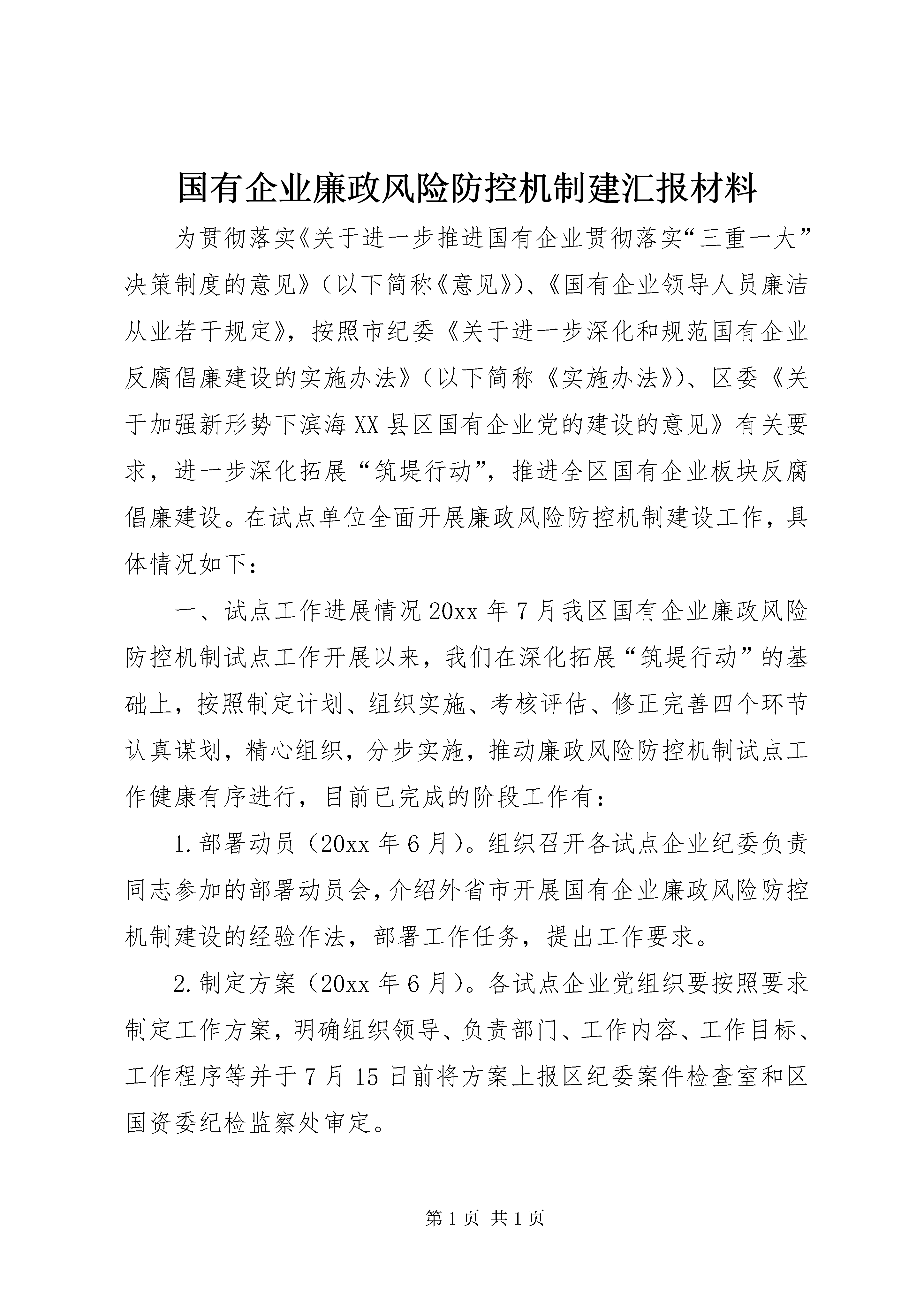 国有企业廉政风险防控机制建汇报材料为贯彻落实《关于进一步推进国有企业贯彻落实“三重一大”决策制度的意见》(以下简称《意见》)、《国有企业领导人员廉洁从业若干规定》,按照市纪委《关于进一步深化和规范国有企业反腐倡廉建设的实施办法》(以下简称《实施办法》)、区委《关于加强新形势下滨海XX县区国有企业党的建设的意见》有关要求,进一步深化拓展“筑堤行动”,推进全区国有企业板块反腐倡廉建设。在试点单位全面开展廉政风险防控机制建设工作,具体情况如下:一、试点工作进展情况20xx年7月我区国有企业廉政风险防控机制试点工作开展以来,我们在深化拓展“筑堤行动”的基础上,按照制定计划、组织实施、考核评估、修正完善四个环节认真谋划,精心组织,分步实施,推动廉政风险防控机制试点工作健康有序进行,目前已完成的阶段工作有:1.部署动员(20xx年6月)。组织召开各试点企业纪委负责同志参加的部署动员会,介绍外省市开展国有企业廉政风险防控机制建设的经验作法,部署工作任务,提出工作要求。2.制定方案(20xx年6月)。各试点企业党组织要按照要求制定工作方案,明确组织领导、负责部门、工作内容、工作目标、工作程序等并于7月15日前将方案上报区纪委案件检查室和区国资委纪检监察处审定。3.排查廉政风险(20xx年7-8月)。各试点企业按照审定的工作方案,确定经营管理的重点岗位和关键环节,在企业内部积极开展自查。按照上级促查、积极自查、岗位互查、群众帮查等方式逐一排查廉政风险。排查要涵盖岗位职责、业务流程、制度机制、外部环境和思想道德等方面,尤其是要关注贯彻落实“三重一大”、廉洁从业等制度规定的情况。排查后要按风险发生的机率和危害程度确定风险等级,经审核把关后,将廉政风险点登记汇总,在一定范围内公示。4.试点运行(20xx年9-至今)。各试点企业结合自身实际,围绕确定的各类风险点和风险等级,有针对性地制定防控措施,完善业务流程,建立健全有关风险防控规章制度,并严格执行制度和开展监督,着力形成以岗位为点,以程序为线、以制度为面的廉政风险防控机制,防范和消除廉政风险点。二、试点做法20xx年7月起,我区以滨海XX县区建设投资集团有限公司、天保控股有限公司、海泰控股集团有限公司、泰达集团有限公司、塘沽国有资产投资经营有限公司等五家国有企业为开展廉政风险防控机制建设试点单位,在试点单位全面开展国有企业廉政风险防控工作,我们积极将反腐倡廉建设的要求融入企业生产经营管理之中,在坚决惩治腐败的同时,更加注重治本,更加注重预防,更加注重制度建设,有效遏制和减少企业腐败现象发生,促进企业领导人员廉洁从业,涌现出不少好的做法,对于不断提高我区国有企业反腐倡廉建设的制度化、科学化、规范化水平发挥了巨大的作用。具体的主要试点做法有;1、加强领导、扩大宣传组织领导有力是关键。为推动该项试点工作的深入开展,试点各公司把党政“一把手”工程抓紧抓好,加大宣传力度,充分利用中心组学习、党委扩大会议、网络等各种平台和载体,大力宣传开展廉政风险防控工作的意义、工作方式方法,统一思想认识,充分调动广大干部职工支持和参与廉政风险防控工作的积极性,形成推进廉政风险防控工作的广泛共识和强大合力。2、措施到位、突出重点措施落实到位是保障。试点单位坚持把领导干部作为开展工作的重点,突出抓好工程项目建设、招投标、资金使用、物资采购等重点领域的腐败预警防控工作,突出权力运行的“关节点”,内部管理的“薄弱点”,问题易发的“风险点”。统一思想,提高认识,以高度的政治责任感、良好的精神状态和开拓进取、求真务实的作风,积极投入到本次试点工作中,确保了工作取得切实的成效。3、超前谋划,彰显品格准确定位企业的特殊性质,制定详细具体的廉政风险防控标准化工程实施方案,形成试点单位独具特色的廉政工作和文化建设理念和体系。如:塘沽国投公司在开展廉政风险防控时,以“绿、律、率”文化为核心,把公司运行系统涉及钱、权、人的易产生腐败的关节点,作为公司廉政建设的强化点和廉政风险自动控制点,运用公司法人治理结构的有效运行形成公司廉政自律机制,全程防范廉政系统风险,有效的将廉政文化建设与公司日常业务工作和精神文明建设等工作紧密结合,将廉政风险查找工作在工作中落实、在工作中检查、在工作中考核。三、下一步工作我区试点国企开展国有企业廉政风险防控工作以来,有效遏制和减少企业腐败现象发生,促进企业领导人员廉洁从业,不断提高我区国有企业反腐倡廉建设的制度化、科学化、规范化水平。下步工作具体设想为:1.检查督导(20xx年12月)。由国有企业廉政风险防控机制试点工作督导组(推动组)结合落实
