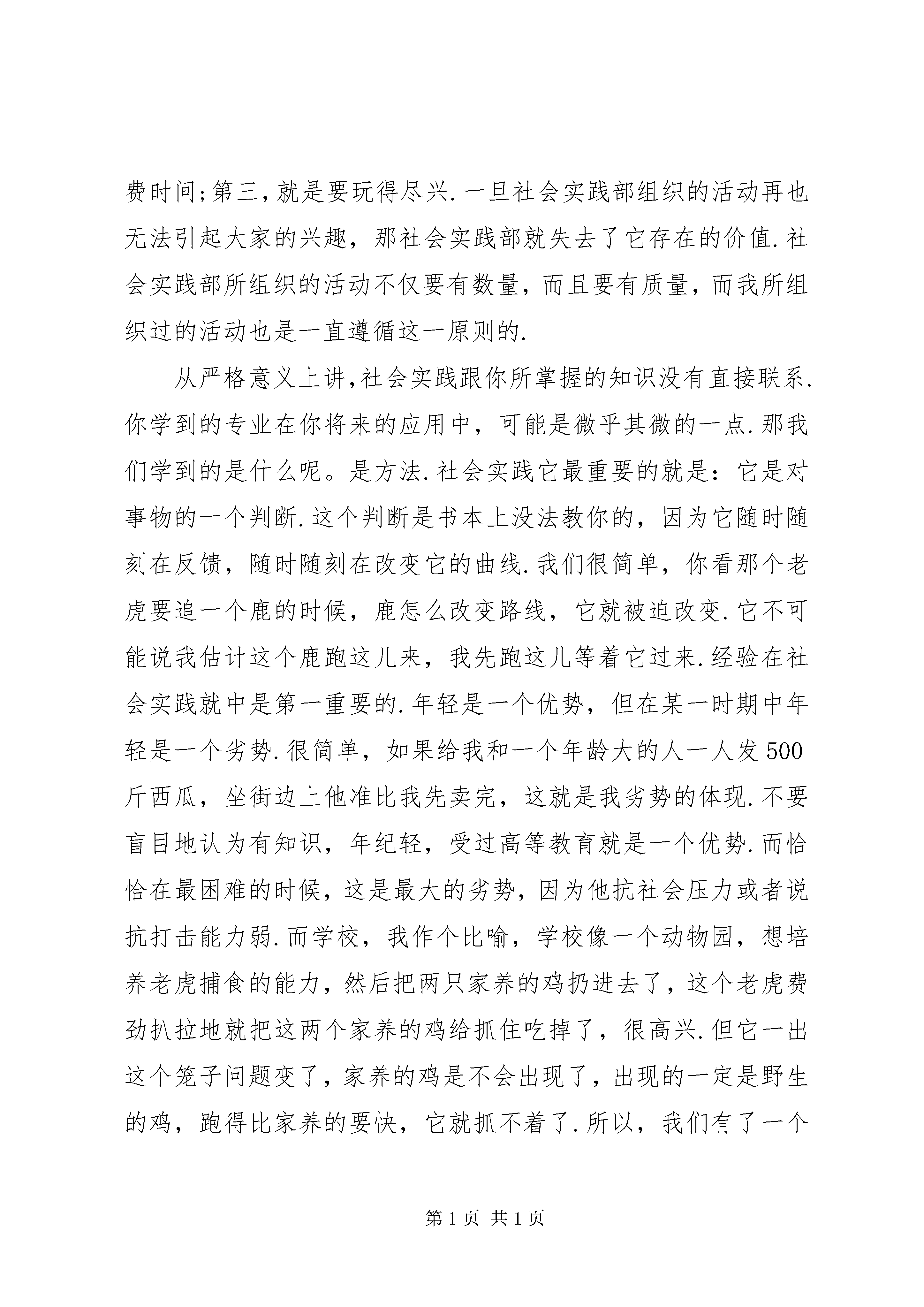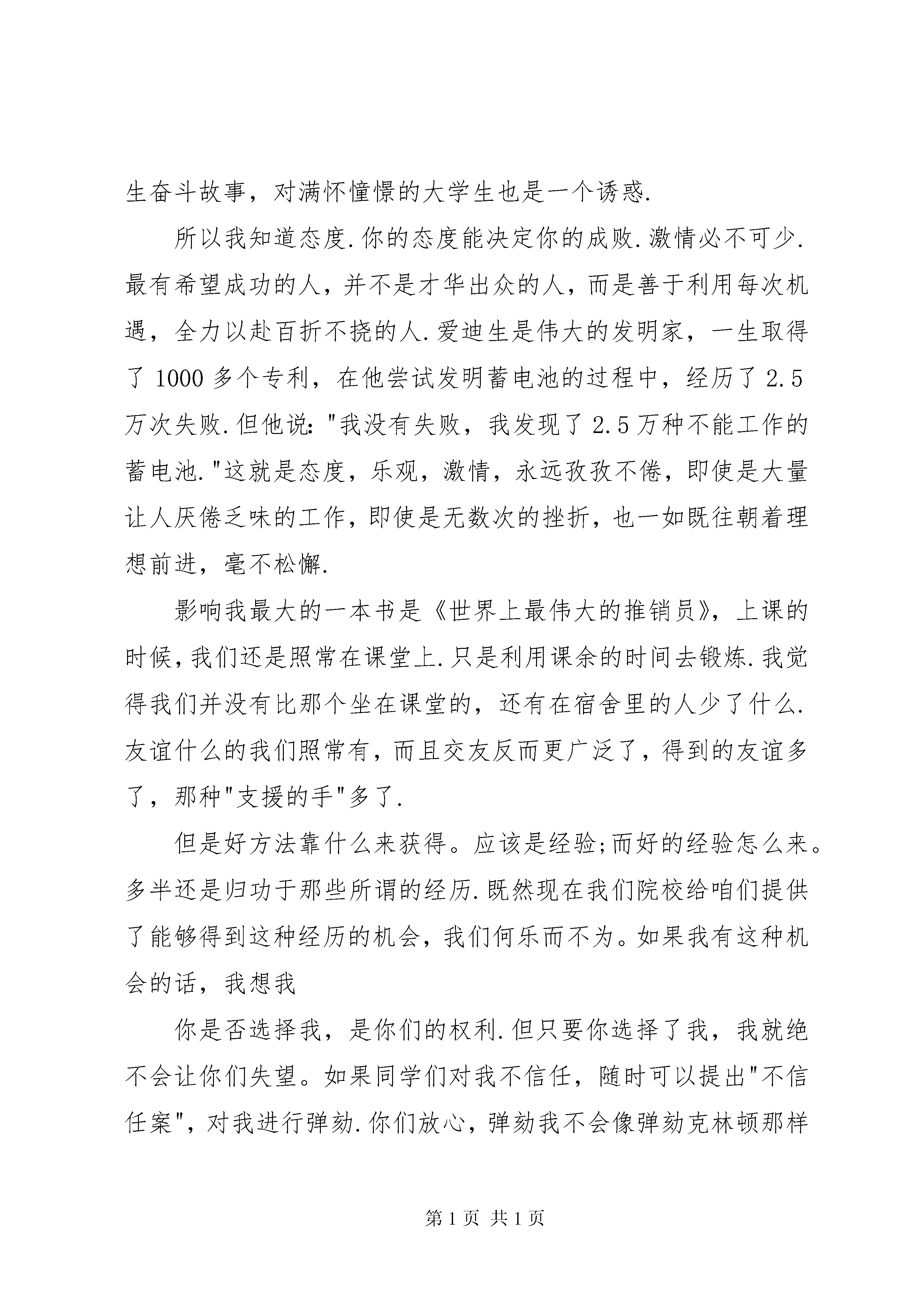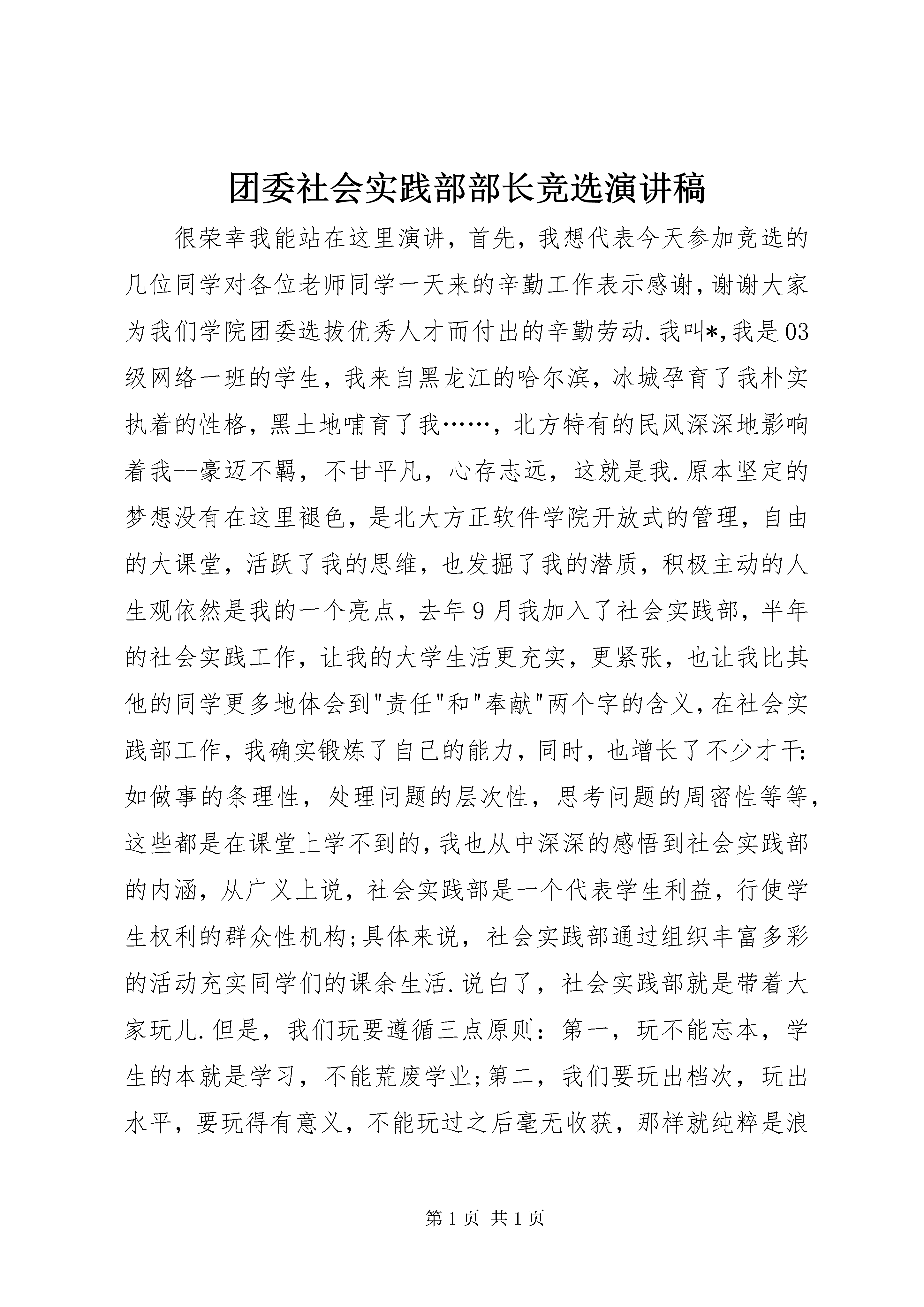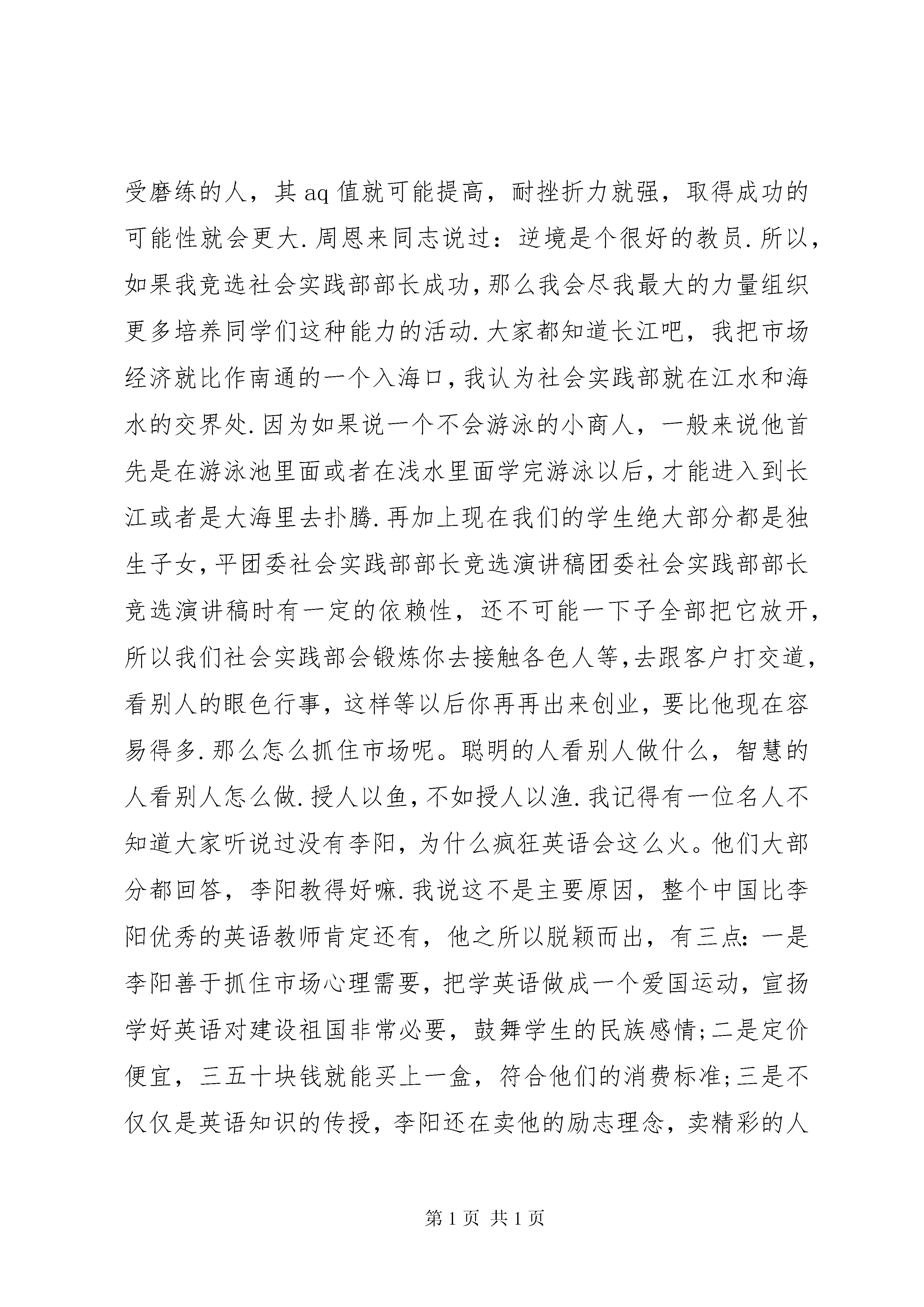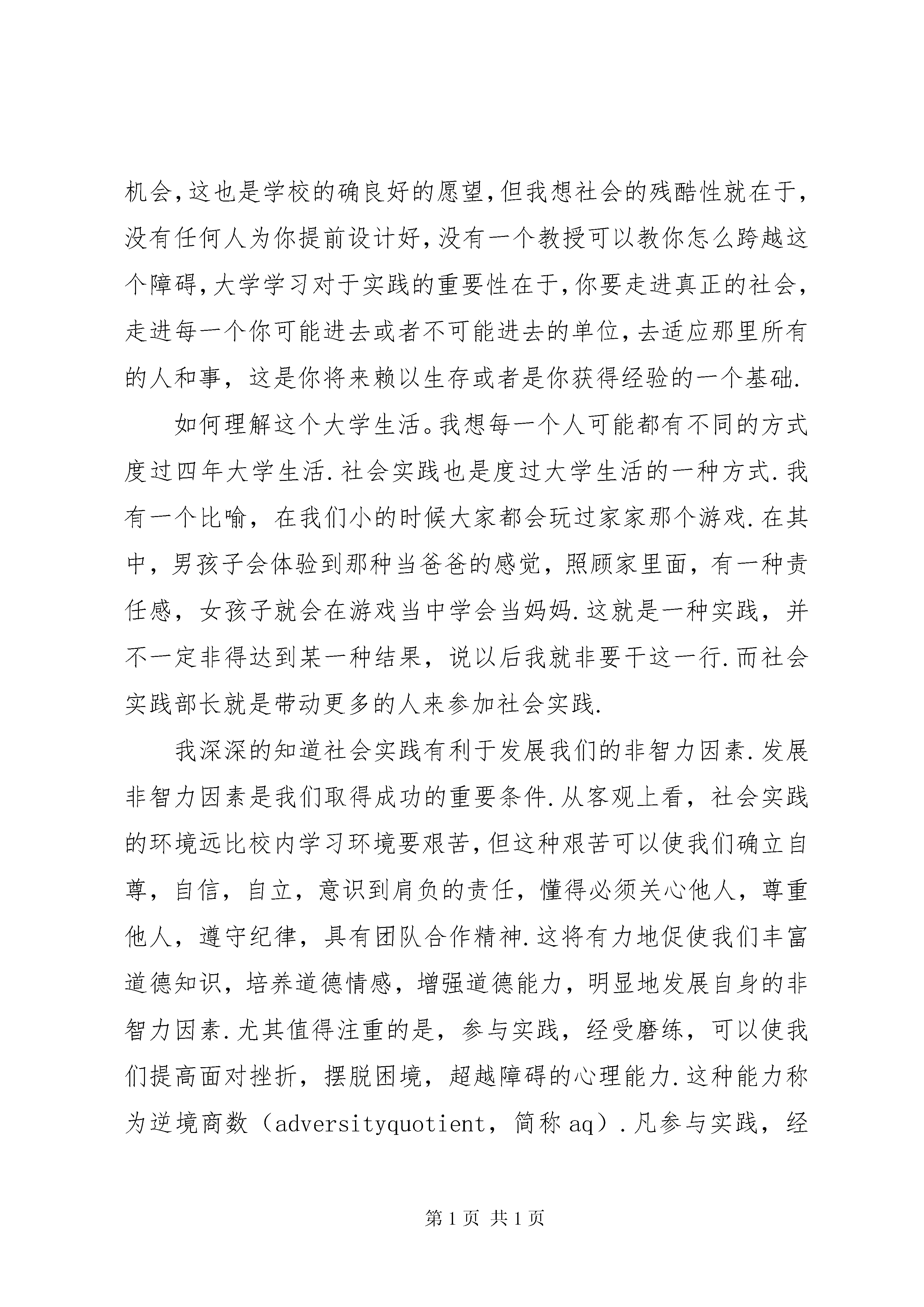 团委社会实践部部长竞选演讲稿很荣幸我能站在这里演讲,首先,我想代表今天参加竞选的几位同学对各位老师同学一天来的辛勤工作表示感谢,谢谢大家为我们学院团委选拔优秀人才而付出的辛勤劳动.我叫*,我是03级网络一班的学生,我来自黑龙江的哈尔滨,冰城孕育了我朴实执着的性格,黑土地哺育了我……,北方特有的民风深深地影响着我--豪迈不羁,不甘平凡,心存志远,这就是我.原本坚定的梦想没有在这里褪色,是北大方正软件学院开放式的管理,自由的大课堂,活跃了我的思维,也发掘了我的潜质,积极主动的人生观依然是我的一个亮点,去年9月我加入了社会实践部,半年的社会实践工作,让我的大学生活更充实,更紧张,也让我比其他的同学更多地体会到"责任"和"奉献"两个字的含义,在社会实践部工作,我确实锻炼了自己的能力,同时,也增长了不少才干:如做事的条理性,处理问题的层次性,思考问题的周密性等等,这些都是在课堂上学不到的,我也从中深深的感悟到社会实践部的内涵,从广义上说,社会实践部是一个代表学生利益,行使学生权利的群众性机构;具体来说,社会实践部通过组织丰富多彩的活动充实同学们的课余生活.说白了,社会实践部就是带着大家玩儿.但是,我们玩要遵循三点原则:第一,玩不能忘本,学生的本就是学习,不能荒废学业;第二,我们要玩出档次,玩出水平,要玩得有意义,不能玩过之后毫无收获,那样就纯粹是浪费时间;第三,就是要玩得尽兴.一旦社会实践部组织的活动再也无法引起大家的兴趣,那社会实践部就失去了它存在的价值.社会实践部所组织的活动不仅要有数量,而且要有质量,而我所组织过的活动也是一直遵循这一原则的.从严格意义上讲,社会实践跟你所掌握的知识没有直接联系.你学到的专业在你将来的应用中,可能是微乎其微的一点.那我们学到的是什么呢。是方法.社会实践它最重要的就是:它是对事物的一个判断.这个判断是书本上没法教你的,因为它随时随刻在反馈,随时随刻在改变它的曲线.我们很简单,你看那个老虎要追一个鹿的时候,鹿怎么改变路线,它就被迫改变.它不可能说我估计这个鹿跑这儿来,我先跑这儿等着它过来.经验在社会实践就中是第一重要的.年轻是一个优势,但在某一时期中年轻是一个劣势.很简单,如果给我和一个年龄大的人一人发500斤西瓜,坐街边上他准比我先卖完,这就是我劣势的体现.不要盲目地认为有知识,年纪轻,受过高等教育就是一个优势.而恰恰在最困难的时候,这是最大的劣势,因为他抗社会压力或者说抗打击能力弱.而学校,我作个比喻,学校像一个动物园,想培养老虎捕食的能力,然后把两只家养的鸡扔进去了,这个老虎费劲扒拉地就把这两个家养的鸡给抓住吃掉了,很高兴.但它一出这个笼子问题变了,家养的鸡是不会出现了,出现的一定是野生的鸡,跑得比家养的要快,它就抓不着了.所以,我们有了一个机会,这也是学校的确良好的愿望,但我想社会的残酷性就在于,没有任何人为你提前设计好,没有一个教授可以教你怎么跨越这个障碍,大学学习对于实践的重要性在于,你要走进真正的社会,走进每一个你可能进去或者不可能进去的单位,去适应那里所有的人和事,这是你将来赖以生存或者是你获得经验的一个基础.如何理解这个大学生活。我想每一个人可能都有不同的方式度过四年大学生活.社会实践也是度过大学生活的一种方式.我有一个比喻,在我们小的时候大家都会玩过家家那个游戏.在其中,男孩子会体验到那种当爸爸的感觉,照顾家里面,有一种责任感,女孩子就会在游戏当中学会当妈妈.这就是一种实践,并不一定非得达到某一种结果,说以后我就非要干这一行.而社会实践部长就是带动更多的人来参加社会实践.我深深的知道社会实践有利于发展我们的非智力因素.发展非智力因素是我们取得成功的重要条件.从客观上看,社会实践的环境远比校内学习环境要艰苦,但这种艰苦可以使我们确立自尊,自信,自立,意识到肩负的责任,懂得必须关心他人,尊重他人,遵守纪律,具有团队合作精神.这将有力地促使我们丰富道德知识,培养道德情感,增强道德能力,明显地发展自身的非智力因素.尤其值得注重的是,参与实践,经受磨练,可以使我们提高面对挫折,摆脱困境,超越障碍的心理能力.这种能力称为逆境商数(adversityquotient,简称aq).凡参与实践,经受磨练的人,其aq值就可能提高,耐挫折力就强,取得成功的可能性就会更大.周恩来同志说过:逆境是个很好的教员.所以,如果我竞选社会实践部部长成功,那么我会尽我最大的力量组织更多培养同学们这种能力的活动.大家都知道长江吧,我把市场经济就比作南通的一个入海口,我认为社会实践部就在江水和海水的交界处.因为如果说一个不会游泳的小商人,一般来说他首先是在游泳池里面或者在浅水里面学完游泳以后,才能进入到长江或者是大海里去扑腾.再加上现在我们的学生绝大部分都是独生子女,平团委社会实践部部长竞选演讲稿