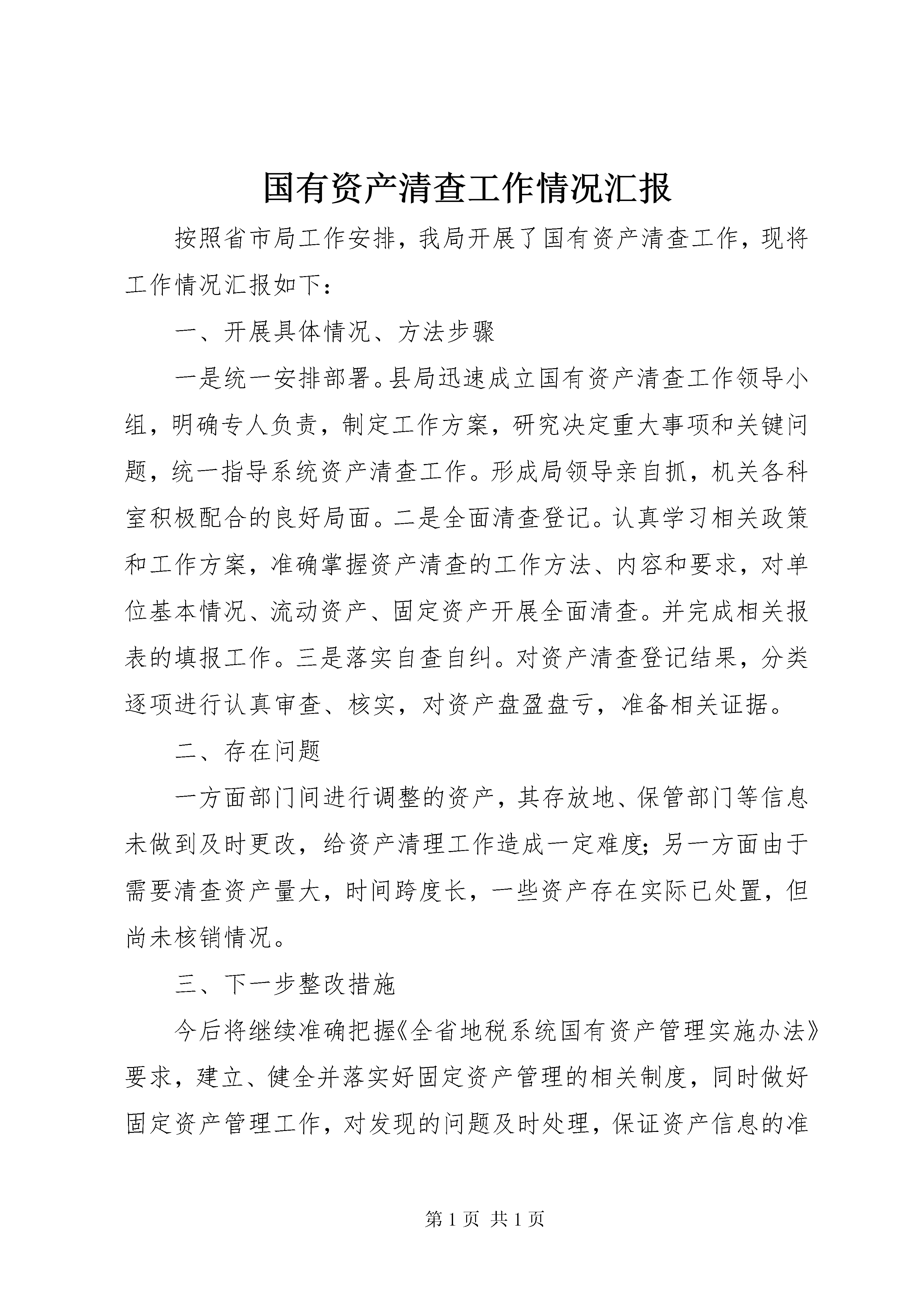 国有资产清查工作情况汇报按照省市局工作安排,我局开展了国有资产清查工作,现将工作情况汇报如下:一、开展具体情况、方法步骤一是统一安排部署。县局迅速成立国有资产清查工作领导小组,明确专人负责,制定工作方案,研究决定重大事项和关键问题,统一指导系统资产清查工作。形成局领导亲自抓,机关各科室积极配合的良好局面。二是全面清查登记。认真学习相关政策和工作方案,准确掌握资产清查的工作方法、内容和要求,对单位基本情况、流动资产、固定资产开展全面清查。并完成相关报表的填报工作。三是落实自查自纠。对资产清查登记结果,分类逐项进行认真审查、核实,对资产盘盈盘亏,准备相关证据。二、存在问题一方面部门间进行调整的资产,其存放地、保管部门等信息未做到及时更改,给资产清理工作造成一定难度;另一方面由于需要清查资产量大,时间跨度长,一些资产存在实际已处置,但尚未核销情况。三、下一步整改措施今后将继续准确把握《全省地税系统国有资产管理实施办法》要求,建立、健全并落实好固定资产管理的相关制度,同时做好固定资产管理工作,对发现的问题及时处理,保证资产信息的准确性,做到帐实相符。