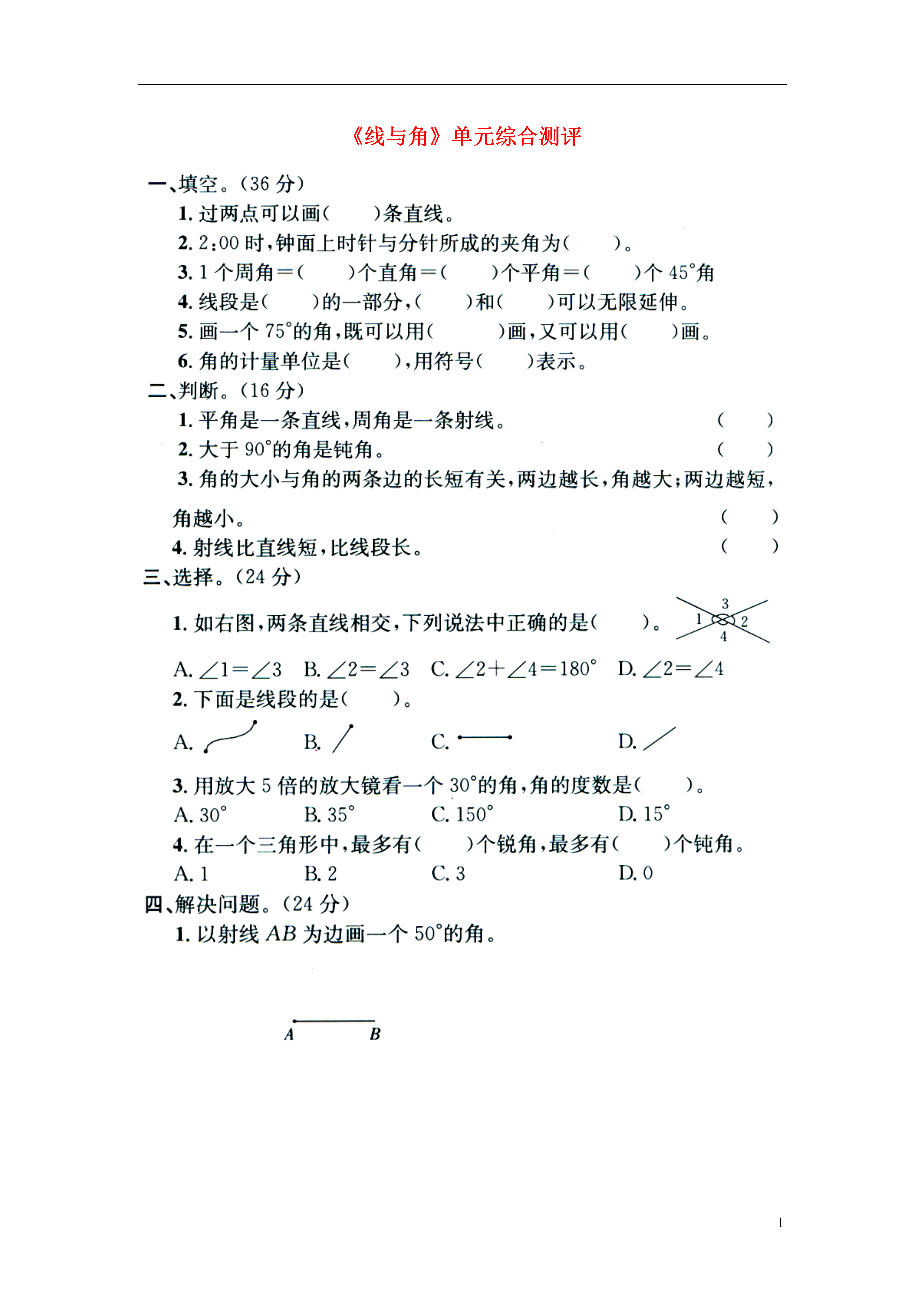 试题-全国-2016_2016四年级数学上册 第4单元《线和角》(线与角)单元综合测评(无答案)(新版)冀教版.doc