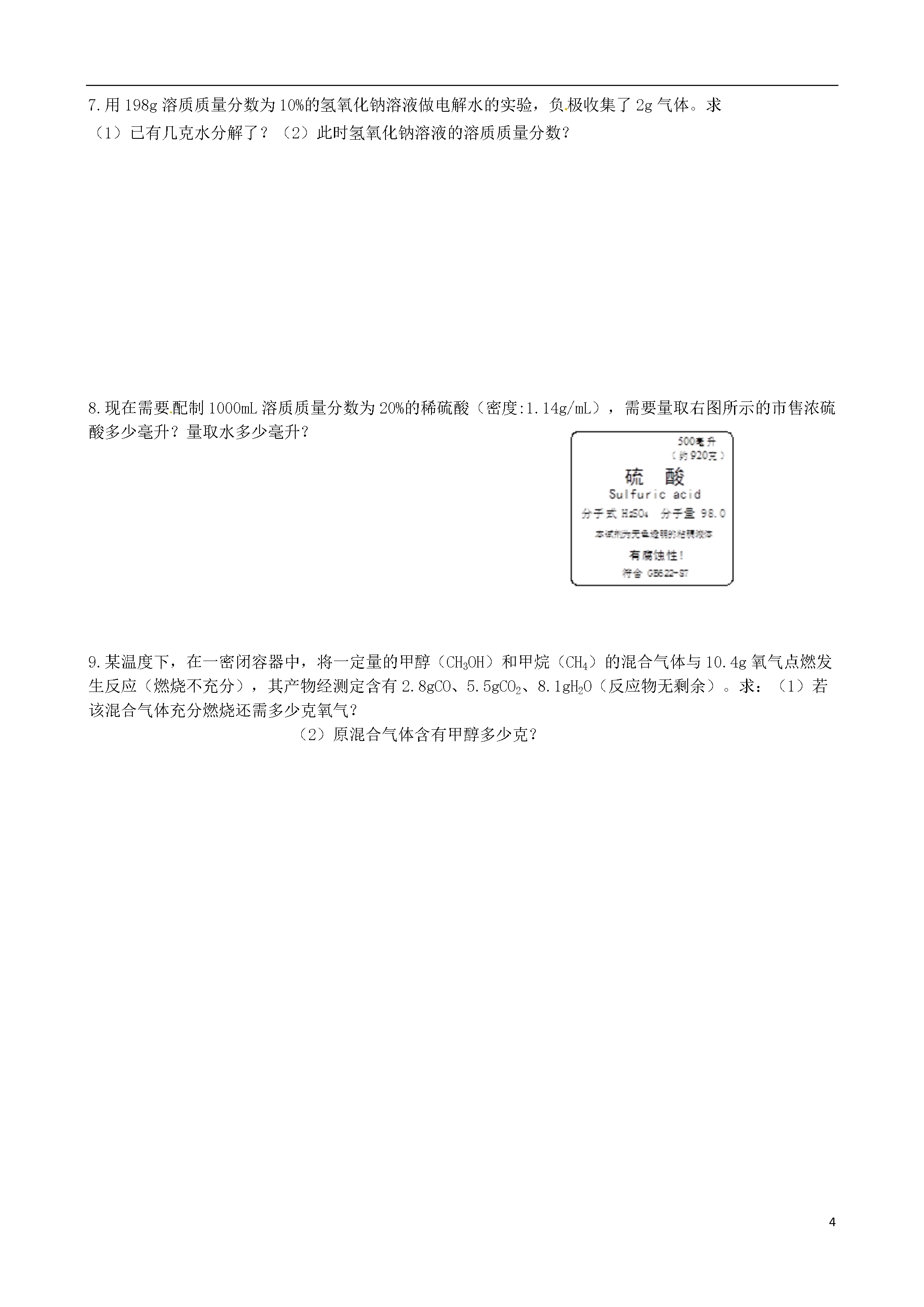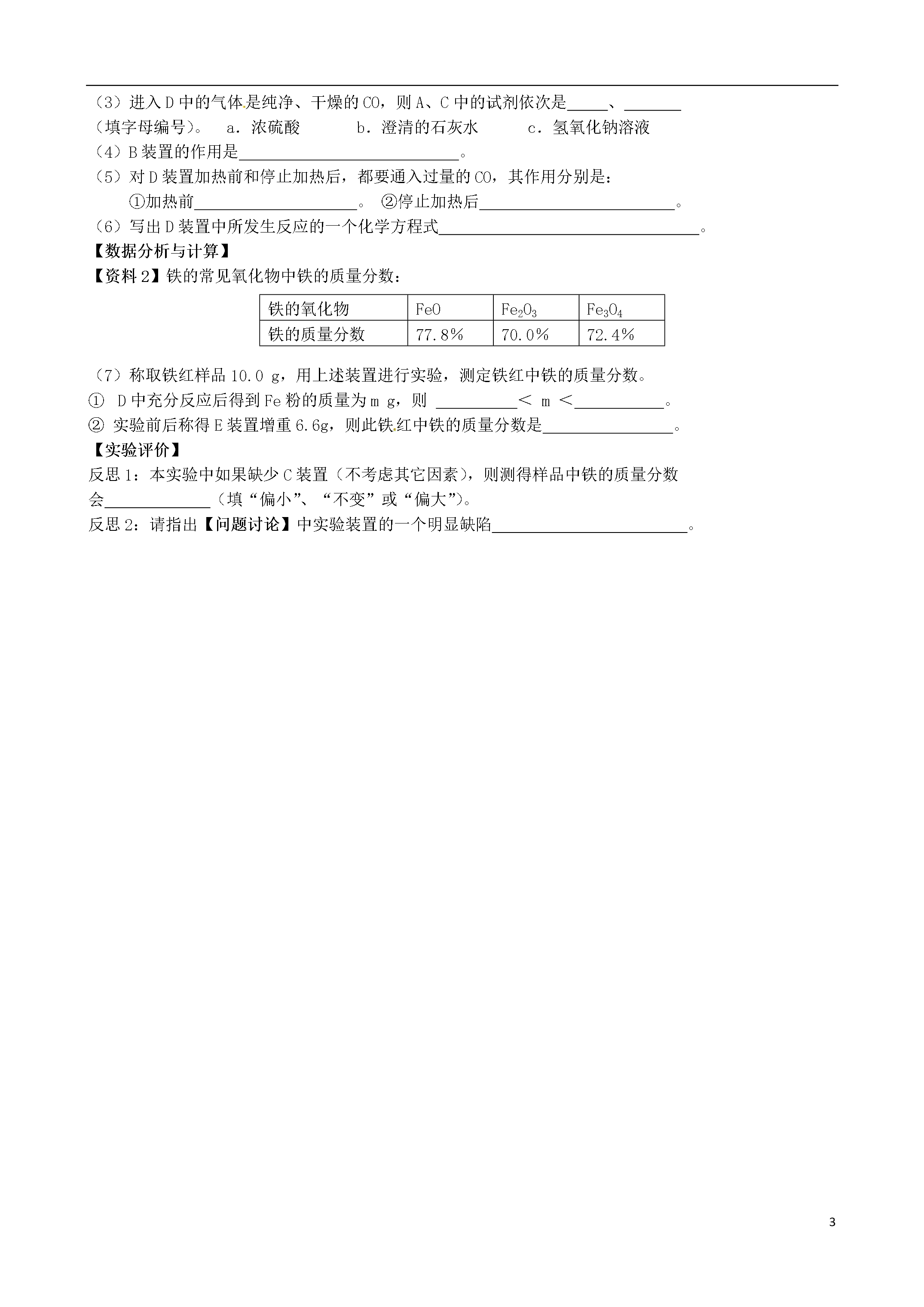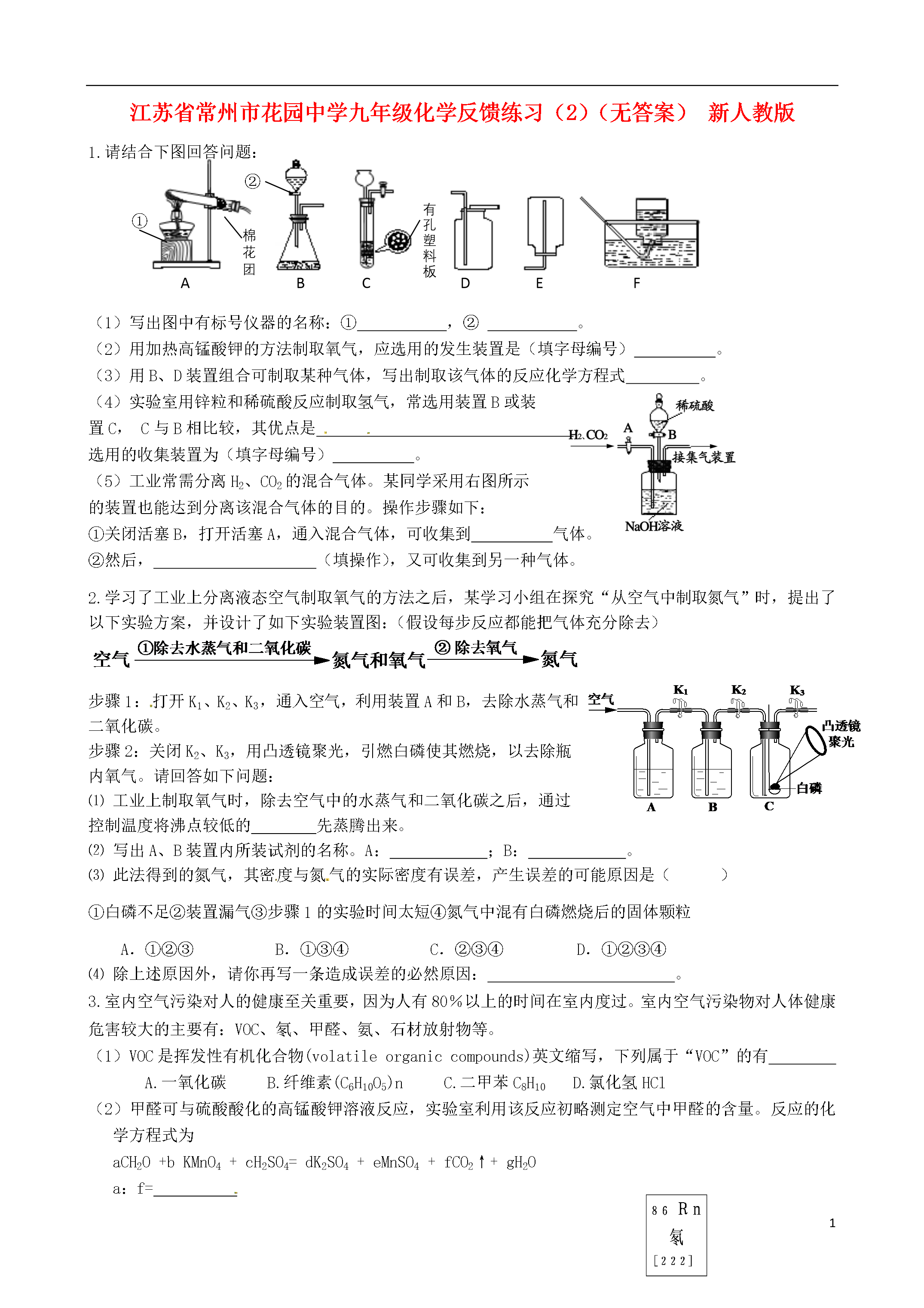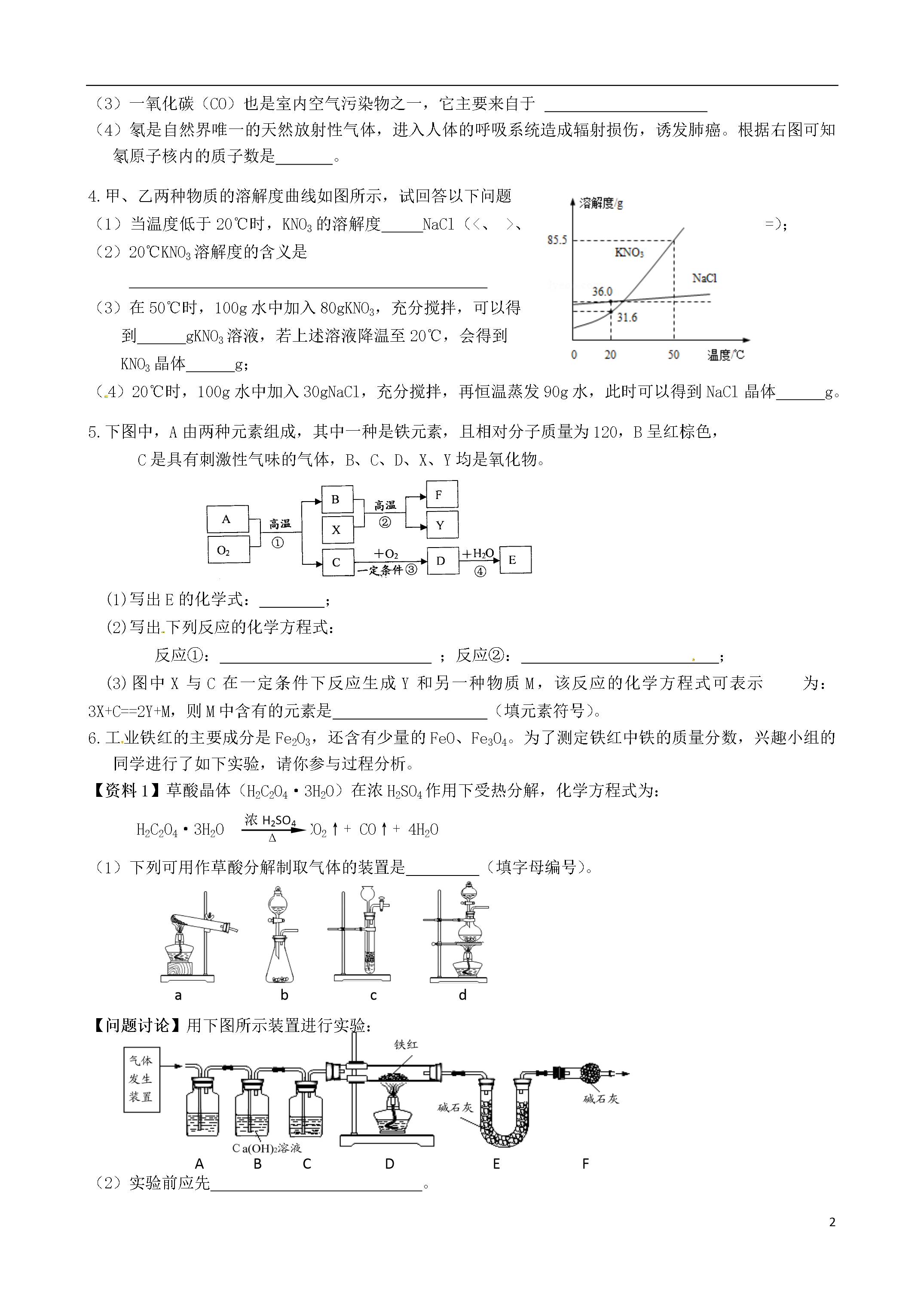4江苏省常州市花园中学九年级化学反馈练习(2)(无答案)新人教版1.请结合下图回答问题:①②有孔塑料板棉花团ABCDEF(1)写出图中有标号仪器的名称:①,②。(2)用加热高锰酸钾的方法制取氧气,应选用的发生装置是(填字母编号)。(3)用B、D装置组合可制取某种气体,写出制取该气体的反应化学方程式。(4)实验室用锌粒和稀硫酸反应制取氢气,常选用装置B或装置C,C与B相比较,其优点是,选用的收集装置为(填字母编号)。(5)工业常需分离H2、CO2的混合气体。某同学采用右图所示的装置也能达到分离该混合气体的目的。操作步骤如下:①关闭活塞B,打开活塞A,通入混合气体,可收集到气体。②然后,(填操作),又可收集到另一种气体。2.学习了工业上分离液态空气制取氧气的方法之后,某学习小组在探究“从空气中制取氮气”时,提出了以下实验方案,并设计了如下实验装置图:(假设每步反应都能把气体充分除去)步骤1:打开K1、K2、K3,通入空气,利用装置A和B,去除水蒸气和二氧化碳。步骤2:关闭K2、K3,用凸透镜聚光,引燃白磷使其燃烧,以去除瓶内氧气。请回答如下问题:⑴工业上制取氧气时,除去空气中的水蒸气和二氧化碳之后,通过控制温度将沸点较低的先蒸腾出来。⑵写出A、B装置内所装试剂的名称。A:;B:。⑶此法得到的氮气,其密度与氮气的实际密度有误差,产生误差的可能原因是()①白磷不足②装置漏气③步骤1的实验时间太短④氮气中混有白磷燃烧后的固体颗粒A.①②③B.①③④C.②③④D.①②③④⑷除上述原因外,请你再写一条造成误差的必然原因:。3.室内空气污染对人的健康至关重要,因为人有80%以上的时间在室内度过。室内空气污染物对人体健康危害较大的主要有:VOC、氡、甲醛、氨、石材放射物等。(1)VOC是挥发性有机化合物(volatileorganiccompounds)英文缩写,下列属于“VOC”的有A.一氧化碳B.纤维素(C6H10O5)nC.二甲苯C8H10D.氯化氢HCl(2)甲醛可与硫酸酸化的高锰酸钾溶液反应,实验室利用该反应初略测定空气中甲醛的含量。反应的化学方程式为aCH2O+bKMnO4+cH2SO4=dK2SO4+eMnSO4+fCO2↑+gH2Oa:f=(3)一氧化碳(CO)也是室内空气污染物之一,它主要来自于(4)氡是自然界唯一的天然放射性气体,进入人体的呼吸系统造成辐射损伤,诱发肺癌。根据右图可知氡原子核内的质子数是。4.甲、乙两种物质的溶解度曲线如图所示,试回答以下问题(1)当温度低于20℃时,KNO3的溶解度NaCl(<、>、=);(2)20℃KNO3溶解度的含义是(3)在50℃时,100g水中加入80gKNO3,充分搅拌,可以得到gKNO3溶液,若上述溶液降温至20℃,会得到KNO3晶体g;(4)20℃时,100g水中加入30gNaCl,充分搅拌,再恒温蒸发90g水,此时可以得到NaCl晶体g。5.下图中,A由两种元素组成,其中一种是铁元素,且相对分子质量为120,B呈红棕色,C是具有刺激性气味的气体,B、C、D、X、Y均是氧化物。(1)写出E的化学式:;(2)写出下列反应的化学方程式:反应①:;反应②:;(3)图中X与C在一定条件下反应生成Y和另一种物质M,该反应的化学方程式可表示为:3X+C==2Y+M,则M中含有的元素是(填元素符号)。6.工业铁红的主要成分是Fe2O3,还含有少量的FeO、Fe3O4。为了测定铁红中铁的质量分数,兴趣小组的同学进行了如下实验,请你参与过程分析。浓H2SO4Δ【资料1】草酸晶体(H2C2O4·3H2O)在浓H2SO4作用下受热分解,化学方程式为:H2C2O4·3H2OCO2↑+CO↑+4H2O(1)下列可用作草酸分解制取气体的装置是(填字母编号)。abcd【问题讨论】用下图所示装置进行实验:ABCDEF(2)实验前应先。(3)进入D中的气体是纯净、干燥的CO,则A、C中的试剂依次是、(填字母编号)。a.浓硫酸b.澄清的石灰水c.氢氧化钠溶液(4)B装置的作用是。(5)对D装置加热前和停止加热后,都要通入过量的CO,其作用分别是:①加热前。②停止加热后。(6)写出D装置中所发生反应的一个化学方程式。【数据分析与计算】【资料2】铁的常见氧化物中铁的质量分数:铁的氧化物FeOFe2O3Fe3O4铁的质量分数77.8%70.0%72.4%(7)称取铁红样品10.0g,用上述装置进行实验,测定铁红中铁的质量分数。①D中充分反应后得到Fe粉的质量为mg,则<m<。②实验前后称得E装置增重6.6g,则此铁红中铁的质量分数是。【实验评价】反思1:本实验中如果缺少C装置(不考虑其它因素),则测得样品中铁的质量分数会(填“偏小”、“不变”或“偏大”)。反思2:请指出【问题讨论】中实验装置的一个明显缺陷。7.用198
