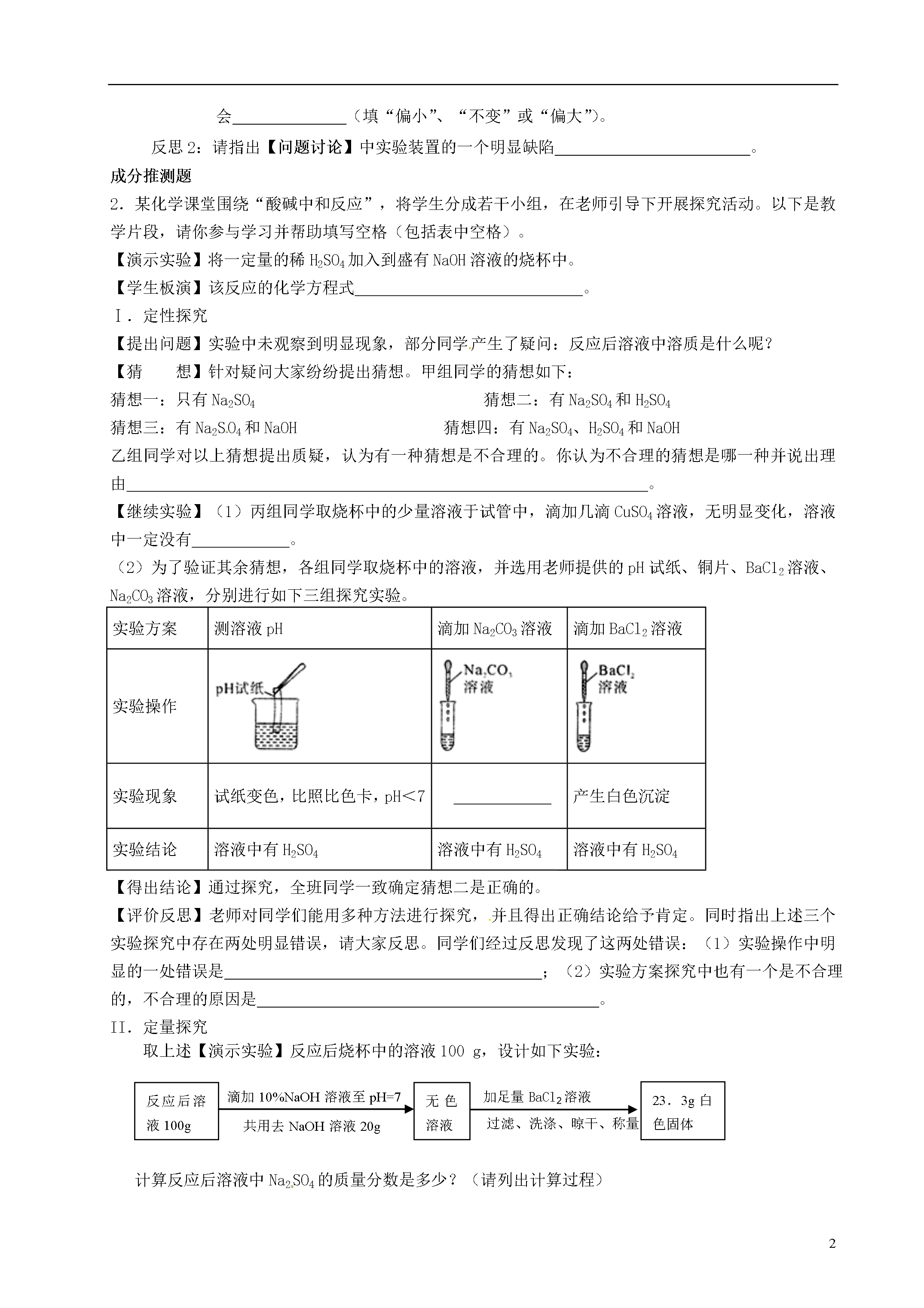 6江苏省无锡市滨湖区中学2013年中考化学专题复习综合题训练(一)新人教版装置流程题1.工业铁红的主要成分是Fe2O3,还含有少量的FeO、Fe3O4。为了测定铁红中铁的质量分数,兴趣小组的同学进行了如下实验,请你参与过程分析。浓H2SO4Δ【资料1】草酸晶体(H2C2O4·3H2O)在浓H2SO4作用下受热分解,化学方程式为:H2C2O4·3H2OCO2↑+CO↑+4H2O(1)下列可用作草酸分解制取气体的装置是(填字母编号)。abcd【问题讨论】用下图所示装置进行实验:(提示:碱石灰是氢氧化钠和氧化钙的混合物)ABCDEF(2)实验前应先。(3)进入D中的气体是纯净、干燥的CO,则A、C中的试剂依次是(填字母编号)。a.浓硫酸b.澄清的石灰水c.氢氧化钠溶液(4)B装置的作用是。(5)写出D装置中所发生反应的一个化学方程式。【数据分析与计算】【资料2】铁的常见氧化物中铁的质量分数:铁的氧化物FeOFe2O3Fe3O4铁的质量分数77.8%70.0%72.4%(6)称取铁红样品10.0g,用上述装置进行实验,测定铁红中铁的质量分数。①D中充分反应后得到Fe粉的质量为mg,则<m<。②实验前后称得E装置增重6.6g,则此铁红样品中铁的质量分数是。【实验评价】反思1:本实验中如果缺少C装置(不考虑其它因素),则测得样品中铁的质量分数会(填“偏小”、“不变”或“偏大”)。反思2:请指出【问题讨论】中实验装置的一个明显缺陷。成分推测题2.某化学课堂围绕“酸碱中和反应”,将学生分成若干小组,在老师引导下开展探究活动。以下是教学片段,请你参与学习并帮助填写空格(包括表中空格)。【演示实验】将一定量的稀H2SO4加入到盛有NaOH溶液的烧杯中。【学生板演】该反应的化学方程式。Ⅰ.定性探究【提出问题】实验中未观察到明显现象,部分同学产生了疑问:反应后溶液中溶质是什么呢?【猜想】针对疑问大家纷纷提出猜想。甲组同学的猜想如下:猜想一:只有Na2SO4猜想二:有Na2SO4和H2SO4猜想三:有Na2SO4和NaOH猜想四:有Na2SO4、H2SO4和NaOH乙组同学对以上猜想提出质疑,认为有一种猜想是不合理的。你认为不合理的猜想是哪一种并说出理由。【继续实验】(1)丙组同学取烧杯中的少量溶液于试管中,滴加几滴CuSO4溶液,无明显变化,溶液中一定没有。(2)为了验证其余猜想,各组同学取烧杯中的溶液,并选用老师提供的pH试纸、铜片、BaC12溶液、Na2CO3溶液,分别进行如下三组探究实验。实验方案测溶液pH滴加Na2CO3溶液滴加BaCl2溶液实验操作实验现象试纸变色,比照比色卡,pH<7产生白色沉淀实验结论溶液中有H2SO4溶液中有H2SO4溶液中有H2SO4【得出结论】通过探究,全班同学一致确定猜想二是正确的。【评价反思】老师对同学们能用多种方法进行探究,并且得出正确结论给予肯定。同时指出上述三个实验探究中存在两处明显错误,请大家反思。同学们经过反思发现了这两处错误:(1)实验操作中明显的一处错误是;(2)实验方案探究中也有一个是不合理的,不合理的原因是。II.定量探究取上述【演示实验】反应后烧杯中的溶液100g,设计如下实验:过滤、洗涤、晾干、称量反应后溶液100g滴加10%NaOH溶液至pH=7共用去NaOH溶液20g无色溶液加足量BaCl2溶液23.3g白色固体计算反应后溶液中Na2SO4的质量分数是多少?(请列出计算过程)信息给予题3.某学习小组的同学在学习了Na2CO3、NaHCO3的性质后,了解到它们都能与盐酸反应产生CO2气体,那么如何鉴别Na2CO3和NaHCO3呢?带着这样的疑问,他们进行了下列探究:【查阅资料】⑴Ca(HCO3)2可溶于水;⑵NaHCO3固体受热分解生成碳酸钠、二氧化碳和水。【猜想】⑴甲同学认为可用澄清石灰水鉴别Na2CO3和NaHCO3溶液。⑵乙同学认为可用CaCl2溶液鉴别Na2CO3和NaHCO3溶液。甲、乙两同学的猜想是依据澄清石灰水、CaCl2溶液分别与Na2CO3溶液反应均有沉淀产生;又知道Ca(HCO3)2可溶于水,因此猜测澄清石灰水、CaCl2溶液分别与NaHCO3溶液混合不会产生沉淀,从而鉴别出两种溶液。⑶丙同学认为固体Na2CO3、NaHCO3可用加热的方法鉴别。【实验探究】⑴甲同学在两支分别盛有少量Na2CO3、NaHCO3溶液的试管中,各加入澄清石灰水,观察到两支试管中的现象相同,均产生了白色沉淀,实验结果与猜想不一致,即不能用澄清石灰水鉴别Na2CO3和NaHCO3溶液。⑵乙同学将CaCl2溶液加入到分别盛有少量Na2CO3、NaHCO3溶液的试管中,发现两支试管中也都产生了白色沉淀,实验结果出乎意料,但根据观察到的其他实验现象,他认为仍可用CaCl2溶液鉴别Na2CO3和NaH