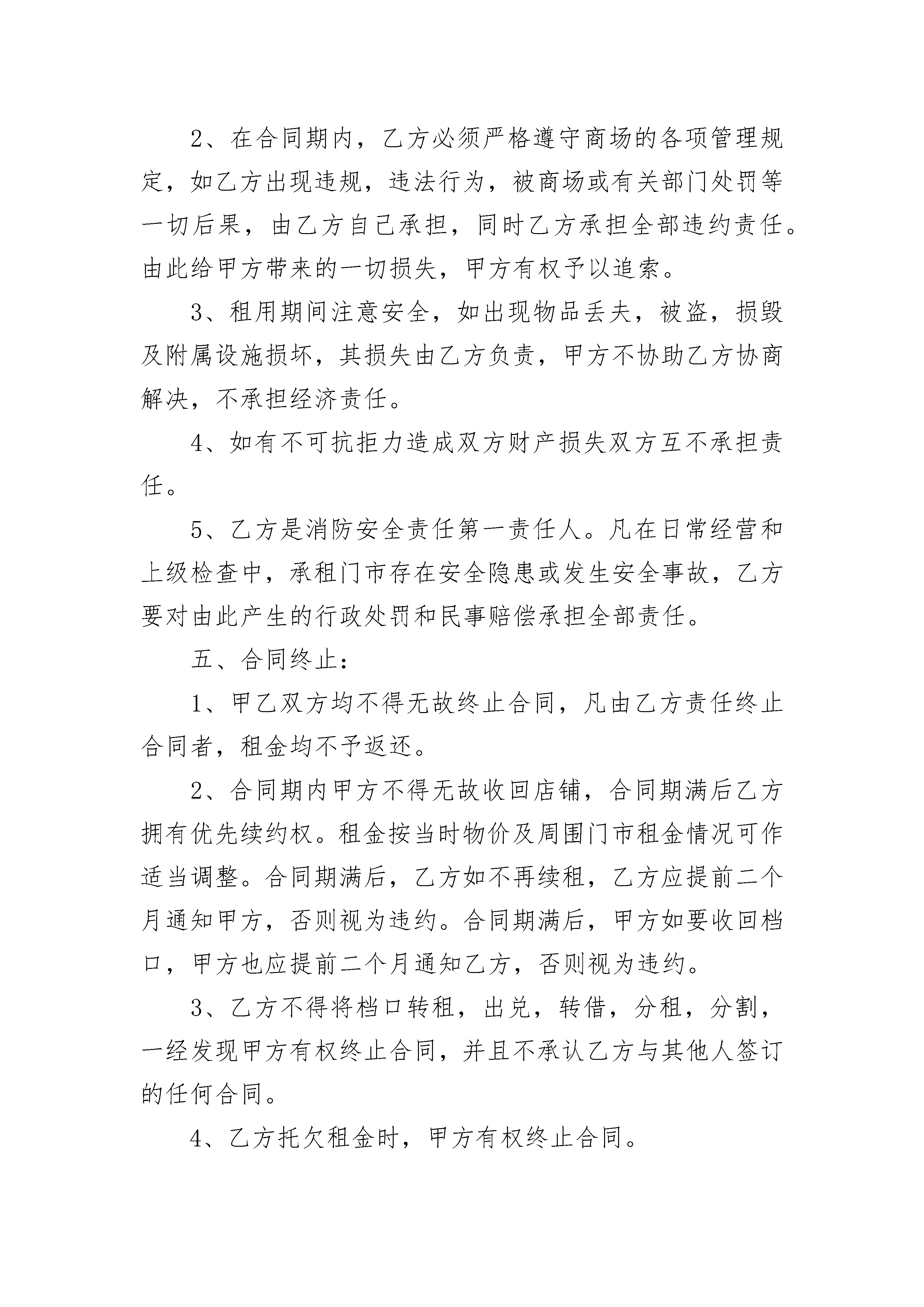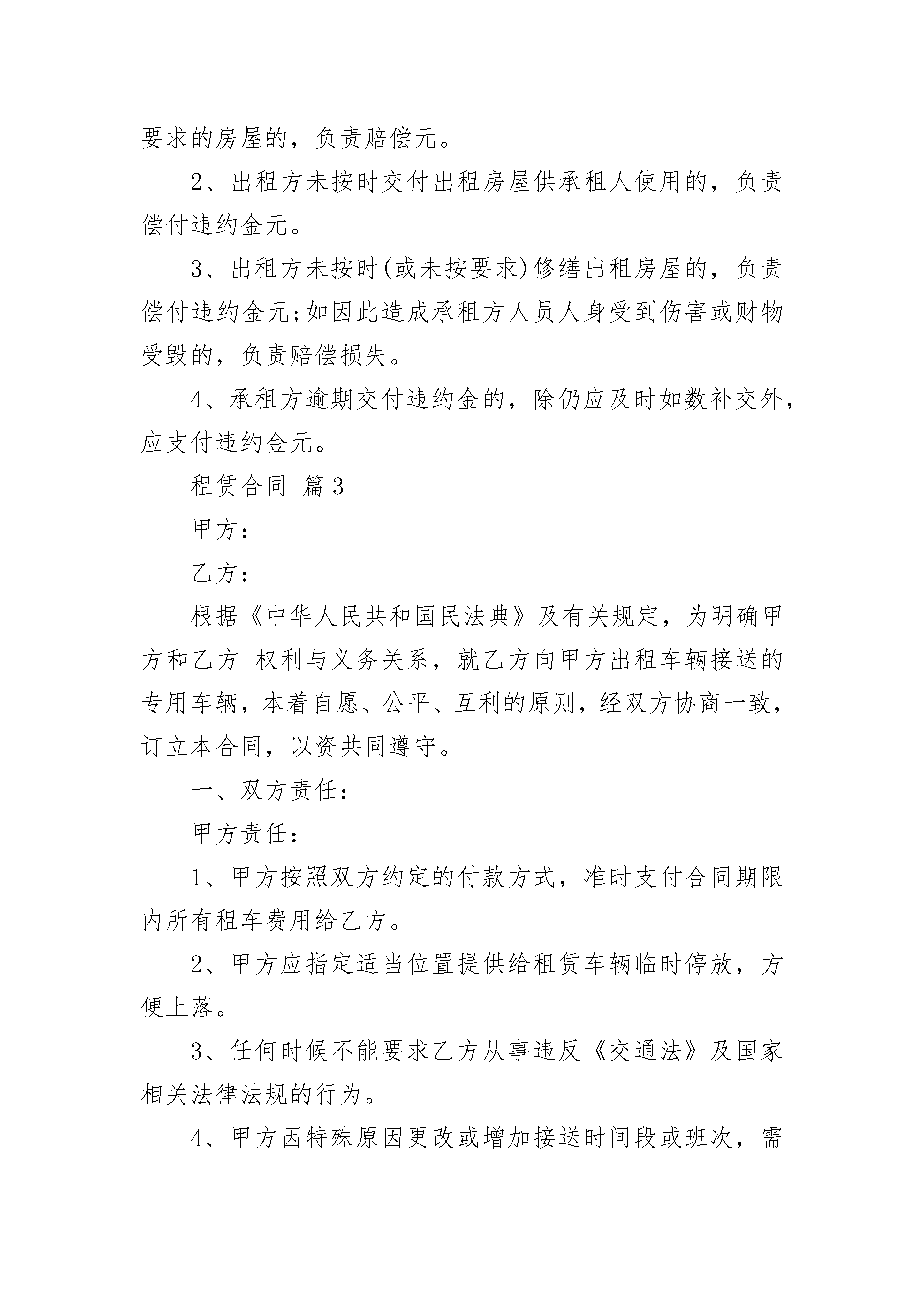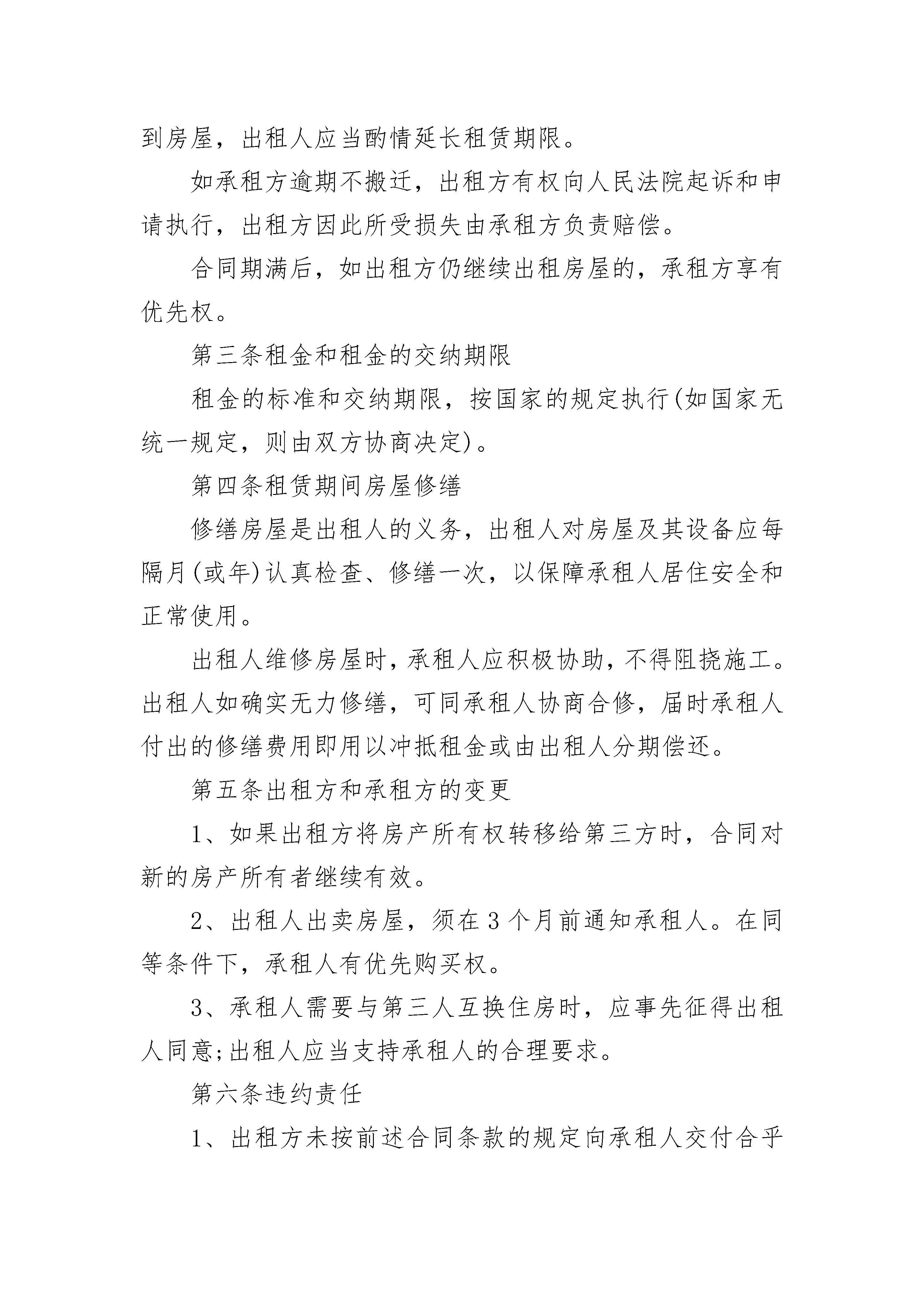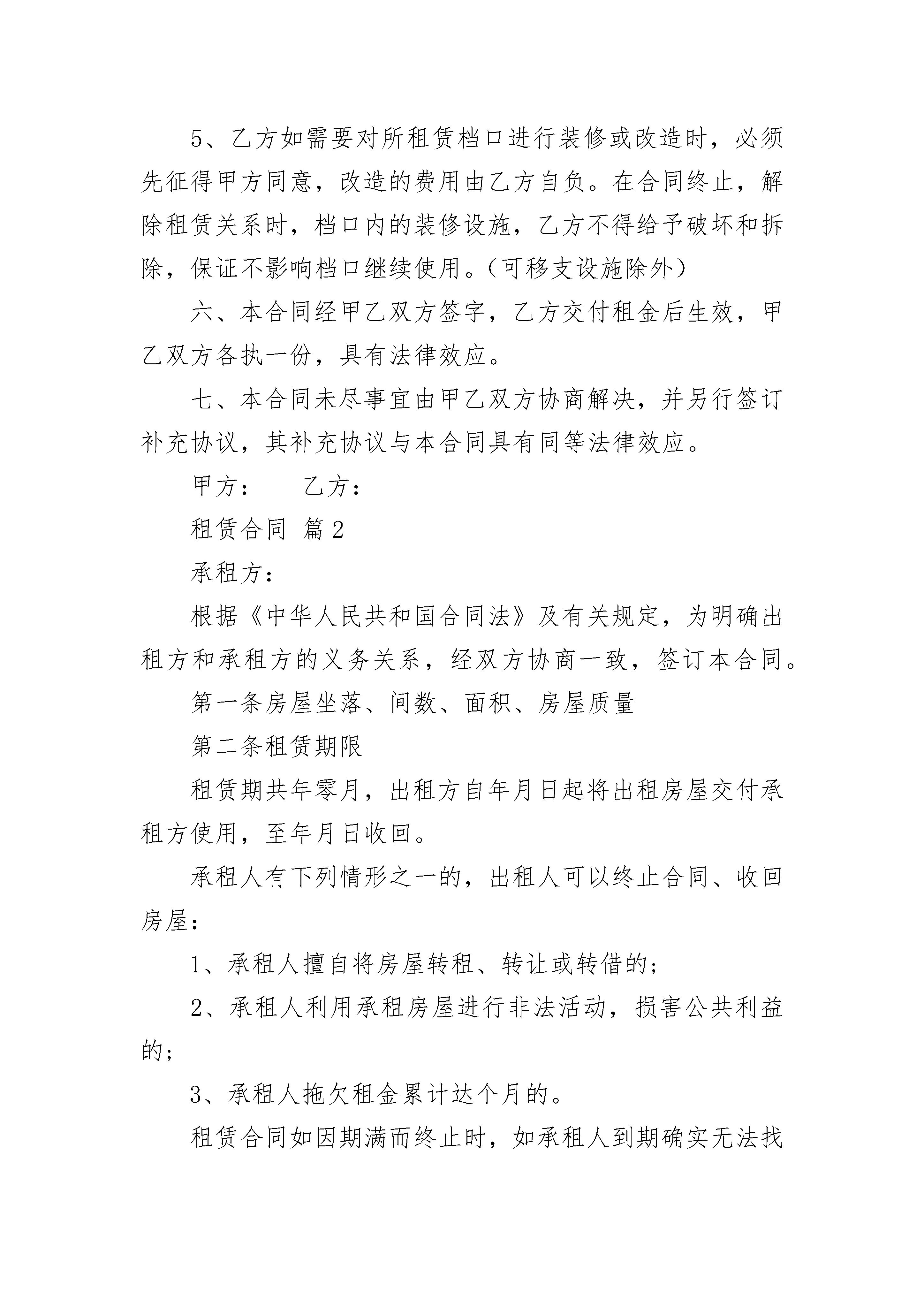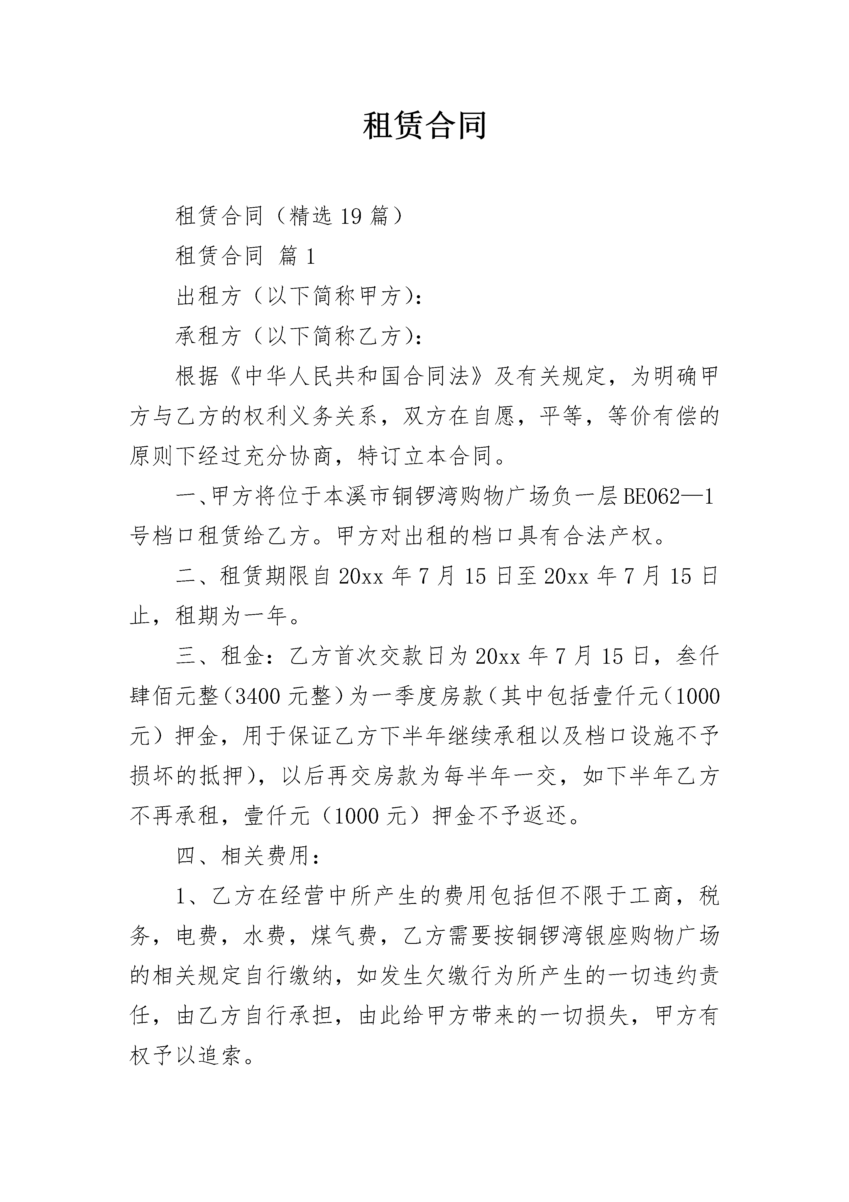 租赁合同租赁合同(精选19篇)租赁合同篇1出租方(以下简称甲方):承租方(以下简称乙方):根据《中华人民共和国合同法》及有关规定,为明确甲方与乙方的权利义务关系,双方在自愿,平等,等价有偿的原则下经过充分协商,特订立本合同。一、甲方将位于本溪市铜锣湾购物广场负一层BE062—1号档口租赁给乙方。甲方对出租的档口具有合法产权。二、租赁期限自20xx年7月15日至20xx年7月15日止,租期为一年。三、租金:乙方首次交款日为20xx年7月15日,叁仟肆佰元整(3400元整)为一季度房款(其中包括壹仟元(1000元)押金,用于保证乙方下半年继续承租以及档口设施不予损坏的抵押),以后再交房款为每半年一交,如下半年乙方不再承租,壹仟元(1000元)押金不予返还。四、相关费用:1、乙方在经营中所产生的费用包括但不限于工商,税务,电费,水费,煤气费,乙方需要按铜锣湾银座购物广场的相关规定自行缴纳,如发生欠缴行为所产生的一切违约责任,由乙方自行承担,由此给甲方带来的一切损失,甲方有权予以追索。2、在合同期内,乙方必须严格遵守商场的各项管理规定,如乙方出现违规,违法行为,被商场或有关部门处罚等一切后果,由乙方自己承担,同时乙方承担全部违约责任。由此给甲方带来的一切损失,甲方有权予以追索。3、租用期间注意安全,如出现物品丢夫,被盗,损毁及附属设施损坏,其损失由乙方负责,甲方不协助乙方协商解决,不承担经济责任。4、如有不可抗拒力造成双方财产损失双方互不承担责任。5、乙方是消防安全责任第一责任人。凡在日常经营和上级检查中,承租门市存在安全隐患或发生安全事故,乙方要对由此产生的行政处罚和民事赔偿承担全部责任。五、合同终止:1、甲乙双方均不得无故终止合同,凡由乙方责任终止合同者,租金均不予返还。2、合同期内甲方不得无故收回店铺,合同期满后乙方拥有优先续约权。租金按当时物价及周围门市租金情况可作适当调整。合同期满后,乙方如不再续租,乙方应提前二个月通知甲方,否则视为违约。合同期满后,甲方如要收回档口,甲方也应提前二个月通知乙方,否则视为违约。3、乙方不得将档口转租,出兑,转借,分租,分割,一经发现甲方有权终止合同,并且不承认乙方与其他人签订的任何合同。4、乙方托欠租金时,甲方有权终止合同。5、乙方如需要对所租赁档口进行装修或改造时,必须先征得甲方同意,改造的费用由乙方自负。在合同终止,解除租赁关系时,档口内的装修设施,乙方不得给予破坏和拆除,保证不影响档口继续使用。(可移支设施除外)六、本合同经甲乙双方签字,乙方交付租金后生效,甲乙双方各执一份,具有法律效应。七、本合同未尽事宜由甲乙双方协商解决,并另行签订补充协议,其补充协议与本合同具有同等法律效应。甲方:乙方:租赁合同篇2承租方:根据《中华人民共和国合同法》及有关规定,为明确出租方和承租方的义务关系,经双方协商一致,签订本合同。第一条房屋坐落、间数、面积、房屋质量第二条租赁期限租赁期共年零月,出租方自年月日起将出租房屋交付承租方使用,至年月日收回。承租人有下列情形之一的,出租人可以终止合同、收回房屋:1、承租人擅自将房屋转租、转让或转借的;2、承租人利用承租房屋进行非法活动,损害公共利益的;3、承租人拖欠租金累计达个月的。租赁合同如因期满而终止时,如承租人到期确实无法找到房屋,出租人应当酌情延长租赁期限。如承租方逾期不搬迁,出租方有权向人民法院起诉和申请执行,出租方因此所受损失由承租方负责赔偿。合同期满后,如出租方仍继续出租房屋的,承租方享有优先权。第三条租金和租金的交纳期限租金的标准和交纳期限,按国家的规定执行(如国家无统一规定,则由双方协商决定)。第四条租赁期间房屋修缮修缮房屋是出租人的义务,出租人对房屋及其设备应每隔月(或年)认真检查、修缮一次,以保障承租人居住安全和正常使用。出租人维修房屋时,承租人应积极协助,不得阻挠施工。出租人如确实无力修缮,可同承租人协商合修,届时承租人付出的修缮费用即用以冲抵租金或由出租人分期偿还。第五条出租方和承租方的变更1、如果出租方将房产所有权转移给第三方时,合同对新的房产所有者继续有效。2、出租人出卖房屋,须在3个月前通知承租人。在同等条件下,承租人有优先购买权。3、承租人需要与第三人互换住房时,应事先征得出租人同意;出租人应当支持承租人的合理要求。第六条违约责任1、出租方未按前述合同条款的规定向承租人交付合乎要求的房屋的,负责赔偿元。2、出租方未按时交付出租房屋供承租人使用的,负责偿付违约金元。3、出租方未按时(或未按要求)修缮出租房屋的,负责偿付违约金元;如因此造成承租方人员人身受到伤害或财物受毁的,负责赔偿损失。4、承租方逾期交付违约金的,除仍应及时如数补交外,应支付违约金元。租赁合同篇3甲方:乙方:根据《中华人民共和国民法典》及有关规定,为明确甲方和