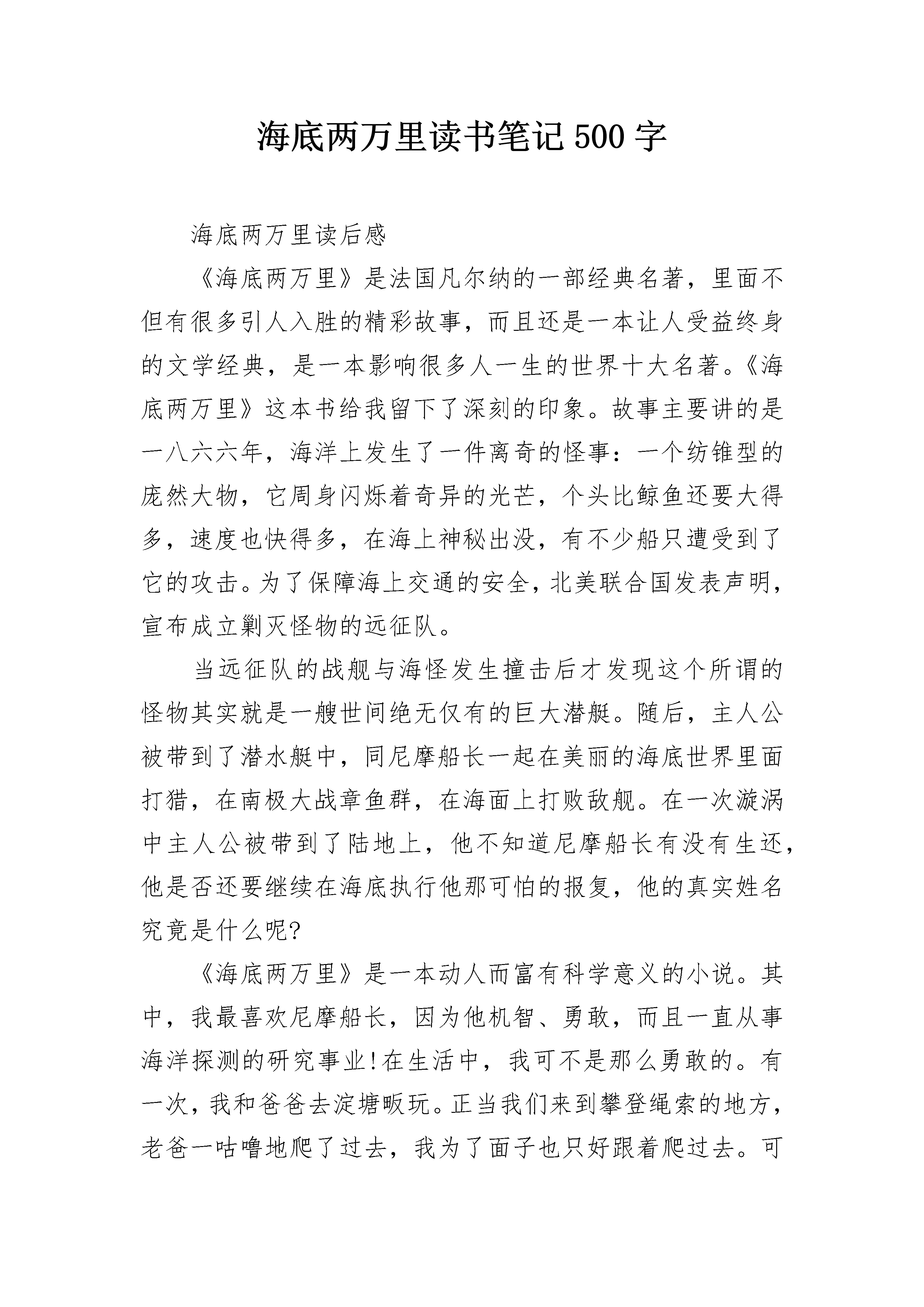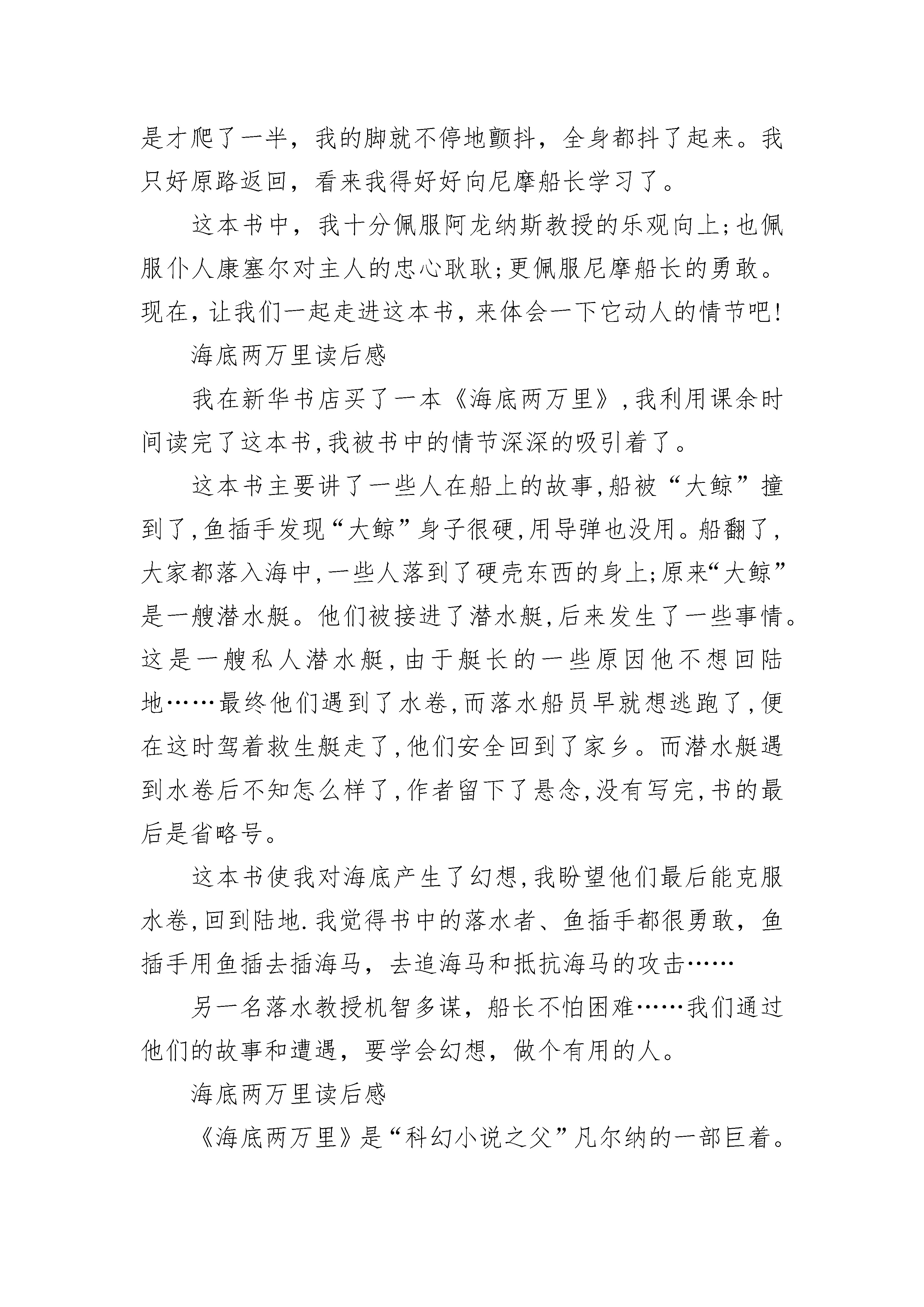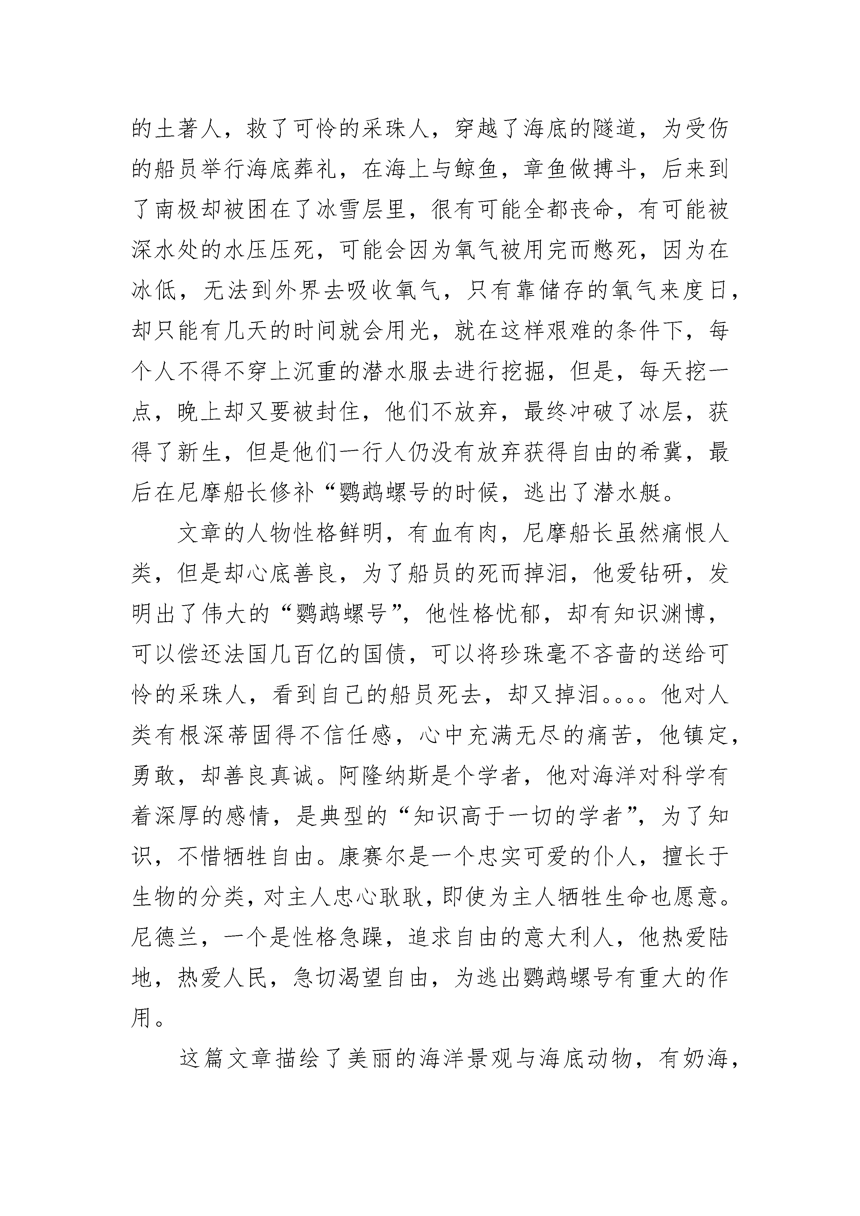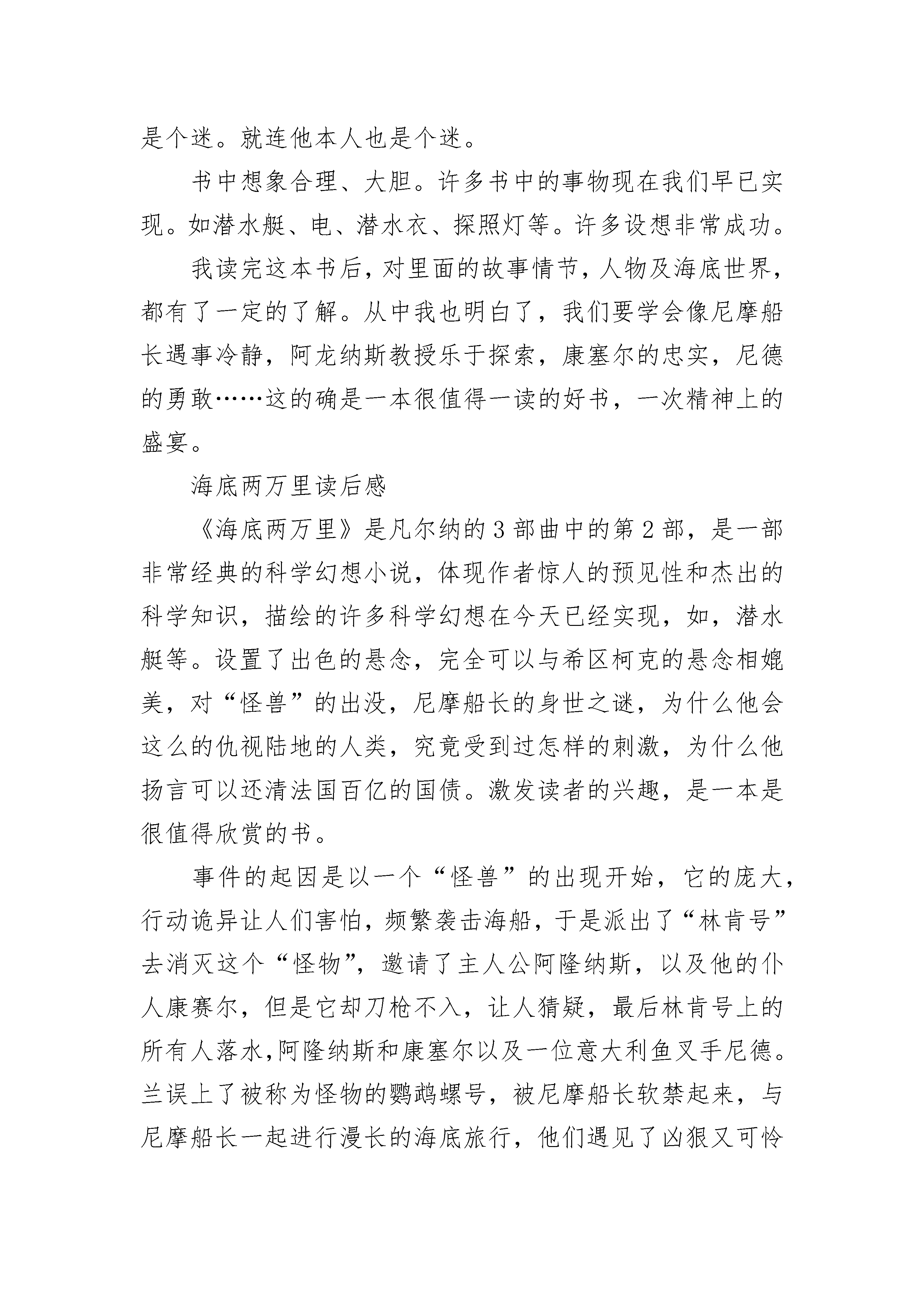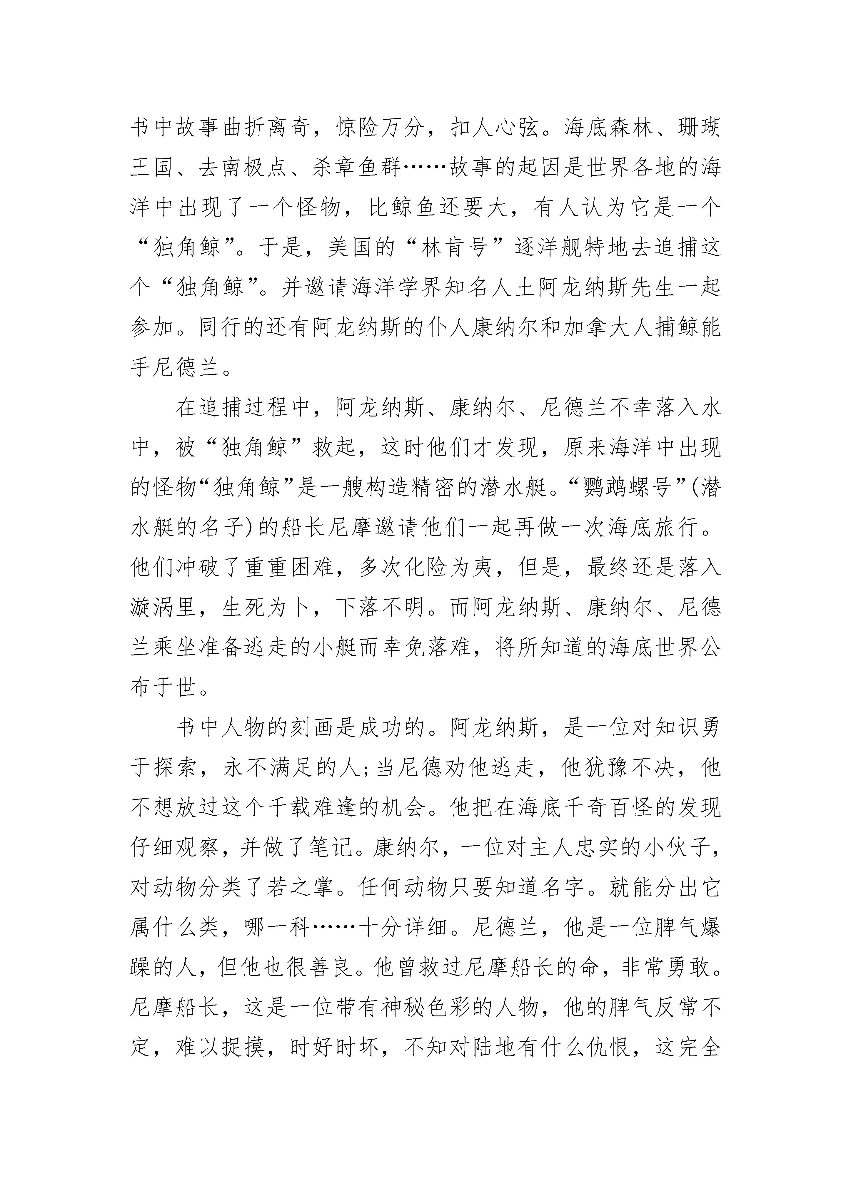 海底两万里读书笔记500字海底两万里读后感《海底两万里》是法国凡尔纳的一部经典名著,里面不但有很多引人入胜的精彩故事,而且还是一本让人受益终身的文学经典,是一本影响很多人一生的世界十大名著。《海底两万里》这本书给我留下了深刻的印象。故事主要讲的是一八六六年,海洋上发生了一件离奇的怪事:一个纺锥型的庞然大物,它周身闪烁着奇异的光芒,个头比鲸鱼还要大得多,速度也快得多,在海上神秘出没,有不少船只遭受到了它的攻击。为了保障海上交通的安全,北美联合国发表声明,宣布成立剿灭怪物的远征队。当远征队的战舰与海怪发生撞击后才发现这个所谓的怪物其实就是一艘世间绝无仅有的巨大潜艇。随后,主人公被带到了潜水艇中,同尼摩船长一起在美丽的海底世界里面打猎,在南极大战章鱼群,在海面上打败敌舰。在一次漩涡中主人公被带到了陆地上,他不知道尼摩船长有没有生还,他是否还要继续在海底执行他那可怕的报复,他的真实姓名究竟是什么呢?《海底两万里》是一本动人而富有科学意义的小说。其中,我最喜欢尼摩船长,因为他机智、勇敢,而且一直从事海洋探测的研究事业!在生活中,我可不是那么勇敢的。有一次,我和爸爸去淀塘畈玩。正当我们来到攀登绳索的地方,老爸一咕噜地爬了过去,我为了面子也只好跟着爬过去。可是才爬了一半,我的脚就不停地颤抖,全身都抖了起来。我只好原路返回,看来我得好好向尼摩船长学习了。这本书中,我十分佩服阿龙纳斯教授的乐观向上;也佩服仆人康塞尔对主人的忠心耿耿;更佩服尼摩船长的勇敢。现在,让我们一起走进这本书,来体会一下它动人的情节吧!海底两万里读后感我在新华书店买了一本《海底两万里》,我利用课余时间读完了这本书,我被书中的情节深深的吸引着了。这本书主要讲了一些人在船上的故事,船被“大鲸”撞到了,鱼插手发现“大鲸”身子很硬,用导弹也没用。船翻了,大家都落入海中,一些人落到了硬壳东西的身上;原来“大鲸”是一艘潜水艇。他们被接进了潜水艇,后来发生了一些事情。这是一艘私人潜水艇,由于艇长的一些原因他不想回陆地……最终他们遇到了水卷,而落水船员早就想逃跑了,便在这时驾着救生艇走了,他们安全回到了家乡。而潜水艇遇到水卷后不知怎么样了,作者留下了悬念,没有写完,书的最后是省略号。这本书使我对海底产生了幻想,我盼望他们最后能克服水卷,回到陆地.我觉得书中的落水者、鱼插手都很勇敢,鱼插手用鱼插去插海马,去追海马和抵抗海马的攻击……另一名落水教授机智多谋,船长不怕困难……我们通过他们的故事和遭遇,要学会幻想,做个有用的人。海底两万里读后感《海底两万里》是“科幻小说之父”凡尔纳的一部巨着。书中故事曲折离奇,惊险万分,扣人心弦。海底森林、珊瑚王国、去南极点、杀章鱼群……故事的起因是世界各地的海洋中出现了一个怪物,比鲸鱼还要大,有人认为它是一个“独角鲸”。于是,美国的“林肯号”逐洋舰特地去追捕这个“独角鲸”。并邀请海洋学界知名人土阿龙纳斯先生一起参加。同行的还有阿龙纳斯的仆人康纳尔和加拿大人捕鲸能手尼德兰。在追捕过程中,阿龙纳斯、康纳尔、尼德兰不幸落入水中,被“独角鲸”救起,这时他们才发现,原来海洋中出现的怪物“独角鲸”是一艘构造精密的潜水艇。“鹦鹉螺号”(潜水艇的名子)的船长尼摩邀请他们一起再做一次海底旅行。他们冲破了重重困难,多次化险为夷,但是,最终还是落入漩涡里,生死为卜,下落不明。而阿龙纳斯、康纳尔、尼德兰乘坐准备逃走的小艇而幸免落难,将所知道的海底世界公布于世。书中人物的刻画是成功的。阿龙纳斯,是一位对知识勇于探索,永不满足的人;当尼德劝他逃走,他犹豫不决,他不想放过这个千载难逢的机会。他把在海底千奇百怪的发现仔细观察,并做了笔记。康纳尔,一位对主人忠实的小伙子,对动物分类了若之掌。任何动物只要知道名字。就能分出它属什么类,哪一科……十分详细。尼德兰,他是一位脾气爆躁的人,但他也很善良。他曾救过尼摩船长的命,非常勇敢。尼摩船长,这是一位带有神秘色彩的人物,他的脾气反常不定,难以捉摸,时好时坏,不知对陆地有什么仇恨,这完全是个迷。就连他本人也是个迷。书中想象合理、大胆。许多书中的事物现在我们早已实现。如潜水艇、电、潜水衣、探照灯等。许多设想非常成功。我读完这本书后,对里面的故事情节,人物及海底世界,都有了一定的了解。从中我也明白了,我们要学会像尼摩船长遇事冷静,阿龙纳斯教授乐于探索,康塞尔的忠实,尼德的勇敢……这的确是一本很值得一读的好书,一次精神上的盛宴。海底两万里读后感《海底两万里》是凡尔纳的3部曲中的第2部,是一部非常经典的科学幻想小说,体现作者惊人的预见性和杰出的科学知识,描绘的许多科学幻想在今天已经实现,如,潜水艇等。设置了出色的悬念,完全可以与希区柯克的悬念相媲美,对“怪兽”的出没,尼摩船长的身世之谜,为什么他会这么的仇视陆地的人类,究竟受到过怎样的刺激,为什么他扬言可以还