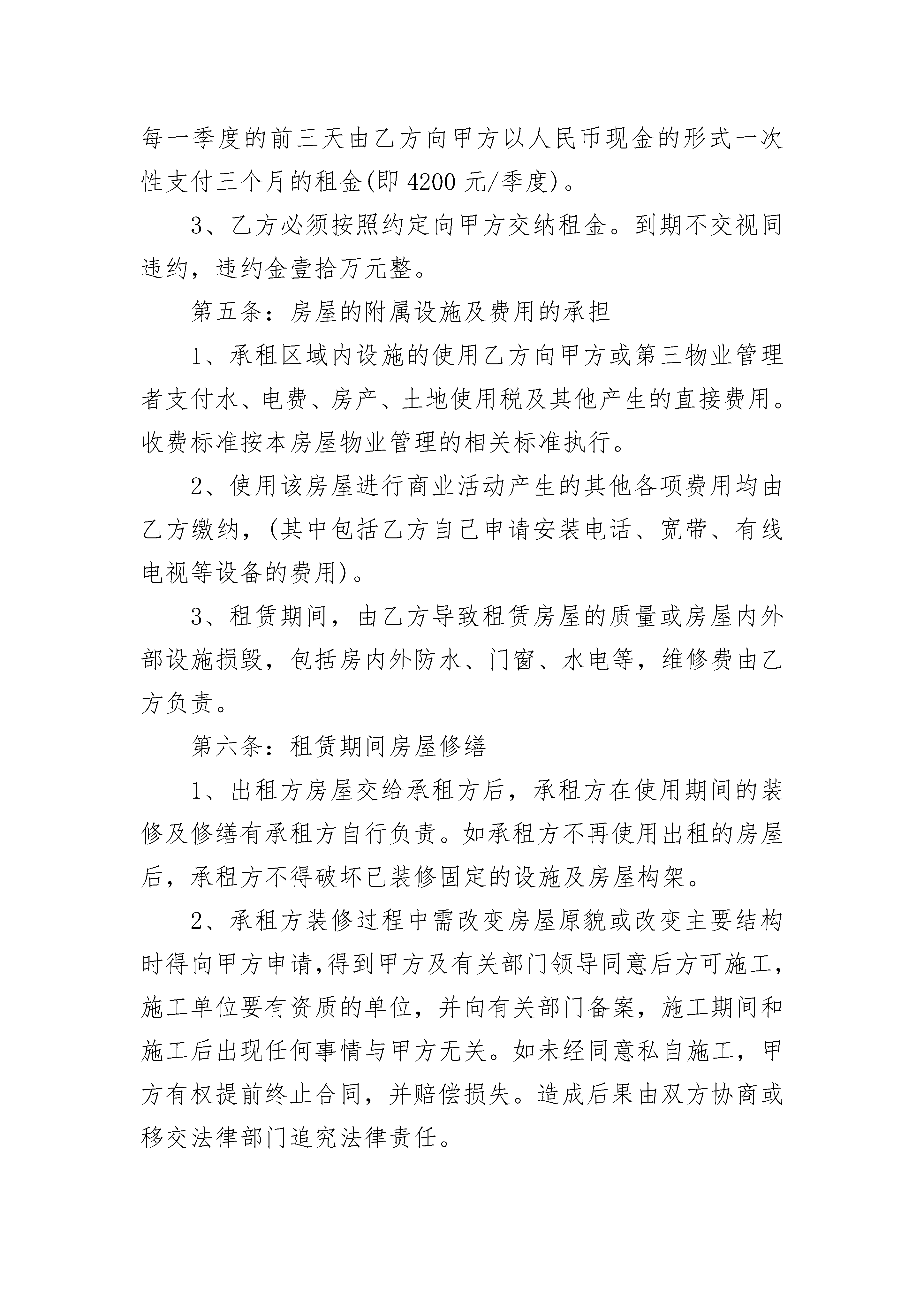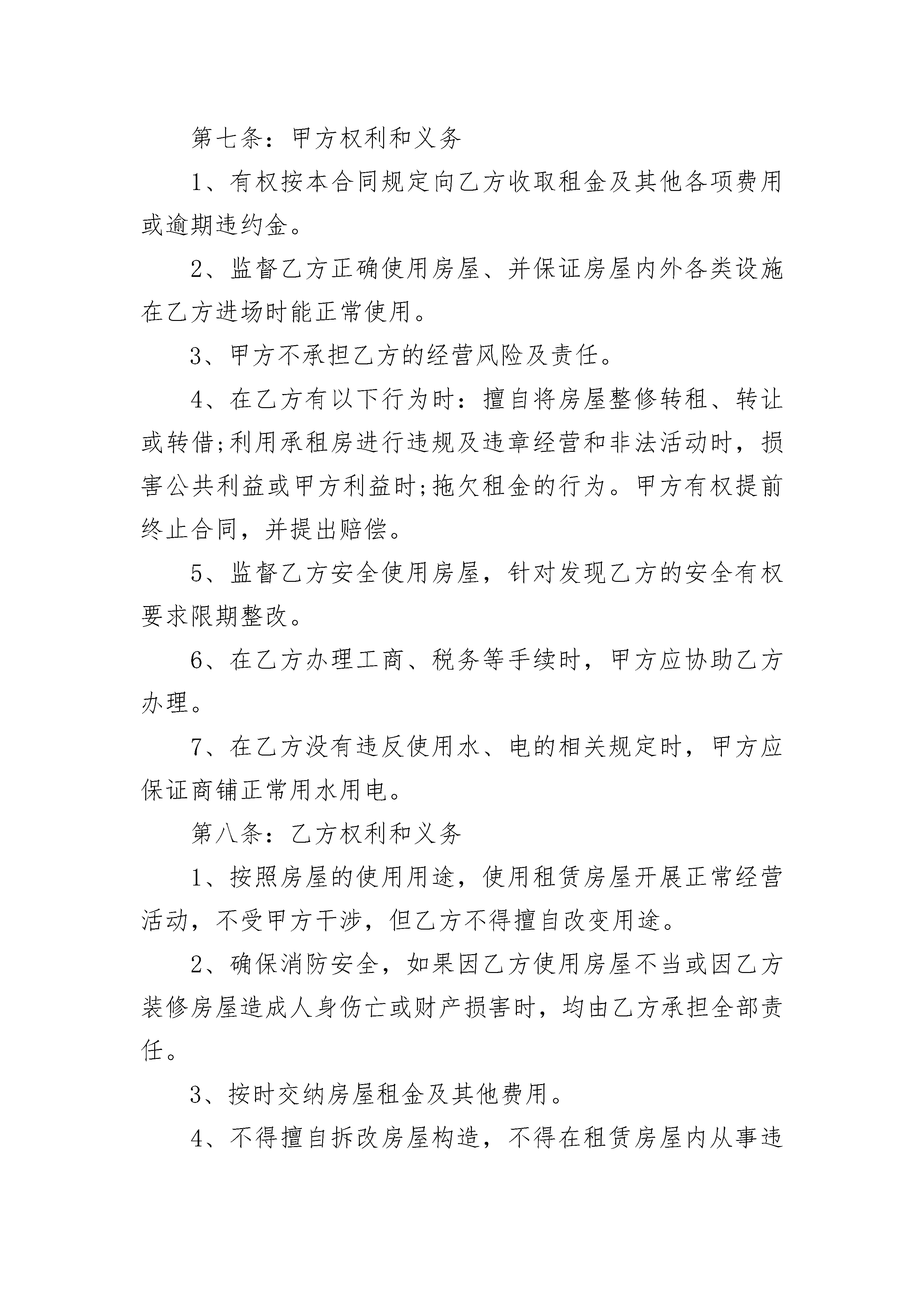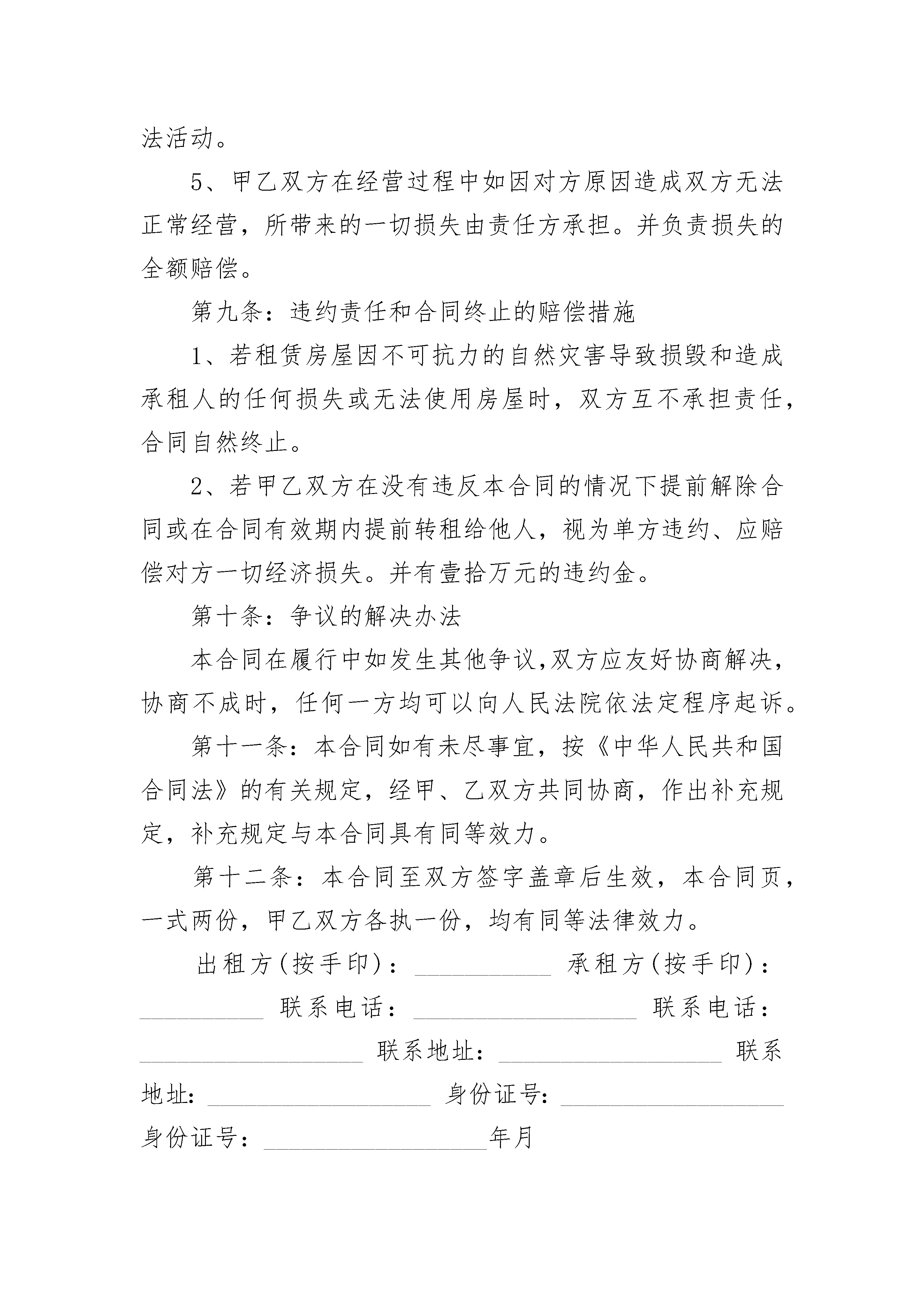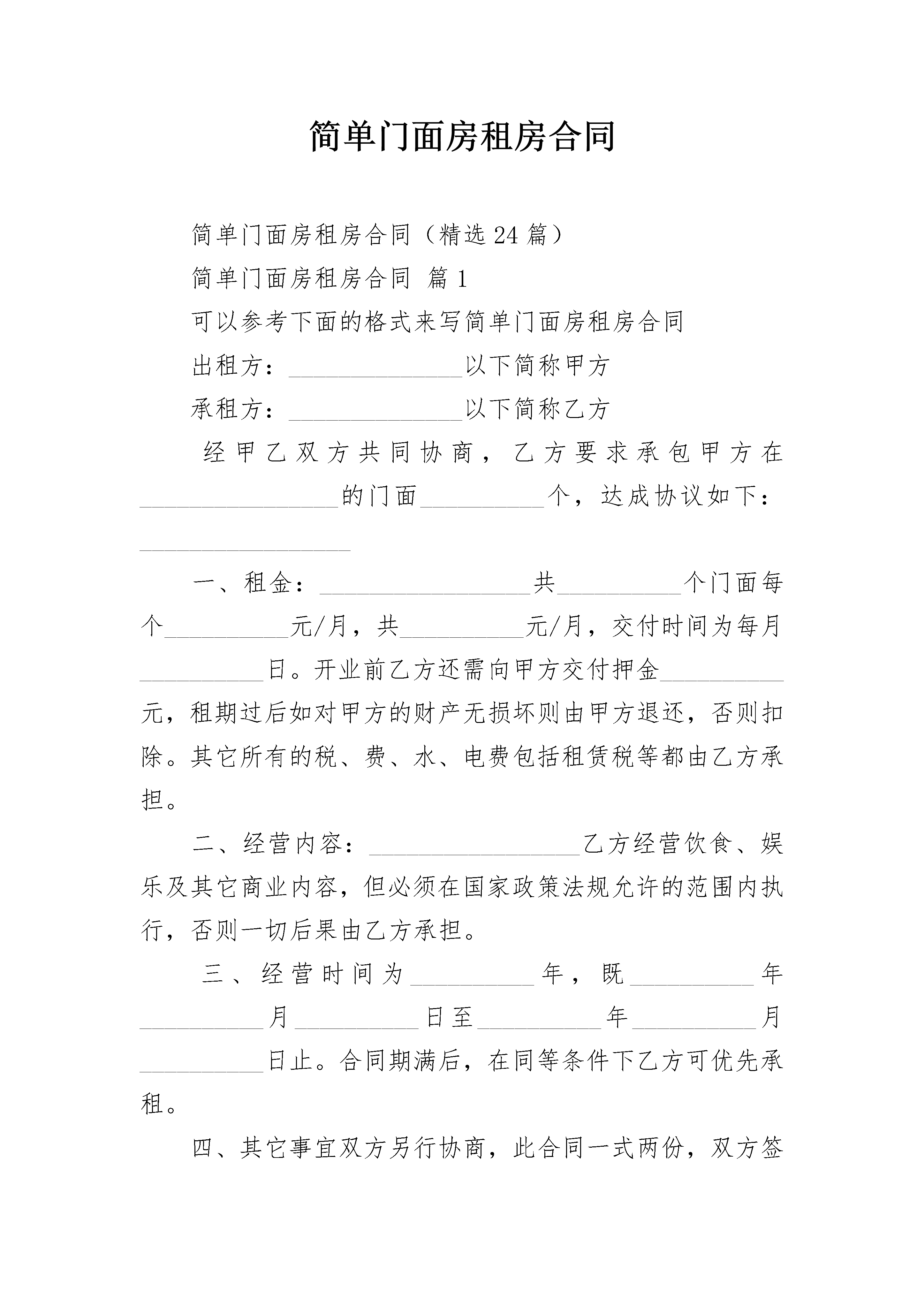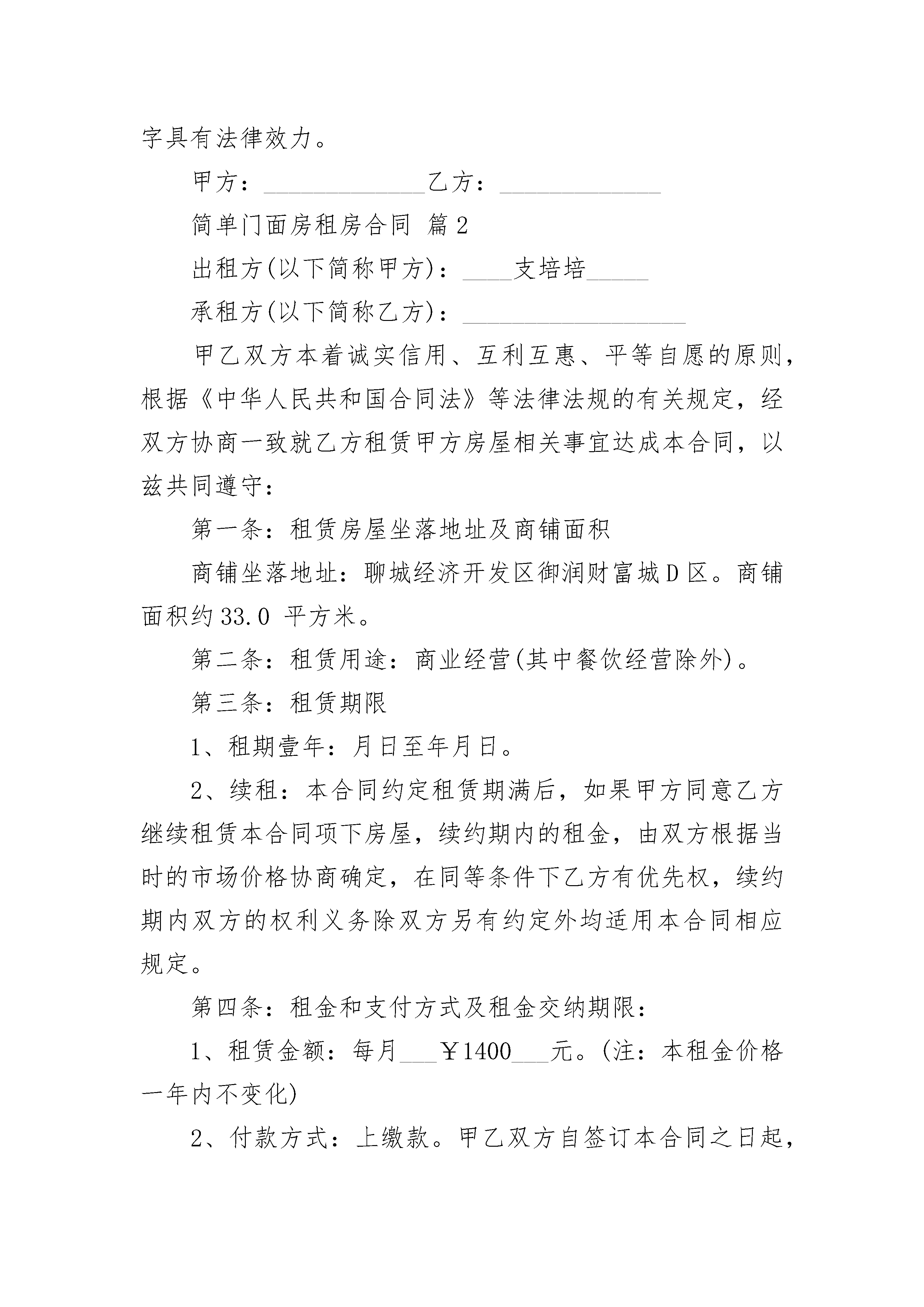 简单门面房租房合同简单门面房租房合同(精选24篇)简单门面房租房合同篇1可以参考下面的格式来写简单门面房租房合同出租方:______________以下简称甲方承租方:______________以下简称乙方经甲乙双方共同协商,乙方要求承包甲方在________________的门面__________个,达成协议如下:_________________一、租金:_________________共__________个门面每个__________元/月,共__________元/月,交付时间为每月__________日。开业前乙方还需向甲方交付押金__________元,租期过后如对甲方的财产无损坏则由甲方退还,否则扣除。其它所有的税、费、水、电费包括租赁税等都由乙方承担。二、经营内容:_________________乙方经营饮食、娱乐及其它商业内容,但必须在国家政策法规允许的范围内执行,否则一切后果由乙方承担。三、经营时间为__________年,既__________年__________月__________日至__________年__________月__________日止。合同期满后,在同等条件下乙方可优先承租。四、其它事宜双方另行协商,此合同一式两份,双方签字具有法律效力。甲方:_____________乙方:_____________简单门面房租房合同篇2出租方(以下简称甲方):____支培培_____承租方(以下简称乙方):__________________甲乙双方本着诚实信用、互利互惠、平等自愿的原则,根据《中华人民共和国合同法》等法律法规的有关规定,经双方协商一致就乙方租赁甲方房屋相关事宜达成本合同,以兹共同遵守:第一条:租赁房屋坐落地址及商铺面积商铺坐落地址:聊城经济开发区御润财富城D区。商铺面积约33.0平方米。第二条:租赁用途:商业经营(其中餐饮经营除外)。第三条:租赁期限1、租期壹年:月日至年月日。2、续租:本合同约定租赁期满后,如果甲方同意乙方继续租赁本合同项下房屋,续约期内的租金,由双方根据当时的市场价格协商确定,在同等条件下乙方有优先权,续约期内双方的权利义务除双方另有约定外均适用本合同相应规定。第四条:租金和支付方式及租金交纳期限:1、租赁金额:每月___¥1400___元。(注:本租金价格一年内不变化)2、付款方式:上缴款。甲乙双方自签订本合同之日起,每一季度的前三天由乙方向甲方以人民币现金的形式一次性支付三个月的租金(即4200元/季度)。3、乙方必须按照约定向甲方交纳租金。到期不交视同违约,违约金壹拾万元整。第五条:房屋的附属设施及费用的承担1、承租区域内设施的使用乙方向甲方或第三物业管理者支付水、电费、房产、土地使用税及其他产生的直接费用。收费标准按本房屋物业管理的相关标准执行。2、使用该房屋进行商业活动产生的其他各项费用均由乙方缴纳,(其中包括乙方自己申请安装电话、宽带、有线电视等设备的费用)。3、租赁期间,由乙方导致租赁房屋的质量或房屋内外部设施损毁,包括房内外防水、门窗、水电等,维修费由乙方负责。第六条:租赁期间房屋修缮1、出租方房屋交给承租方后,承租方在使用期间的装修及修缮有承租方自行负责。如承租方不再使用出租的房屋后,承租方不得破坏已装修固定的设施及房屋构架。2、承租方装修过程中需改变房屋原貌或改变主要结构时得向甲方申请,得到甲方及有关部门领导同意后方可施工,施工单位要有资质的单位,并向有关部门备案,施工期间和施工后出现任何事情与甲方无关。如未经同意私自施工,甲方有权提前终止合同,并赔偿损失。造成后果由双方协商或移交法律部门追究法律责任。第七条:甲方权利和义务1、有权按本合同规定向乙方收取租金及其他各项费用或逾期违约金。2、监督乙方正确使用房屋、并保证房屋内外各类设施在乙方进场时能正常使用。3、甲方不承担乙方的经营风险及责任。4、在乙方有以下行为时:擅自将房屋整修转租、转让或转借;利用承租房进行违规及违章经营和非法活动时,损害公共利益或甲方利益时;拖欠租金的行为。甲方有权提前终止合同,并提出赔偿。5、监督乙方安全使用房屋,针对发现乙方的安全有权要求限期整改。6、在乙方办理工商、税务等手续时,甲方应协助乙方办理。7、在乙方没有违反使用水、电的相关规定时,甲方应保证商铺正常用水用电。第八条:乙方权利和义务1、按照房屋的使用用途,使用租赁房屋开展正常经营活动,不受甲方干涉,但乙方不得擅自改变用途。2、确保消防安全,如果因乙方使用房屋不当或因乙方装修房屋造成人身伤亡或财产损害时,均由乙方承担全部责任。3、按时交纳房屋租金及其他费用。4、不得擅自拆改房屋构造,不得在租赁房屋内从事违法活动。5、甲乙双方在经营过程中如因对方原因造成双方无法正常经营,所带来的一切损失由责任方