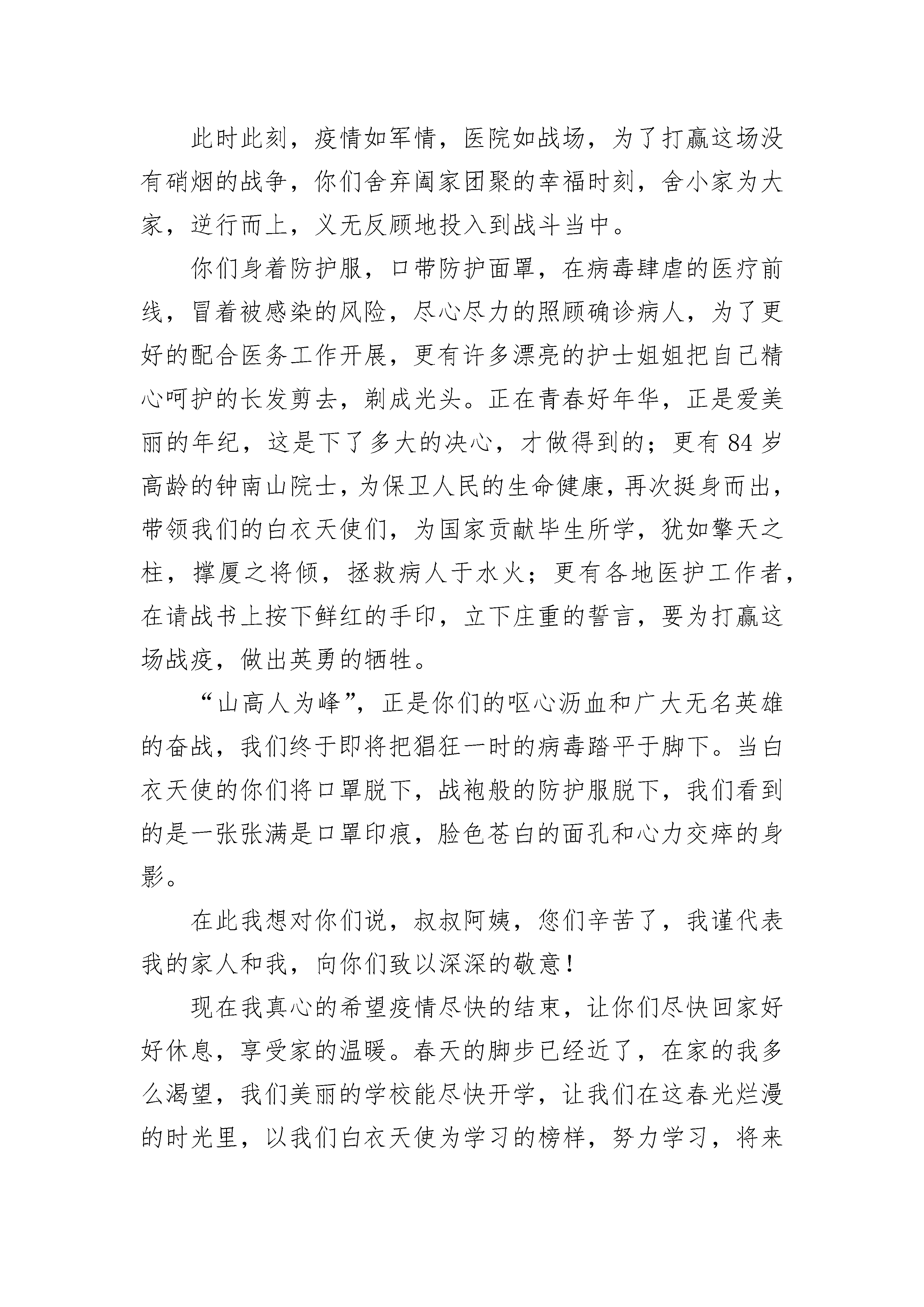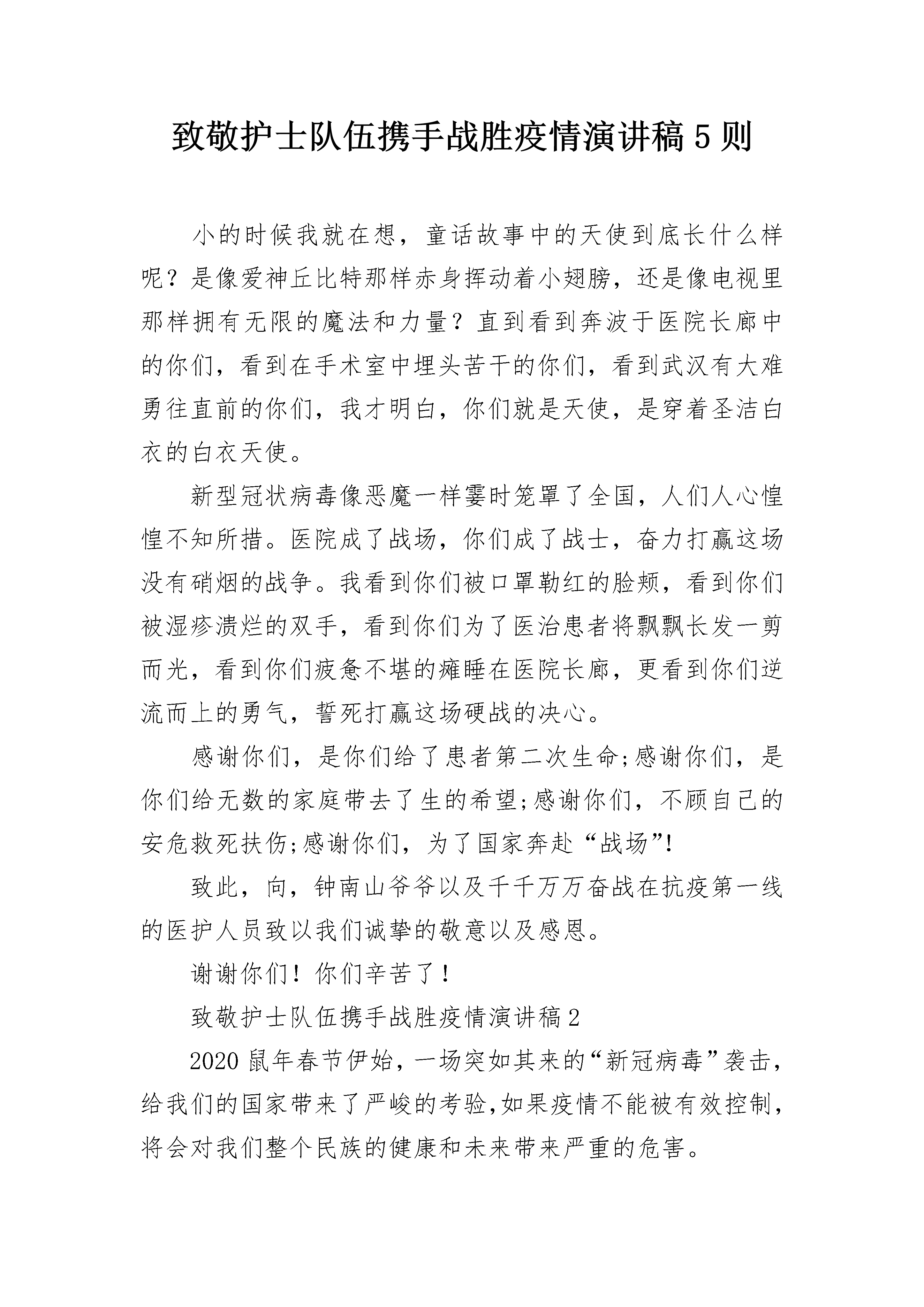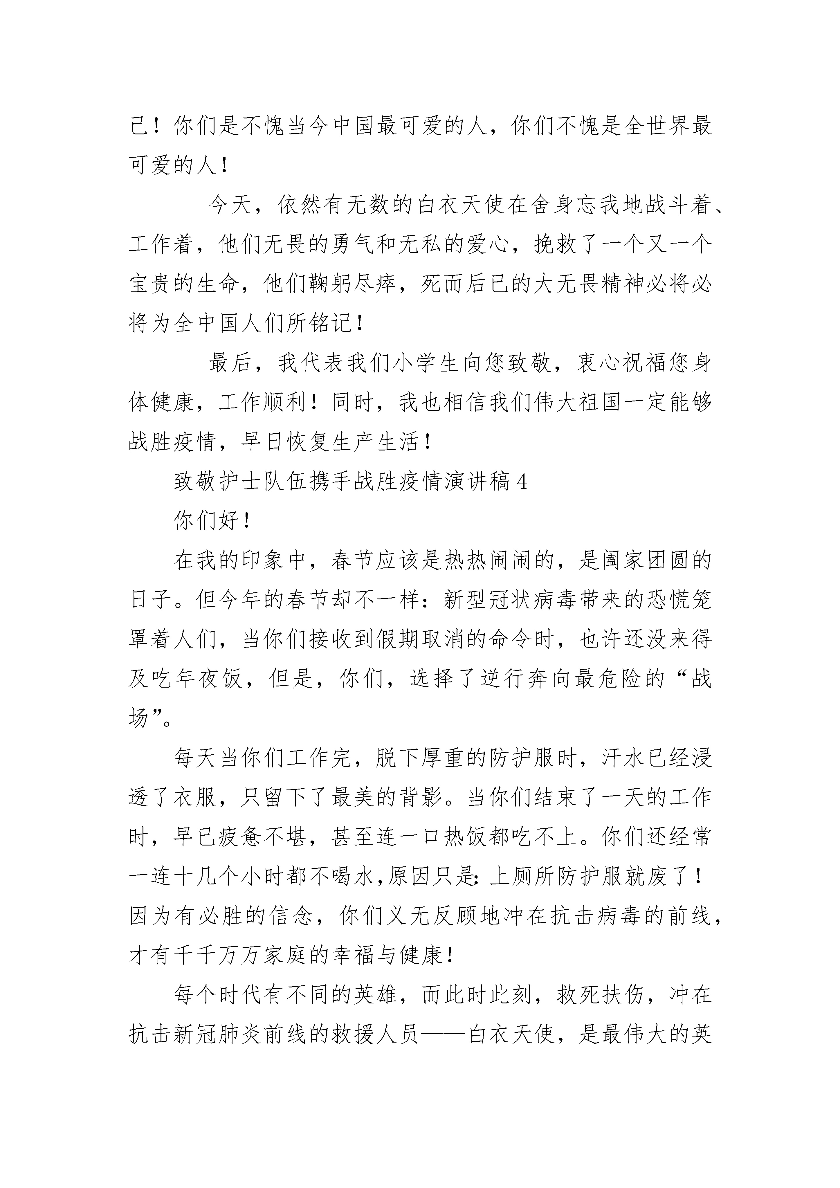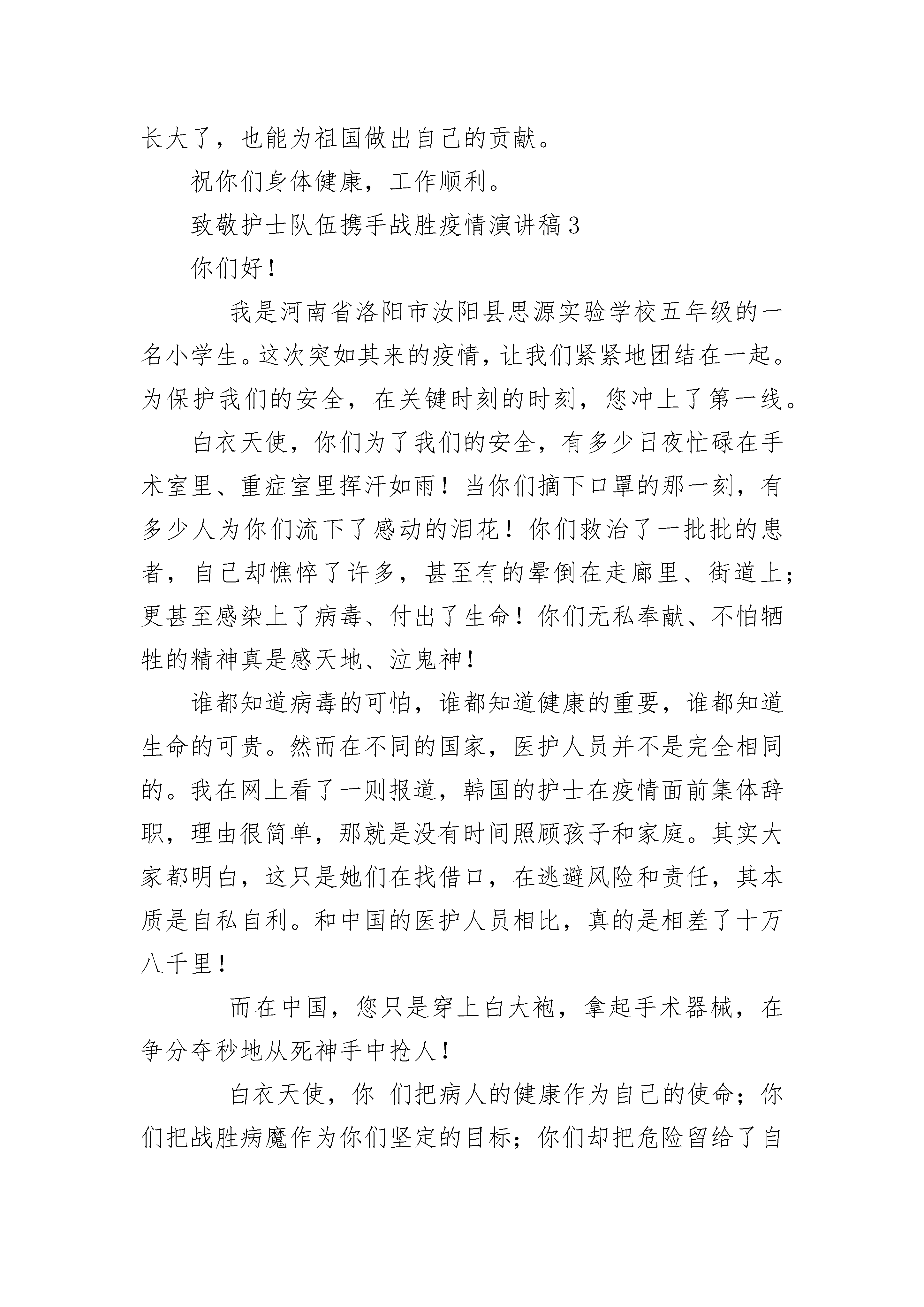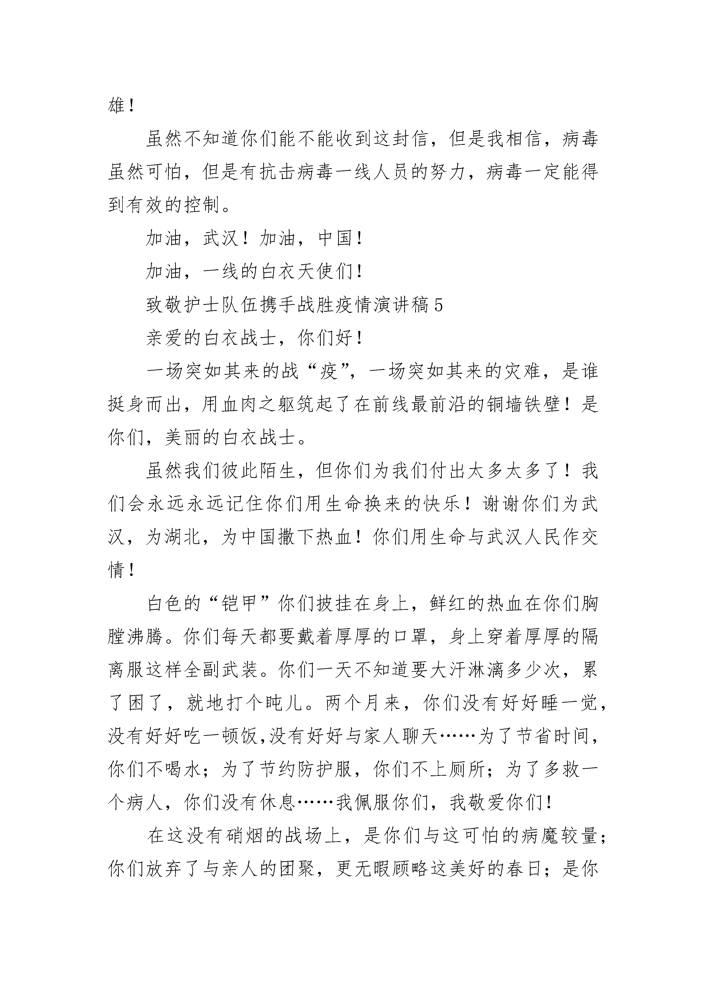 致敬护士队伍携手战胜疫情演讲稿5则小的时候我就在想,童话故事中的天使到底长什么样呢?是像爱神丘比特那样赤身挥动着小翅膀,还是像电视里那样拥有无限的魔法和力量?直到看到奔波于医院长廊中的你们,看到在手术室中埋头苦干的你们,看到武汉有大难勇往直前的你们,我才明白,你们就是天使,是穿着圣洁白衣的白衣天使。新型冠状病毒像恶魔一样霎时笼罩了全国,人们人心惶惶不知所措。医院成了战场,你们成了战士,奋力打赢这场没有硝烟的战争。我看到你们被口罩勒红的脸颊,看到你们被湿疹溃烂的双手,看到你们为了医治患者将飘飘长发一剪而光,看到你们疲惫不堪的瘫睡在医院长廊,更看到你们逆流而上的勇气,誓死打赢这场硬战的决心。感谢你们,是你们给了患者第二次生命;感谢你们,是你们给无数的家庭带去了生的希望;感谢你们,不顾自己的安危救死扶伤;感谢你们,为了国家奔赴“战场”!致此,向,钟南山爷爷以及千千万万奋战在抗疫第一线的医护人员致以我们诚挚的敬意以及感恩。谢谢你们!你们辛苦了!致敬护士队伍携手战胜疫情演讲稿22020鼠年春节伊始,一场突如其来的“新冠病毒”袭击,给我们的国家带来了严峻的考验,如果疫情不能被有效控制,将会对我们整个民族的健康和未来带来严重的危害。此时此刻,疫情如军情,医院如战场,为了打赢这场没有硝烟的战争,你们舍弃阖家团聚的幸福时刻,舍小家为大家,逆行而上,义无反顾地投入到战斗当中。你们身着防护服,口带防护面罩,在病毒肆虐的医疗前线,冒着被感染的风险,尽心尽力的照顾确诊病人,为了更好的配合医务工作开展,更有许多漂亮的护士姐姐把自己精心呵护的长发剪去,剃成光头。正在青春好年华,正是爱美丽的年纪,这是下了多大的决心,才做得到的;更有84岁高龄的钟南山院士,为保卫人民的生命健康,再次挺身而出,带领我们的白衣天使们,为国家贡献毕生所学,犹如擎天之柱,撑厦之将倾,拯救病人于水火;更有各地医护工作者,在请战书上按下鲜红的手印,立下庄重的誓言,要为打赢这场战疫,做出英勇的牺牲。“山高人为峰”,正是你们的呕心沥血和广大无名英雄的奋战,我们终于即将把猖狂一时的病毒踏平于脚下。当白衣天使的你们将口罩脱下,战袍般的防护服脱下,我们看到的是一张张满是口罩印痕,脸色苍白的面孔和心力交瘁的身影。在此我想对你们说,叔叔阿姨,您们辛苦了,我谨代表我的家人和我,向你们致以深深的敬意!现在我真心的希望疫情尽快的结束,让你们尽快回家好好休息,享受家的温暖。春天的脚步已经近了,在家的我多么渴望,我们美丽的学校能尽快开学,让我们在这春光烂漫的时光里,以我们白衣天使为学习的榜样,努力学习,将来长大了,也能为祖国做出自己的贡献。祝你们身体健康,工作顺利。致敬护士队伍携手战胜疫情演讲稿3你们好!我是河南省洛阳市汝阳县思源实验学校五年级的一名小学生。这次突如其来的疫情,让我们紧紧地团结在一起。为保护我们的安全,在关键时刻的时刻,您冲上了第一线。白衣天使,你们为了我们的安全,有多少日夜忙碌在手术室里、重症室里挥汗如雨!当你们摘下口罩的那一刻,有多少人为你们流下了感动的泪花!你们救治了一批批的患者,自己却憔悴了许多,甚至有的晕倒在走廊里、街道上;更甚至感染上了病毒、付出了生命!你们无私奉献、不怕牺牲的精神真是感天地、泣鬼神!谁都知道病毒的可怕,谁都知道健康的重要,谁都知道生命的可贵。然而在不同的国家,医护人员并不是完全相同的。我在网上看了一则报道,韩国的护士在疫情面前集体辞职,理由很简单,那就是没有时间照顾孩子和家庭。其实大家都明白,这只是她们在找借口,在逃避风险和责任,其本质是自私自利。和中国的医护人员相比,真的是相差了十万八千里!而在中国,您只是穿上白大袍,拿起手术器械,在争分夺秒地从死神手中抢人!白衣天使,你们把病人的健康作为自己的使命;你们把战胜病魔作为你们坚定的目标;你们却把危险留给了自己!你们是不愧当今中国最可爱的人,你们不愧是全世界最可爱的人!今天,依然有无数的白衣天使在舍身忘我地战斗着、工作着,他们无畏的勇气和无私的爱心,挽救了一个又一个宝贵的生命,他们鞠躬尽瘁,死而后已的大无畏精神必将必将为全中国人们所铭记!最后,我代表我们小学生向您致敬,衷心祝福您身体健康,工作顺利!同时,我也相信我们伟大祖国一定能够战胜疫情,早日恢复生产生活!致敬护士队伍携手战胜疫情演讲稿4你们好!在我的印象中,春节应该是热热闹闹的,是阖家团圆的日子。但今年的春节却不一样:新型冠状病毒带来的恐慌笼罩着人们,当你们接收到假期取消的命令时,也许还没来得及吃年夜饭,但是,你们,选择了逆行奔向最危险的“战场”。每天当你们工作完,脱下厚重的防护服时,汗水已经浸透了衣服,只留下了最美的背影。当你们结束了一天的工作时,早已疲惫不堪,甚至连一口热饭都吃不上。你们还经常一连十几个小时都不喝水,原因只是:上厕所防护服就废了!