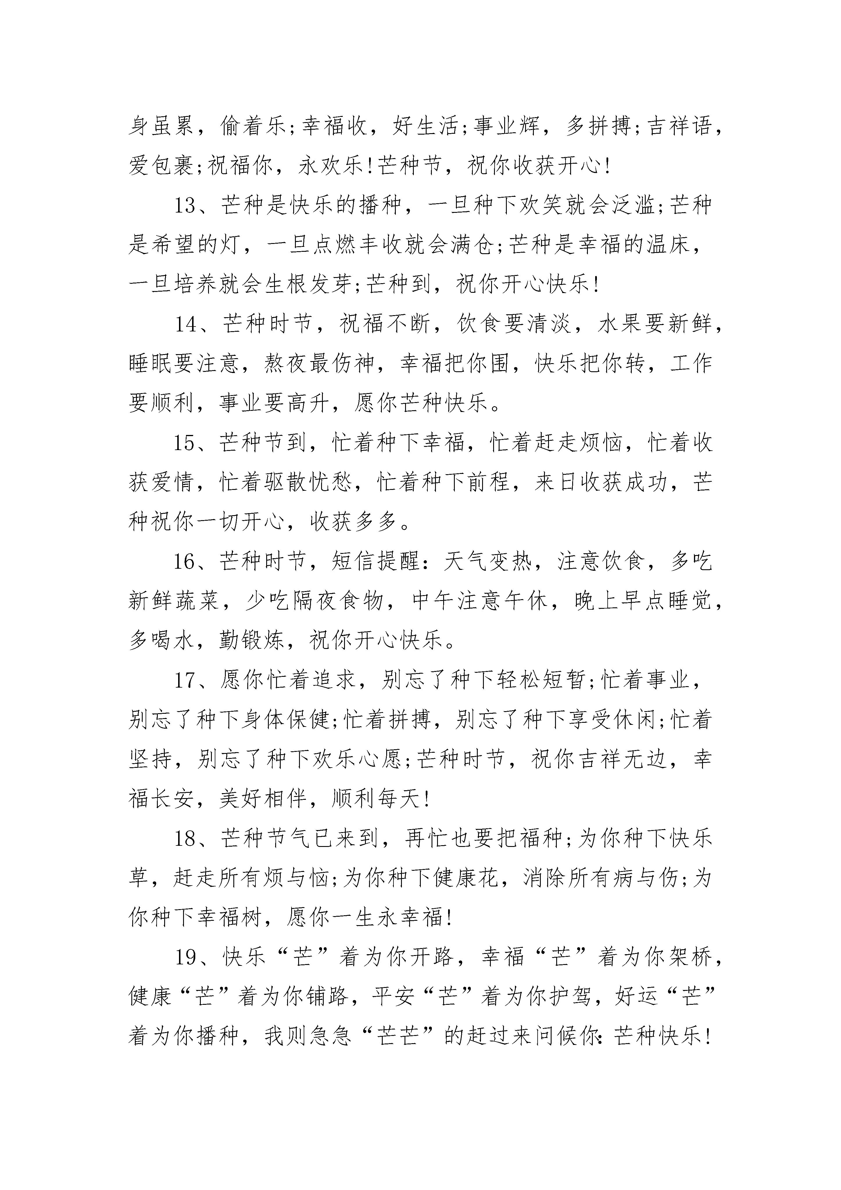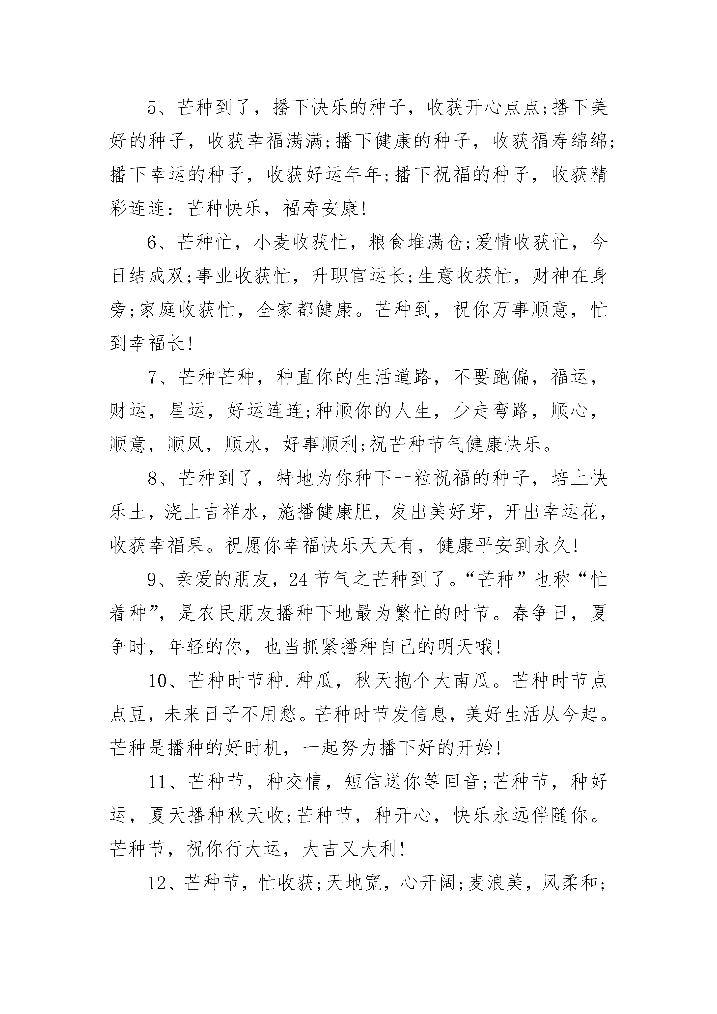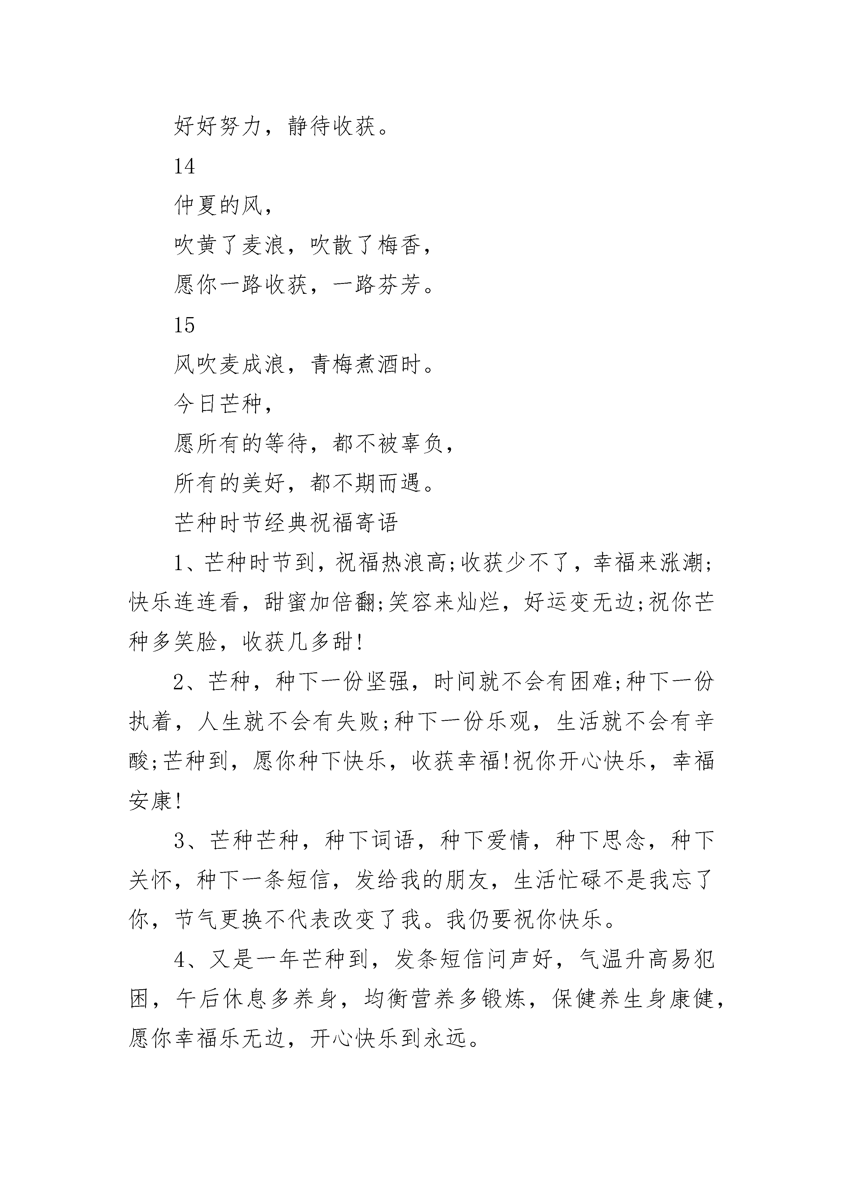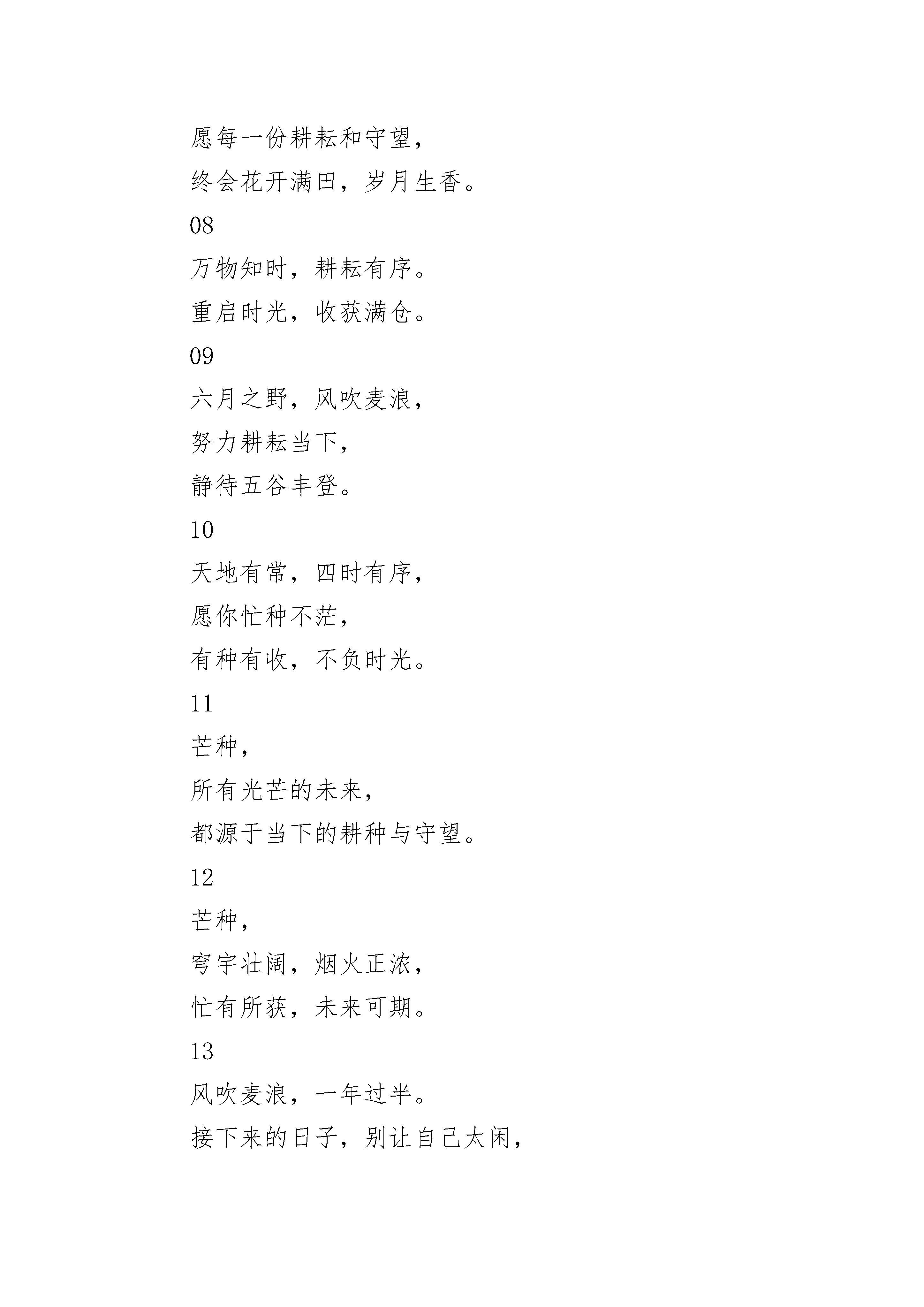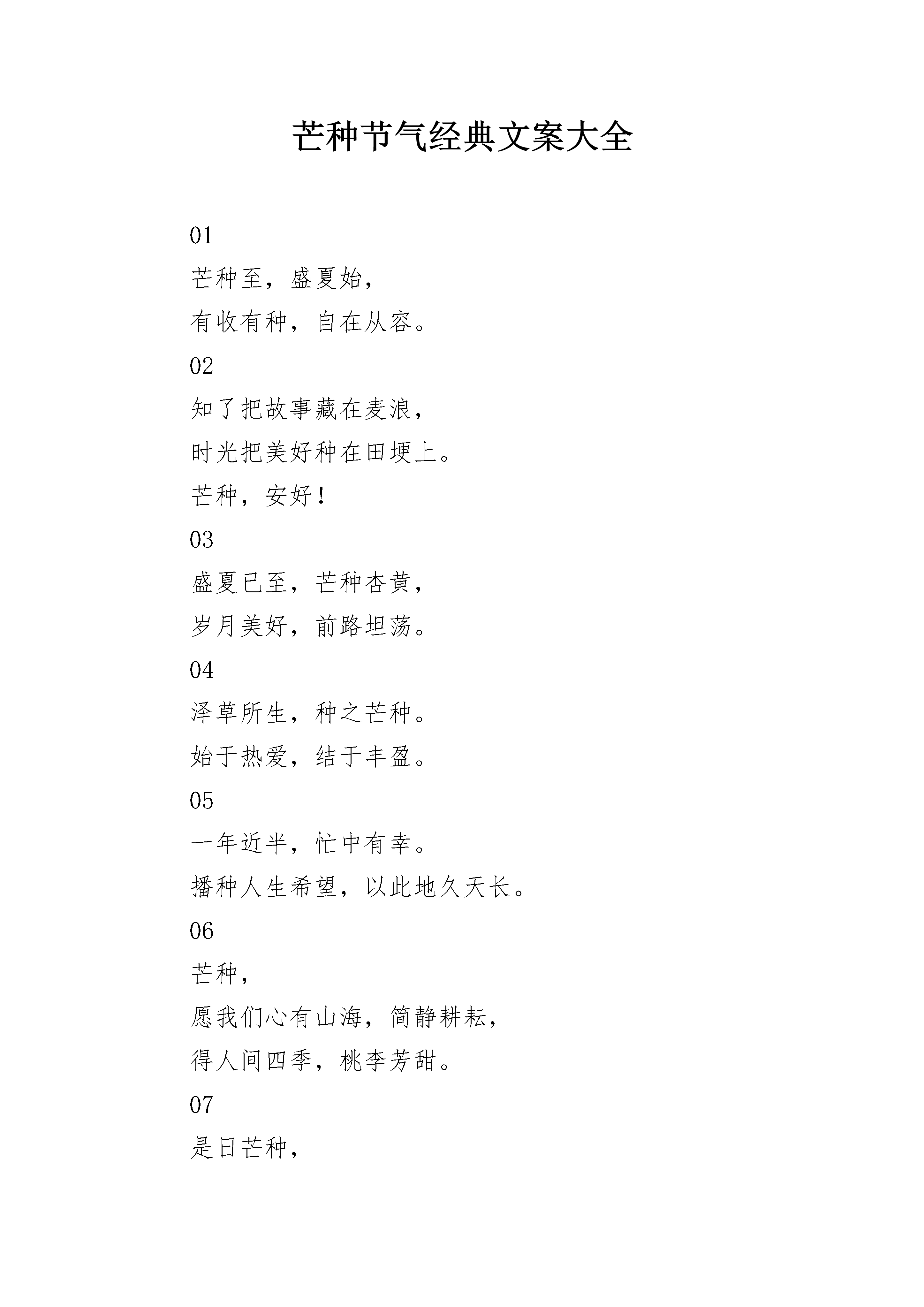芒种节气经典文案大全01芒种至,盛夏始,有收有种,自在从容。02知了把故事藏在麦浪,时光把美好种在田埂上。芒种,安好!03盛夏已至,芒种杏黄,岁月美好,前路坦荡。04泽草所生,种之芒种。始于热爱,结于丰盈。05一年近半,忙中有幸。播种人生希望,以此地久天长。06芒种,愿我们心有山海,简静耕耘,得人间四季,桃李芳甜。07是日芒种,愿每一份耕耘和守望,终会花开满田,岁月生香。08万物知时,耕耘有序。重启时光,收获满仓。09六月之野,风吹麦浪,努力耕耘当下,静待五谷丰登。10天地有常,四时有序,愿你忙种不茫,有种有收,不负时光。11芒种,所有光芒的未来,都源于当下的耕种与守望。12芒种,穹宇壮阔,烟火正浓,忙有所获,未来可期。13风吹麦浪,一年过半。接下来的日子,别让自己太闲,好好努力,静待收获。14仲夏的风,吹黄了麦浪,吹散了梅香,愿你一路收获,一路芬芳。15风吹麦成浪,青梅煮酒时。今日芒种,愿所有的等待,都不被辜负,所有的美好,都不期而遇。芒种时节经典祝福寄语1、芒种时节到,祝福热浪高;收获少不了,幸福来涨潮;快乐连连看,甜蜜加倍翻;笑容来灿烂,好运变无边;祝你芒种多笑脸,收获几多甜!2、芒种,种下一份坚强,时间就不会有困难;种下一份执着,人生就不会有失败;种下一份乐观,生活就不会有辛酸;芒种到,愿你种下快乐,收获幸福!祝你开心快乐,幸福安康!3、芒种芒种,种下词语,种下爱情,种下思念,种下关怀,种下一条短信,发给我的朋友,生活忙碌不是我忘了你,节气更换不代表改变了我。我仍要祝你快乐。4、又是一年芒种到,发条短信问声好,气温升高易犯困,午后休息多养身,均衡营养多锻炼,保健养生身康健,愿你幸福乐无边,开心快乐到永远。5、芒种到了,播下快乐的种子,收获开心点点;播下美好的种子,收获幸福满满;播下健康的种子,收获福寿绵绵;播下幸运的种子,收获好运年年;播下祝福的种子,收获精彩连连:芒种快乐,福寿安康!6、芒种忙,小麦收获忙,粮食堆满仓;爱情收获忙,今日结成双;事业收获忙,升职官运长;生意收获忙,财神在身旁;家庭收获忙,全家都健康。芒种到,祝你万事顺意,忙到幸福长!7、芒种芒种,种直你的生活道路,不要跑偏,福运,财运,星运,好运连连;种顺你的人生,少走弯路,顺心,顺意,顺风,顺水,好事顺利;祝芒种节气健康快乐。8、芒种到了,特地为你种下一粒祝福的种子,培上快乐土,浇上吉祥水,施播健康肥,发出美好芽,开出幸运花,收获幸福果。祝愿你幸福快乐天天有,健康平安到永久!9、亲爱的朋友,24节气之芒种到了。“芒种”也称“忙着种”,是农民朋友播种下地最为繁忙的时节。春争日,夏争时,年轻的你,也当抓紧播种自己的明天哦!10、芒种时节种.种瓜,秋天抱个大南瓜。芒种时节点点豆,未来日子不用愁。芒种时节发信息,美好生活从今起。芒种是播种的好时机,一起努力播下好的开始!11、芒种节,种交情,短信送你等回音;芒种节,种好运,夏天播种秋天收;芒种节,种开心,快乐永远伴随你。芒种节,祝你行大运,大吉又大利!12、芒种节,忙收获;天地宽,心开阔;麦浪美,风柔和;身虽累,偷着乐;幸福收,好生活;事业辉,多拼搏;吉祥语,爱包裹;祝福你,永欢乐!芒种节,祝你收获开心!13、芒种是快乐的播种,一旦种下欢笑就会泛滥;芒种是希望的灯,一旦点燃丰收就会满仓;芒种是幸福的温床,一旦培养就会生根发芽;芒种到,祝你开心快乐!14、芒种时节,祝福不断,饮食要清淡,水果要新鲜,睡眠要注意,熬夜最伤神,幸福把你围,快乐把你转,工作要顺利,事业要高升,愿你芒种快乐。15、芒种节到,忙着种下幸福,忙着赶走烦恼,忙着收获爱情,忙着驱散忧愁,忙着种下前程,来日收获成功,芒种祝你一切开心,收获多多。16、芒种时节,短信提醒:天气变热,注意饮食,多吃新鲜蔬菜,少吃隔夜食物,中午注意午休,晚上早点睡觉,多喝水,勤锻炼,祝你开心快乐。17、愿你忙着追求,别忘了种下轻松短暂;忙着事业,别忘了种下身体保健;忙着拼搏,别忘了种下享受休闲;忙着坚持,别忘了种下欢乐心愿;芒种时节,祝你吉祥无边,幸福长安,美好相伴,顺利每天!18、芒种节气已来到,再忙也要把福种;为你种下快乐草,赶走所有烦与恼;为你种下健康花,消除所有病与伤;为你种下幸福树,愿你一生永幸福!19、快乐“芒”着为你开路,幸福“芒”着为你架桥,健康“芒”着为你铺路,平安“芒”着为你护驾,好运“芒”着为你播种,我则急急“芒芒”的赶过来问候你:芒种快乐!20、芒种到了分外忙,初夏时节气温扬,工作再忙注健康,午后小憩是妙方,五谷金黄眼前望,硕果累累收满仓。祝芒种时节快乐徜徉、幸福满屋。21、六月的祝福赠给勤劳的你,芒种的喜悦送给丰收的你,收获的欣慰寄给快乐的你,好运的短信发给幸福的你。芒种节气,收获祝福,祝忙中有乐,天天开心!22、芒种节气到,忙中偷里笑,忙外