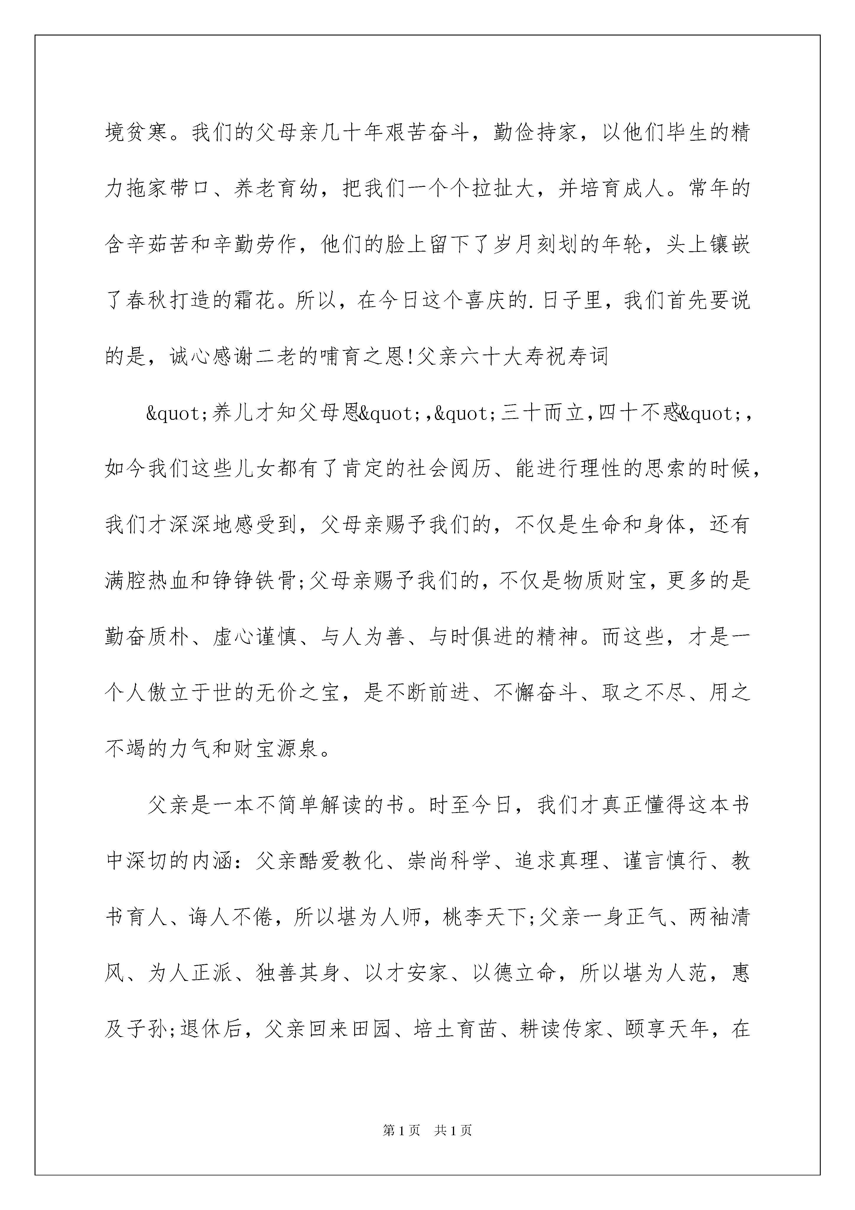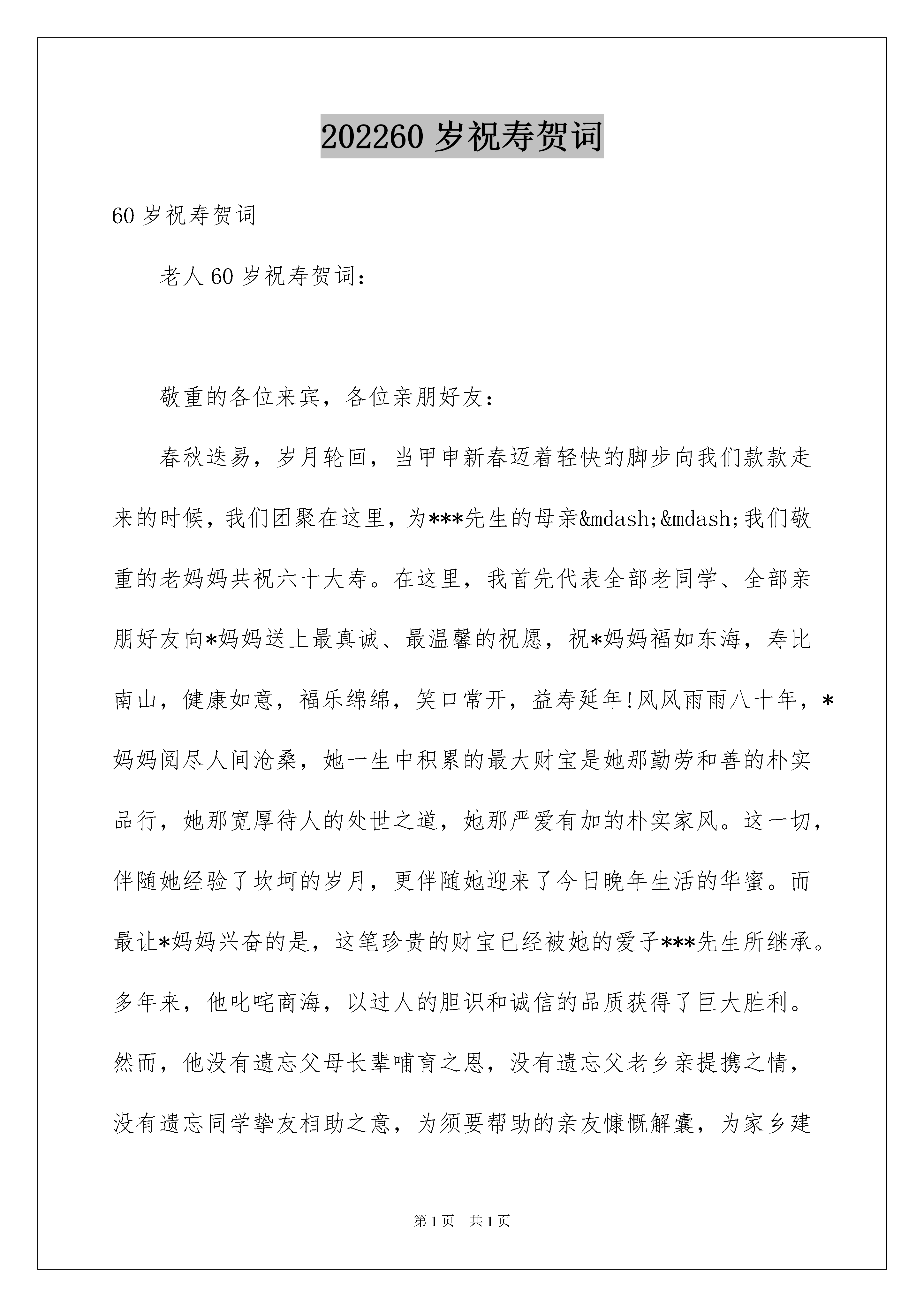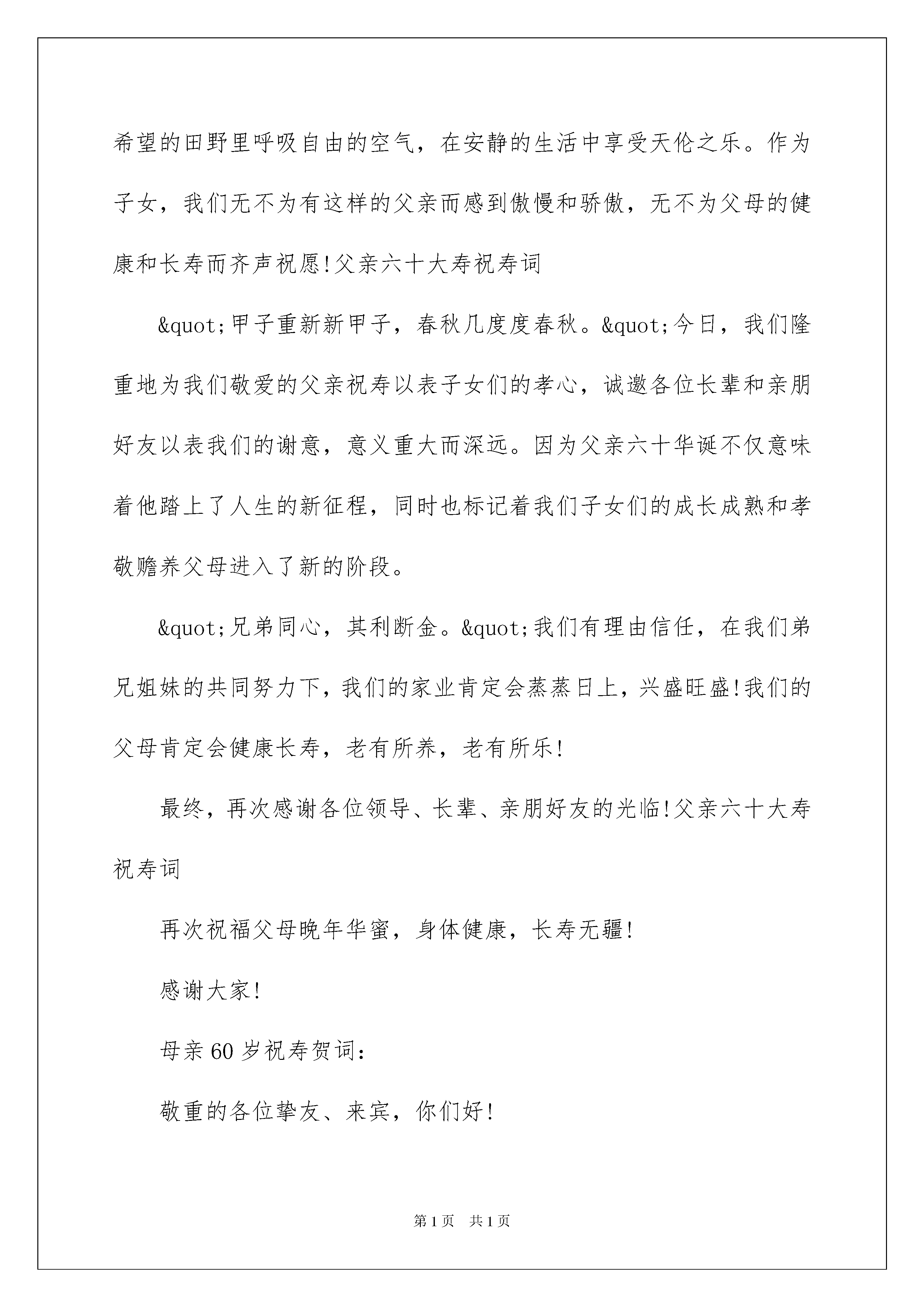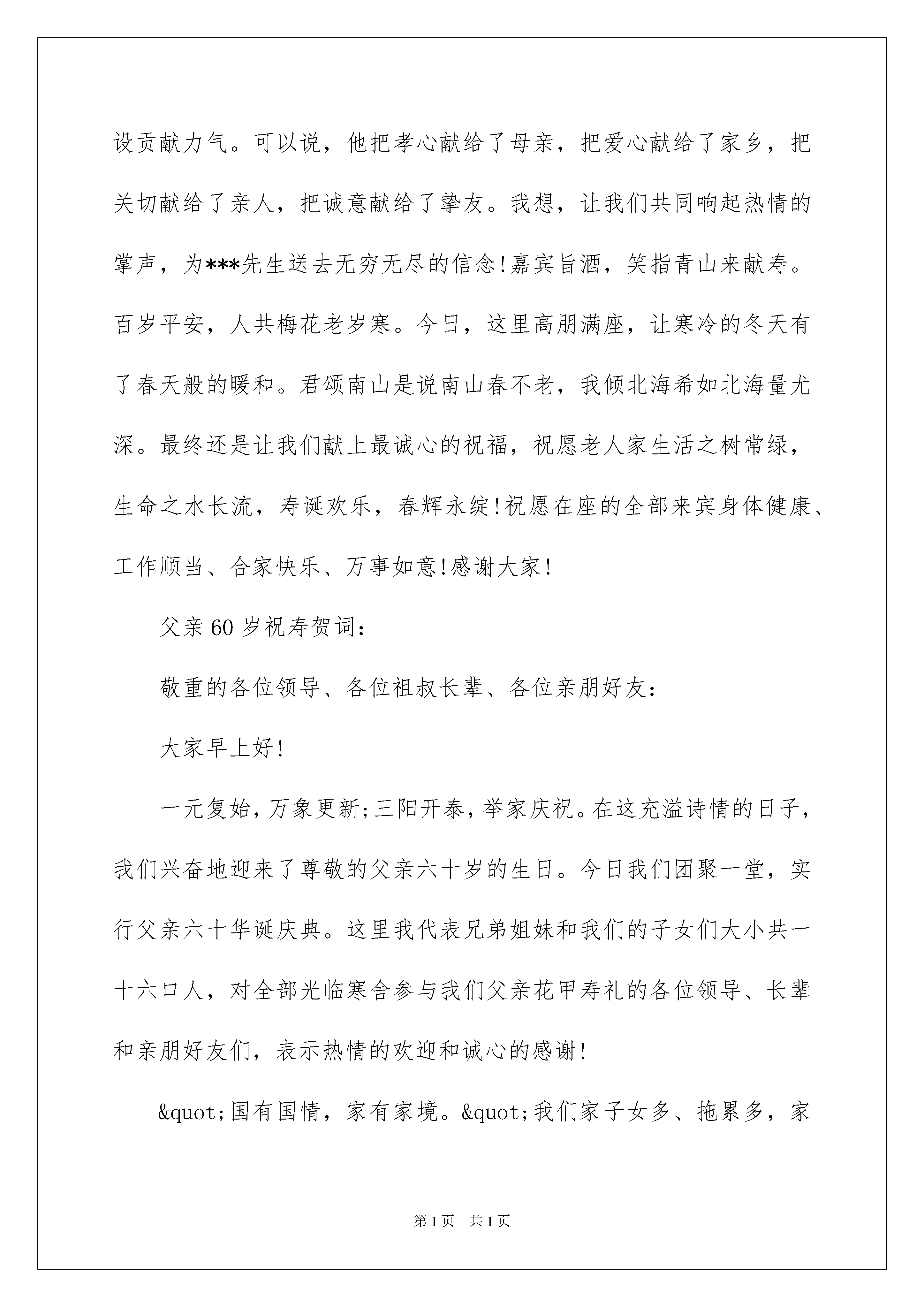 202260岁祝寿贺词60岁祝寿贺词老人60岁祝寿贺词:敬重的各位来宾,各位亲朋好友:春秋迭易,岁月轮回,当甲申新春迈着轻快的脚步向我们款款走来的时候,我们团聚在这里,为***先生的母亲——我们敬重的老妈妈共祝六十大寿。在这里,我首先代表全部老同学、全部亲朋好友向*妈妈送上最真诚、最温馨的祝愿,祝*妈妈福如东海,寿比南山,健康如意,福乐绵绵,笑口常开,益寿延年!风风雨雨八十年,*妈妈阅尽人间沧桑,她一生中积累的最大财宝是她那勤劳和善的朴实品行,她那宽厚待人的处世之道,她那严爱有加的朴实家风。这一切,伴随她经验了坎坷的岁月,更伴随她迎来了今日晚年生活的华蜜。而最让*妈妈兴奋的是,这笔珍贵的财宝已经被她的爱子***先生所继承。多年来,他叱咤商海,以过人的胆识和诚信的品质获得了巨大胜利。然而,他没有遗忘父母长辈哺育之恩,没有遗忘父老乡亲提携之情,没有遗忘同学挚友相助之意,为须要帮助的亲友慷慨解囊,为家乡建设贡献力气。可以说,他把孝心献给了母亲,把爱心献给了家乡,把关切献给了亲人,把诚意献给了挚友。我想,让我们共同响起热情的掌声,为***先生送去无穷无尽的信念!嘉宾旨酒,笑指青山来献寿。百岁平安,人共梅花老岁寒。今日,这里高朋满座,让寒冷的冬天有了春天般的暖和。君颂南山是说南山春不老,我倾北海希如北海量尤深。最终还是让我们献上最诚心的祝福,祝愿老人家生活之树常绿,生命之水长流,寿诞欢乐,春辉永绽!祝愿在座的全部来宾身体健康、工作顺当、合家快乐、万事如意!感谢大家!父亲60岁祝寿贺词:敬重的各位领导、各位祖叔长辈、各位亲朋好友:大家早上好!一元复始,万象更新;三阳开泰,举家庆祝。在这充溢诗情的日子,我们兴奋地迎来了尊敬的父亲六十岁的生日。今日我们团聚一堂,实行父亲六十华诞庆典。这里我代表兄弟姐妹和我们的子女们大小共一十六口人,对全部光临寒舍参与我们父亲花甲寿礼的各位领导、长辈和亲朋好友们,表示热情的欢迎和诚心的感谢!"国有国情,家有家境。"我们家子女多、拖累多,家境贫寒。我们的父母亲几十年艰苦奋斗,勤俭持家,以他们毕生的精力拖家带口、养老育幼,把我们一个个拉扯大,并培育成人。常年的含辛茹苦和辛勤劳作,他们的脸上留下了岁月刻划的年轮,头上镶嵌了春秋打造的霜花。所以,在今日这个喜庆的.日子里,我们首先要说的是,诚心感谢二老的哺育之恩!父亲六十大寿祝寿词"养儿才知父母恩","三十而立,四十不惑",如今我们这些儿女都有了肯定的社会阅历、能进行理性的思索的时候,我们才深深地感受到,父母亲赐予我们的,不仅是生命和身体,还有满腔热血和铮铮铁骨;父母亲赐予我们的,不仅是物质财宝,更多的是勤奋质朴、虚心谨慎、与人为善、与时俱进的精神。而这些,才是一个人傲立于世的无价之宝,是不断前进、不懈奋斗、取之不尽、用之不竭的力气和财宝源泉。父亲是一本不简单解读的书。时至今日,我们才真正懂得这本书中深切的内涵:父亲酷爱教化、崇尚科学、追求真理、谨言慎行、教书育人、诲人不倦,所以堪为人师,桃李天下;父亲一身正气、两袖清风、为人正派、独善其身、以才安家、以德立命,所以堪为人范,惠及子孙;退休后,父亲回来田园、培土育苗、耕读传家、颐享天年,在希望的田野里呼吸自由的空气,在安静的生活中享受天伦之乐。作为子女,我们无不为有这样的父亲而感到傲慢和骄傲,无不为父母的健康和长寿而齐声祝愿!父亲六十大寿祝寿词"甲子重新新甲子,春秋几度度春秋。"今日,我们隆重地为我们敬爱的父亲祝寿以表子女们的孝心,诚邀各位长辈和亲朋好友以表我们的谢意,意义重大而深远。因为父亲六十华诞不仅意味着他踏上了人生的新征程,同时也标记着我们子女们的成长成熟和孝敬赡养父母进入了新的阶段。"兄弟同心,其利断金。"我们有理由信任,在我们弟兄姐妹的共同努力下,我们的家业肯定会蒸蒸日上,兴盛旺盛!我们的父母肯定会健康长寿,老有所养,老有所乐!最终,再次感谢各位领导、长辈、亲朋好友的光临!父亲六十大寿祝寿词再次祝福父母晚年华蜜,身体健康,长寿无疆!感谢大家!母亲60岁祝寿贺词:敬重的各位挚友、来宾,你们好!值此我母亲花甲之年的生日庆典之际,我代表我的母亲,我们姐弟六人及我的家族向光临寿宴的嘉宾表示最热情的欢迎和最真诚的谢意!世间有一个人,她恒久占据着我们心里最松软的地方,我们愿用自己的一生去爱她;世间有一种爱,她让我们肆意的索取、享用,却不要我们任何的回报……这一个人,叫;母亲;;这一种爱,叫;母爱;!在这里,我无比傲慢