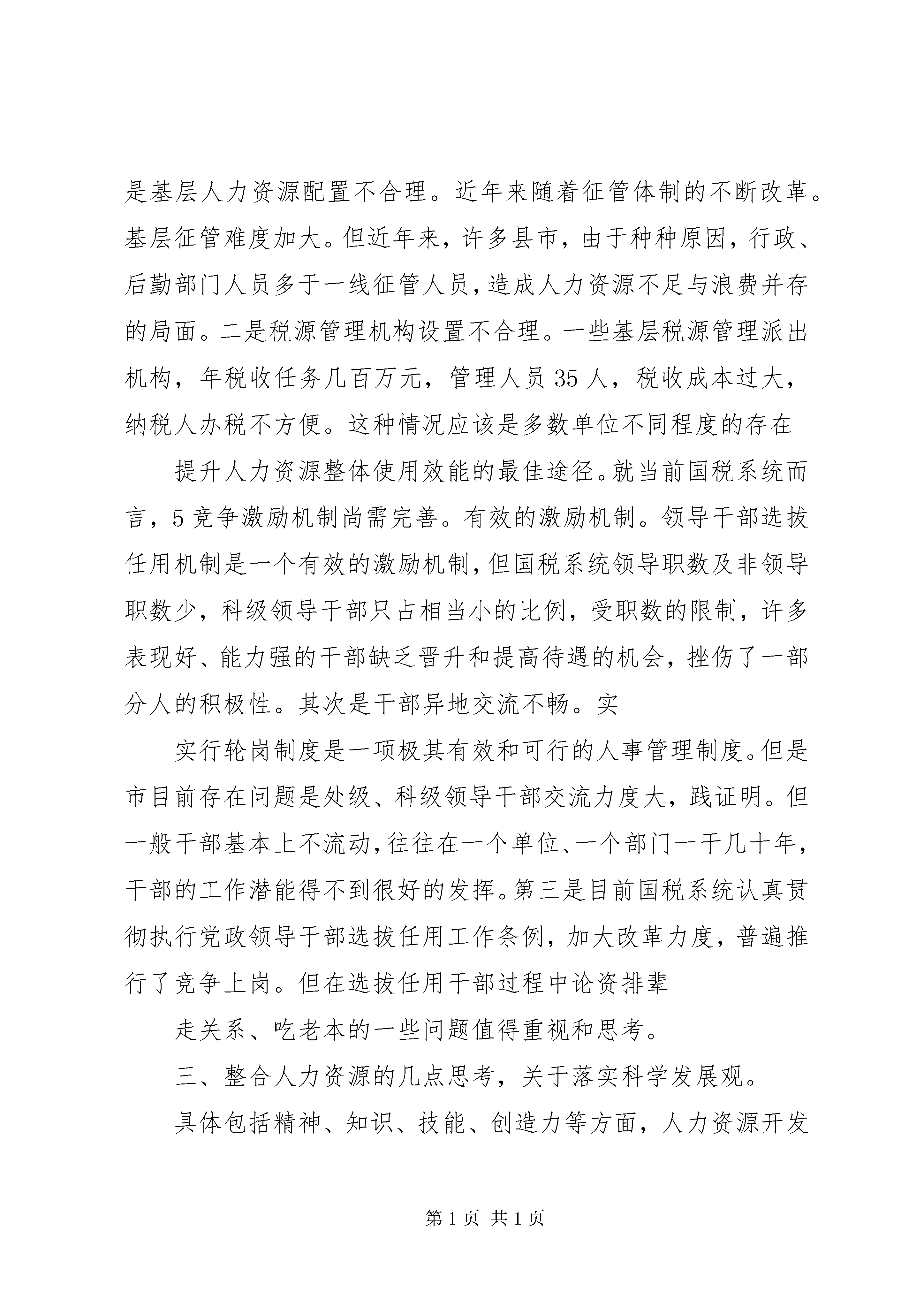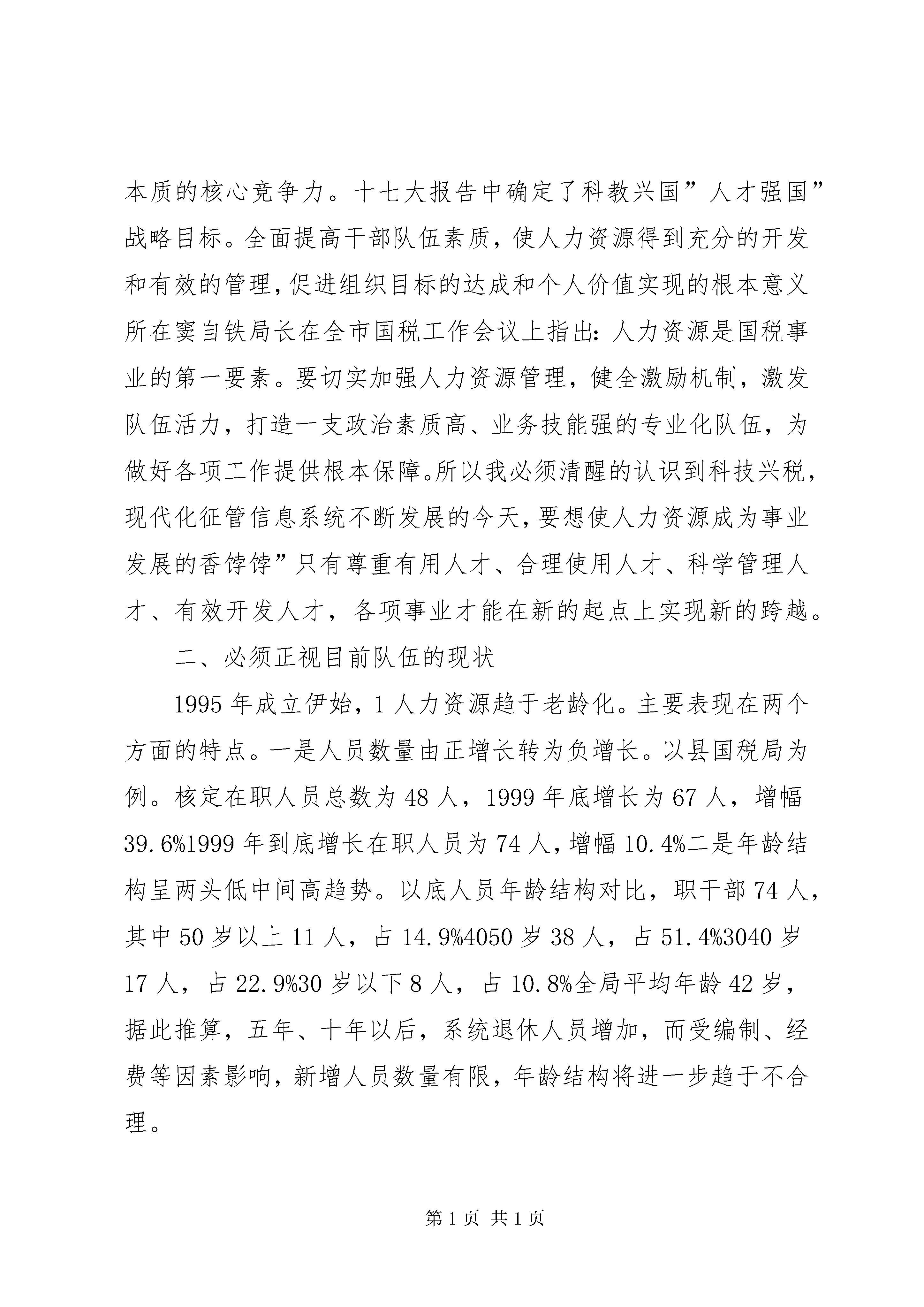 国税局人才管理工作汇报遵循依法、稳妥、效能、规范,要充分认识到当前税收信息化建设对传统税收管理的组织结构、工作机制和行为模式提出的新的挑战。结合本单位税源管理机构设置和辖区税源分布情况。有利于税收工作开展的原则,通过基层调研、走访纳税人等渠道,总结和分析现有征管模式的不足之处,重点解决征管质量不高,纳税服务效率低下,管理成本过重的实际问题。一是引入能本管理理念。结合税收管理员能级管理机制,根据每个税务人员的不同知识结构和能力特点,将其分配到能充分发挥其特长的岗位上,实现人本效能最大程度的发挥。二是优化业务重组。打破机关与基层的界限,本着对外有利于方便纳税人,对内有利于明确责任、分权制约的原则,重组征管组织机构。通过减少管理层次、压缩职能机构形成一种新型组织机构,使管理组织设置简单、管理程序简化、信息传递更加流畅。三是纳税服务更具高效。将受理咨询的涉税事宜和征收职能推向前台,集中到办税服务厅办理,简化管理环节,减少管理层次和审批级次,解决纳税人多头跑、多次跑的问题,达到优质服务与提高机关效率的双赢”效果。一、提高人力资源管理水平的重要意义和作用,必须正确认识到挖掘人力资源潜能。当今知识经济时代,现代管理学理论认为。人力资源作为一种智力资源,诸多资源中处于第一重要位置,一个组织或团队最本质的核心竞争力。十七大报告中确定了科教兴国”人才强国”战略目标。全面提高干部队伍素质,使人力资源得到充分的开发和有效的管理,促进组织目标的达成和个人价值实现的根本意义所在窦自铁局长在全市国税工作会议上指出:人力资源是国税事业的第一要素。要切实加强人力资源管理,健全激励机制,激发队伍活力,打造一支政治素质高、业务技能强的专业化队伍,为做好各项工作提供根本保障。所以我必须清醒的认识到科技兴税,现代化征管信息系统不断发展的今天,要想使人力资源成为事业发展的香饽饽”只有尊重有用人才、合理使用人才、科学管理人才、有效开发人才,各项事业才能在新的起点上实现新的跨越。二、必须正视目前队伍的现状1995年成立伊始,1人力资源趋于老龄化。主要表现在两个方面的特点。一是人员数量由正增长转为负增长。以县国税局为例。核定在职人员总数为48人,1999年底增长为67人,增幅39.6%1999年到底增长在职人员为74人,增幅10.4%二是年龄结构呈两头低中间高趋势。以底人员年龄结构对比,职干部74人,其中50岁以上11人,占14.9%4050岁38人,占51.4%3040岁17人,占22.9%30岁以下8人,占10.8%全局平均年龄42岁,据此推算,五年、十年以后,系统退休人员增加,而受编制、经费等因素影响,新增人员数量有限,年龄结构将进一步趋于不合理。能干活的人少。以我局为例,2人浮于事与人员不足并存。通俗的话说就是拿钱的人多。全局在职人员除去年龄偏大、病休,实习人员外,实际可利用的人力资源仅占人员总量的70%机关8个股室,1人一个股室的2个,2人一个股室的3个。1人兼两职或多职的12人。历年来征管体制改革、机构整合中,部分单位无法选配到足够的人员充实岗位,明显的感觉到可用人力资源的严重“匮乏”据调查,这种现象并非一个单位的特例,这在全市许多地方均有不同程度的存在人力资源输入主要来之三个渠道。一是从财税学校及各类专科学校毕业的大中专毕业生;二是部队转业的转业干部和复员军人;三是后国家定向招录的国家公务员。从以上人员来看,3专业技术人才匮乏。国税部门自机构分设建局以来。只有一少部分财税学校专科毕业,而一大部分“门外汉”仅是后期通过电大、函授、脱产轮训、不定期培训等多种方式取得了专科及以上学历,但事实上其专业能力没有得到明显的提高。一个比较普遍的现象是许多基层单位反映,一方面单位里持有上述文凭的人员占相当大的比例,另一方面要找出在写作、计算机操作、法律应用、大型企业管理方面比较突出的专业人才非常困难。截止到底,局财税、财经学院毕业专科人员为11名,仅占总人数的14.9%人力资源的专业知识结构仍处于“低谷”状态。税收形势和任务日益严峻和繁重,4优化配置缺乏活力。一是基层人力资源配置不合理。近年来随着征管体制的不断改革。基层征管难度加大。但近年来,许多县市,由于种种原因,行政、后勤部门人员多于一线征管人员,造成人力资源不足与浪费并存的局面。二是税源管理机构设置不合理。一些基层税源管理派出机构,年税收任务几百万元,管理人员35人,税收成本过大,纳税人办税不方便。这种情况应该是多数单位不同程度的存在提升人力资源整体使用效能的最佳途径。就当前国税系统而言,5竞争激励机制尚需完善。有效的激励机制。领导干部选拔任用机制是一个有效的激励机制,但国税系统领导职数及非领导职数少,科级领导干部只占相当小的比例,受职数的限制,许多表现好、能力强的干部缺乏晋升和提高待遇的机会,