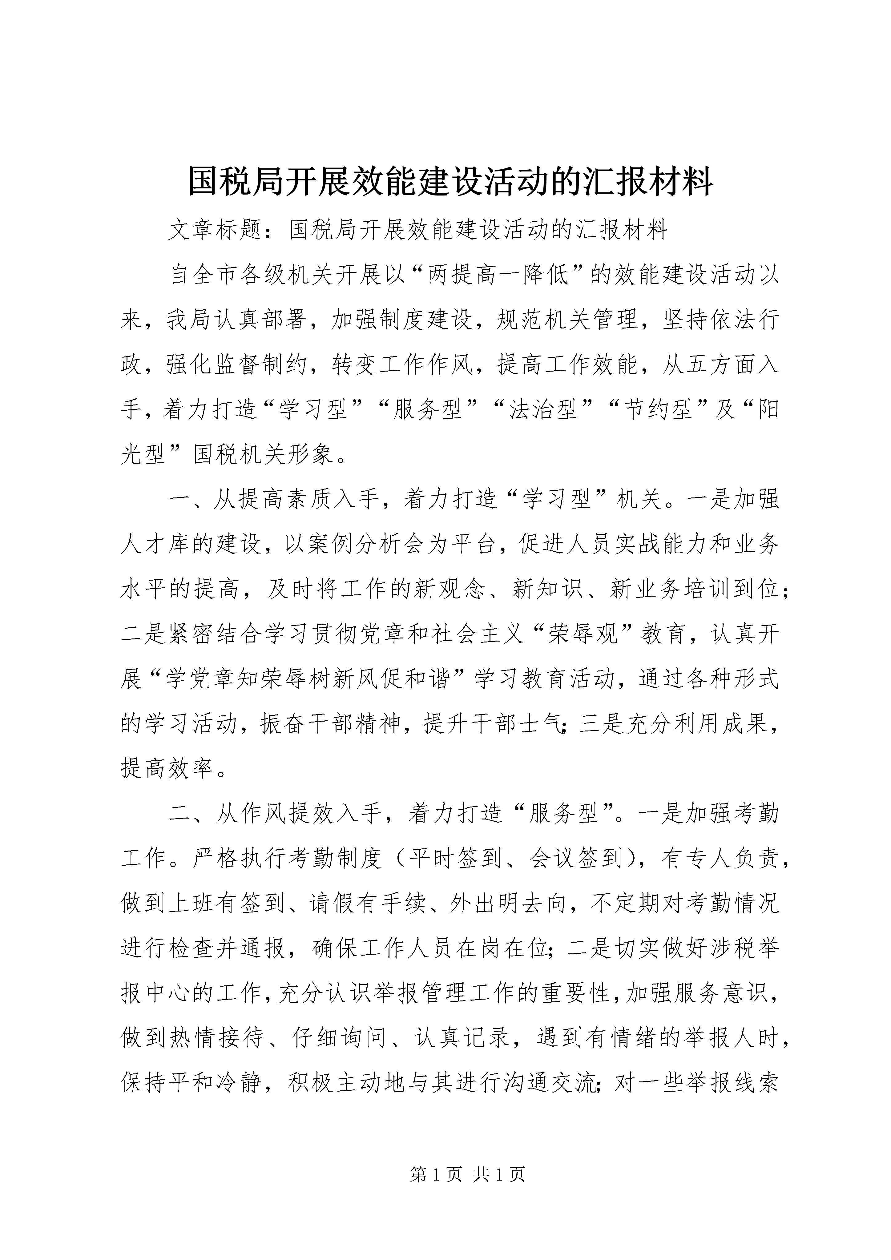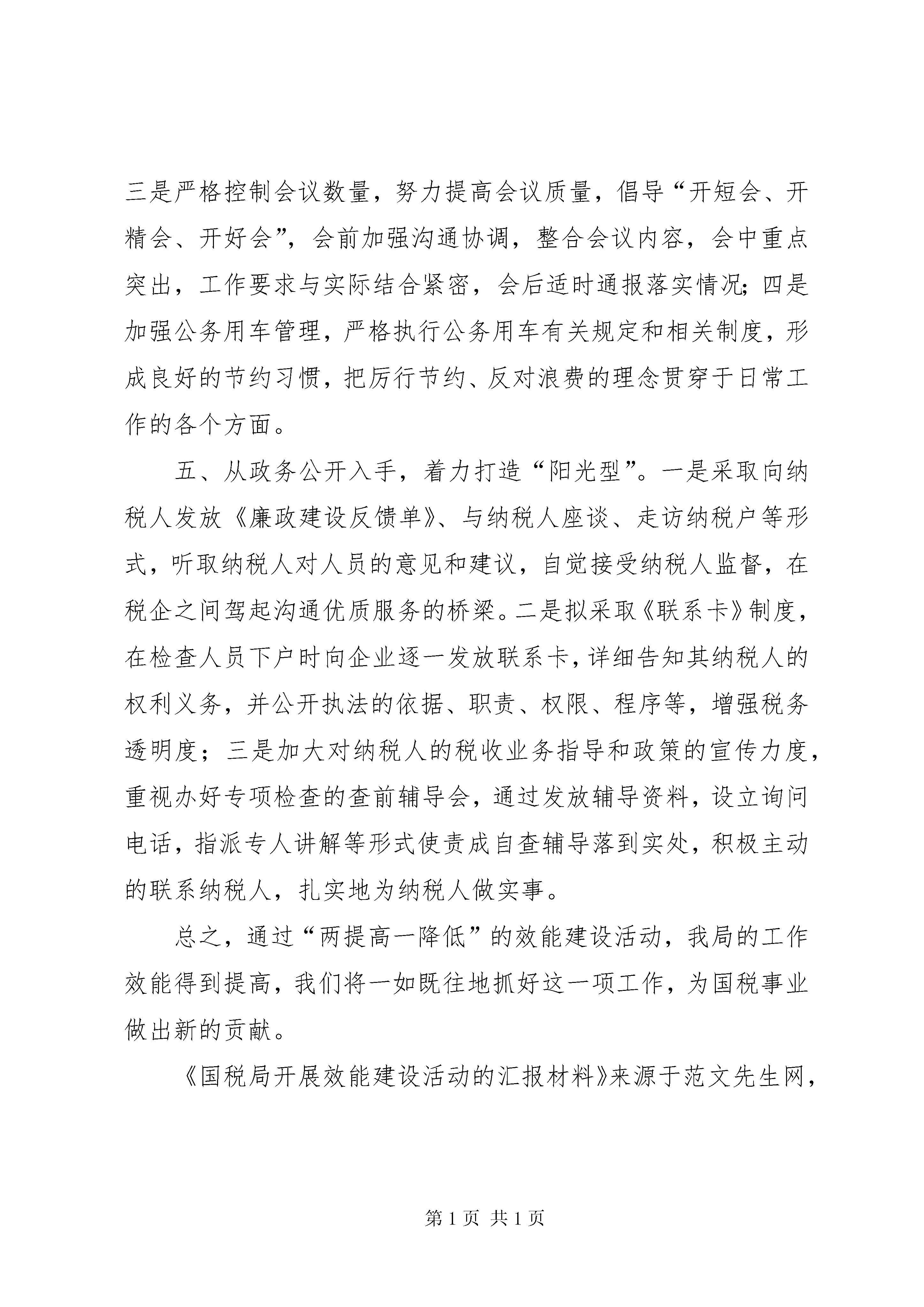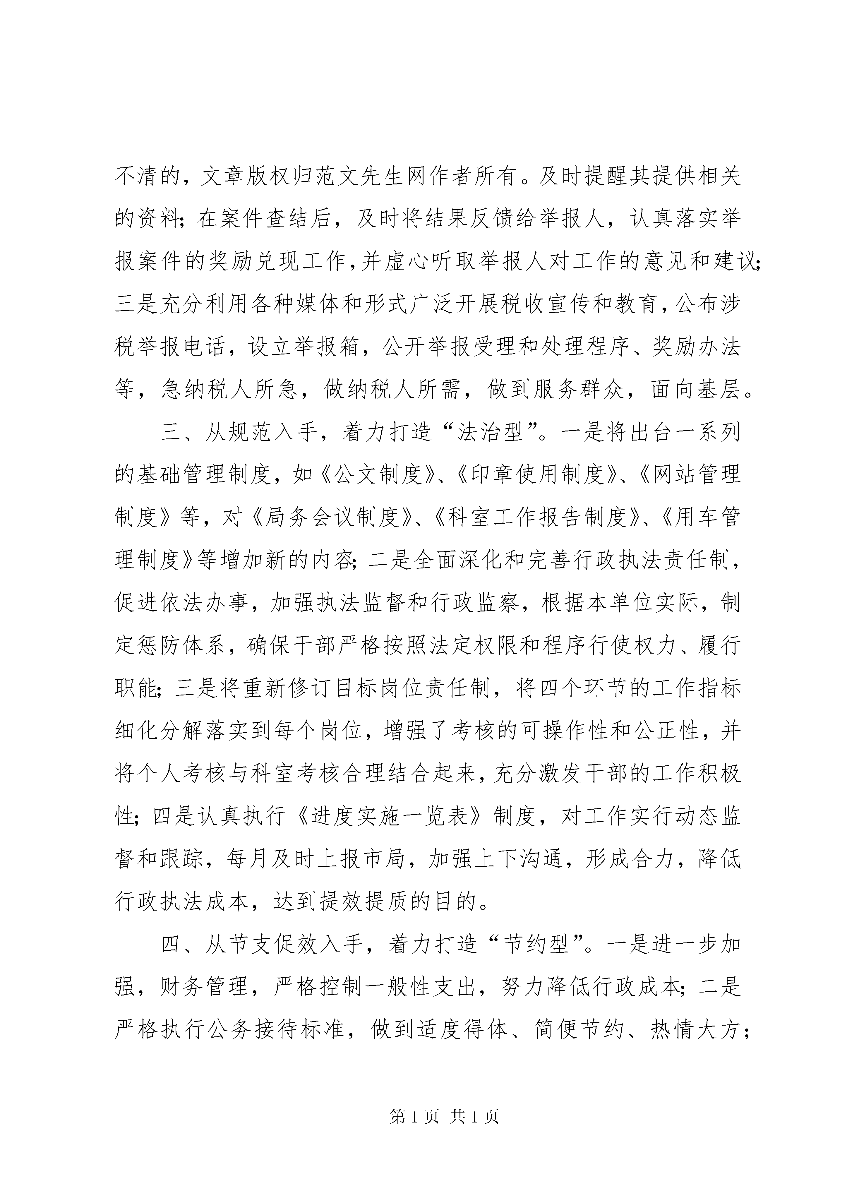 国税局开展效能建设活动的汇报材料文章标题:国税局开展效能建设活动的汇报材料自全市各级机关开展以“两提高一降低”的效能建设活动以来,我局认真部署,加强制度建设,规范机关管理,坚持依法行政,强化监督制约,转变工作作风,提高工作效能,从五方面入手,着力打造“学习型”“服务型”“法治型”“节约型”及“阳光型”国税机关形象。一、从提高素质入手,着力打造“学习型”机关。一是加强人才库的建设,以案例分析会为平台,促进人员实战能力和业务水平的提高,及时将工作的新观念、新知识、新业务培训到位;二是紧密结合学习贯彻党章和社会主义“荣辱观”教育,认真开展“学党章知荣辱树新风促和谐”学习教育活动,通过各种形式的学习活动,振奋干部精神,提升干部士气;三是充分利用成果,提高效率。二、从作风提效入手,着力打造“服务型”。一是加强考勤工作。严格执行考勤制度(平时签到、会议签到),有专人负责,做到上班有签到、请假有手续、外出明去向,不定期对考勤情况进行检查并通报,确保工作人员在岗在位;二是切实做好涉税举报中心的工作,充分认识举报管理工作的重要性,加强服务意识,做到热情接待、仔细询问、认真记录,遇到有情绪的举报人时,保持平和冷静,积极主动地与其进行沟通交流;对一些举报线索不清的,文章版权归范文先生网作者所有。及时提醒其提供相关的资料;在案件查结后,及时将结果反馈给举报人,认真落实举报案件的奖励兑现工作,并虚心听取举报人对工作的意见和建议;三是充分利用各种媒体和形式广泛开展税收宣传和教育,公布涉税举报电话,设立举报箱,公开举报受理和处理程序、奖励办法等,急纳税人所急,做纳税人所需,做到服务群众,面向基层。三、从规范入手,着力打造“法治型”。一是将出台一系列的基础管理制度,如《公文制度》、《印章使用制度》、《网站管理制度》等,对《局务会议制度》、《科室工作报告制度》、《用车管理制度》等增加新的内容;二是全面深化和完善行政执法责任制,促进依法办事,加强执法监督和行政监察,根据本单位实际,制定惩防体系,确保干部严格按照法定权限和程序行使权力、履行职能;三是将重新修订目标岗位责任制,将四个环节的工作指标细化分解落实到每个岗位,增强了考核的可操作性和公正性,并将个人考核与科室考核合理结合起来,充分激发干部的工作积极性;四是认真执行《进度实施一览表》制度,对工作实行动态监督和跟踪,每月及时上报市局,加强上下沟通,形成合力,降低行政执法成本,达到提效提质的目的。四、从节支促效入手,着力打造“节约型”。一是进一步加强,财务管理,严格控制一般性支出,努力降低行政成本;二是严格执行公务接待标准,做到适度得体、简便节约、热情大方;三是严格控制会议数量,努力提高会议质量,倡导“开短会、开精会、开好会”,会前加强沟通协调,整合会议内容,会中重点突出,工作要求与实际结合紧密,会后适时通报落实情况;四是加强公务用车管理,严格执行公务用车有关规定和相关制度,形成良好的节约习惯,把厉行节约、反对浪费的理念贯穿于日常工作的各个方面。五、从政务公开入手,着力打造“阳光型”。一是采取向纳税人发放《廉政建设反馈单》、与纳税人座谈、走访纳税户等形式,听取纳税人对人员的意见和建议,自觉接受纳税人监督,在税企之间驾起沟通优质服务的桥梁。二是拟采取《联系卡》制度,在检查人员下户时向企业逐一发放联系卡,详细告知其纳税人的权利义务,并公开执法的依据、职责、权限、程序等,增强税务透明度;三是加大对纳税人的税收业务指导和政策的宣传力度,重视办好专项检查的查前辅导会,通过发放辅导资料,设立询问电话,指派专人讲解等形式使责成自查辅导落到实处,积极主动的联系纳税人,扎实地为纳税人做实事。总之,通过“两提高一降低”的效能建设活动,我局的工作效能得到提高,我们将一如既往地抓好这一项工作,为国税事业做出新的贡献。《国税局开展效能建设活动的汇报材料》来源于范文先生网,欢迎阅读国税局开展效能建设活动的汇报材料。