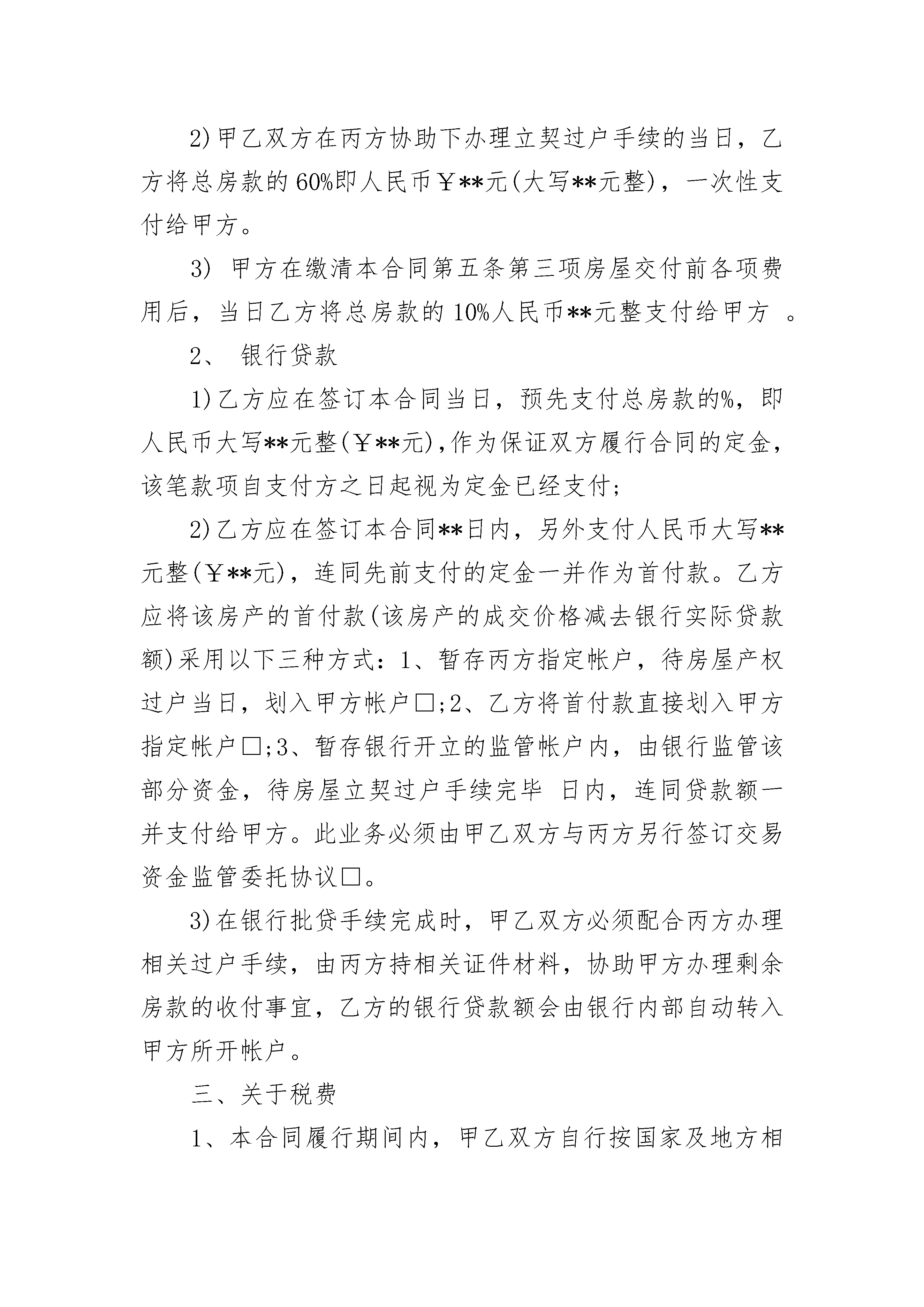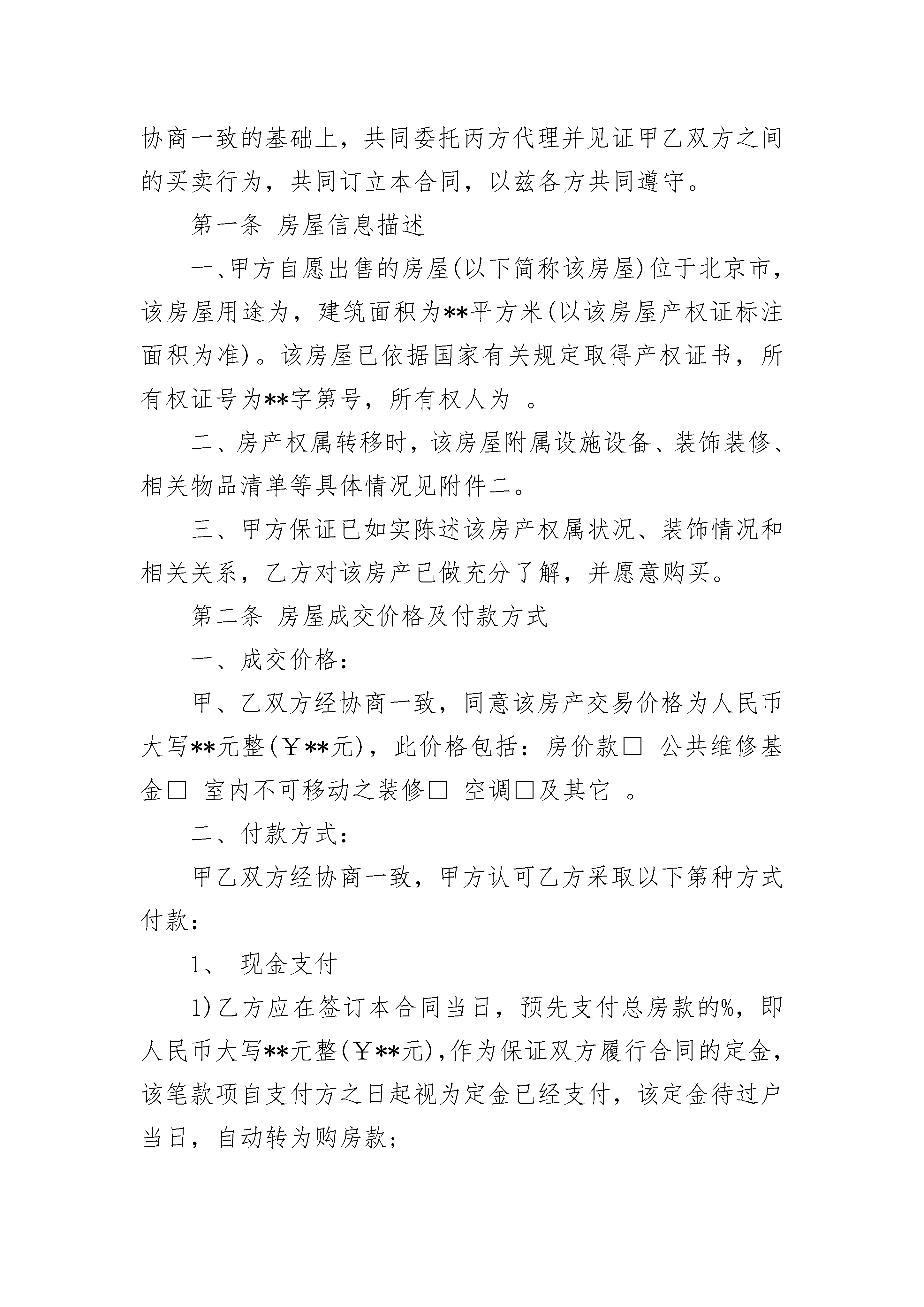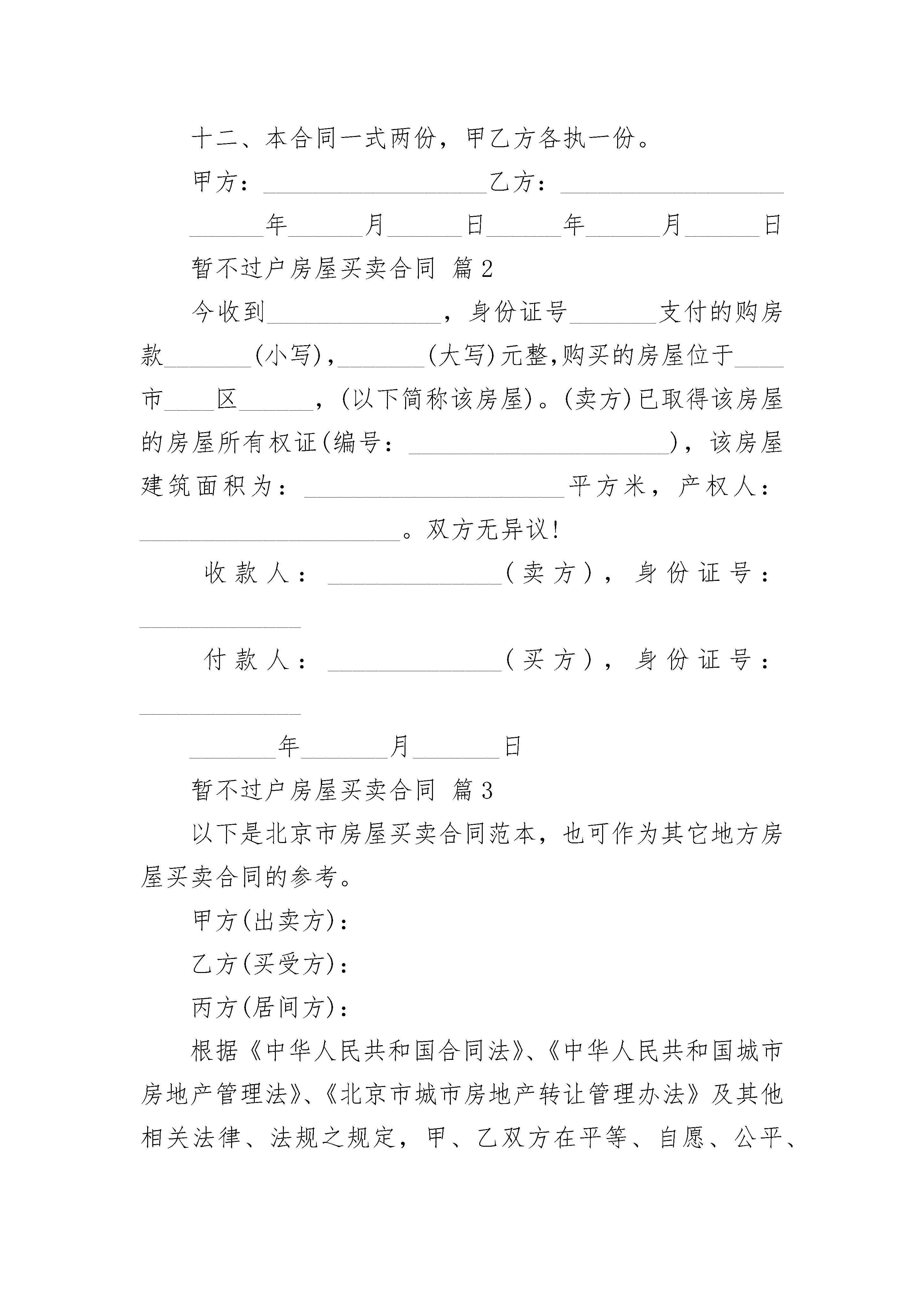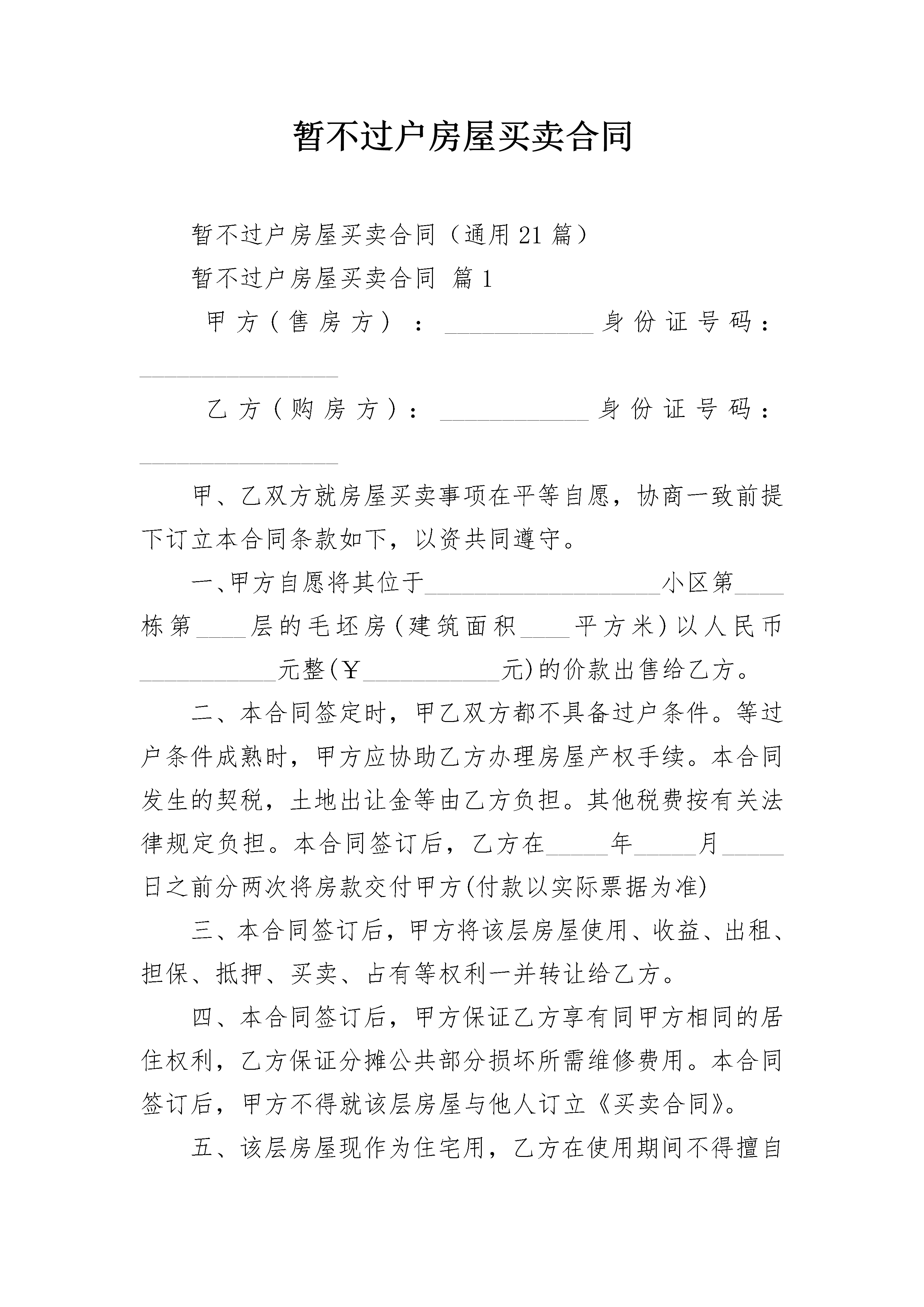 暂不过户房屋买卖合同暂不过户房屋买卖合同(通用21篇)暂不过户房屋买卖合同篇1甲方(售房方):____________身份证号码:________________乙方(购房方):____________身份证号码:________________甲、乙双方就房屋买卖事项在平等自愿,协商一致前提下订立本合同条款如下,以资共同遵守。一、甲方自愿将其位于___________________小区第____栋第____层的毛坯房(建筑面积____平方米)以人民币___________元整(¥___________元)的价款出售给乙方。二、本合同签定时,甲乙双方都不具备过户条件。等过户条件成熟时,甲方应协助乙方办理房屋产权手续。本合同发生的契税,土地出让金等由乙方负担。其他税费按有关法律规定负担。本合同签订后,乙方在_____年_____月_____日之前分两次将房款交付甲方(付款以实际票据为准)三、本合同签订后,甲方将该层房屋使用、收益、出租、担保、抵押、买卖、占有等权利一并转让给乙方。四、本合同签订后,甲方保证乙方享有同甲方相同的居住权利,乙方保证分摊公共部分损坏所需维修费用。本合同签订后,甲方不得就该层房屋与他人订立《买卖合同》。五、该层房屋现作为住宅用,乙方在使用期间不得擅自改变房屋结构和用途,甲方不得擅自改变与该房屋有关联的公共设施、公共用地的使用性质。六、房屋竣工验收合格后,甲方应以书面或口头通知乙方办理交付手续,乙方按照双方约定按期缴清本合同款项,如乙方超过约定期限三个月未缴清房款,甲方有权处理此房。七、甲方应积极协助乙方办理水、电、煤气等配套设施开户手续,相关费用由乙方承担。八、违约责任1、如果甲方出售的房屋存在质量问题影响到乙方居住权利的行使,一切责任由甲方承担,并应赔偿乙方的损失。2、本合同签订后,任何一方不得擅自变更或解除合同。如因重大客观原因导致本合同的解除,由双方参照市场及购房款等条件协商解决,并赔偿乙方的房屋装修费用。3、如该栋房屋需拆迁重建,甲方需在重建楼栋为乙方提供一套面积不少于______平方米房屋,楼层由双方协商确定;该套房屋除土建项目费用外其他补偿款由乙方所得。九、如遇国家政策变动,相关事项由双方协商解决。十、本合同在履行过程中发生的争议,由双方当事人协商解决;协商不成的可按下述两种方式解决。1、提交_____区仲裁委员会仲裁。2、依法向_____区人民法院起诉。十一、本合同自双方签字或盖章之日起生效。本合同未尽事宜双方可以签定补充协议,补充协议与本合同具有同等法律效力。十二、本合同一式两份,甲乙方各执一份。甲方:__________________乙方:________________________年______月______日______年______月______日暂不过户房屋买卖合同篇2今收到______________,身份证号_______支付的购房款_______(小写),_______(大写)元整,购买的房屋位于____市____区______,(以下简称该房屋)。(卖方)已取得该房屋的房屋所有权证(编号:_____________________),该房屋建筑面积为:_____________________平方米,产权人:_____________________。双方无异议!收款人:______________(卖方),身份证号:_____________付款人:______________(买方),身份证号:____________________年_______月_______日暂不过户房屋买卖合同篇3以下是北京市房屋买卖合同范本,也可作为其它地方房屋买卖合同的参考。甲方(出卖方):乙方(买受方):丙方(居间方):根据《中华人民共和国合同法》、《中华人民共和国城市房地产管理法》、《北京市城市房地产转让管理办法》及其他相关法律、法规之规定,甲、乙双方在平等、自愿、公平、协商一致的基础上,共同委托丙方代理并见证甲乙双方之间的买卖行为,共同订立本合同,以兹各方共同遵守。第一条房屋信息描述一、甲方自愿出售的房屋(以下简称该房屋)位于北京市,该房屋用途为,建筑面积为**平方米(以该房屋产权证标注面积为准)。该房屋已依据国家有关规定取得产权证书,所有权证号为**字第号,所有权人为。二、房产权属转移时,该房屋附属设施设备、装饰装修、相关物品清单等具体情况见附件二。三、甲方保证已如实陈述该房产权属状况、装饰情况和相关关系,乙方对该房产已做充分了解,并愿意购买。第二条房屋成交价格及付款方式一、成交价格:甲、乙双方经协商一致,同意该房产交易价格为人民币大写**元整(¥**元),此价格包括:房价款□公共维修基金□室内不可移动之装修□空调□及其它。二、付款方式:甲乙双方经协商一致,甲方认可乙