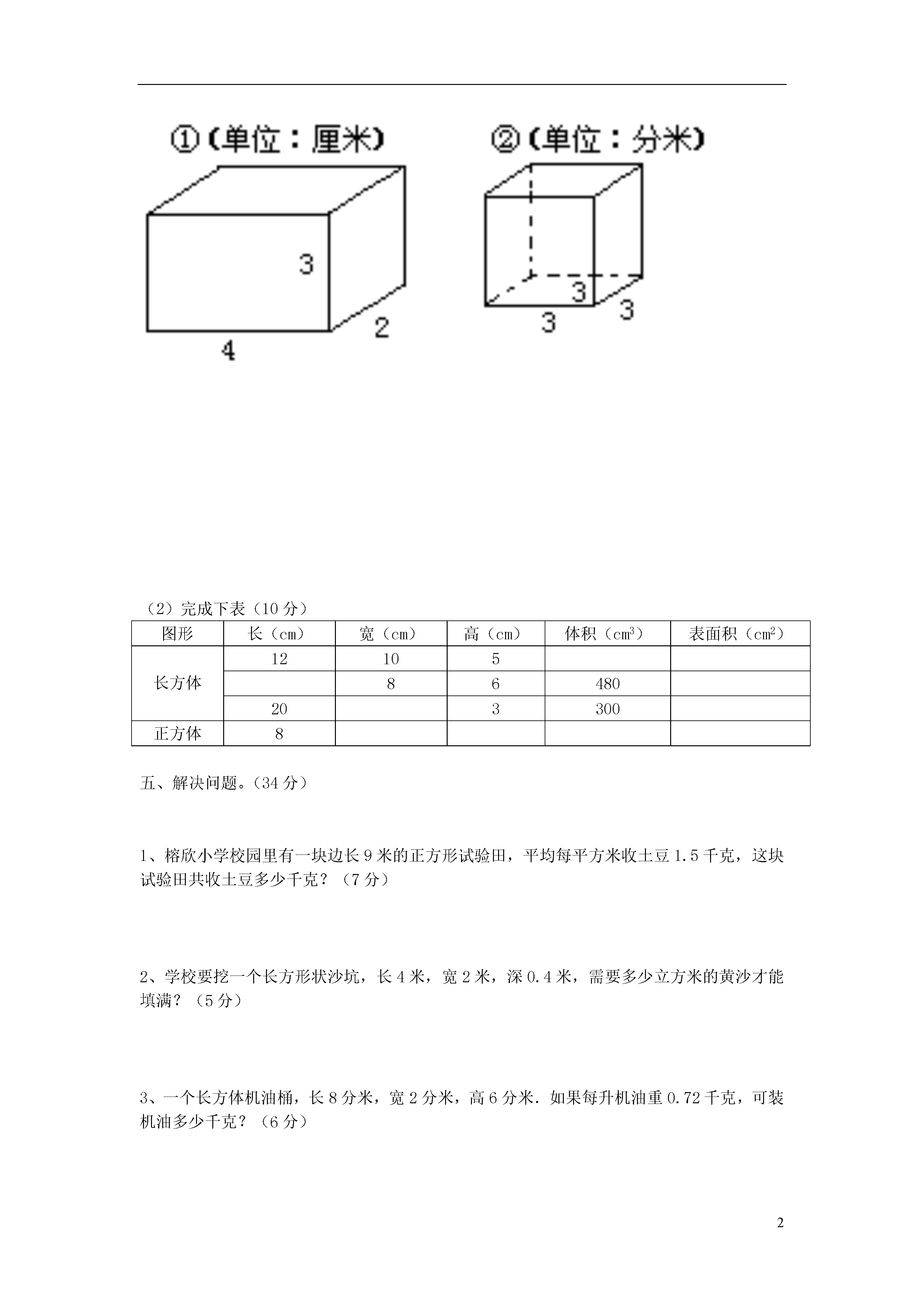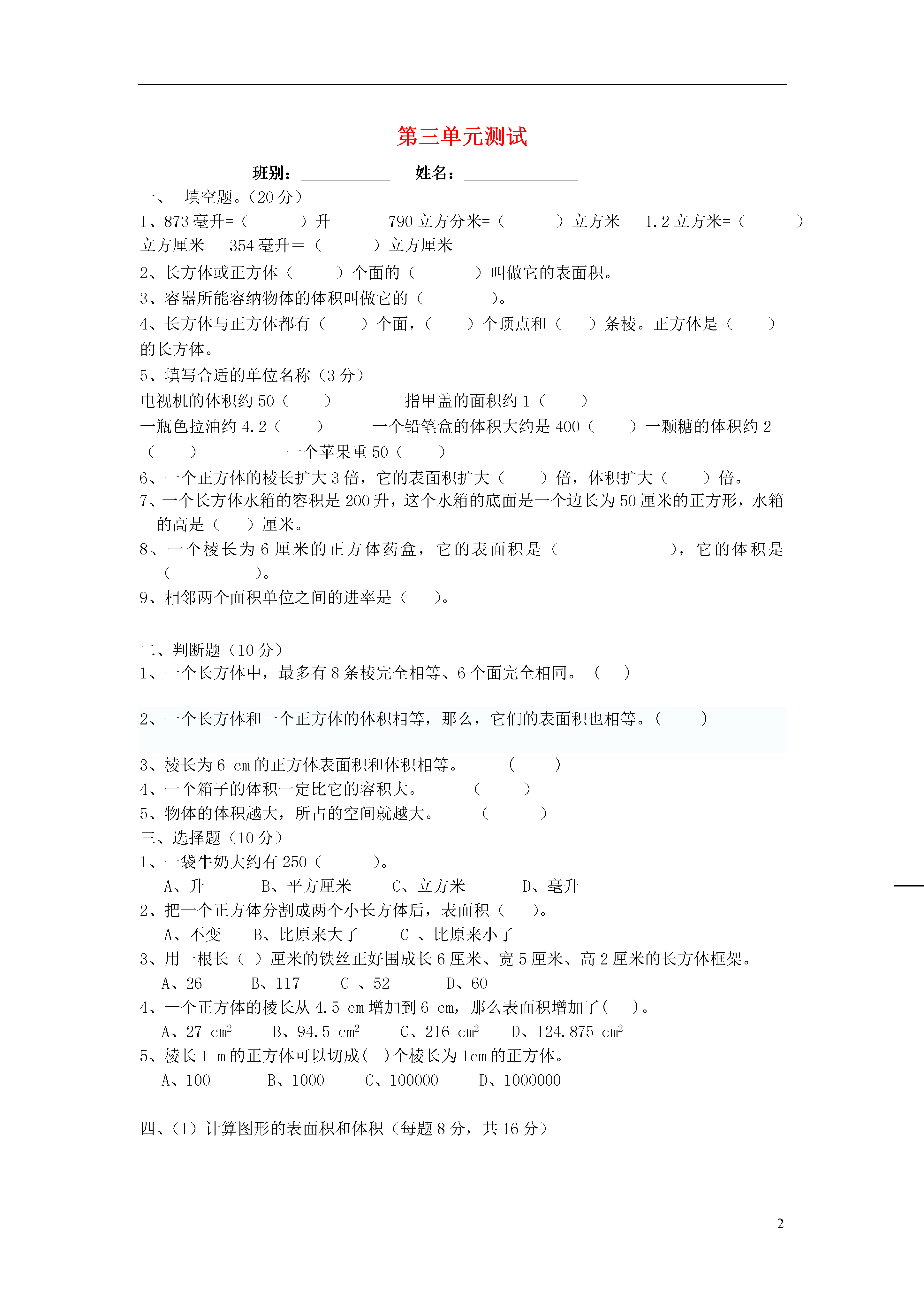 2第三单元测试班别:姓名:填空题。(20分)1、873毫升=()升790立方分米=()立方米1.2立方米=()立方厘米354毫升=()立方厘米2、长方体或正方体()个面的()叫做它的表面积。3、容器所能容纳物体的体积叫做它的()。4、长方体与正方体都有()个面,()个顶点和()条棱。正方体是()的长方体。5、填写合适的单位名称(3分)电视机的体积约50()指甲盖的面积约1()一瓶色拉油约4.2()一个铅笔盒的体积大约是400()一颗糖的体积约2()一个苹果重50()6、一个正方体的棱长扩大3倍,它的表面积扩大()倍,体积扩大()倍。7、一个长方体水箱的容积是200升,这个水箱的底面是一个边长为50厘米的正方形,水箱的高是()厘米。8、一个棱长为6厘米的正方体药盒,它的表面积是(),它的体积是()。9、相邻两个面积单位之间的进率是()。二、判断题(10分)1、一个长方体中,最多有8条棱完全相等、6个面完全相同。()2、一个长方体和一个正方体的体积相等,那么,它们的表面积也相等。()3、棱长为6cm的正方体表面积和体积相等。()4、一个箱子的体积一定比它的容积大。()5、物体的体积越大,所占的空间就越大。()三、选择题(10分)1、一袋牛奶大约有250()。A、升B、平方厘米C、立方米D、毫升2、把一个正方体分割成两个小长方体后,表面积()。A、不变B、比原来大了C、比原来小了3、用一根长()厘米的铁丝正好围成长6厘米、宽5厘米、高2厘米的长方体框架。A、26B、117C、52D、604、一个正方体的棱长从4.5cm增加到6cm,那么表面积增加了()。A、27cm2B、94.5cm2C、216cm2D、124.875cm25、棱长1m的正方体可以切成()个棱长为1cm的正方体。A、100B、1000C、100000D、1000000四、(1)计算图形的表面积和体积(每题8分,共16分)(2)完成下表(10分)图形长(cm)宽(cm)高(cm)体积(cm3)表面积(cm2)长方体1210586480203300正方体8五、解决问题。(34分)1、榕欣小学校园里有一块边长9米的正方形试验田,平均每平方米收土豆1.5千克,这块试验田共收土豆多少千克?(7分)2、学校要挖一个长方形状沙坑,长4米,宽2米,深0.4米,需要多少立方米的黄沙才能填满?(5分)3、一个长方体机油桶,长8分米,宽2分米,高6分米.如果每升机油重0.72千克,可装机油多少千克?(6分)4、在一个长20米,宽8米,深1.5米的长方体蓄水池里面贴瓷砖,瓷砖是边长为0.2米的正方形,贴完共需瓷砖多少块?(8分)5、一个长方体铁盒长18厘米,宽15厘米,高12厘米,做成这个铁盒至少用多少平方分米的铁皮?(8分)