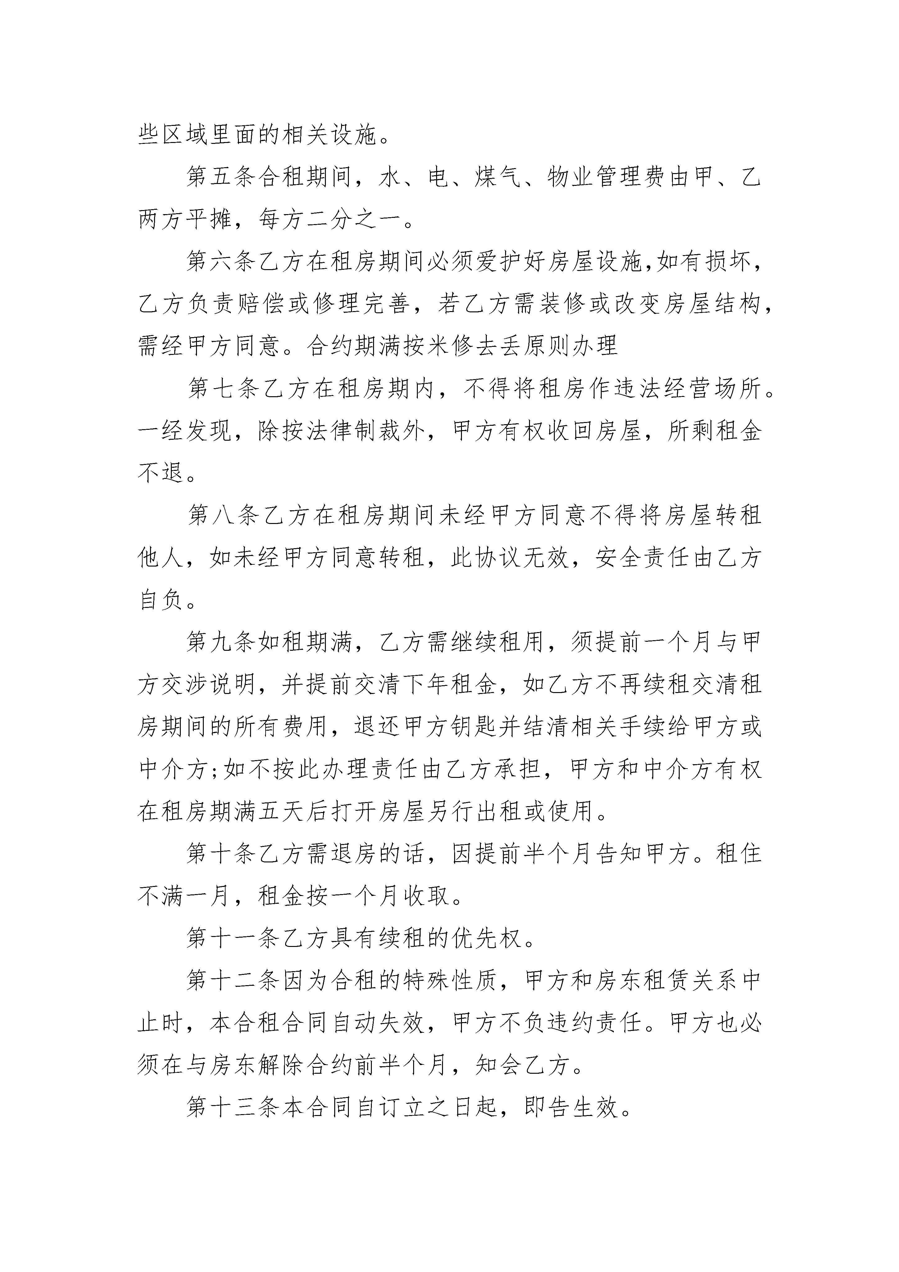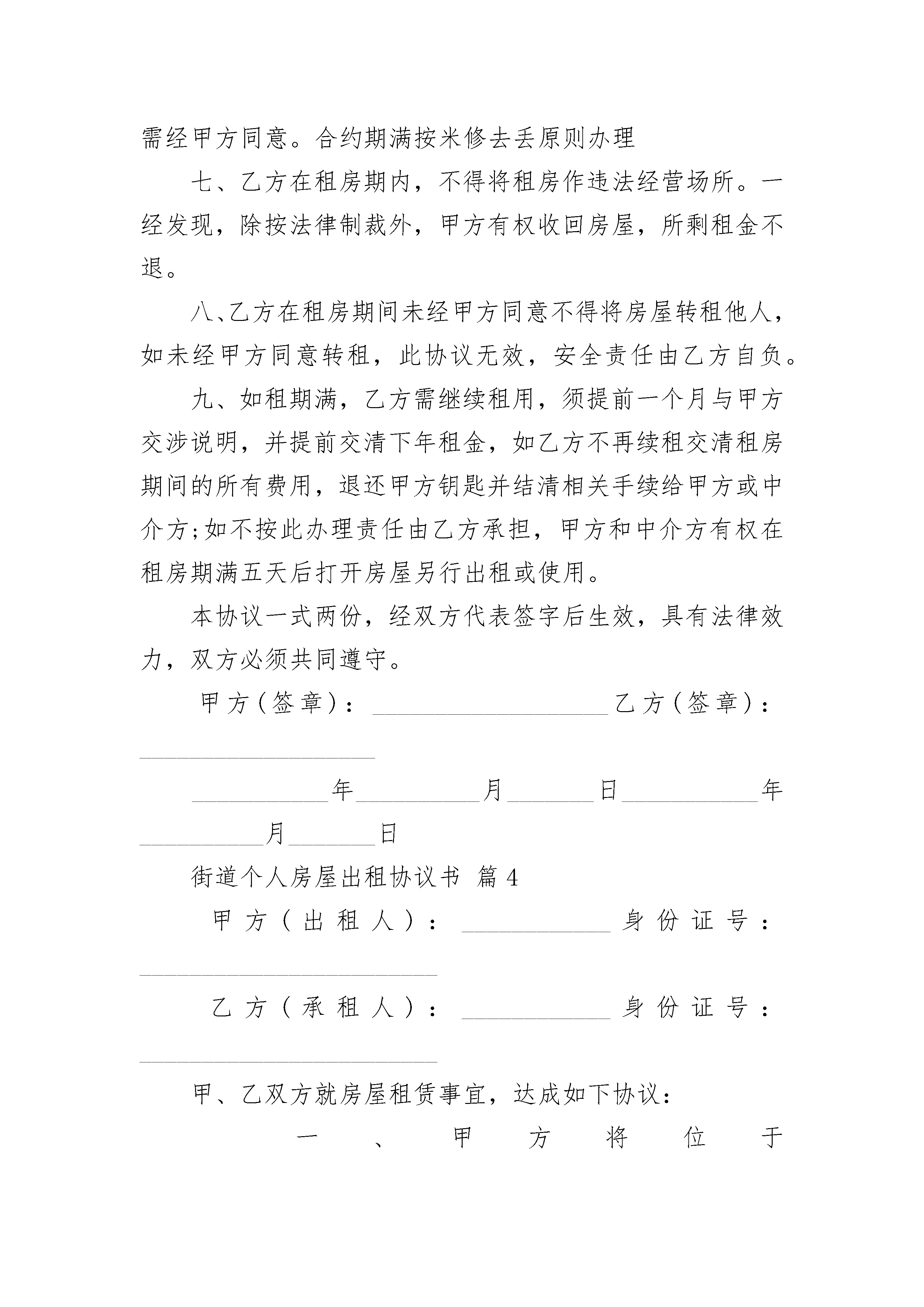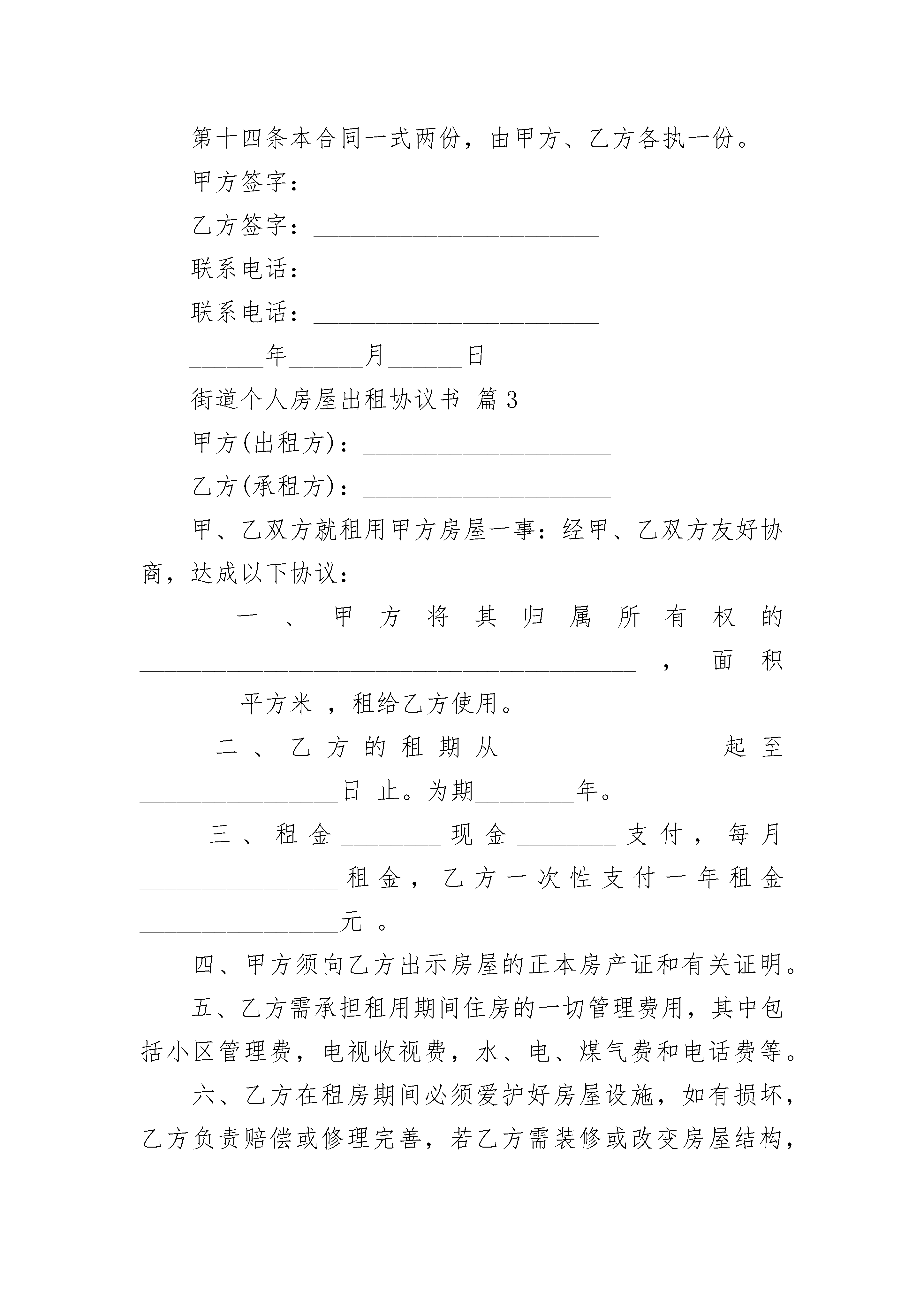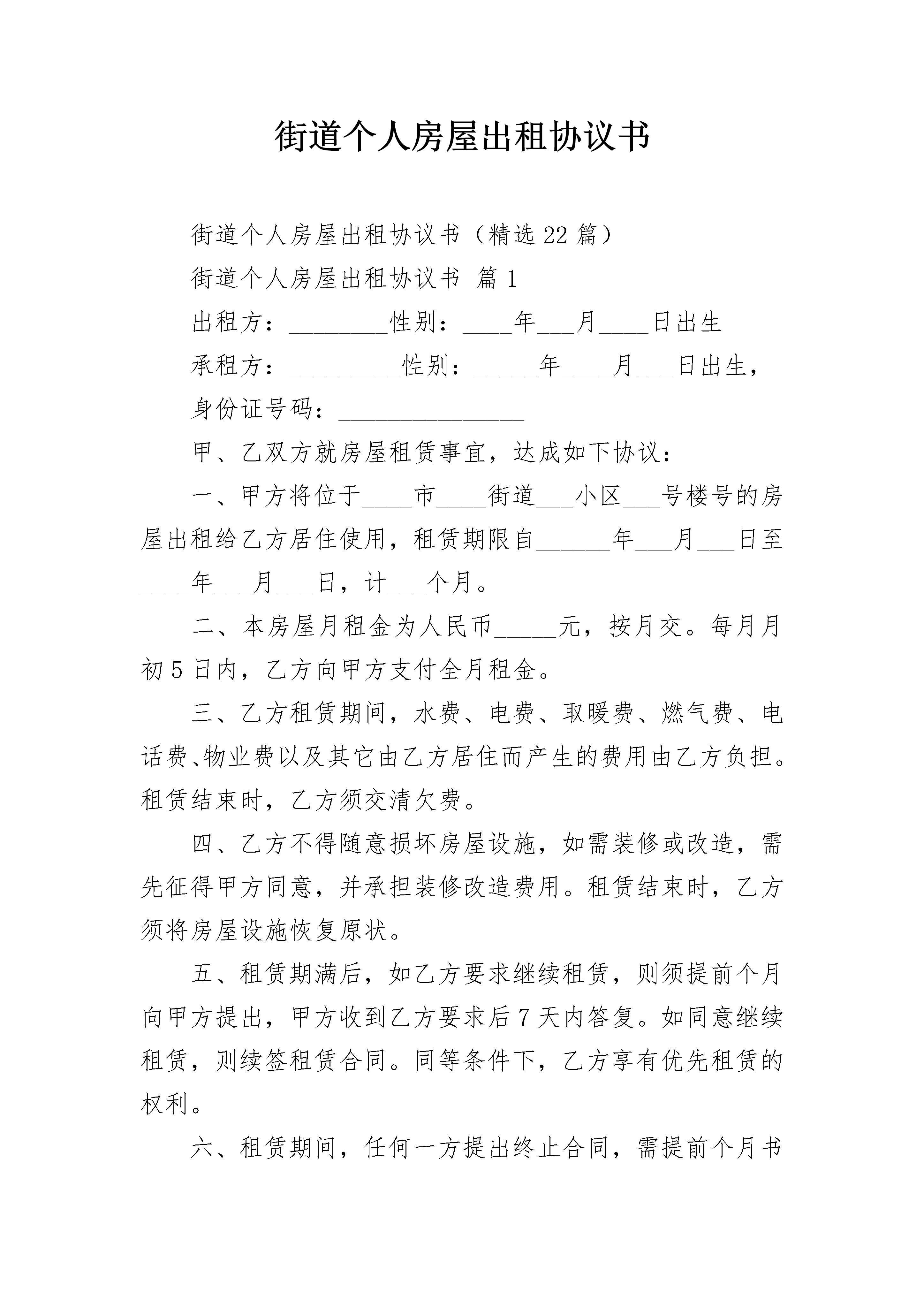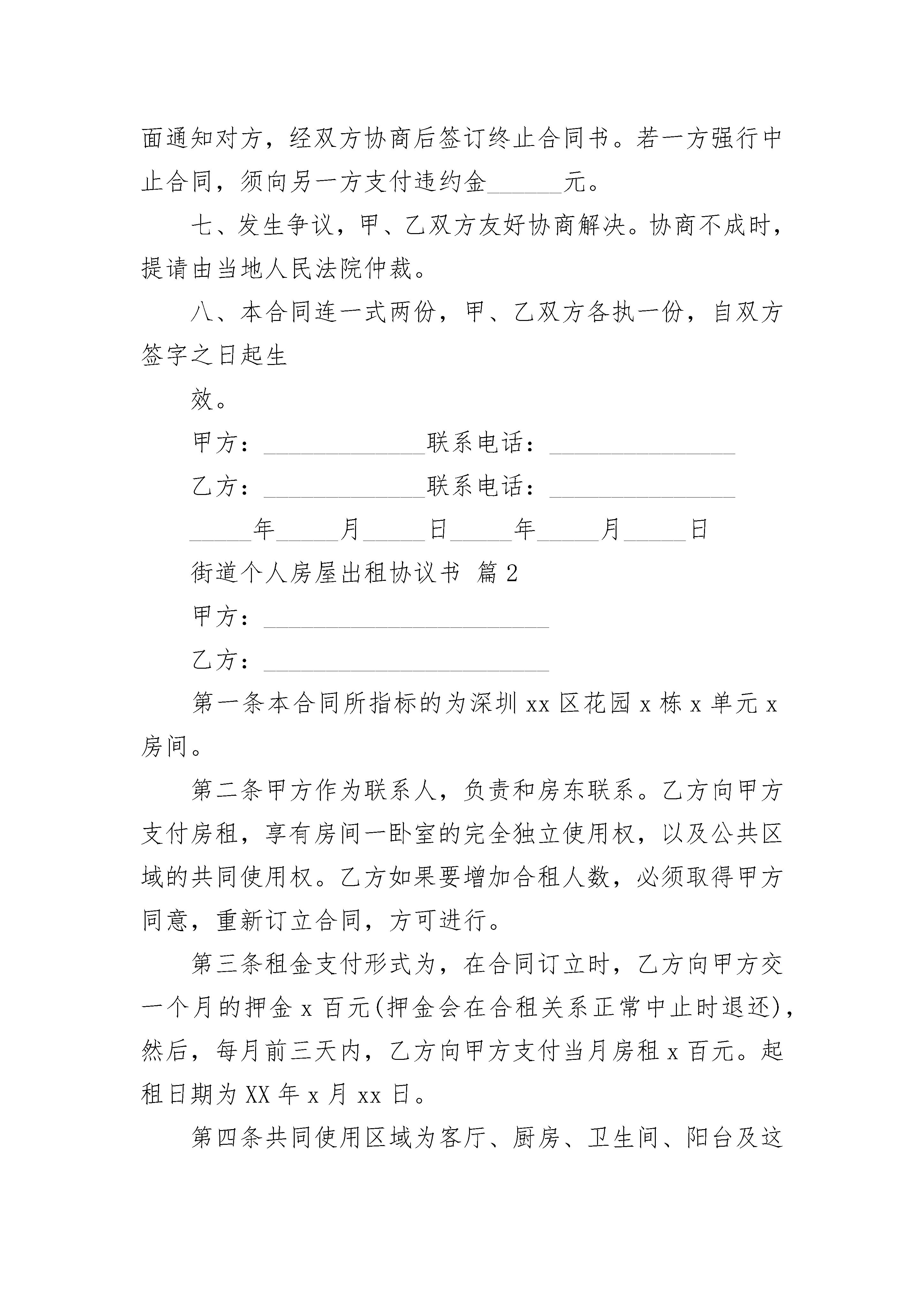 街道个人房屋出租协议书街道个人房屋出租协议书(精选22篇)街道个人房屋出租协议书篇1出租方:________性别:____年___月____日出生承租方:_________性别:_____年____月___日出生,身份证号码:_______________甲、乙双方就房屋租赁事宜,达成如下协议:一、甲方将位于____市____街道___小区___号楼号的房屋出租给乙方居住使用,租赁期限自______年___月___日至____年___月___日,计___个月。二、本房屋月租金为人民币_____元,按月交。每月月初5日内,乙方向甲方支付全月租金。三、乙方租赁期间,水费、电费、取暖费、燃气费、电话费、物业费以及其它由乙方居住而产生的费用由乙方负担。租赁结束时,乙方须交清欠费。四、乙方不得随意损坏房屋设施,如需装修或改造,需先征得甲方同意,并承担装修改造费用。租赁结束时,乙方须将房屋设施恢复原状。五、租赁期满后,如乙方要求继续租赁,则须提前个月向甲方提出,甲方收到乙方要求后7天内答复。如同意继续租赁,则续签租赁合同。同等条件下,乙方享有优先租赁的权利。六、租赁期间,任何一方提出终止合同,需提前个月书面通知对方,经双方协商后签订终止合同书。若一方强行中止合同,须向另一方支付违约金______元。七、发生争议,甲、乙双方友好协商解决。协商不成时,提请由当地人民法院仲裁。八、本合同连一式两份,甲、乙双方各执一份,自双方签字之日起生效。甲方:_____________联系电话:_______________乙方:_____________联系电话:____________________年_____月_____日_____年_____月_____日街道个人房屋出租协议书篇2甲方:_______________________乙方:_______________________第一条本合同所指标的为深圳xx区花园x栋x单元x房间。第二条甲方作为联系人,负责和房东联系。乙方向甲方支付房租,享有房间一卧室的完全独立使用权,以及公共区域的共同使用权。乙方如果要增加合租人数,必须取得甲方同意,重新订立合同,方可进行。第三条租金支付形式为,在合同订立时,乙方向甲方交一个月的押金x百元(押金会在合租关系正常中止时退还),然后,每月前三天内,乙方向甲方支付当月房租x百元。起租日期为XX年x月xx日。第四条共同使用区域为客厅、厨房、卫生间、阳台及这些区域里面的相关设施。第五条合租期间,水、电、煤气、物业管理费由甲、乙两方平摊,每方二分之一。第六条乙方在租房期间必须爱护好房屋设施,如有损坏,乙方负责赔偿或修理完善,若乙方需装修或改变房屋结构,需经甲方同意。合约期满按米修去丢原则办理第七条乙方在租房期内,不得将租房作违法经营场所。一经发现,除按法律制裁外,甲方有权收回房屋,所剩租金不退。第八条乙方在租房期间未经甲方同意不得将房屋转租他人,如未经甲方同意转租,此协议无效,安全责任由乙方自负。第九条如租期满,乙方需继续租用,须提前一个月与甲方交涉说明,并提前交清下年租金,如乙方不再续租交清租房期间的所有费用,退还甲方钥匙并结清相关手续给甲方或中介方;如不按此办理责任由乙方承担,甲方和中介方有权在租房期满五天后打开房屋另行出租或使用。第十条乙方需退房的话,因提前半个月告知甲方。租住不满一月,租金按一个月收取。第十一条乙方具有续租的优先权。第十二条因为合租的特殊性质,甲方和房东租赁关系中止时,本合租合同自动失效,甲方不负违约责任。甲方也必须在与房东解除合约前半个月,知会乙方。第十三条本合同自订立之日起,即告生效。第十四条本合同一式两份,由甲方、乙方各执一份。甲方签字:_______________________乙方签字:_______________________联系电话:_______________________联系电话:_____________________________年______月______日街道个人房屋出租协议书篇3甲方(出租方):____________________乙方(承租方):____________________甲、乙双方就租用甲方房屋一事:经甲、乙双方友好协商,达成以下协议:一、甲方将其归属所有权的________________________________________,面积________平方米,租给乙方使用。二、乙方的租期从________________起至________________日止。为期________年。三、租金________现金________支付,每月________________租金,乙方一次性支付一年租金________________元。四、甲方须向乙方出示房屋的正本房产证和有关证