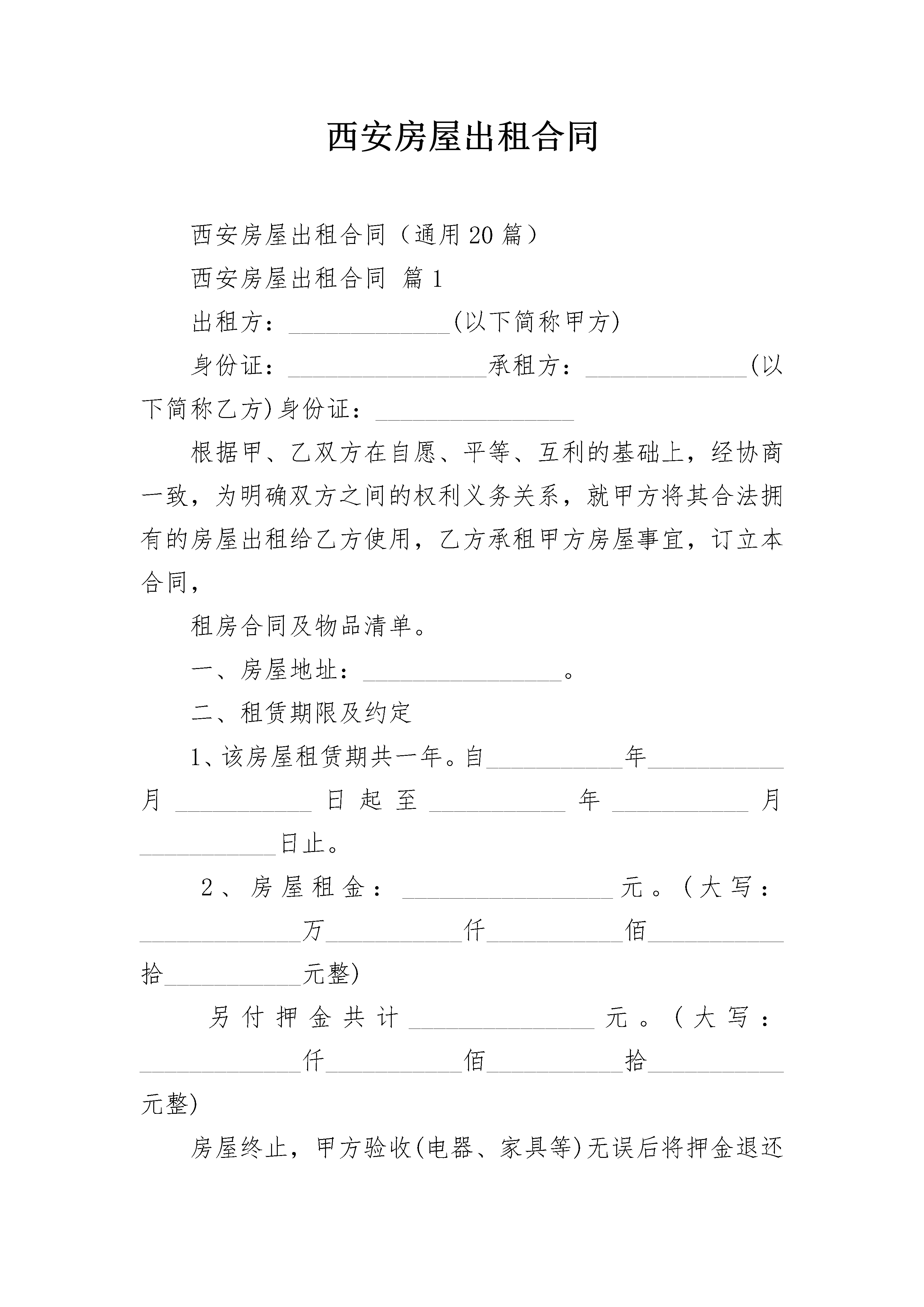 西安房屋出租合同西安房屋出租合同(通用20篇)西安房屋出租合同篇1出租方:_____________(以下简称甲方)身份证:________________承租方:_____________(以下简称乙方)身份证:________________根据甲、乙双方在自愿、平等、互利的基础上,经协商一致,为明确双方之间的权利义务关系,就甲方将其合法拥有的房屋出租给乙方使用,乙方承租甲方房屋事宜,订立本合同,租房合同及物品清单。一、房屋地址:________________。二、租赁期限及约定1、该房屋租赁期共一年。自___________年___________月___________日起至___________年___________月___________日止。2、房屋租金:_________________元。(大写:_____________万___________仟___________佰___________拾___________元整)另付押金共计_______________元。(大写:_____________仟___________佰___________拾___________元整)房屋终止,甲方验收(电器、家具等)无误后将押金退还乙方,不计利息。3、乙方向甲方承诺,租赁该房屋仅作为普通住第一文库网房使用。4、租金一次性付清,租住时间不满半年,押金不退;乙方住房半年如需退房,提前一个月告知甲方,检查房屋无损后才退押金。5、租赁期满,甲方有权收回出租房屋,乙方应如期交还。乙方如要求续租,则必须在租赁期满前两个月内通知甲方,经甲方同意后,重新签订租赁合同。三、房屋修缮与使用1、在租赁期内,甲方应保证出租房屋的使用安全,合同范本《租房合同及物品清单》乙方应合理使用其所承租的房屋及其附属设施。如乙方因使用不当造成房屋及设施损坏的,乙方应负责修复或给予经济赔偿。2、乙方应遵守居住区内各项规章制度,按时缴纳水、电、气等费用。3、乙方应保持屋内地面、墙壁的清洁;退房前地面、墙壁如有人为污渍,甲方扣除押金用于修复。4、乙方退房时交清水,电,气等费用及屋内设施家具、家电无损坏,下水管道,厕所无堵漏。甲方如数退还保证金。四、房屋的转让与转租1、租赁期间,未经甲方书面同意,乙方不得擅自转租、转借承租房屋。2、甲方同意乙方转租房屋的,应当单独订立补充协议,乙方应当依据与甲方的书面协议转租房屋。五、乙方违约的处理规定在租赁期内,乙方有下列行为之一的,甲方有权终止合同,收回该房屋,乙方应向甲方支付合同总租金20%的违约金,若支付的违约金不足弥补甲方损失的,乙方还应负责赔偿直至达到弥补全部损失为止。(1)未经甲方书面同意,擅自将房屋转租、转借给他人使用的;(2)未经甲方同意,擅自拆改变动房屋结构或损坏房屋,且经甲方通知,在规定期限内仍未纠正并修复的;(3)擅自改变本合同规定的租赁用途或利用该房屋进行违法活动的;(4)拖欠房租累计一个月以上的。六、本协议一式两份,甲.乙各执一份,签字后即行生效。七、其他说明:_________________水费、电费、燃气费由乙方自理。(入住时的水电气数字:_________________电_____________,水_____________,燃气_____________)八、第三页另附物品清单,由甲方乙方在入住前、退房前共同核查;如有损坏照价赔偿。甲方签字:_________________乙方签字:_________________联系方式:_________________联系方式:_________________西安房屋出租合同篇2本合同双方当事人出租方(甲方):承租方(乙方):根据国家有关法律、法规和本市有关规定,甲、乙双方在自愿、平等、互利的基础上,经协商一致,就甲方将其合法拥有的房屋出租给乙方使用,乙方承租使用甲方房屋事宜,订立本合同。房屋的座落、面积及装修、设施1-1、甲方将其合法拥有的座落在本市区(县)路弄(新村)号室(部位)出租给乙方使用。1-2、甲方出租给乙方使用的该房屋建筑面积共平方米。1-3、该房屋的现有装修及设施状况,由双方在合同附件()中加以列明。除双方另有约定外,该附件作为甲方按本合同约定交付乙方使用和乙方在本合同租赁期满交还该房屋时的验收依据。租赁用途2-1、本合同签订前,甲方已向乙方出示了该房屋的《房地产权证》(权证编号:),其用途为。2-2、乙方向甲方承诺,租赁该房屋仅作为使用。2-3、在租赁期限内,未事前征得甲方的书面同意,并按规定报经有关部门核准,乙方不得擅自改变该房屋的使用用途。租赁期限3-1、该房屋租赁期共个月。自一九年月日起至一九年月日止。3-2、租赁期满,甲方有权收入回全部出租房屋,乙方应如期交还。乙方如要求续租,则必须在租赁期满前的月向甲方提