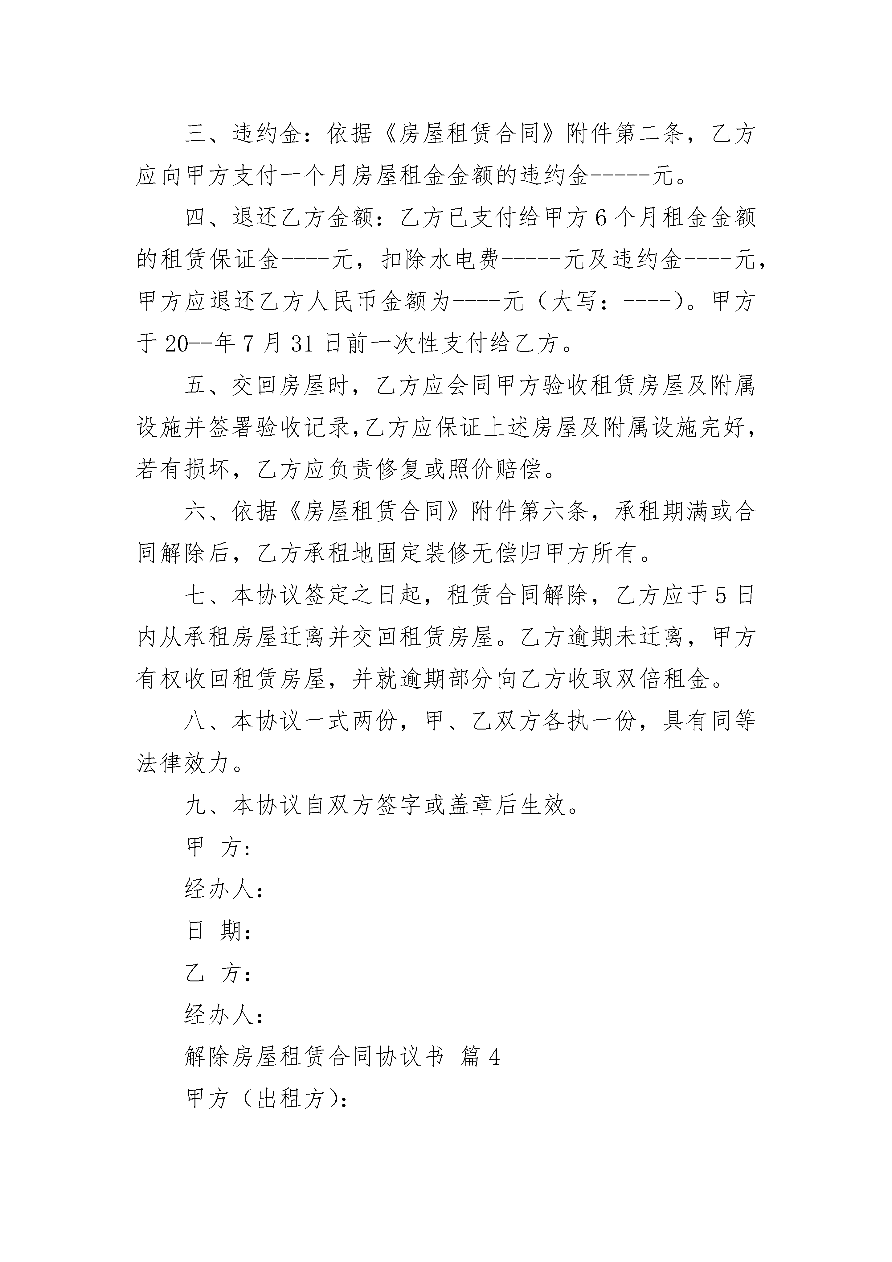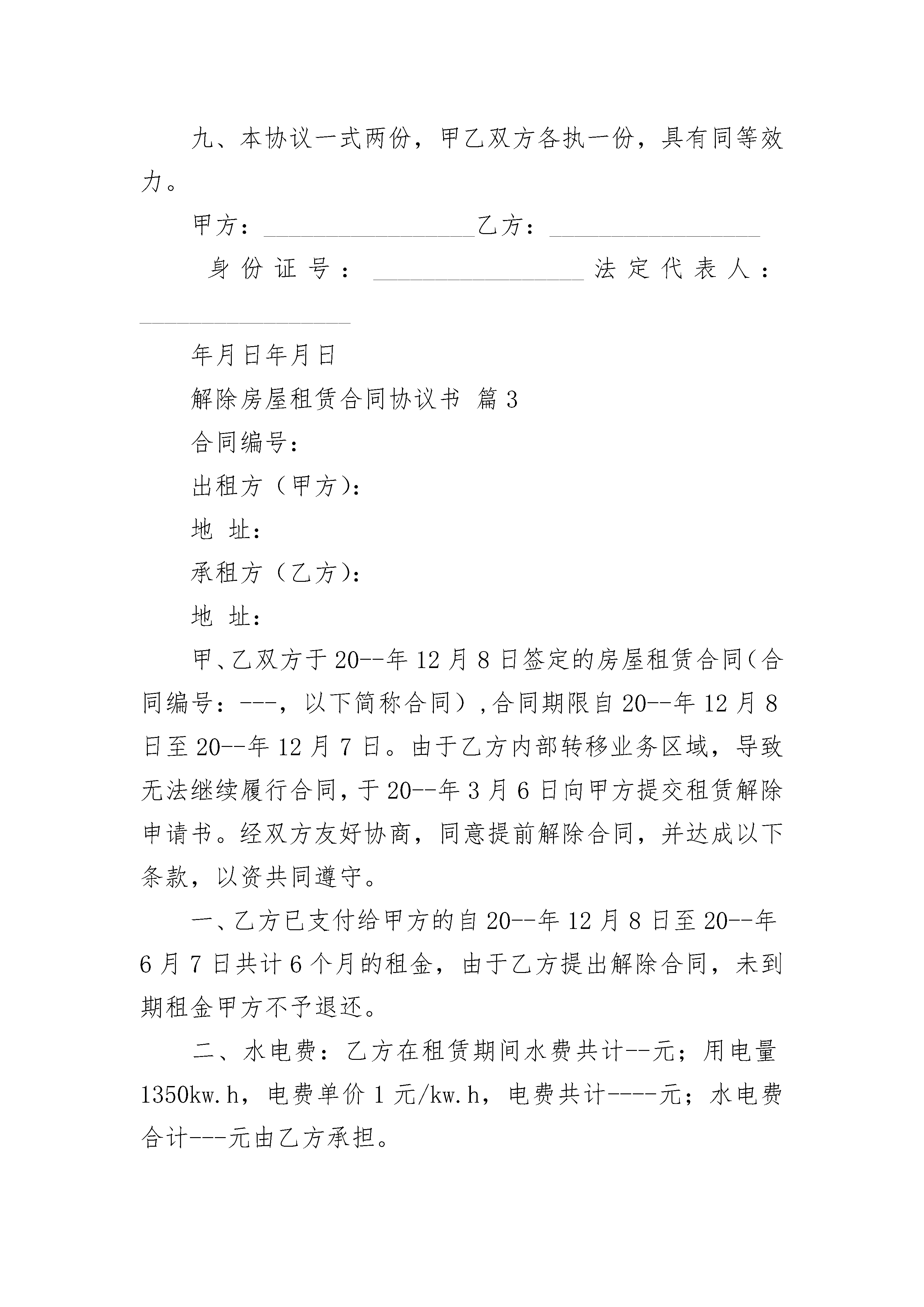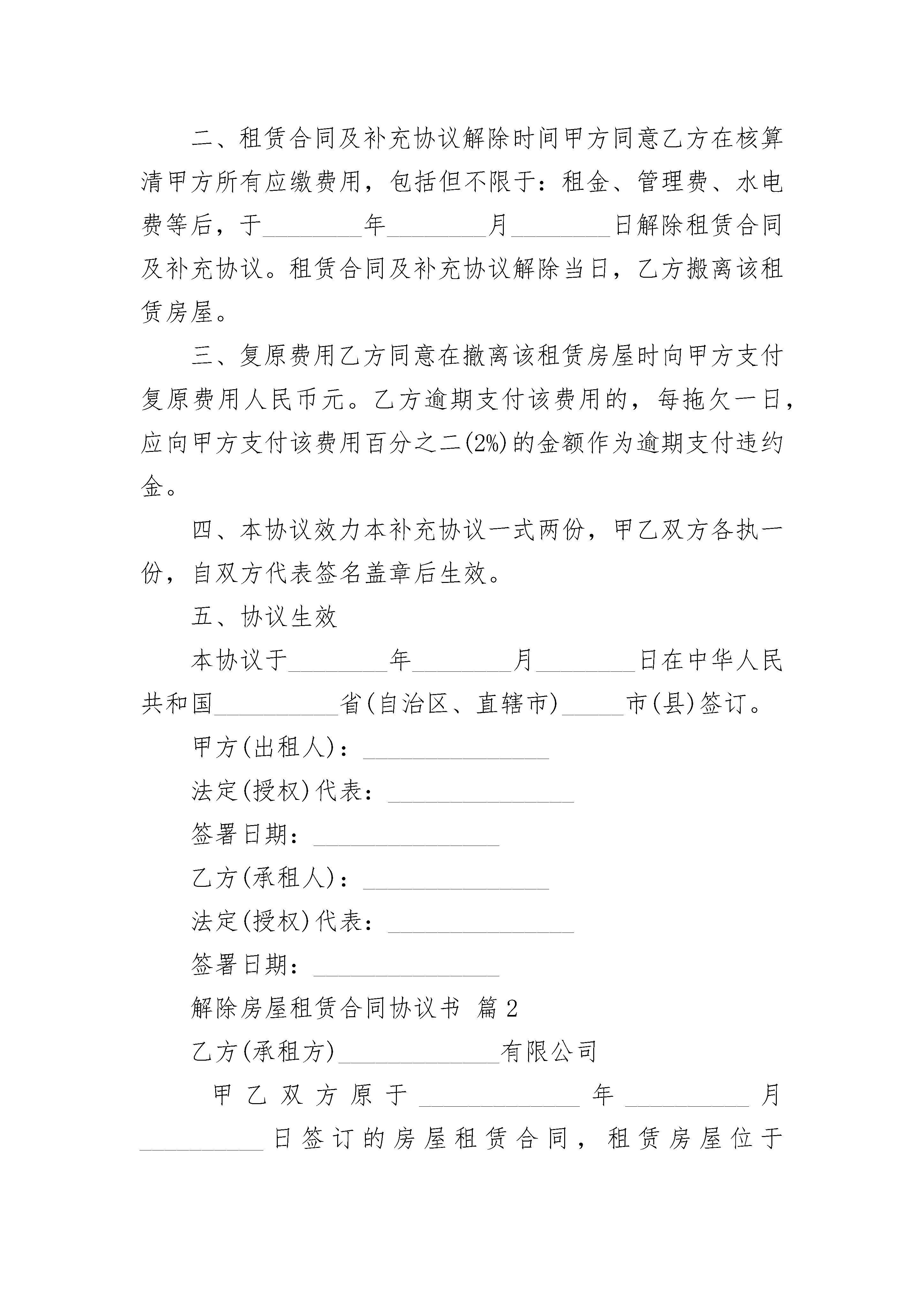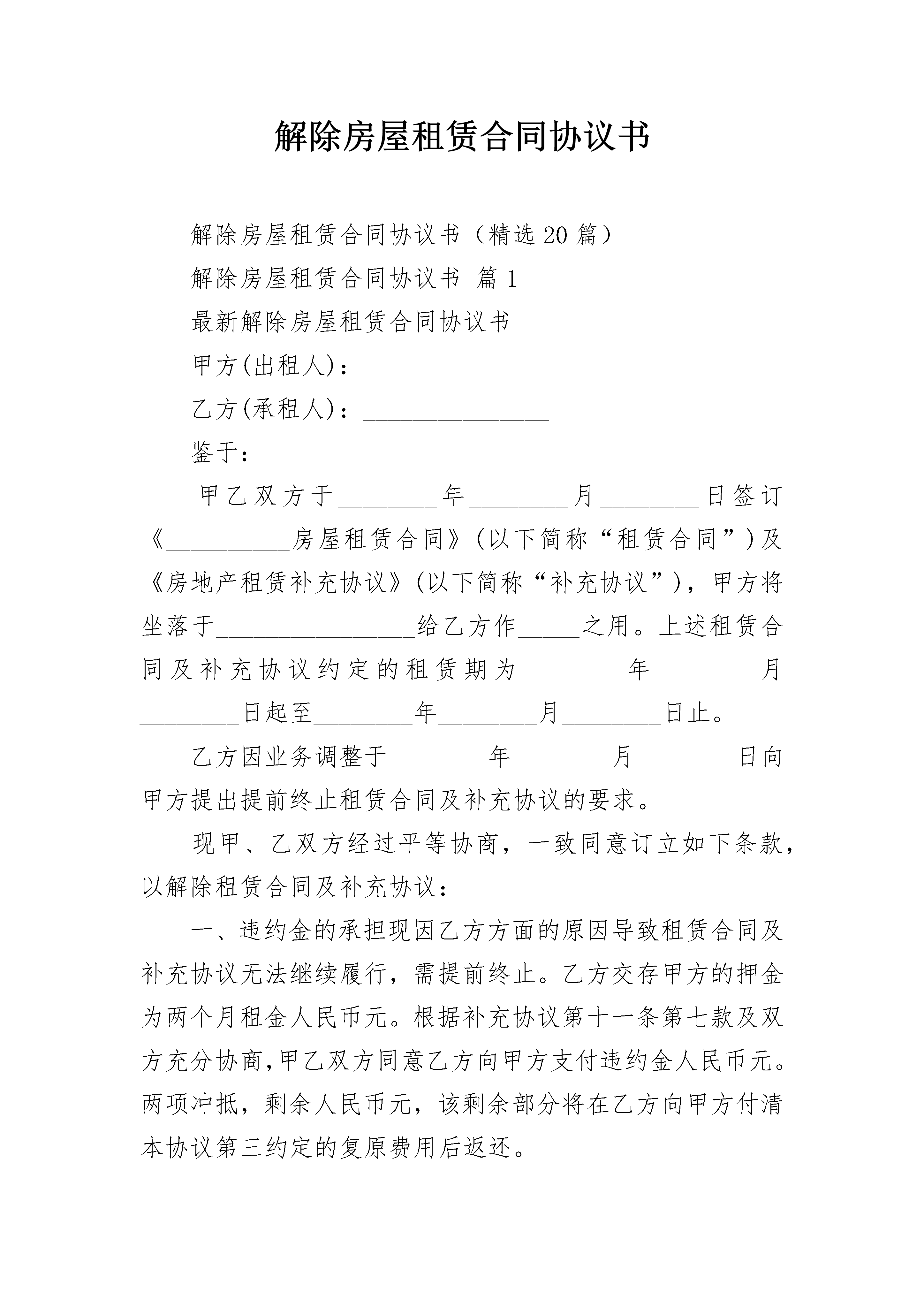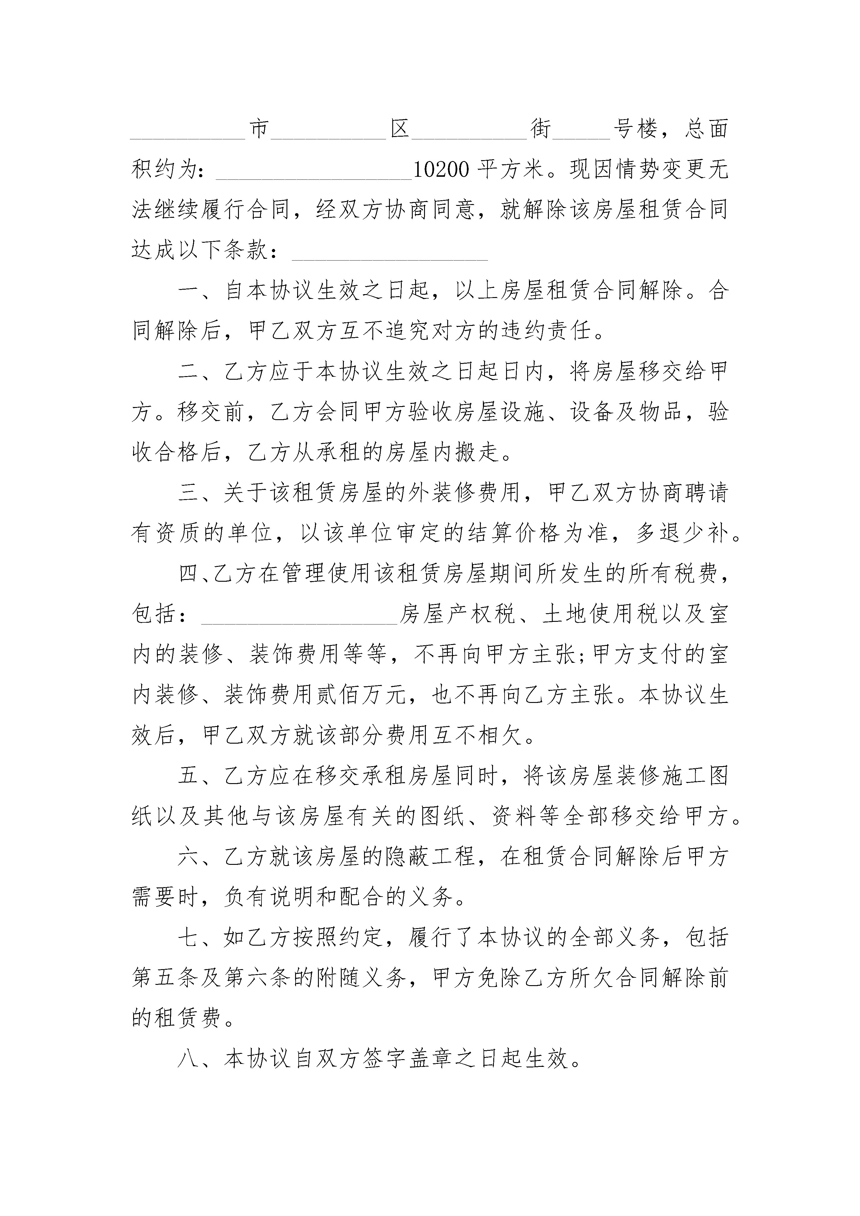 解除房屋租赁合同协议书解除房屋租赁合同协议书(精选20篇)解除房屋租赁合同协议书篇1最新解除房屋租赁合同协议书甲方(出租人):_______________乙方(承租人):_______________鉴于:甲乙双方于________年________月________日签订《__________房屋租赁合同》(以下简称“租赁合同”)及《房地产租赁补充协议》(以下简称“补充协议”),甲方将坐落于________________给乙方作_____之用。上述租赁合同及补充协议约定的租赁期为________年________月________日起至________年________月________日止。乙方因业务调整于________年________月________日向甲方提出提前终止租赁合同及补充协议的要求。现甲、乙双方经过平等协商,一致同意订立如下条款,以解除租赁合同及补充协议:一、违约金的承担现因乙方方面的原因导致租赁合同及补充协议无法继续履行,需提前终止。乙方交存甲方的押金为两个月租金人民币元。根据补充协议第十一条第七款及双方充分协商,甲乙双方同意乙方向甲方支付违约金人民币元。两项冲抵,剩余人民币元,该剩余部分将在乙方向甲方付清本协议第三约定的复原费用后返还。二、租赁合同及补充协议解除时间甲方同意乙方在核算清甲方所有应缴费用,包括但不限于:租金、管理费、水电费等后,于________年________月________日解除租赁合同及补充协议。租赁合同及补充协议解除当日,乙方搬离该租赁房屋。三、复原费用乙方同意在撤离该租赁房屋时向甲方支付复原费用人民币元。乙方逾期支付该费用的,每拖欠一日,应向甲方支付该费用百分之二(2%)的金额作为逾期支付违约金。四、本协议效力本补充协议一式两份,甲乙双方各执一份,自双方代表签名盖章后生效。五、协议生效本协议于________年________月________日在中华人民共和国__________省(自治区、直辖市)_____市(县)签订。甲方(出租人):_______________法定(授权)代表:_______________签署日期:_______________乙方(承租人):_______________法定(授权)代表:_______________签署日期:_______________解除房屋租赁合同协议书篇2乙方(承租方)_____________有限公司甲乙双方原于_____________年__________月__________日签订的房屋租赁合同,租赁房屋位于__________市__________区__________街_____号楼,总面积约为:_________________10200平方米。现因情势变更无法继续履行合同,经双方协商同意,就解除该房屋租赁合同达成以下条款:_________________一、自本协议生效之日起,以上房屋租赁合同解除。合同解除后,甲乙双方互不追究对方的违约责任。二、乙方应于本协议生效之日起日内,将房屋移交给甲方。移交前,乙方会同甲方验收房屋设施、设备及物品,验收合格后,乙方从承租的房屋内搬走。三、关于该租赁房屋的外装修费用,甲乙双方协商聘请有资质的单位,以该单位审定的结算价格为准,多退少补。四、乙方在管理使用该租赁房屋期间所发生的所有税费,包括:_________________房屋产权税、土地使用税以及室内的装修、装饰费用等等,不再向甲方主张;甲方支付的室内装修、装饰费用贰佰万元,也不再向乙方主张。本协议生效后,甲乙双方就该部分费用互不相欠。五、乙方应在移交承租房屋同时,将该房屋装修施工图纸以及其他与该房屋有关的图纸、资料等全部移交给甲方。六、乙方就该房屋的隐蔽工程,在租赁合同解除后甲方需要时,负有说明和配合的义务。七、如乙方按照约定,履行了本协议的全部义务,包括第五条及第六条的附随义务,甲方免除乙方所欠合同解除前的租赁费。八、本协议自双方签字盖章之日起生效。九、本协议一式两份,甲乙双方各执一份,具有同等效力。甲方:_________________乙方:_________________身份证号:_________________法定代表人:_________________年月日年月日解除房屋租赁合同协议书篇3合同编号:出租方(甲方):地址:承租方(乙方):地址:甲、乙双方于20--年12月8日签定的房屋租赁合同(合同编号:---,以下简称合同),合同期限自20--年12月8日至20--年12月7日。由于乙方内部转移业务区域,导致无法继续履行合同,于20--年3月6日向甲方提交租赁解除申请书。经双方友好协商,同意提前解除合同,并达成以下条款,以资共同遵守。一、乙方已支付给甲方的自20--年12月8日至2