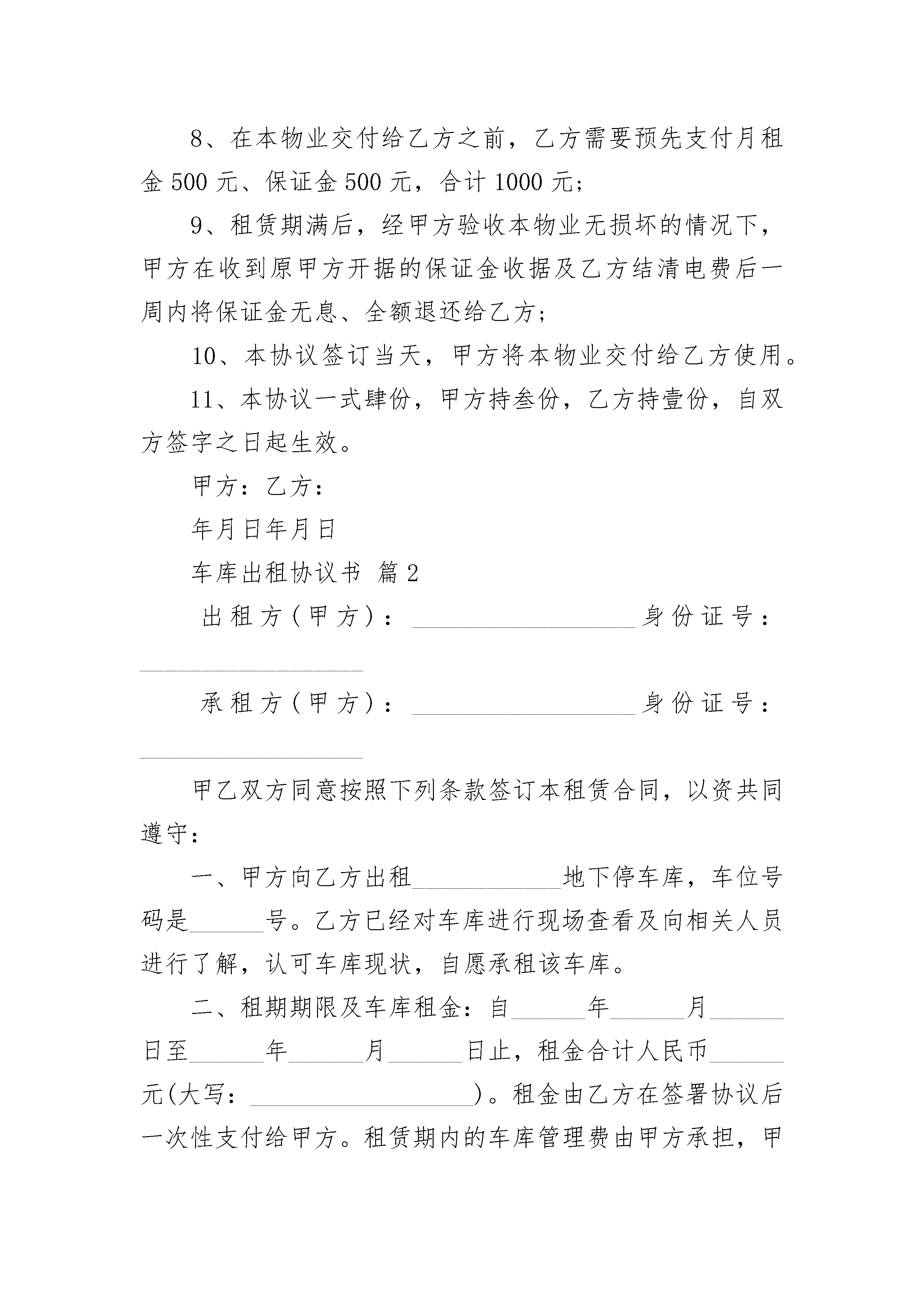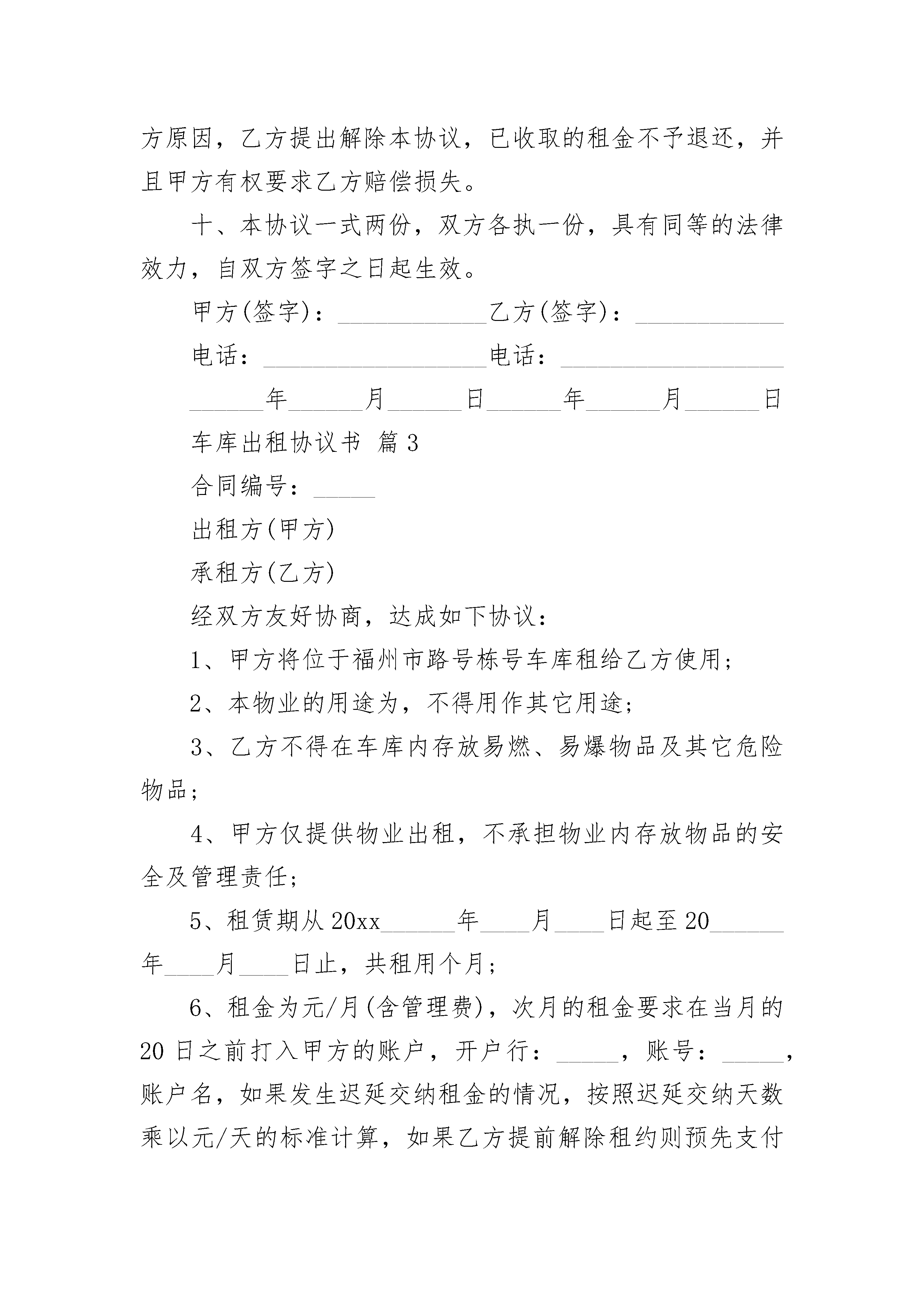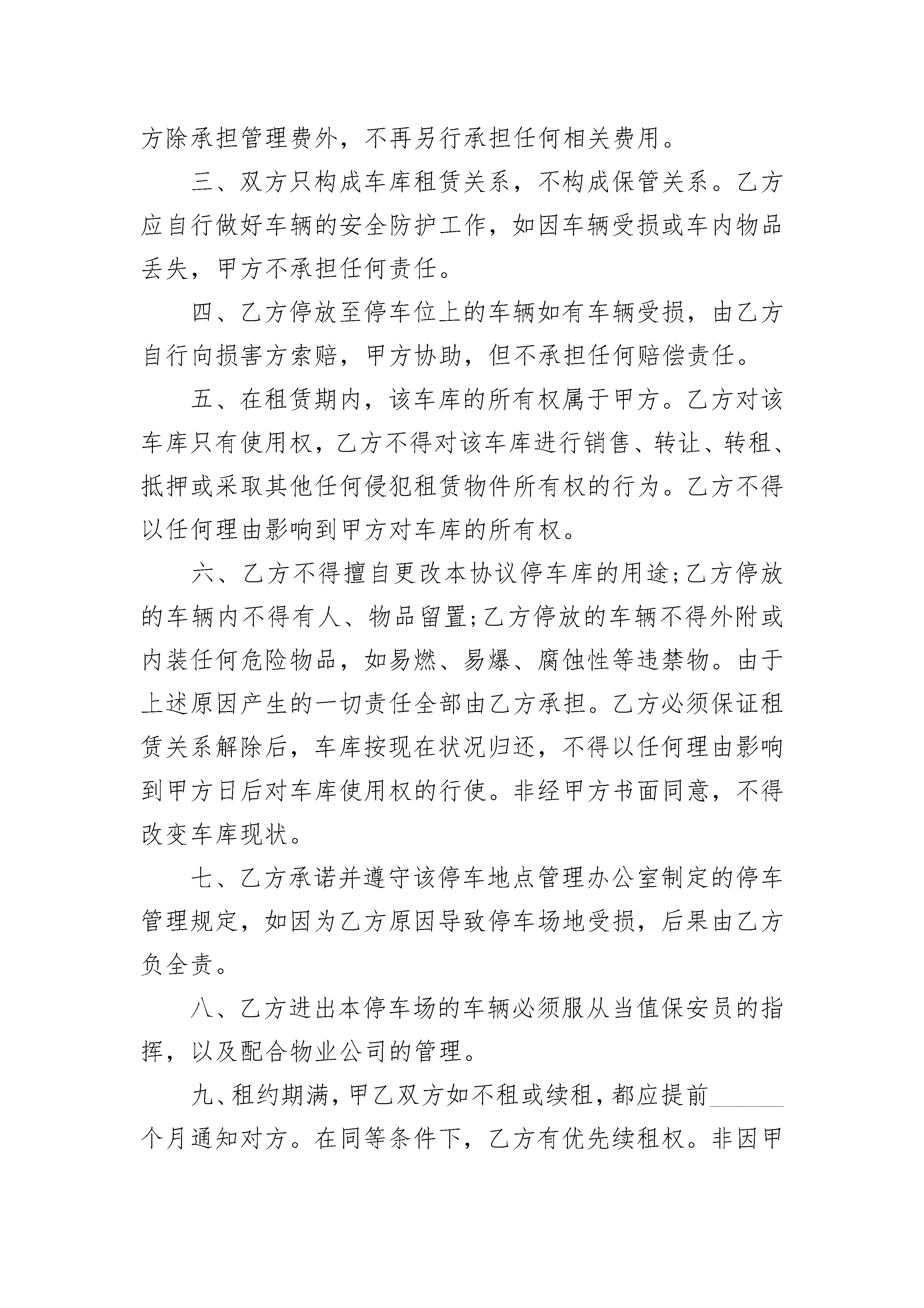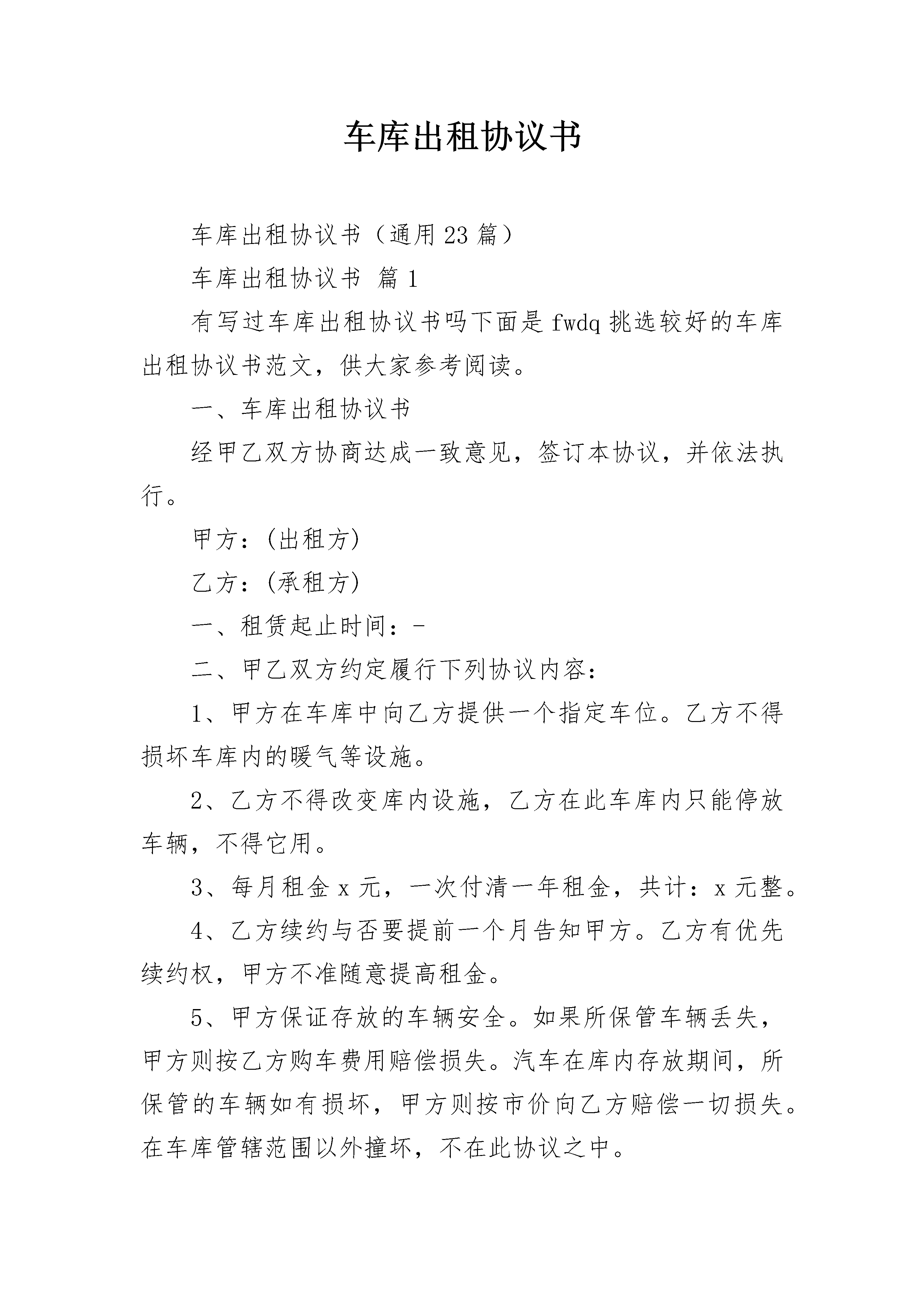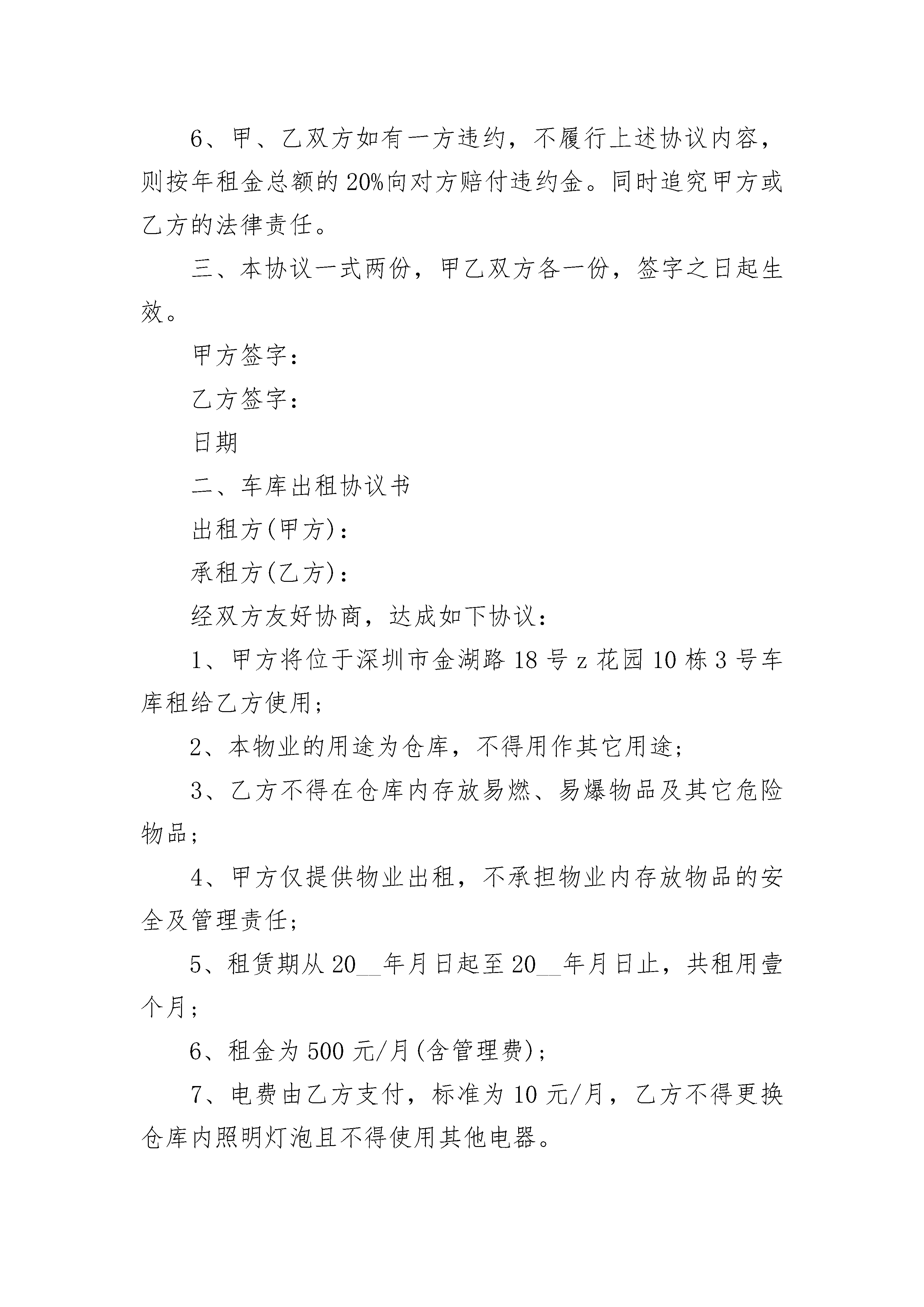 车库出租协议书车库出租协议书(通用23篇)车库出租协议书篇1有写过车库出租协议书吗下面是fwdq挑选较好的车库出租协议书范文,供大家参考阅读。一、车库出租协议书经甲乙双方协商达成一致意见,签订本协议,并依法执行。甲方:(出租方)乙方:(承租方)一、租赁起止时间:-二、甲乙双方约定履行下列协议内容:1、甲方在车库中向乙方提供一个指定车位。乙方不得损坏车库内的暖气等设施。2、乙方不得改变库内设施,乙方在此车库内只能停放车辆,不得它用。3、每月租金x元,一次付清一年租金,共计:x元整。4、乙方续约与否要提前一个月告知甲方。乙方有优先续约权,甲方不准随意提高租金。5、甲方保证存放的车辆安全。如果所保管车辆丢失,甲方则按乙方购车费用赔偿损失。汽车在库内存放期间,所保管的车辆如有损坏,甲方则按市价向乙方赔偿一切损失。在车库管辖范围以外撞坏,不在此协议之中。6、甲、乙双方如有一方违约,不履行上述协议内容,则按年租金总额的20%向对方赔付违约金。同时追究甲方或乙方的法律责任。三、本协议一式两份,甲乙双方各一份,签字之日起生效。甲方签字:乙方签字:日期二、车库出租协议书出租方(甲方):承租方(乙方):经双方友好协商,达成如下协议:1、甲方将位于深圳市金湖路18号z花园10栋3号车库租给乙方使用;2、本物业的用途为仓库,不得用作其它用途;3、乙方不得在仓库内存放易燃、易爆物品及其它危险物品;4、甲方仅提供物业出租,不承担物业内存放物品的安全及管理责任;5、租赁期从20__年月日起至20__年月日止,共租用壹个月;6、租金为500元/月(含管理费);7、电费由乙方支付,标准为10元/月,乙方不得更换仓库内照明灯泡且不得使用其他电器。8、在本物业交付给乙方之前,乙方需要预先支付月租金500元、保证金500元,合计1000元;9、租赁期满后,经甲方验收本物业无损坏的情况下,甲方在收到原甲方开据的保证金收据及乙方结清电费后一周内将保证金无息、全额退还给乙方;10、本协议签订当天,甲方将本物业交付给乙方使用。11、本协议一式肆份,甲方持叁份,乙方持壹份,自双方签字之日起生效。甲方:乙方:年月日年月日车库出租协议书篇2出租方(甲方):__________________身份证号:__________________承租方(甲方):__________________身份证号:__________________甲乙双方同意按照下列条款签订本租赁合同,以资共同遵守:一、甲方向乙方出租____________地下停车库,车位号码是______号。乙方已经对车库进行现场查看及向相关人员进行了解,认可车库现状,自愿承租该车库。二、租期期限及车库租金:自______年______月______日至______年______月______日止,租金合计人民币______元(大写:__________________)。租金由乙方在签署协议后一次性支付给甲方。租赁期内的车库管理费由甲方承担,甲方除承担管理费外,不再另行承担任何相关费用。三、双方只构成车库租赁关系,不构成保管关系。乙方应自行做好车辆的安全防护工作,如因车辆受损或车内物品丢失,甲方不承担任何责任。四、乙方停放至停车位上的车辆如有车辆受损,由乙方自行向损害方索赔,甲方协助,但不承担任何赔偿责任。五、在租赁期内,该车库的所有权属于甲方。乙方对该车库只有使用权,乙方不得对该车库进行销售、转让、转租、抵押或采取其他任何侵犯租赁物件所有权的行为。乙方不得以任何理由影响到甲方对车库的所有权。六、乙方不得擅自更改本协议停车库的用途;乙方停放的车辆内不得有人、物品留置;乙方停放的车辆不得外附或内装任何危险物品,如易燃、易爆、腐蚀性等违禁物。由于上述原因产生的一切责任全部由乙方承担。乙方必须保证租赁关系解除后,车库按现在状况归还,不得以任何理由影响到甲方日后对车库使用权的行使。非经甲方书面同意,不得改变车库现状。七、乙方承诺并遵守该停车地点管理办公室制定的停车管理规定,如因为乙方原因导致停车场地受损,后果由乙方负全责。八、乙方进出本停车场的车辆必须服从当值保安员的指挥,以及配合物业公司的管理。九、租约期满,甲乙双方如不租或续租,都应提前______个月通知对方。在同等条件下,乙方有优先续租权。非因甲方原因,乙方提出解除本协议,已收取的租金不予退还,并且甲方有权要求乙方赔偿损失。十、本协议一式两份,双方各执一份,具有同等的法律效力,自双方签字之日起生效。甲方(签字):____________乙方(签字):____________电话:__________________电话:________________________年______月______日______年______月______日车库出租协议书篇3合同编号:__