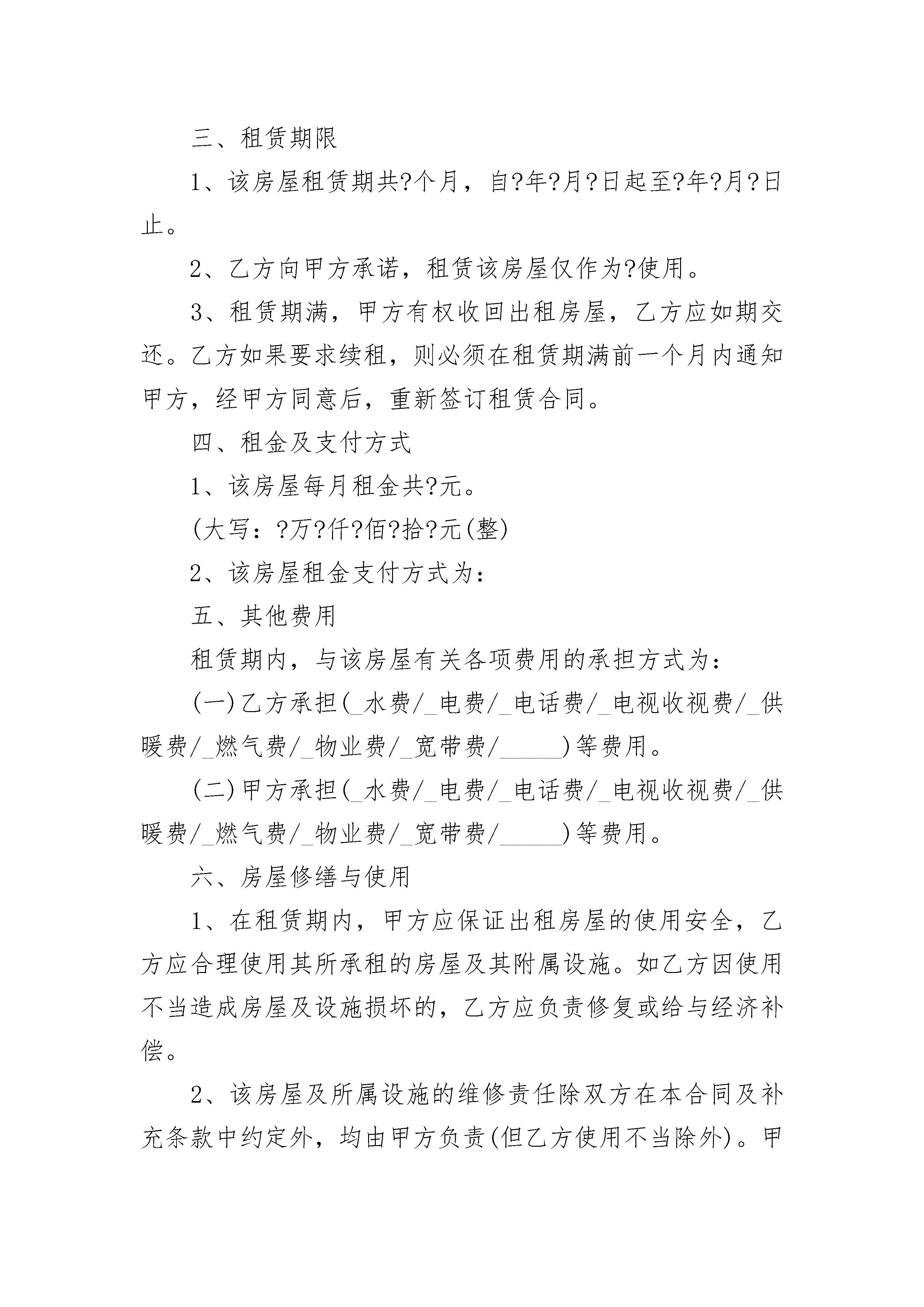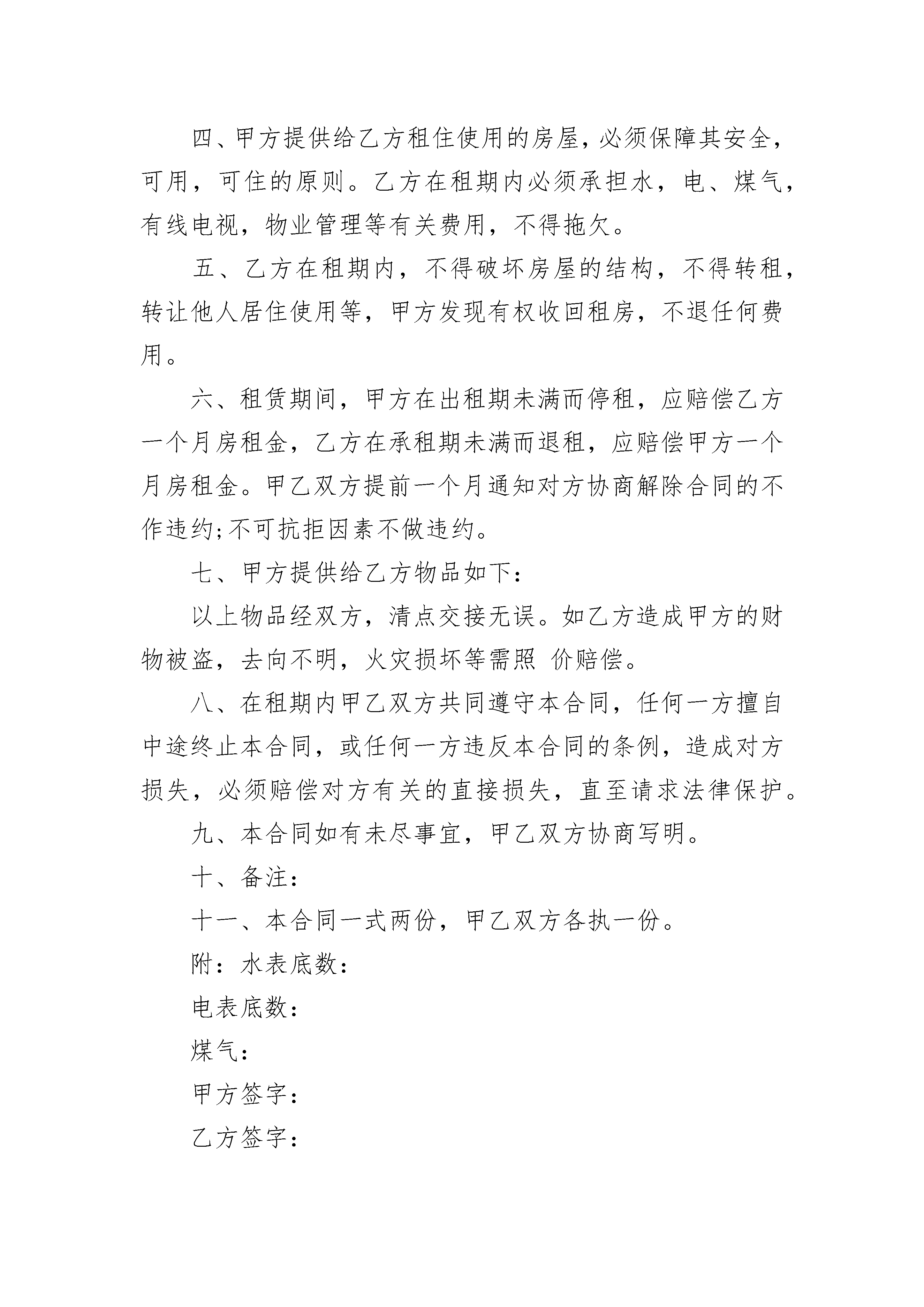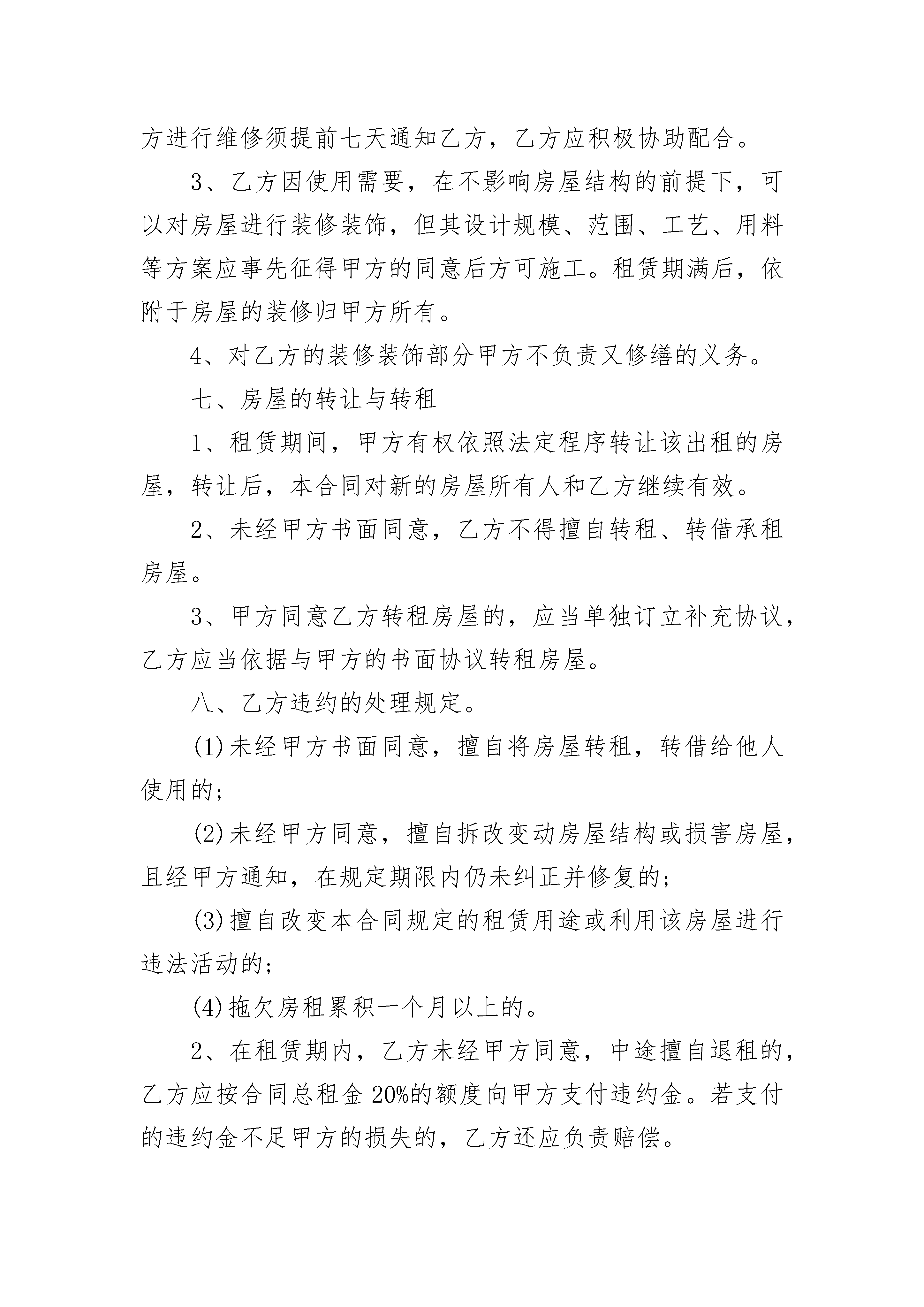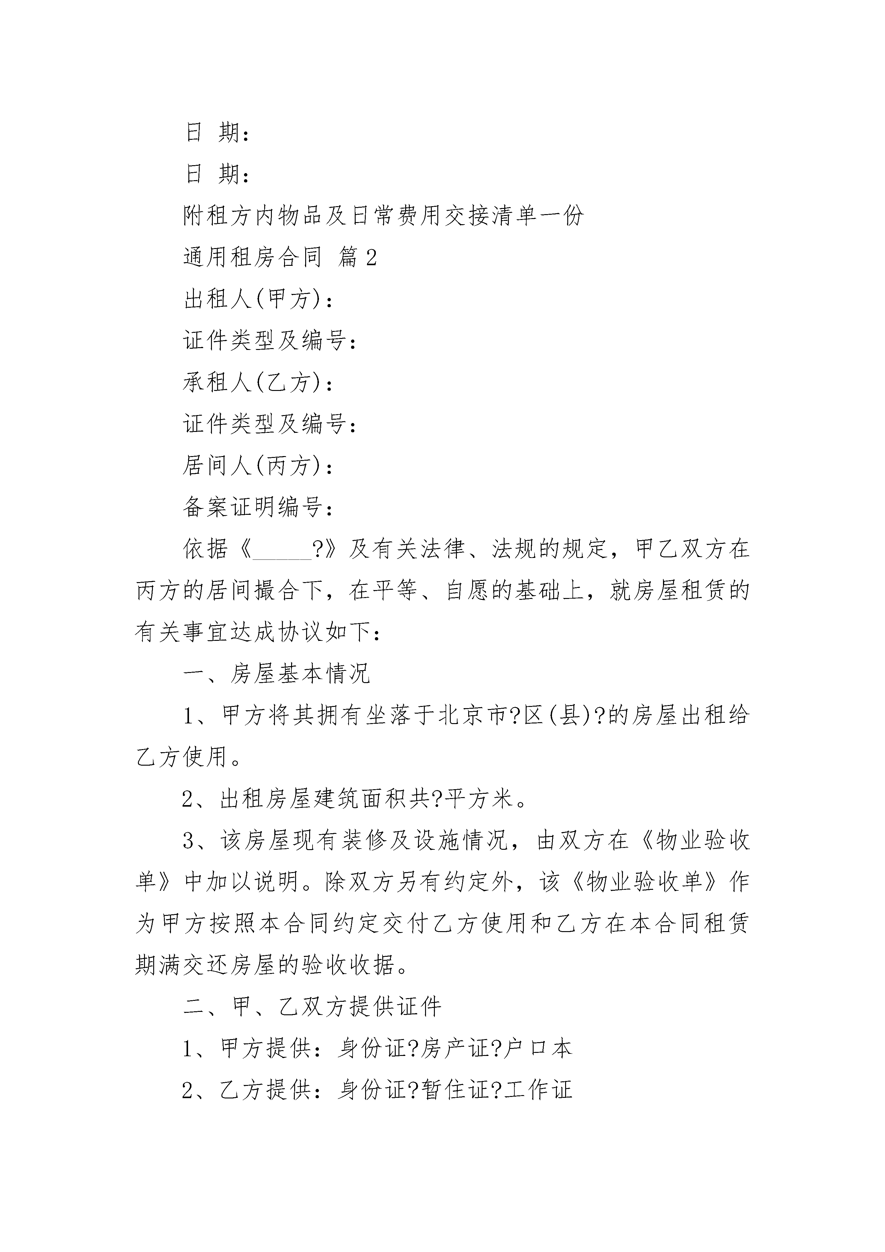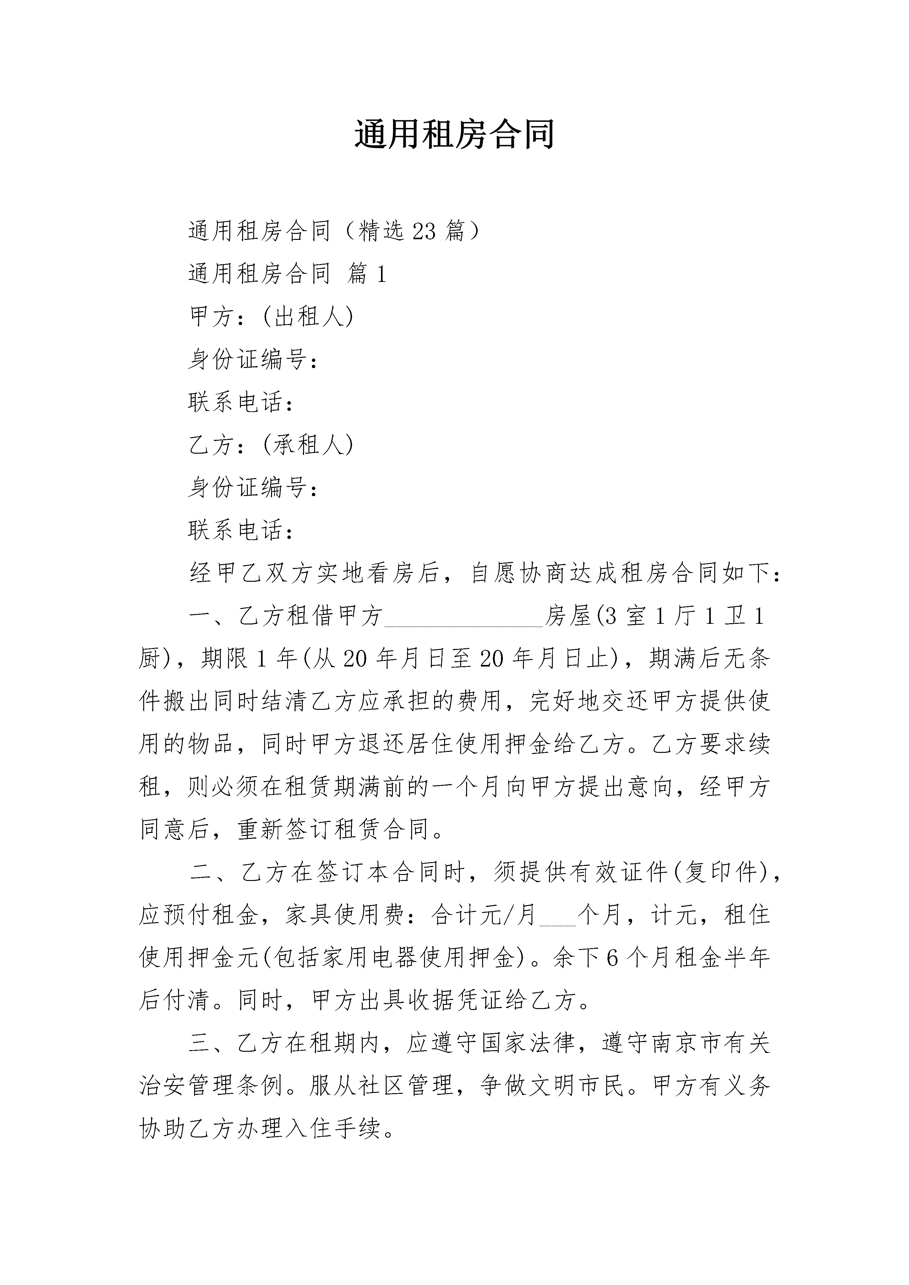 通用租房合同通用租房合同(精选23篇)通用租房合同篇1甲方:(出租人)身份证编号:联系电话:乙方:(承租人)身份证编号:联系电话:经甲乙双方实地看房后,自愿协商达成租房合同如下:一、乙方租借甲方_____________房屋(3室1厅1卫1厨),期限1年(从20年月日至20年月日止),期满后无条件搬出同时结清乙方应承担的费用,完好地交还甲方提供使用的物品,同时甲方退还居住使用押金给乙方。乙方要求续租,则必须在租赁期满前的一个月向甲方提出意向,经甲方同意后,重新签订租赁合同。二、乙方在签订本合同时,须提供有效证件(复印件),应预付租金,家具使用费:合计元/月___个月,计元,租住使用押金元(包括家用电器使用押金)。余下6个月租金半年后付清。同时,甲方出具收据凭证给乙方。三、乙方在租期内,应遵守国家法律,遵守南京市有关治安管理条例。服从社区管理,争做文明市民。甲方有义务协助乙方办理入住手续。四、甲方提供给乙方租住使用的房屋,必须保障其安全,可用,可住的原则。乙方在租期内必须承担水,电、煤气,有线电视,物业管理等有关费用,不得拖欠。五、乙方在租期内,不得破坏房屋的结构,不得转租,转让他人居住使用等,甲方发现有权收回租房,不退任何费用。六、租赁期间,甲方在出租期未满而停租,应赔偿乙方一个月房租金,乙方在承租期未满而退租,应赔偿甲方一个月房租金。甲乙双方提前一个月通知对方协商解除合同的不作违约;不可抗拒因素不做违约。七、甲方提供给乙方物品如下:以上物品经双方,清点交接无误。如乙方造成甲方的财物被盗,去向不明,火灾损坏等需照价赔偿。八、在租期内甲乙双方共同遵守本合同,任何一方擅自中途终止本合同,或任何一方违反本合同的条例,造成对方损失,必须赔偿对方有关的直接损失,直至请求法律保护。九、本合同如有未尽事宜,甲乙双方协商写明。十、备注:十一、本合同一式两份,甲乙双方各执一份。附:水表底数:电表底数:煤气:甲方签字:乙方签字:日期:日期:附租方内物品及日常费用交接清单一份通用租房合同篇2出租人(甲方):证件类型及编号:承租人(乙方):证件类型及编号:居间人(丙方):备案证明编号:依据《_____?》及有关法律、法规的规定,甲乙双方在丙方的居间撮合下,在平等、自愿的基础上,就房屋租赁的有关事宜达成协议如下:一、房屋基本情况1、甲方将其拥有坐落于北京市?区(县)?的房屋出租给乙方使用。2、出租房屋建筑面积共?平方米。3、该房屋现有装修及设施情况,由双方在《物业验收单》中加以说明。除双方另有约定外,该《物业验收单》作为甲方按照本合同约定交付乙方使用和乙方在本合同租赁期满交还房屋的验收收据。二、甲、乙双方提供证件1、甲方提供:身份证?房产证?户口本2、乙方提供:身份证?暂住证?工作证三、租赁期限1、该房屋租赁期共?个月,自?年?月?日起至?年?月?日止。2、乙方向甲方承诺,租赁该房屋仅作为?使用。3、租赁期满,甲方有权收回出租房屋,乙方应如期交还。乙方如果要求续租,则必须在租赁期满前一个月内通知甲方,经甲方同意后,重新签订租赁合同。四、租金及支付方式1、该房屋每月租金共?元。(大写:?万?仟?佰?拾?元(整)2、该房屋租金支付方式为:五、其他费用租赁期内,与该房屋有关各项费用的承担方式为:(一)乙方承担(_水费/_电费/_电话费/_电视收视费/_供暖费/_燃气费/_物业费/_宽带费/_____)等费用。(二)甲方承担(_水费/_电费/_电话费/_电视收视费/_供暖费/_燃气费/_物业费/_宽带费/_____)等费用。六、房屋修缮与使用1、在租赁期内,甲方应保证出租房屋的使用安全,乙方应合理使用其所承租的房屋及其附属设施。如乙方因使用不当造成房屋及设施损坏的,乙方应负责修复或给与经济补偿。2、该房屋及所属设施的维修责任除双方在本合同及补充条款中约定外,均由甲方负责(但乙方使用不当除外)。甲方进行维修须提前七天通知乙方,乙方应积极协助配合。3、乙方因使用需要,在不影响房屋结构的前提下,可以对房屋进行装修装饰,但其设计规模、范围、工艺、用料等方案应事先征得甲方的同意后方可施工。租赁期满后,依附于房屋的装修归甲方所有。4、对乙方的装修装饰部分甲方不负责又修缮的义务。七、房屋的转让与转租1、租赁期间,甲方有权依照法定程序转让该出租的房屋,转让后,本合同对新的房屋所有人和乙方继续有效。2、未经甲方书面同意,乙方不得擅自转租、转借承租房屋。3、甲方同意乙方转租房屋的,应当单独订立补充协议,乙方应当依据与甲方的书面协议转租房屋。八、乙方违约的处理规定。(1)未经甲方书面同意,擅自将房屋转租,转借给他人使用的;(2)未经甲方同意,擅自拆改变动房屋结构或损害房屋,且经甲方通知,在规定期限内仍未纠正并修复的;(3)擅自改变本合同规定的租赁用途或利用该房屋进行违法活动的;