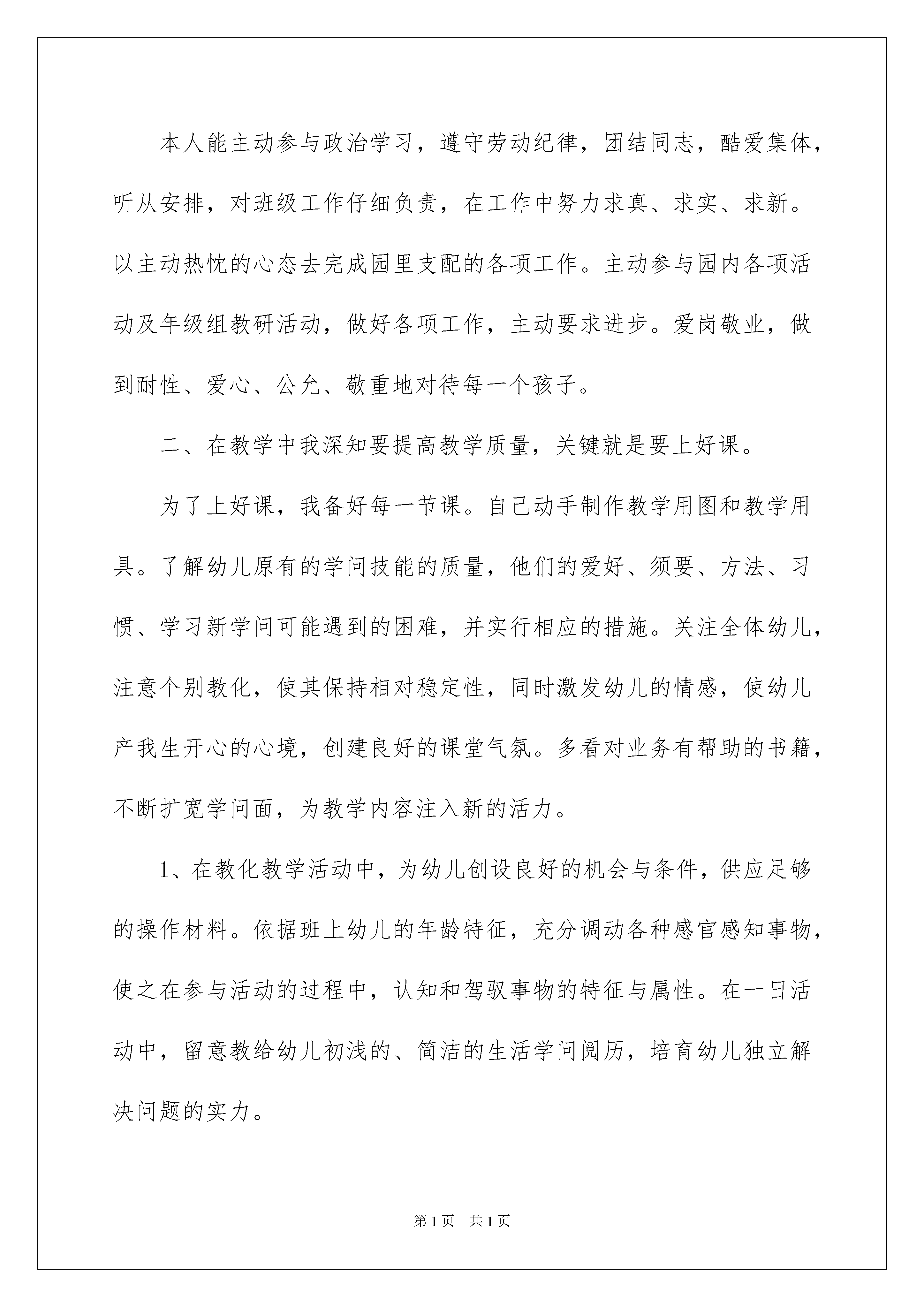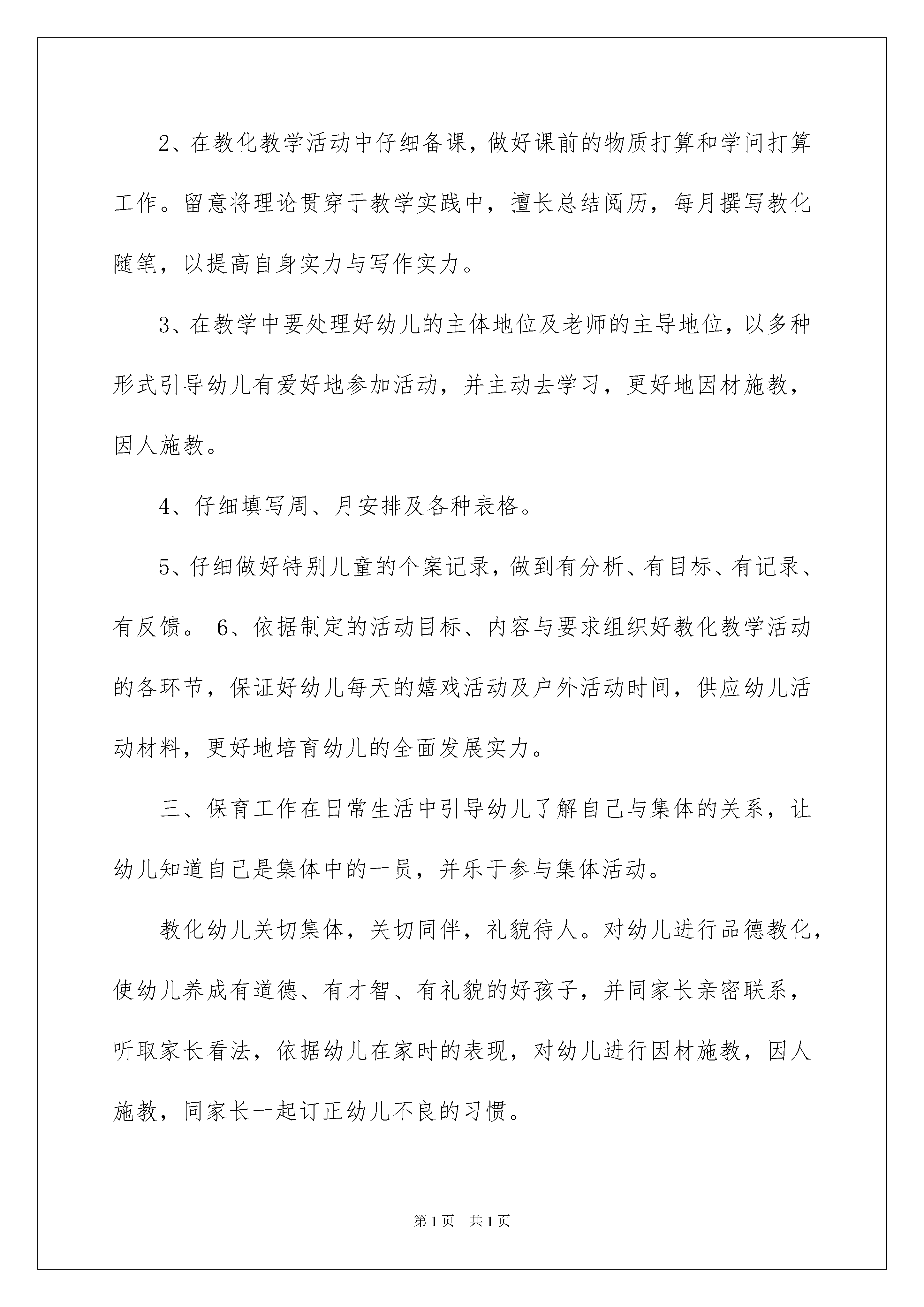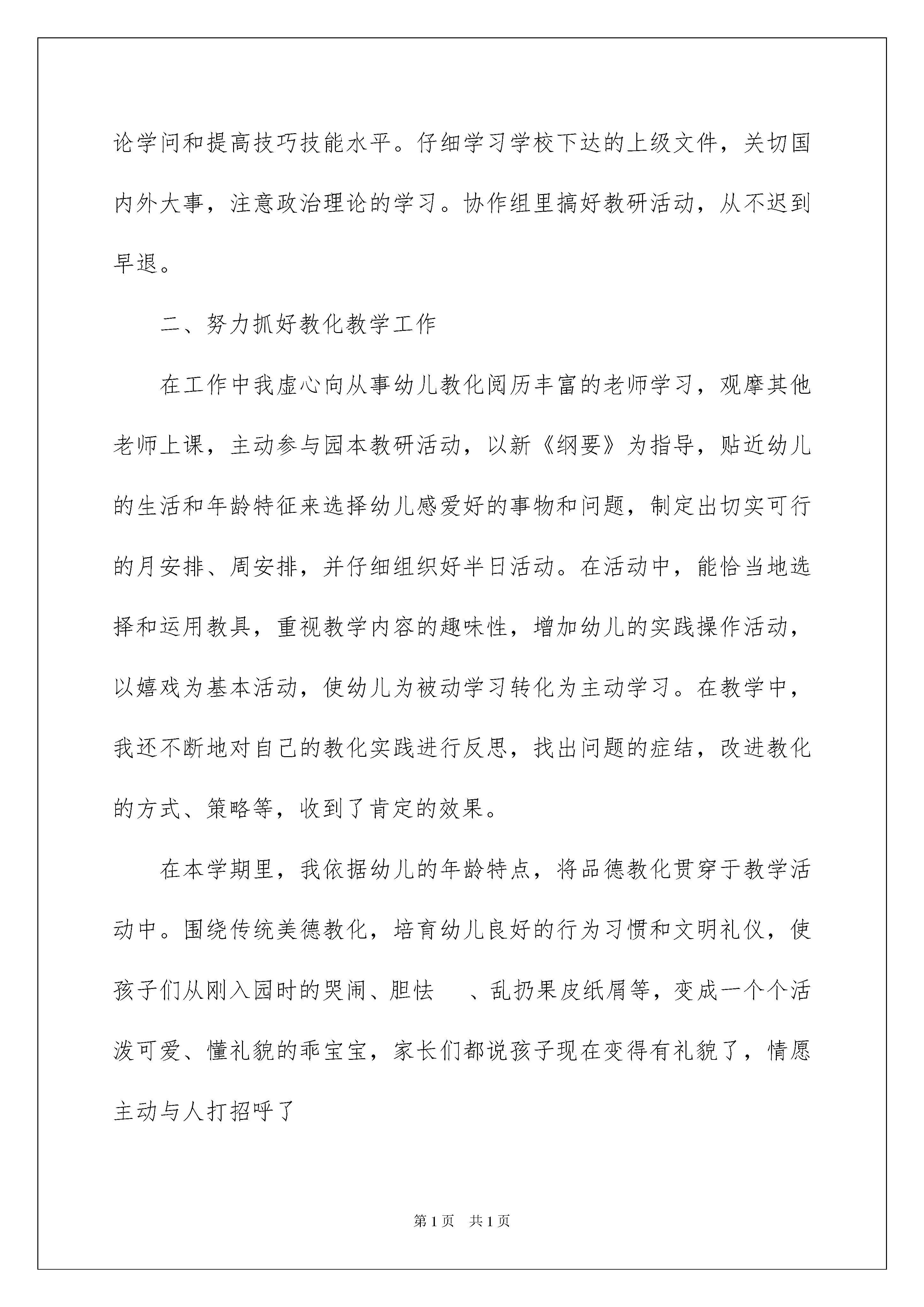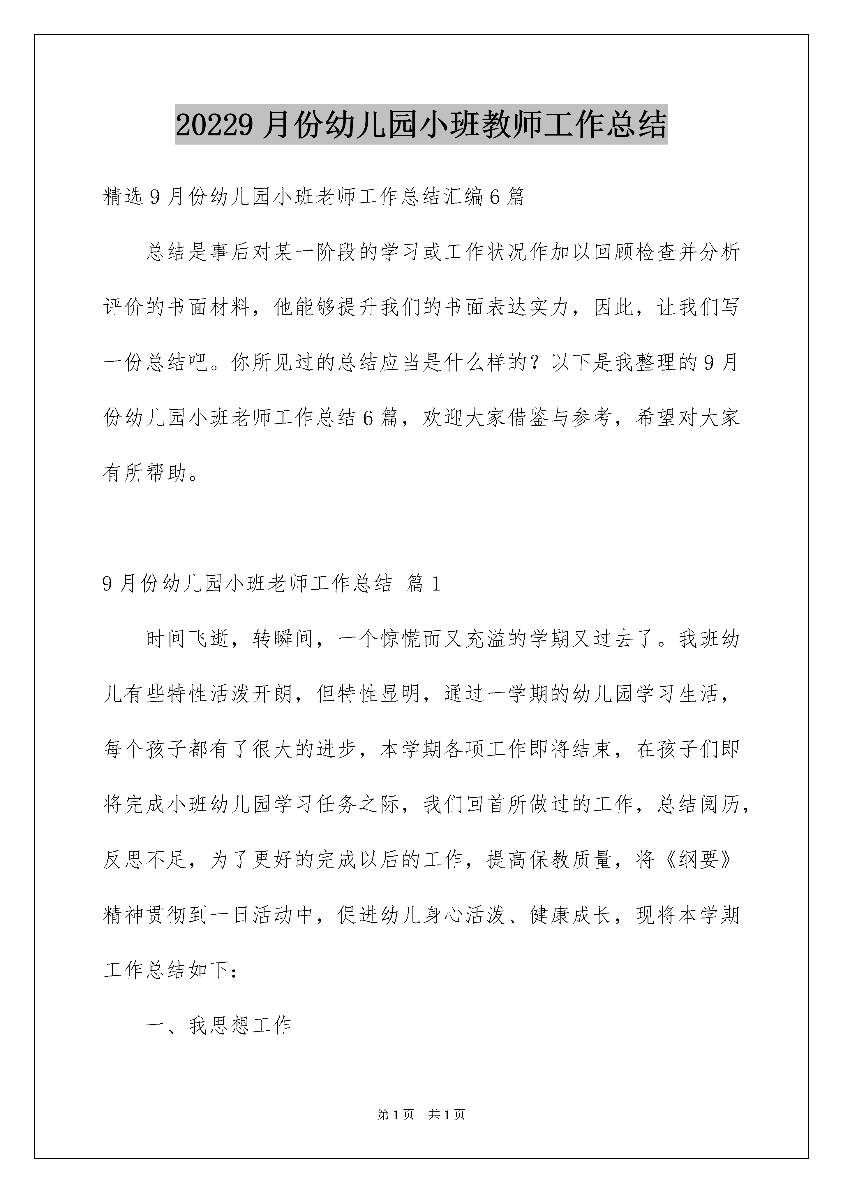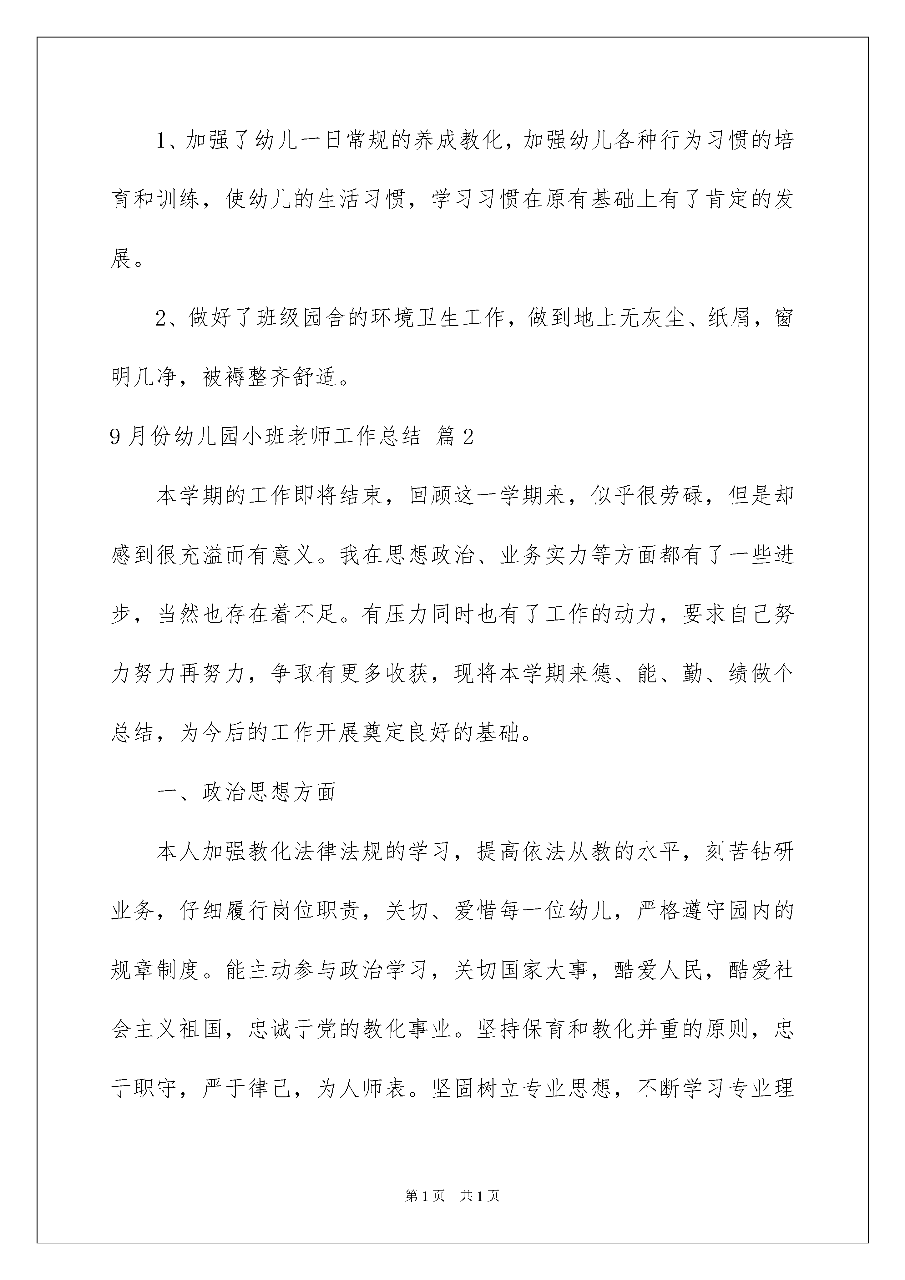 20229月份幼儿园小班教师工作总结精选9月份幼儿园小班老师工作总结汇编6篇总结是事后对某一阶段的学习或工作状况作加以回顾检查并分析评价的书面材料,他能够提升我们的书面表达实力,因此,让我们写一份总结吧。你所见过的总结应当是什么样的?以下是我整理的9月份幼儿园小班老师工作总结6篇,欢迎大家借鉴与参考,希望对大家有所帮助。9月份幼儿园小班老师工作总结篇1时间飞逝,转瞬间,一个惊慌而又充溢的学期又过去了。我班幼儿有些特性活泼开朗,但特性显明,通过一学期的幼儿园学习生活,每个孩子都有了很大的进步,本学期各项工作即将结束,在孩子们即将完成小班幼儿园学习任务之际,我们回首所做过的工作,总结阅历,反思不足,为了更好的完成以后的工作,提高保教质量,将《纲要》精神贯彻到一日活动中,促进幼儿身心活泼、健康成长,现将本学期工作总结如下:一、我思想工作本人能主动参与政治学习,遵守劳动纪律,团结同志,酷爱集体,听从安排,对班级工作仔细负责,在工作中努力求真、求实、求新。以主动热忱的心态去完成园里支配的各项工作。主动参与园内各项活动及年级组教研活动,做好各项工作,主动要求进步。爱岗敬业,做到耐性、爱心、公允、敬重地对待每一个孩子。二、在教学中我深知要提高教学质量,关键就是要上好课。为了上好课,我备好每一节课。自己动手制作教学用图和教学用具。了解幼儿原有的学问技能的质量,他们的爱好、须要、方法、习惯、学习新学问可能遇到的困难,并实行相应的措施。关注全体幼儿,注意个别教化,使其保持相对稳定性,同时激发幼儿的情感,使幼儿产我生开心的心境,创建良好的课堂气氛。多看对业务有帮助的书籍,不断扩宽学问面,为教学内容注入新的活力。1、在教化教学活动中,为幼儿创设良好的机会与条件,供应足够的操作材料。依据班上幼儿的年龄特征,充分调动各种感官感知事物,使之在参与活动的过程中,认知和驾驭事物的特征与属性。在一日活动中,留意教给幼儿初浅的、简洁的生活学问阅历,培育幼儿独立解决问题的实力。2、在教化教学活动中仔细备课,做好课前的物质打算和学问打算工作。留意将理论贯穿于教学实践中,擅长总结阅历,每月撰写教化随笔,以提高自身实力与写作实力。3、在教学中要处理好幼儿的主体地位及老师的主导地位,以多种形式引导幼儿有爱好地参加活动,并主动去学习,更好地因材施教,因人施教。4、仔细填写周、月安排及各种表格。5、仔细做好特别儿童的个案记录,做到有分析、有目标、有记录、有反馈。6、依据制定的活动目标、内容与要求组织好教化教学活动的各环节,保证好幼儿每天的嬉戏活动及户外活动时间,供应幼儿活动材料,更好地培育幼儿的全面发展实力。三、保育工作在日常生活中引导幼儿了解自己与集体的关系,让幼儿知道自己是集体中的一员,并乐于参与集体活动。教化幼儿关切集体,关切同伴,礼貌待人。对幼儿进行品德教化,使幼儿养成有道德、有才智、有礼貌的好孩子,并同家长亲密联系,听取家长看法,依据幼儿在家时的表现,对幼儿进行因材施教,因人施教,同家长一起订正幼儿不良的习惯。1、加强了幼儿一日常规的养成教化,加强幼儿各种行为习惯的培育和训练,使幼儿的生活习惯,学习习惯在原有基础上有了肯定的发展。2、做好了班级园舍的环境卫生工作,做到地上无灰尘、纸屑,窗明几净,被褥整齐舒适。9月份幼儿园小班老师工作总结篇2本学期的工作即将结束,回顾这一学期来,似乎很劳碌,但是却感到很充溢而有意义。我在思想政治、业务实力等方面都有了一些进步,当然也存在着不足。有压力同时也有了工作的动力,要求自己努力努力再努力,争取有更多收获,现将本学期来德、能、勤、绩做个总结,为今后的工作开展奠定良好的基础。一、政治思想方面本人加强教化法律法规的学习,提高依法从教的水平,刻苦钻研业务,仔细履行岗位职责,关切、爱惜每一位幼儿,严格遵守园内的规章制度。能主动参与政治学习,关切国家大事,酷爱人民,酷爱社会主义祖国,忠诚于党的教化事业。坚持保育和教化并重的原则,忠于职守,严于律己,为人师表。坚固树立专业思想,不断学习专业理论学问和提高技巧技能水平。仔细学习学校下达的上级文件,关切国内外大事,注意政治理论的学习。协作组里搞好教研活动,从不迟到早退。二、努力抓好教化教学工作在工作中我虚心向从事幼儿教化阅历丰富的老师学习,观摩其他老师上课,主动参与园本教研活动,以新《纲要》为指导,贴近幼儿的生活和年龄特征来选择幼儿感爱好的事物和问题,制定出切实可行的月安排、周安排,并仔细组织好半日活动。在活动中,能恰当地选择和运用教具,重视教学内容的趣味性,增加幼儿的实践操作活动,以嬉戏为基本活动,使幼儿为被动学习转化为主动学习。在教学中,我