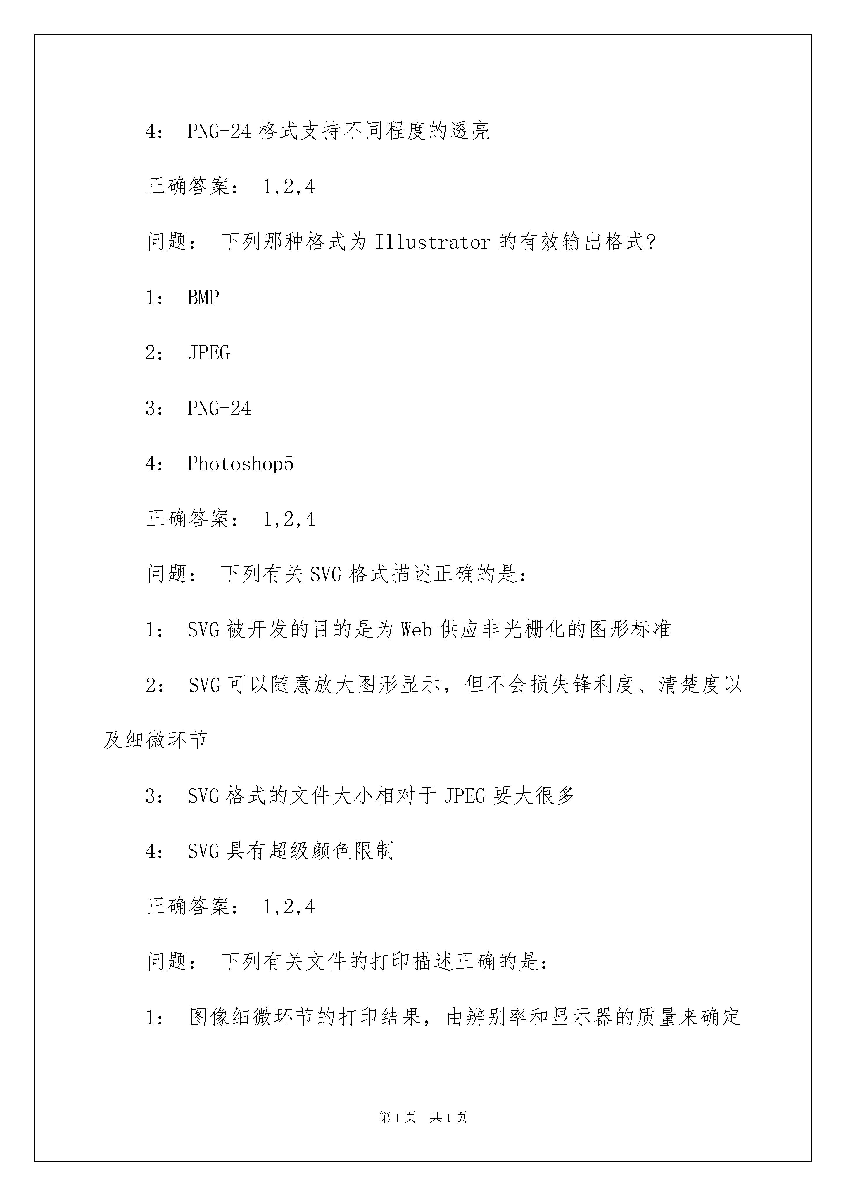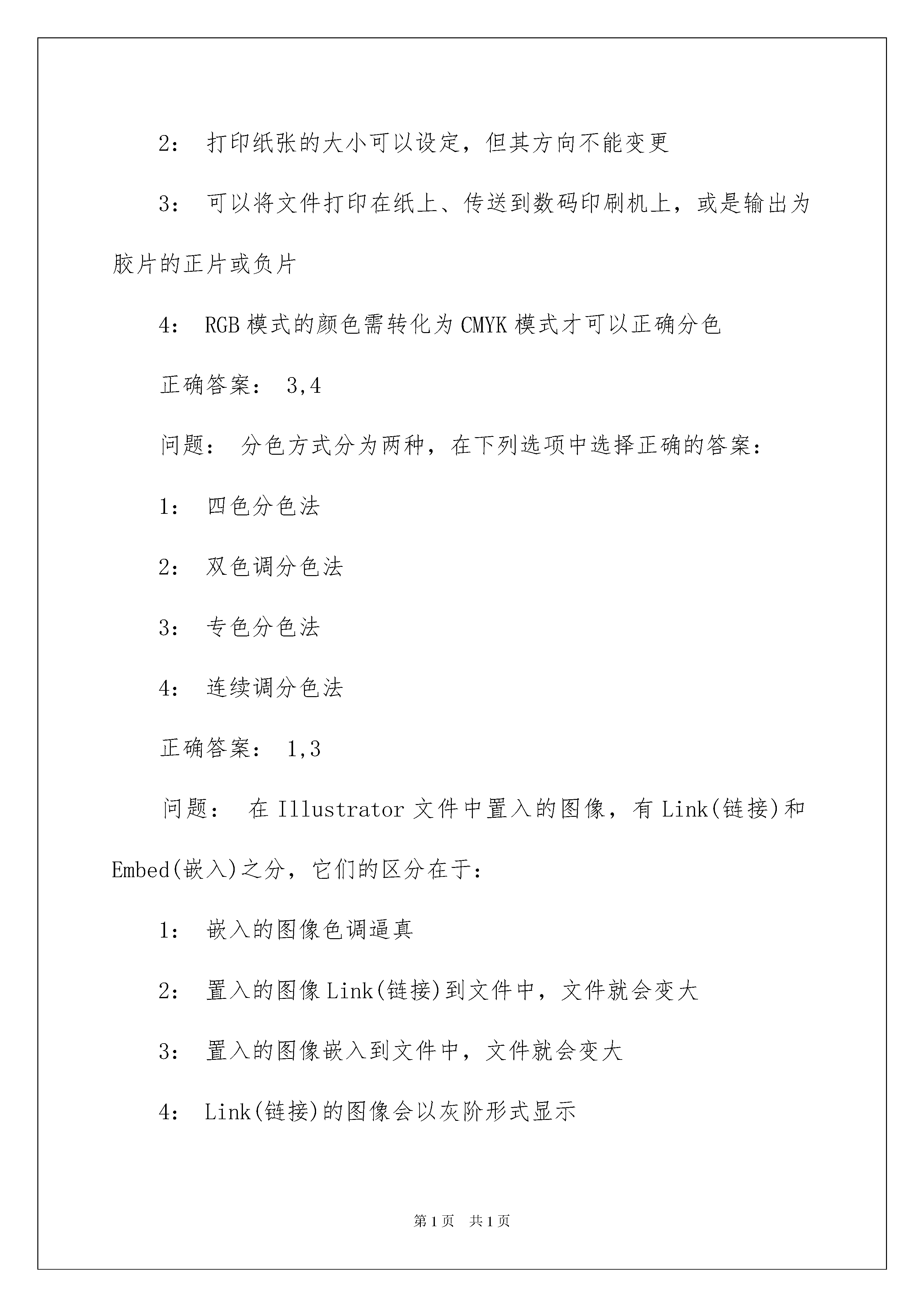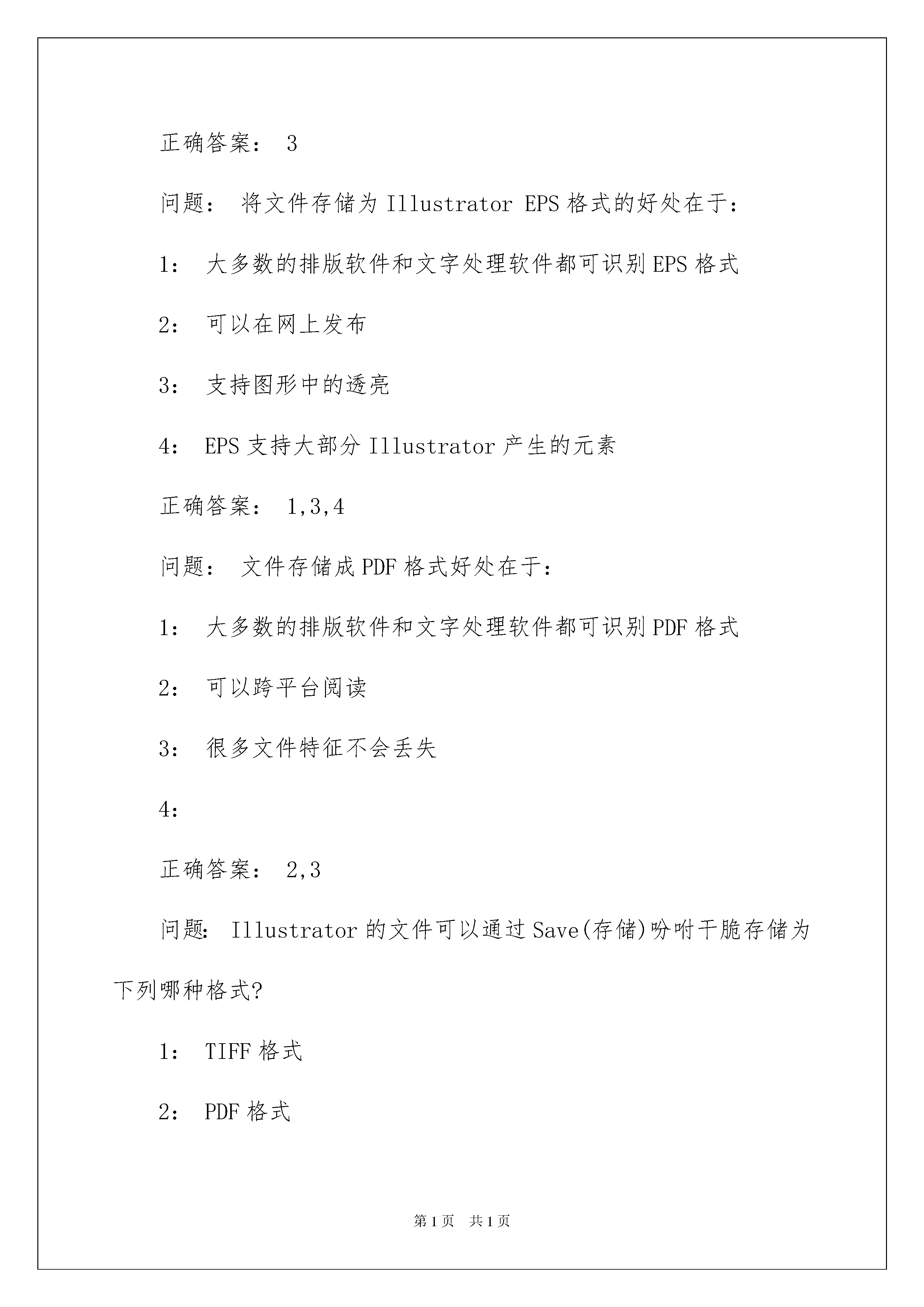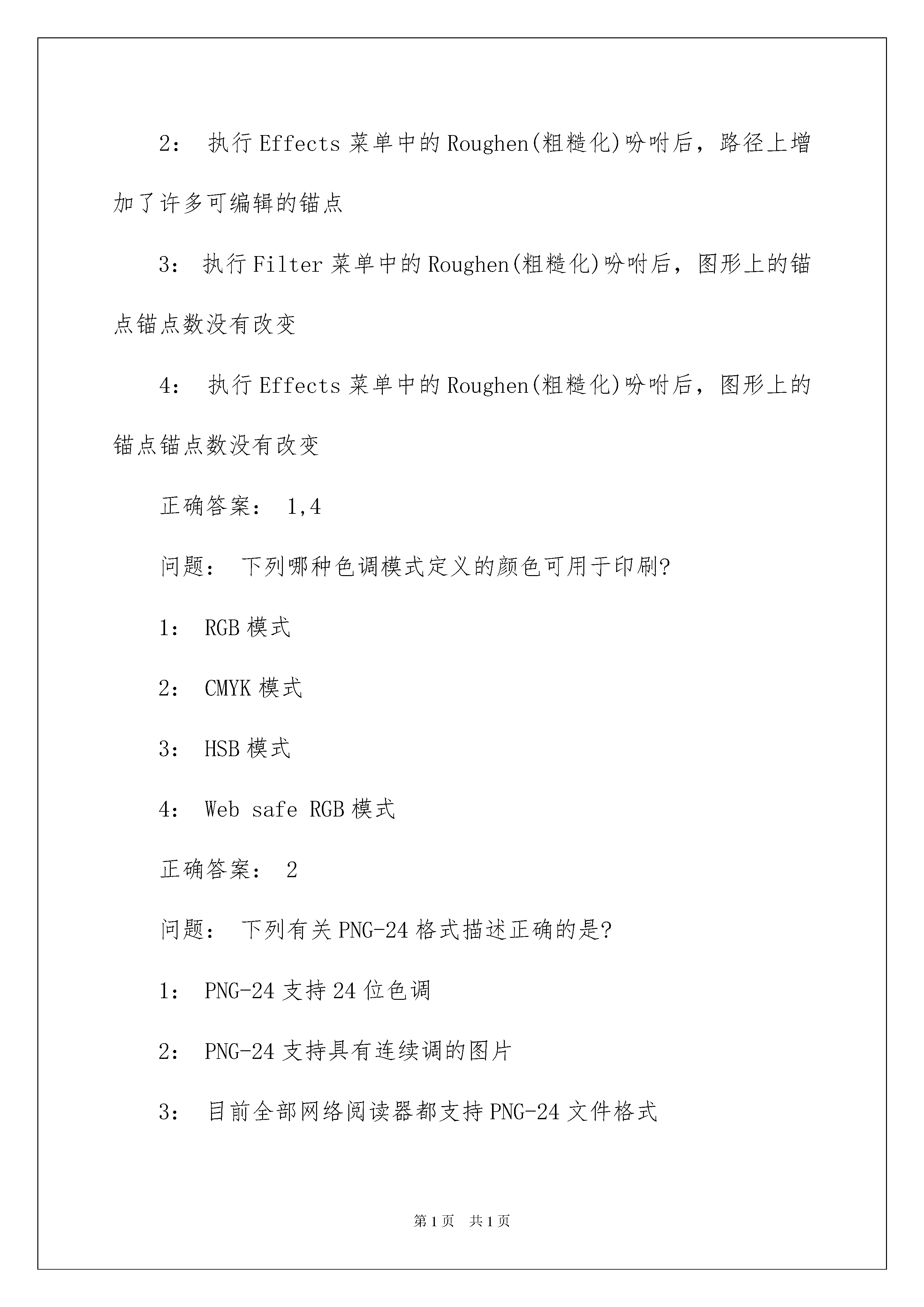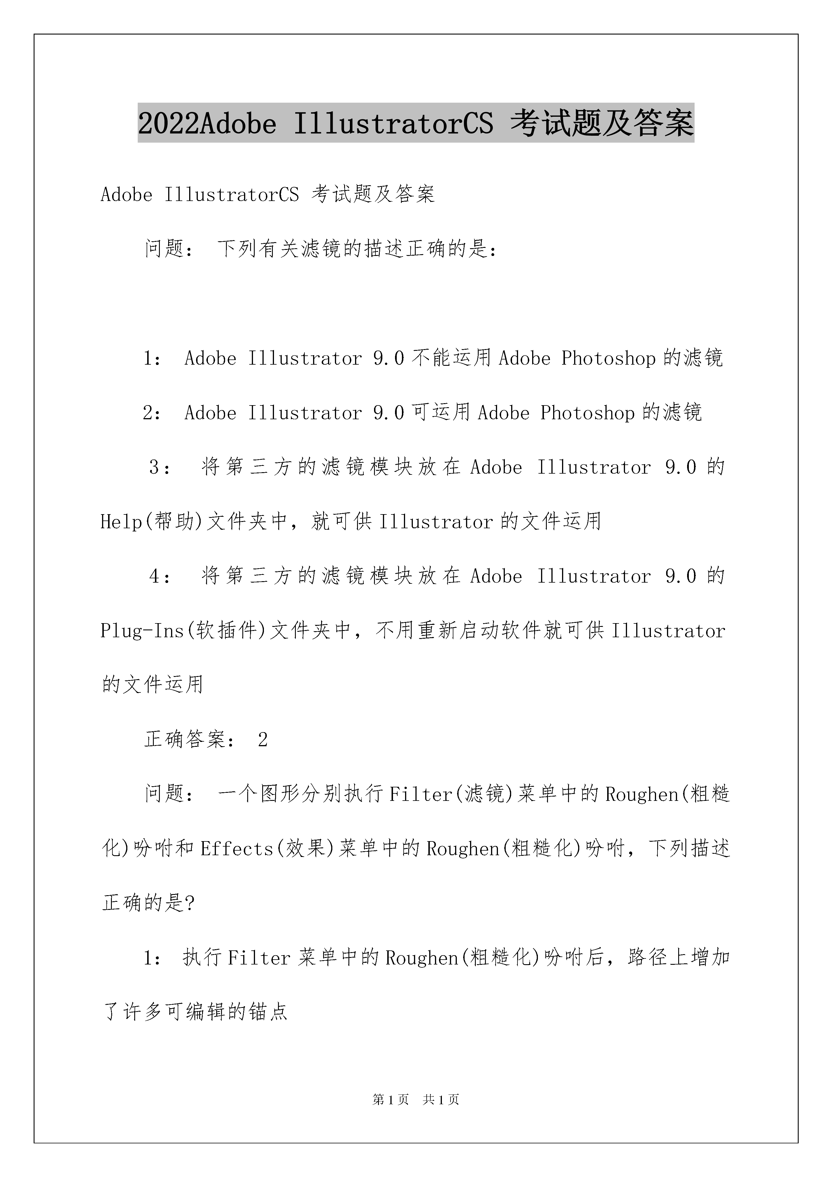 2022AdobeIllustratorCS考试题及答案AdobeIllustratorCS考试题及答案问题:下列有关滤镜的描述正确的是:1:AdobeIllustrator9.0不能运用AdobePhotoshop的滤镜2:AdobeIllustrator9.0可运用AdobePhotoshop的滤镜3:将第三方的滤镜模块放在AdobeIllustrator9.0的Help(帮助)文件夹中,就可供Illustrator的文件运用4:将第三方的滤镜模块放在AdobeIllustrator9.0的Plug-Ins(软插件)文件夹中,不用重新启动软件就可供Illustrator的文件运用正确答案:2问题:一个图形分别执行Filter(滤镜)菜单中的Roughen(粗糙化)吩咐和Effects(效果)菜单中的Roughen(粗糙化)吩咐,下列描述正确的是?1:执行Filter菜单中的Roughen(粗糙化)吩咐后,路径上增加了许多可编辑的锚点2:执行Effects菜单中的Roughen(粗糙化)吩咐后,路径上增加了许多可编辑的锚点3:执行Filter菜单中的Roughen(粗糙化)吩咐后,图形上的锚点锚点数没有改变4:执行Effects菜单中的Roughen(粗糙化)吩咐后,图形上的锚点锚点数没有改变正确答案:1,4问题:下列哪种色调模式定义的颜色可用于印刷?1:RGB模式2:CMYK模式3:HSB模式4:WebsafeRGB模式正确答案:2问题:下列有关PNG-24格式描述正确的是?1:PNG-24支持24位色调2:PNG-24支持具有连续调的图片3:目前全部网络阅读器都支持PNG-24文件格式4:PNG-24格式支持不同程度的透亮正确答案:1,2,4问题:下列那种格式为Illustrator的有效输出格式?1:BMP2:JPEG3:PNG-244:Photoshop5正确答案:1,2,4问题:下列有关SVG格式描述正确的是:1:SVG被开发的目的是为Web供应非光栅化的图形标准2:SVG可以随意放大图形显示,但不会损失锋利度、清楚度以及细微环节3:SVG格式的文件大小相对于JPEG要大很多4:SVG具有超级颜色限制正确答案:1,2,4问题:下列有关文件的打印描述正确的是:1:图像细微环节的打印结果,由辨别率和显示器的质量来确定2:打印纸张的大小可以设定,但其方向不能变更3:可以将文件打印在纸上、传送到数码印刷机上,或是输出为胶片的正片或负片4:RGB模式的颜色需转化为CMYK模式才可以正确分色正确答案:3,4问题:分色方式分为两种,在下列选项中选择正确的答案:1:四色分色法2:双色调分色法3:专色分色法4:连续调分色法正确答案:1,3问题:在Illustrator文件中置入的图像,有Link(链接)和Embed(嵌入)之分,它们的区分在于:1:嵌入的图像色调逼真2:置入的图像Link(链接)到文件中,文件就会变大3:置入的图像嵌入到文件中,文件就会变大4:Link(链接)的图像会以灰阶形式显示正确答案:3问题:将文件存储为IllustratorEPS格式的好处在于:1:大多数的排版软件和文字处理软件都可识别EPS格式2:可以在网上发布3:支持图形中的透亮4:EPS支持大部分Illustrator产生的元素正确答案:1,3,4问题:文件存储成PDF格式好处在于:1:大多数的排版软件和文字处理软件都可识别PDF格式2:可以跨平台阅读3:很多文件特征不会丢失4:正确答案:2,3问题:Illustrator的文件可以通过Save(存储)吩咐干脆存储为下列哪种格式?1:TIFF格式2:PDF格式3:JPEG格式4:EPS格式正确答案:2,4问题:AdobeIllustrator9.0的文件可通过Save(存储)吩咐干脆存储为下列哪种格式?1:IllustratorEPS2:TIFF3:BMP4:JPEG正确答案:1问题:AdobeIllustrator9.0可将下列哪几种格式的图像文件通过;文件>置入;(File>Place)吩咐置入到当前打开的图形文件中?1:.EPS2:TIFF3:PSD4:JPEG正确答案:1,2,3,4问题:在AdobeIllustrator9.0中,下列描述哪个是不正确的?1:Illustrator9.0的文件可以置入(File>Place)TIFF格式的图像2:Illustrator9.0的文件可以置入(File>Place)JPEG格式的图像3:Illustrator9.0的文件不能置入(File>Place)PSD格式的图