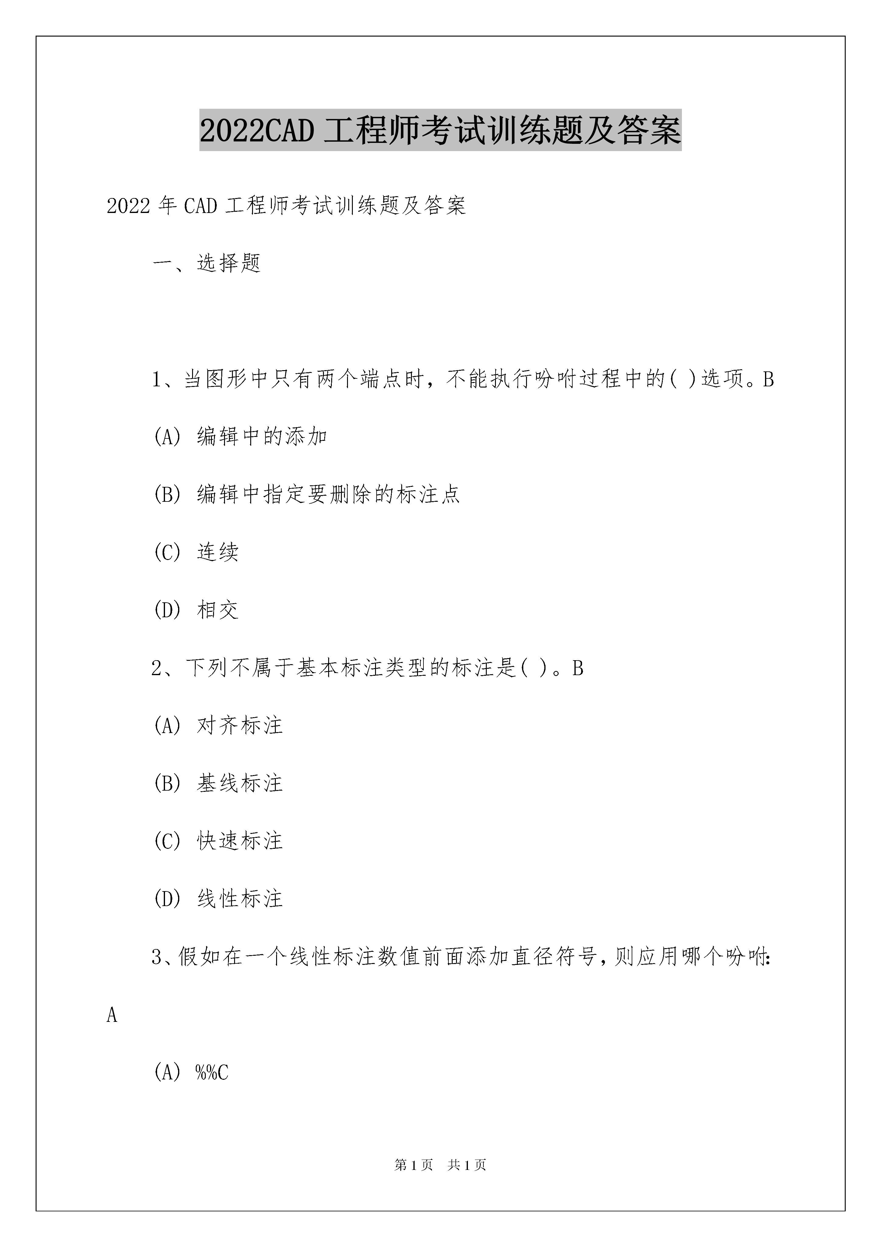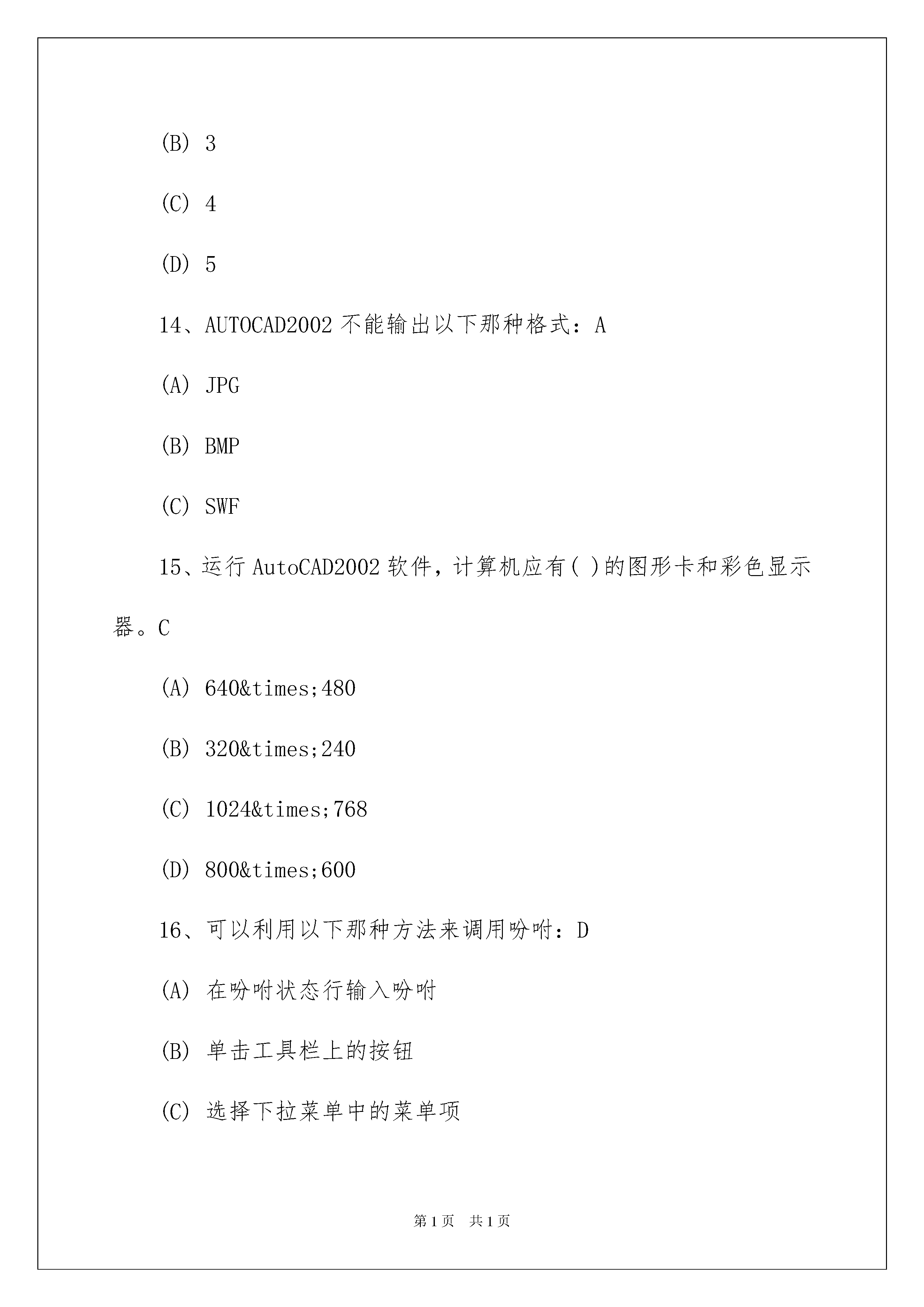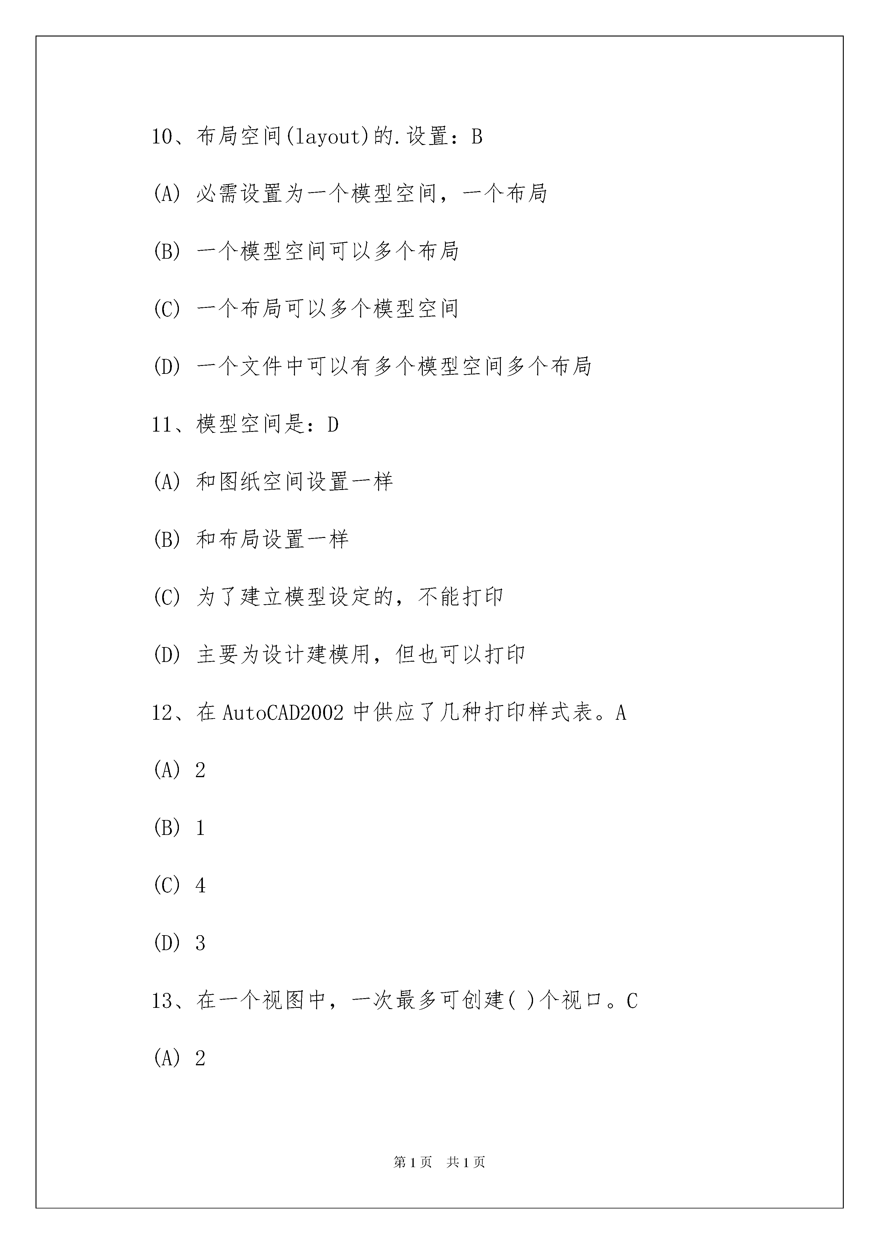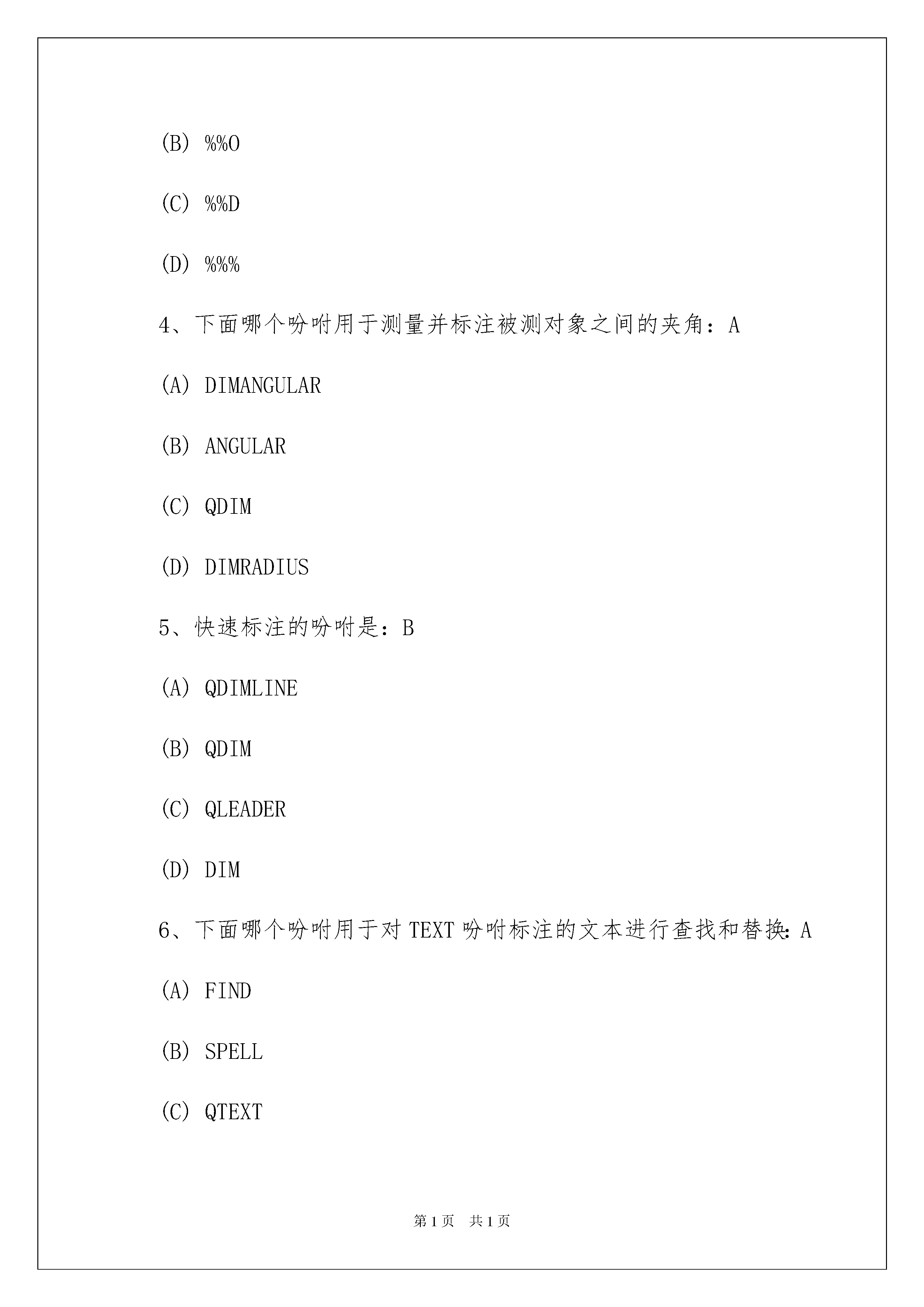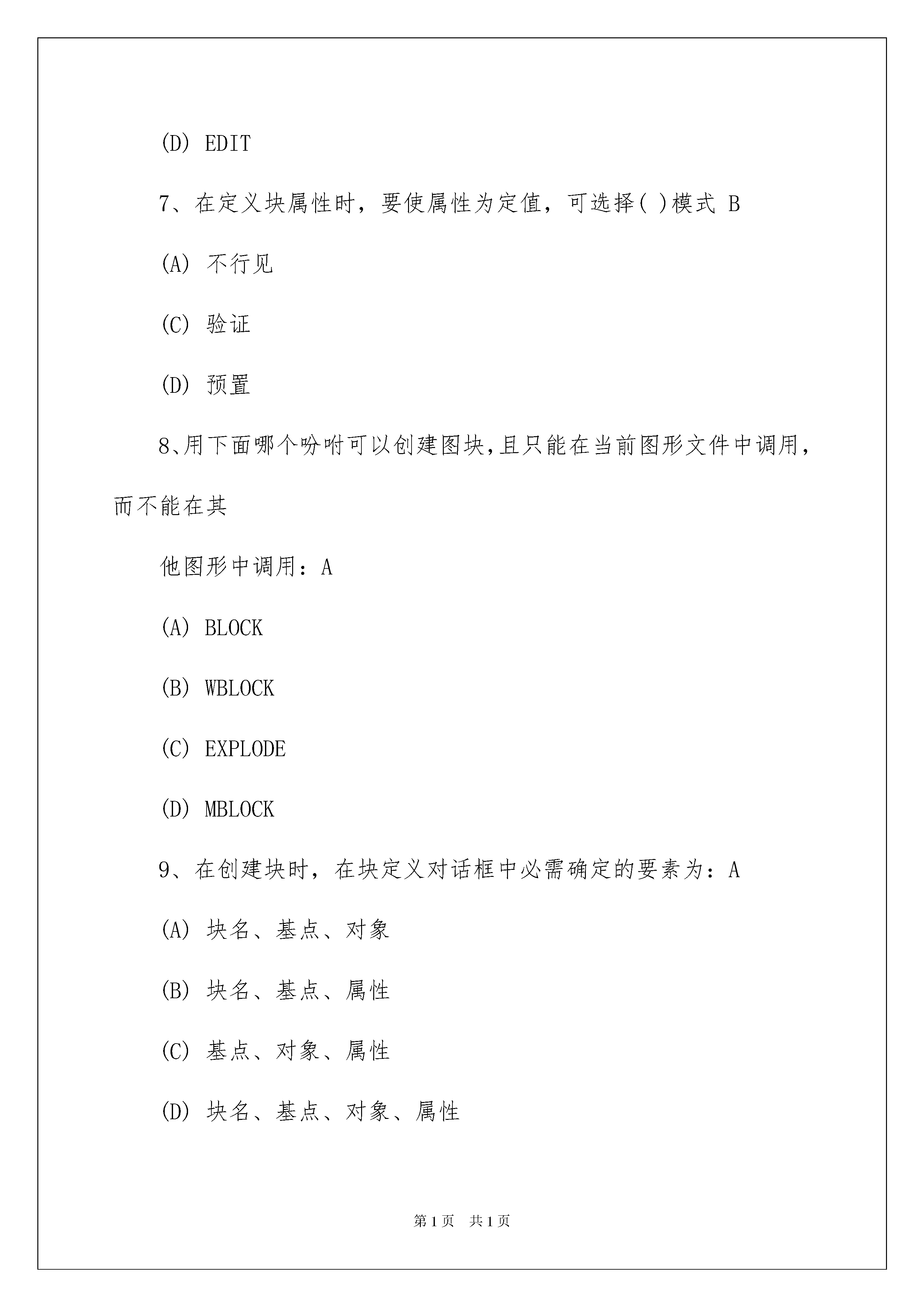 2022CAD工程师考试训练题及答案2022年CAD工程师考试训练题及答案一、选择题1、当图形中只有两个端点时,不能执行吩咐过程中的()选项。B(A)编辑中的添加(B)编辑中指定要删除的标注点(C)连续(D)相交2、下列不属于基本标注类型的标注是()。B(A)对齐标注(B)基线标注(C)快速标注(D)线性标注3、假如在一个线性标注数值前面添加直径符号,则应用哪个吩咐:A(A)%%C(B)%%O(C)%%D(D)%%%4、下面哪个吩咐用于测量并标注被测对象之间的夹角:A(A)DIMANGULAR(B)ANGULAR(C)QDIM(D)DIMRADIUS5、快速标注的吩咐是:B(A)QDIMLINE(B)QDIM(C)QLEADER(D)DIM6、下面哪个吩咐用于对TEXT吩咐标注的文本进行查找和替换:A(A)FIND(B)SPELL(C)QTEXT(D)EDIT7、在定义块属性时,要使属性为定值,可选择()模式B(A)不行见(C)验证(D)预置8、用下面哪个吩咐可以创建图块,且只能在当前图形文件中调用,而不能在其他图形中调用:A(A)BLOCK(B)WBLOCK(C)EXPLODE(D)MBLOCK9、在创建块时,在块定义对话框中必需确定的要素为:A(A)块名、基点、对象(B)块名、基点、属性(C)基点、对象、属性(D)块名、基点、对象、属性10、布局空间(layout)的.设置:B(A)必需设置为一个模型空间,一个布局(B)一个模型空间可以多个布局(C)一个布局可以多个模型空间(D)一个文件中可以有多个模型空间多个布局11、模型空间是:D(A)和图纸空间设置一样(B)和布局设置一样(C)为了建立模型设定的,不能打印(D)主要为设计建模用,但也可以打印12、在AutoCAD2002中供应了几种打印样式表。A(A)2(B)1(C)4(D)313、在一个视图中,一次最多可创建()个视口。C(A)2(B)3(C)4(D)514、AUTOCAD2002不能输出以下那种格式:A(A)JPG(B)BMP(C)SWF15、运行AutoCAD2002软件,计算机应有()的图形卡和彩色显示器。C(A)640×480(B)320×240(C)1024×768(D)800×60016、可以利用以下那种方法来调用吩咐:D(A)在吩咐状态行输入吩咐(B)单击工具栏上的按钮(C)选择下拉菜单中的菜单项(D)三者均可17、AUTOCAD2002环境文件在不同的计算机上运用而:A(A)效果相同(B)效果不同(C)与操作环境有关(D)与计算机CPU有关18、哪个功能健可以进入文本窗口?B(A)功能键F1(B)功能键F2(C)功能键F3(D)功能键F419、在AutoCAD中,下列坐标中是运用相对极坐标的是()B(A)(@32,18)(B)(@32<18)(C)(32,18)(D)(32<18)20、设置光标大小需在对话框中的()选项卡中设置。D(A)草图(B)打开和保存(C)系统(D)显示21、默认状况下用户坐标系统与世界坐标系统的关系,下面()C说法正确。(A)不相重合(B)同一个坐标系(C)相重合(D)有时重合有时不重合22、在进行文字标注时,若要插入;度数;称号,则应输入:D(A)d%%(C)d%(D)%%d23、以下哪个不能在;工具;|;自定义;中定义:B(A)菜单(B)状态栏(C)工具栏(D)键盘24、半径尺寸标注的标注文字的默认前缀是:()B(A)D(B)R(C)Rad(D)Radius25、下面哪个吩咐用于为图形标注多行文本、表格文本和下划线文本等特别文字:A(A)MTEXT(B)TEXT(C)DTEXT(D)DDEDIT26、假如要标注倾斜直线的长度,应当选用下面哪个吩咐:B(A)DIMLINEAR(B)DIMALIGNED(C)DIMORDINATE(D)QDIM27、快速引线后不行以跟随的注释对象是:C(A)多行文字(B)公差(C)单行文字(D)复制对象28、下面哪个吩咐用于在图形中以第一尺寸线为基准标注图形尺寸:A(A)DIMBASELINE(B)DIMCONTINUE(C)QLEADER(D)QDIM29、下面哪一类字体是中文字体:C(A)gbenor.shx(B)gbeitc.shx(C)gbcbig.shx(D)txt.shx30、运用吩咐标注圆或圆弧时,不能自动标注()选项。C(A)半径(B)基线(C)圆心(D)直径本文来源:网络收集与整理,如有侵权,请联系作者删除,谢谢!