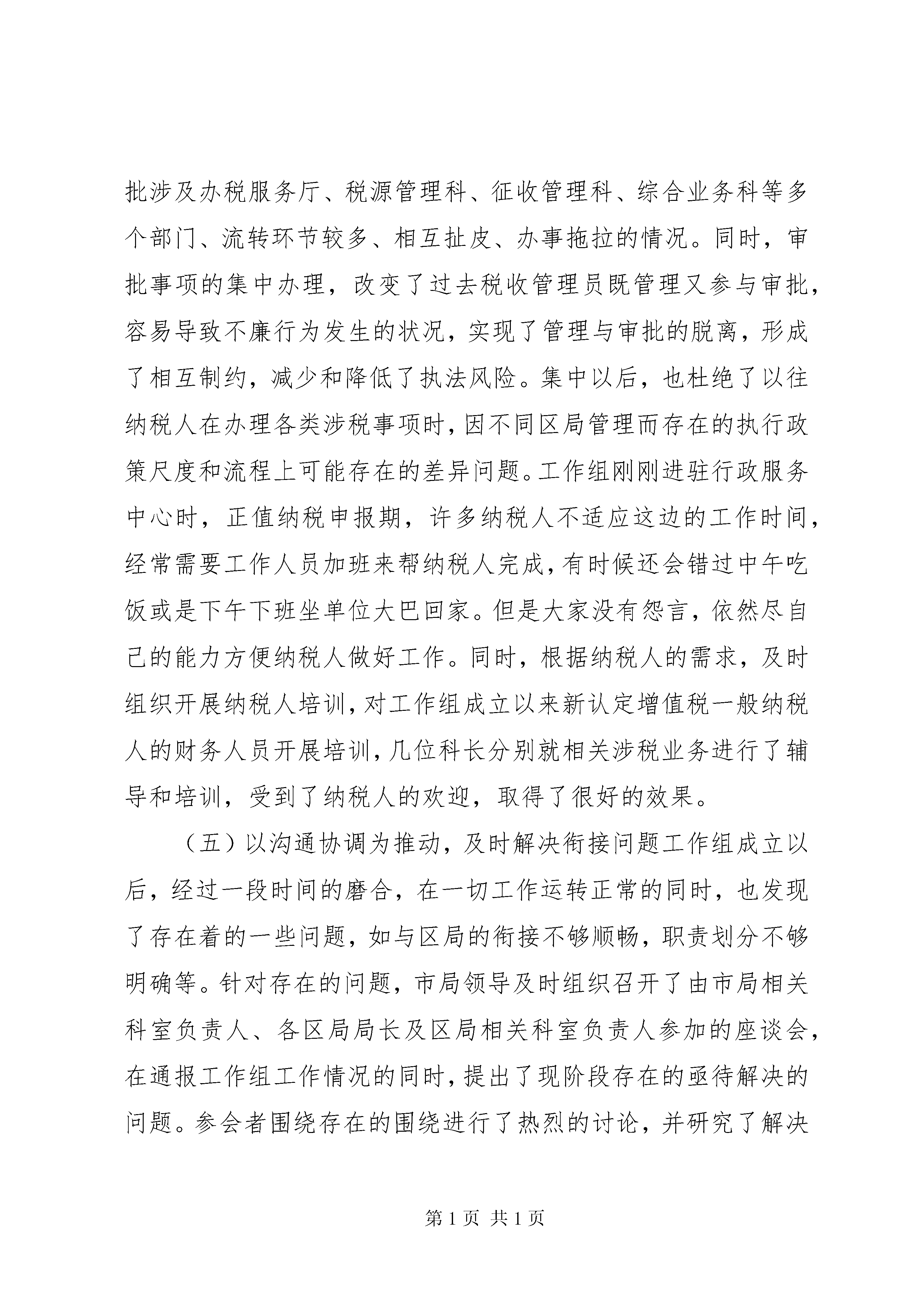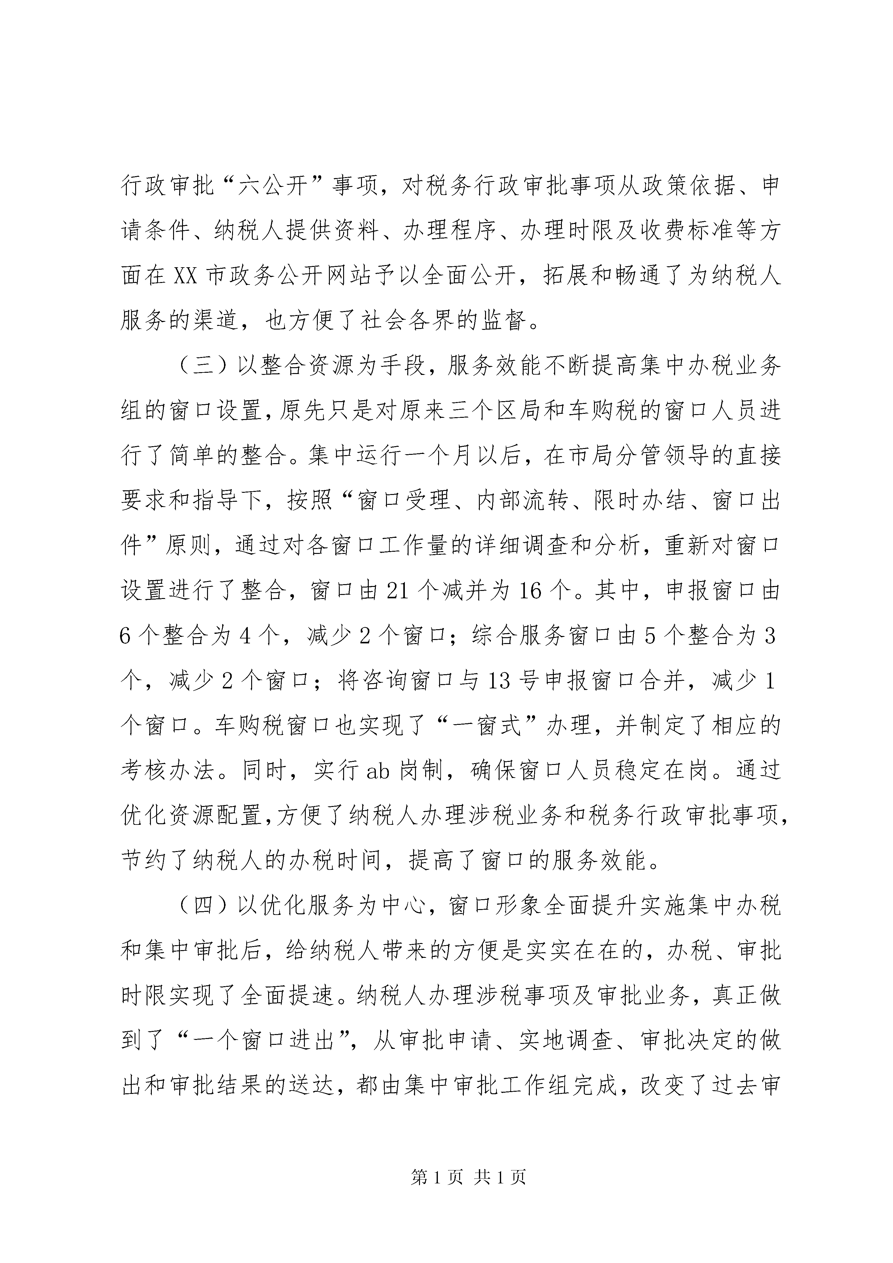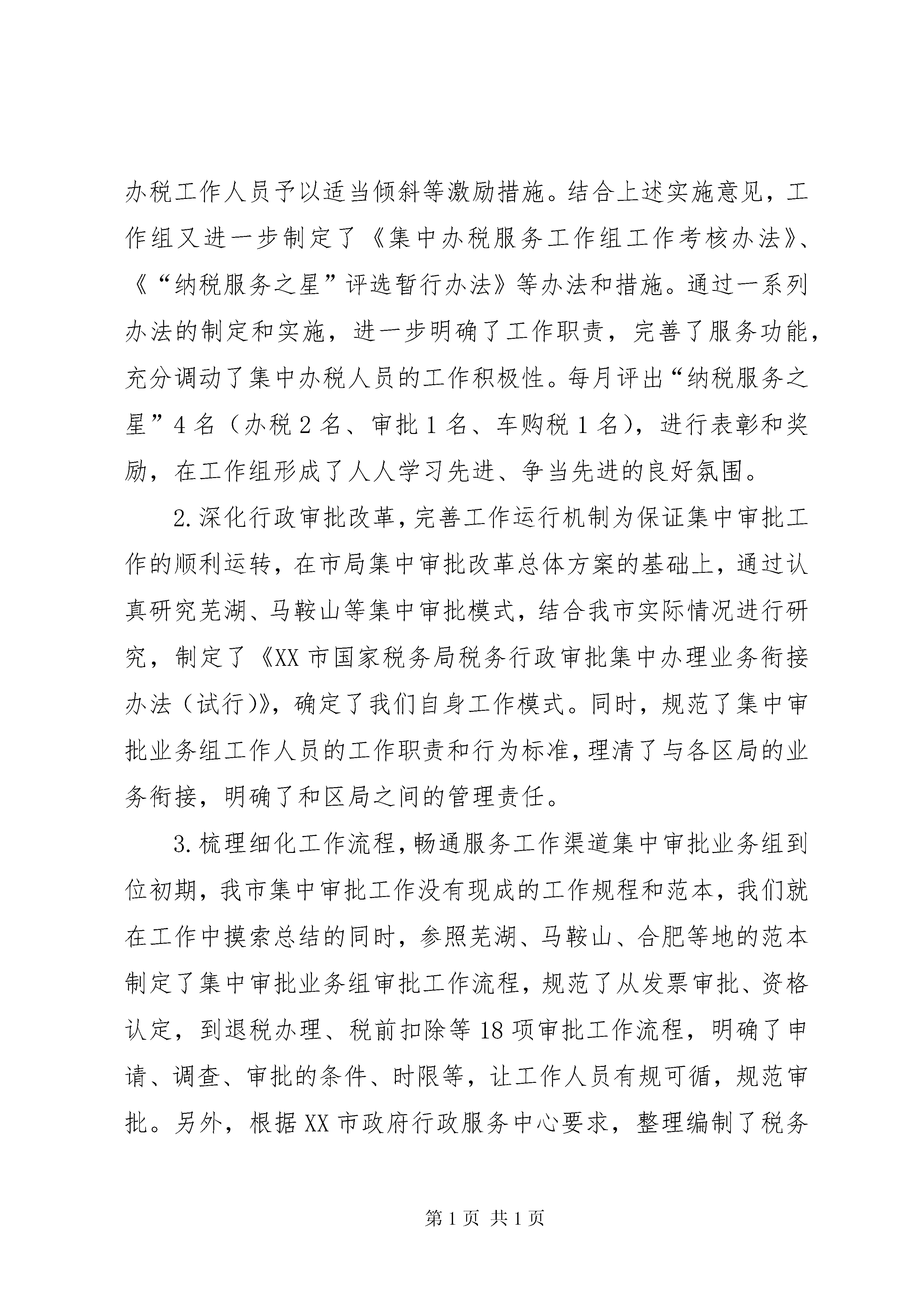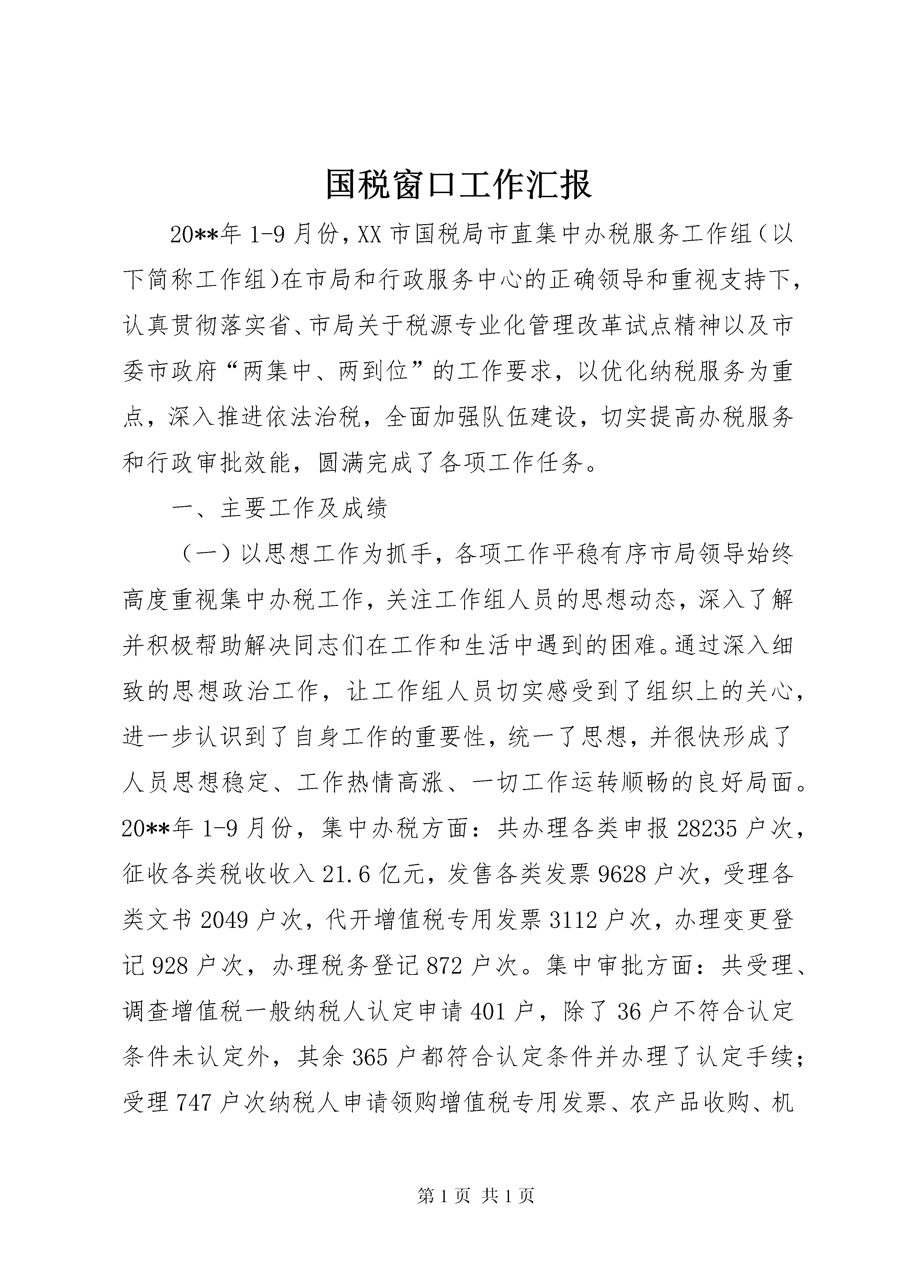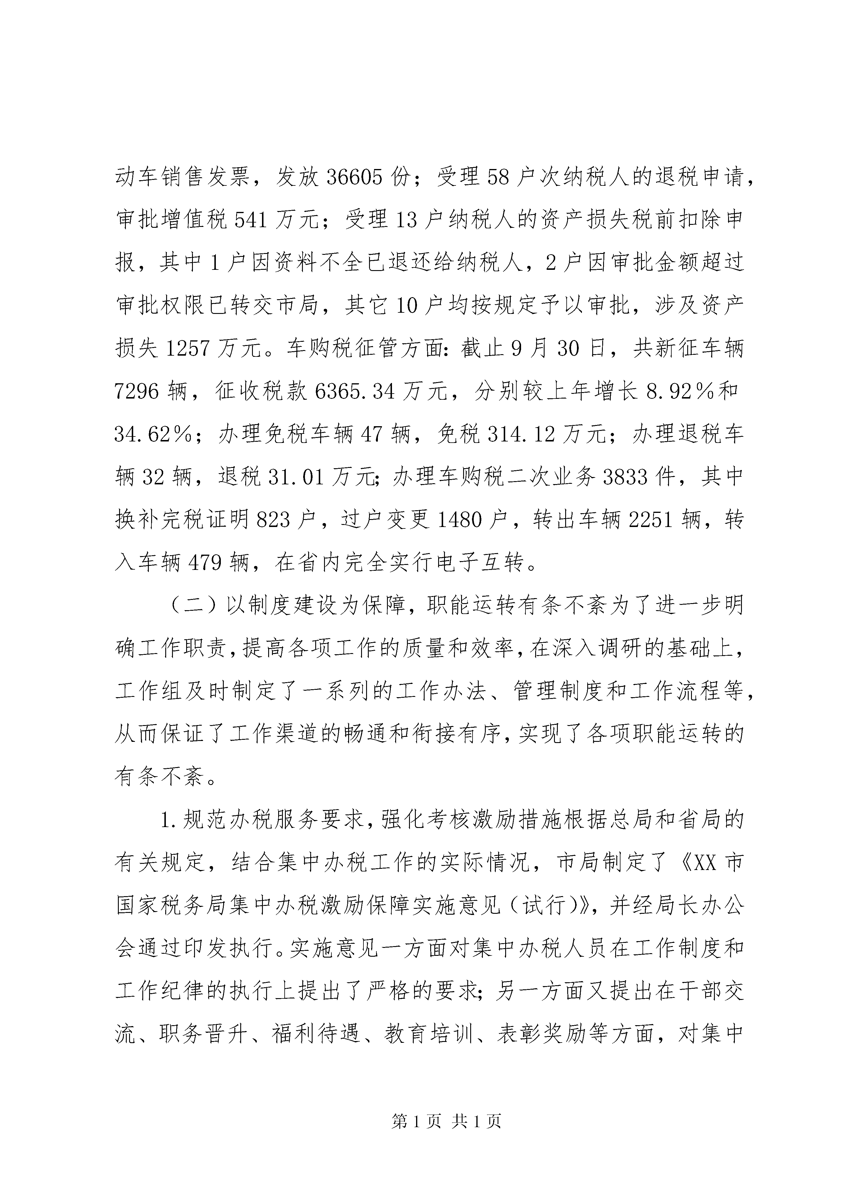 国税窗口工作汇报20**年1-9月份,XX市国税局市直集中办税服务工作组(以下简称工作组)在市局和行政服务中心的正确领导和重视支持下,认真贯彻落实省、市局关于税源专业化管理改革试点精神以及市委市政府“两集中、两到位”的工作要求,以优化纳税服务为重点,深入推进依法治税,全面加强队伍建设,切实提高办税服务和行政审批效能,圆满完成了各项工作任务。一、主要工作及成绩(一)以思想工作为抓手,各项工作平稳有序市局领导始终高度重视集中办税工作,关注工作组人员的思想动态,深入了解并积极帮助解决同志们在工作和生活中遇到的困难。通过深入细致的思想政治工作,让工作组人员切实感受到了组织上的关心,进一步认识到了自身工作的重要性,统一了思想,并很快形成了人员思想稳定、工作热情高涨、一切工作运转顺畅的良好局面。20**年1-9月份,集中办税方面:共办理各类申报28235户次,征收各类税收收入21.6亿元,发售各类发票9628户次,受理各类文书2049户次,代开增值税专用发票3112户次,办理变更登记928户次,办理税务登记872户次。集中审批方面:共受理、调查增值税一般纳税人认定申请401户,除了36户不符合认定条件未认定外,其余365户都符合认定条件并办理了认定手续;受理747户次纳税人申请领购增值税专用发票、农产品收购、机动车销售发票,发放36605份;受理58户次纳税人的退税申请,审批增值税541万元;受理13户纳税人的资产损失税前扣除申报,其中1户因资料不全已退还给纳税人,2户因审批金额超过审批权限已转交市局,其它10户均按规定予以审批,涉及资产损失1257万元。车购税征管方面:截止9月30日,共新征车辆7296辆,征收税款6365.34万元,分别较上年增长8.92%和34.62%;办理免税车辆47辆,免税314.12万元;办理退税车辆32辆,退税31.01万元;办理车购税二次业务3833件,其中换补完税证明823户,过户变更1480户,转出车辆2251辆,转入车辆479辆,在省内完全实行电子互转。(二)以制度建设为保障,职能运转有条不紊为了进一步明确工作职责,提高各项工作的质量和效率,在深入调研的基础上,工作组及时制定了一系列的工作办法、管理制度和工作流程等,从而保证了工作渠道的畅通和衔接有序,实现了各项职能运转的有条不紊。1.规范办税服务要求,强化考核激励措施根据总局和省局的有关规定,结合集中办税工作的实际情况,市局制定了《XX市国家税务局集中办税激励保障实施意见(试行)》,并经局长办公会通过印发执行。实施意见一方面对集中办税人员在工作制度和工作纪律的执行上提出了严格的要求;另一方面又提出在干部交流、职务晋升、福利待遇、教育培训、表彰奖励等方面,对集中办税工作人员予以适当倾斜等激励措施。结合上述实施意见,工作组又进一步制定了《集中办税服务工作组工作考核办法》、《“纳税服务之星”评选暂行办法》等办法和措施。通过一系列办法的制定和实施,进一步明确了工作职责,完善了服务功能,充分调动了集中办税人员的工作积极性。每月评出“纳税服务之星”4名(办税2名、审批1名、车购税1名),进行表彰和奖励,在工作组形成了人人学习先进、争当先进的良好氛围。2.深化行政审批改革,完善工作运行机制为保证集中审批工作的顺利运转,在市局集中审批改革总体方案的基础上,通过认真研究芜湖、马鞍山等集中审批模式,结合我市实际情况进行研究,制定了《XX市国家税务局税务行政审批集中办理业务衔接办法(试行)》,确定了我们自身工作模式。同时,规范了集中审批业务组工作人员的工作职责和行为标准,理清了与各区局的业务衔接,明确了和区局之间的管理责任。3.梳理细化工作流程,畅通服务工作渠道集中审批业务组到位初期,我市集中审批工作没有现成的工作规程和范本,我们就在工作中摸索总结的同时,参照芜湖、马鞍山、合肥等地的范本制定了集中审批业务组审批工作流程,规范了从发票审批、资格认定,到退税办理、税前扣除等18项审批工作流程,明确了申请、调查、审批的条件、时限等,让工作人员有规可循,规范审批。另外,根据XX市政府行政服务中心要求,整理编制了税务行政审批“六公开”事项,对税务行政审批事项从政策依据、申请条件、纳税人提供资料、办理程序、办理时限及收费标准等方面在XX市政务公开网站予以全面公开,拓展和畅通了为纳税人服务的渠道,也方便了社会各界的监督。(三)以整合资源为手段,服务效能不断提高集中办税业务组的窗口设置,原先只是对原来三个区局和车购税的窗口人员进行了简单的整合。集中运行一个月以后,在市局分管领导的直接要求和指导下,按照“窗口受理、内部流转、限时办结、窗口出件”原则,通过对各窗口工作量的详细调查和分析,重新对窗口设置进行了整合,窗口由21个减并为16个。其中,申报窗口由6个整合为4