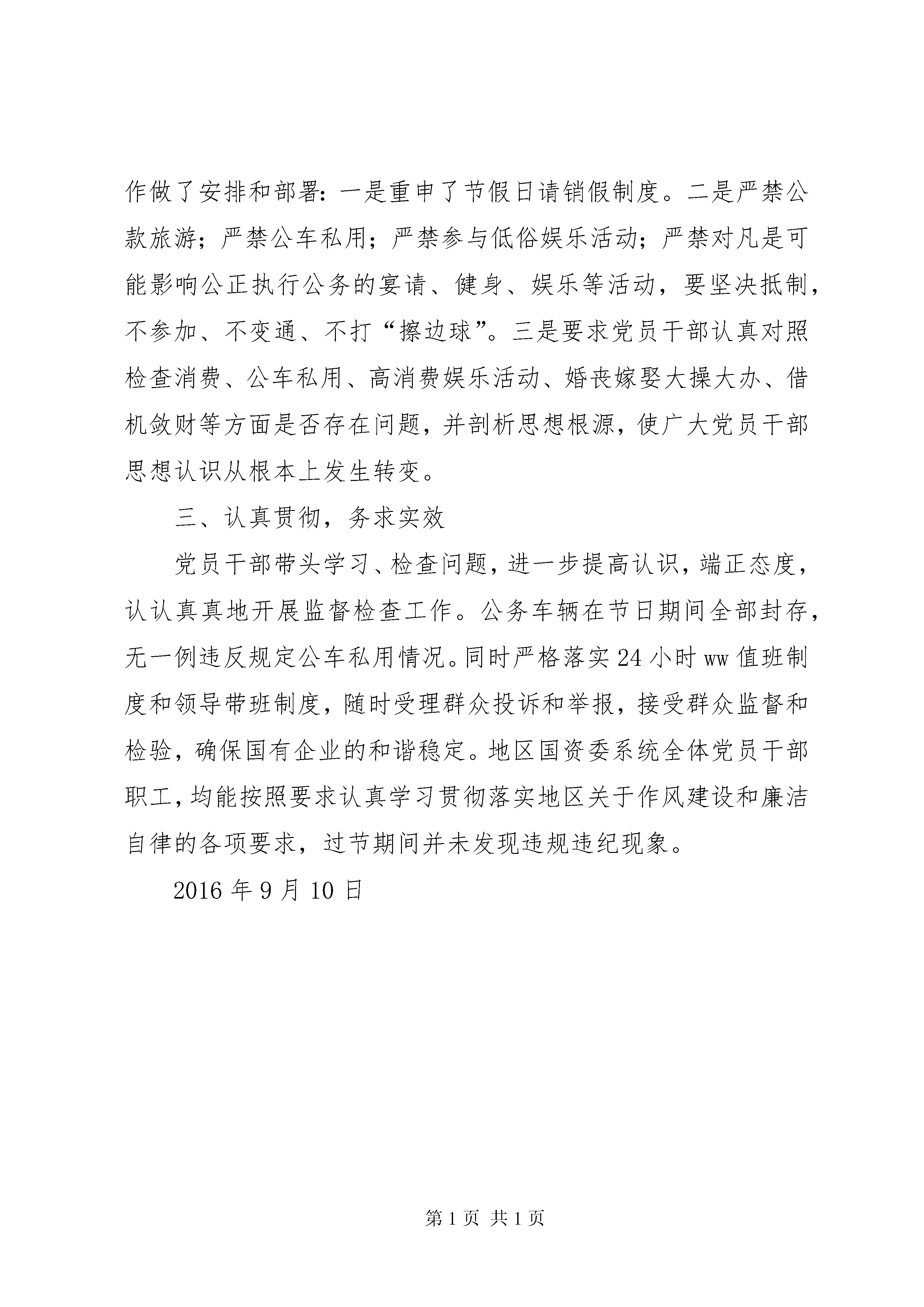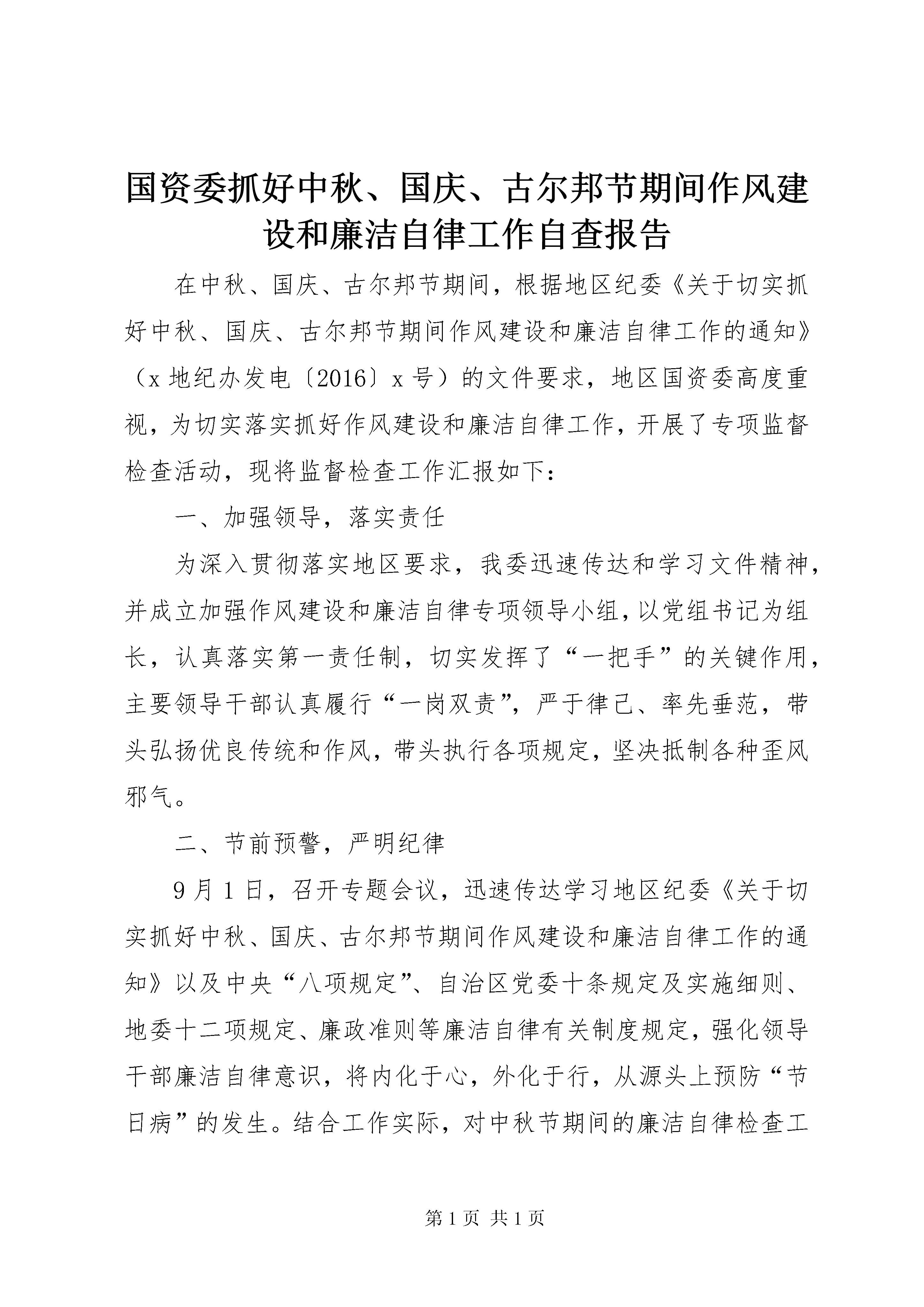 国资委抓好中秋、国庆、古尔邦节期间作风建设和廉洁自律工作自查报告在中秋、国庆、古尔邦节期间,根据地区纪委《关于切实抓好中秋、国庆、古尔邦节期间作风建设和廉洁自律工作的通知》(x地纪办发电〔2016〕x号)的文件要求,地区国资委高度重视,为切实落实抓好作风建设和廉洁自律工作,开展了专项监督检查活动,现将监督检查工作汇报如下:一、加强领导,落实责任为深入贯彻落实地区要求,我委迅速传达和学习文件精神,并成立加强作风建设和廉洁自律专项领导小组,以党组书记为组长,认真落实第一责任制,切实发挥了“一把手”的关键作用,主要领导干部认真履行“一岗双责”,严于律己、率先垂范,带头弘扬优良传统和作风,带头执行各项规定,坚决抵制各种歪风邪气。二、节前预警,严明纪律9月1日,召开专题会议,迅速传达学习地区纪委《关于切实抓好中秋、国庆、古尔邦节期间作风建设和廉洁自律工作的通知》以及中央“八项规定”、自治区党委十条规定及实施细则、地委十二项规定、廉政准则等廉洁自律有关制度规定,强化领导干部廉洁自律意识,将内化于心,外化于行,从源头上预防“节日病”的发生。结合工作实际,对中秋节期间的廉洁自律检查工作做了安排和部署:一是重申了节假日请销假制度。二是严禁公款旅游;严禁公车私用;严禁参与低俗娱乐活动;严禁对凡是可能影响公正执行公务的宴请、健身、娱乐等活动,要坚决抵制,不参加、不变通、不打“擦边球”。三是要求党员干部认真对照检查消费、公车私用、高消费娱乐活动、婚丧嫁娶大操大办、借机敛财等方面是否存在问题,并剖析思想根源,使广大党员干部思想认识从根本上发生转变。三、认真贯彻,务求实效党员干部带头学习、检查问题,进一步提高认识,端正态度,认认真真地开展监督检查工作。公务车辆在节日期间全部封存,无一例违反规定公车私用情况。同时严格落实24小时ww值班制度和领导带班制度,随时受理群众投诉和举报,接受群众监督和检验,确保国有企业的和谐稳定。地区国资委系统全体党员干部职工,均能按照要求认真学习贯彻落实地区关于作风建设和廉洁自律的各项要求,过节期间并未发现违规违纪现象。2016年9月10日