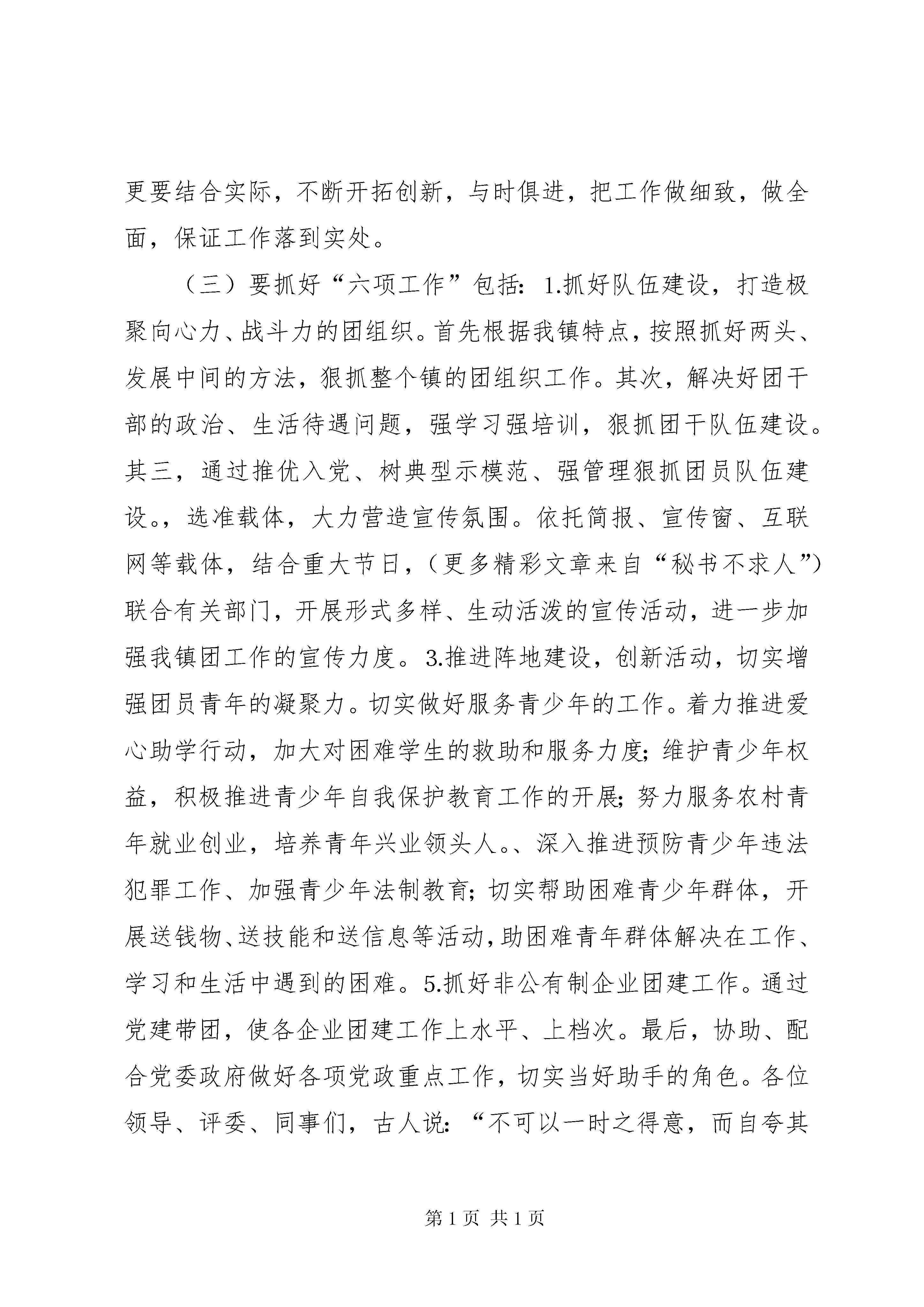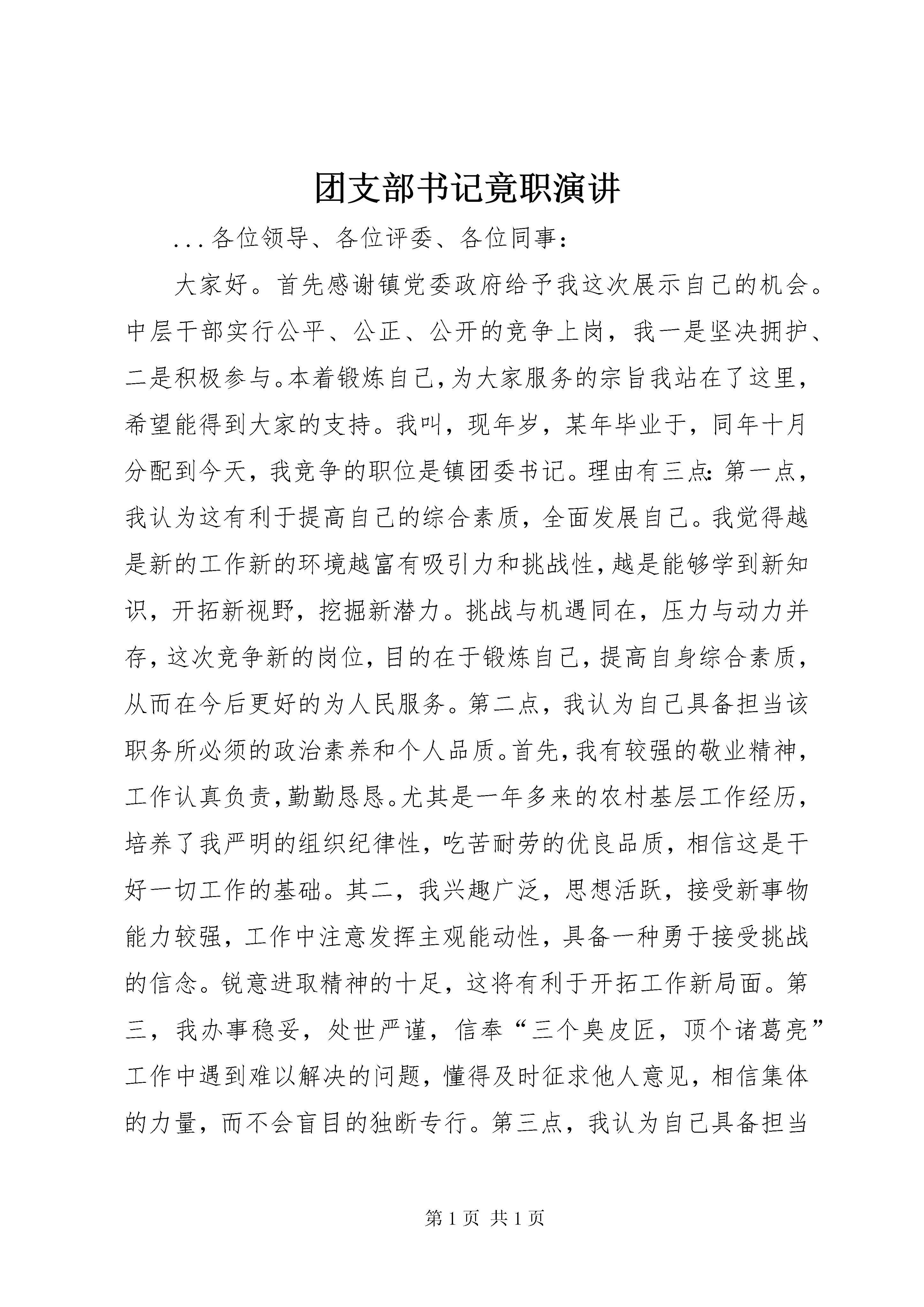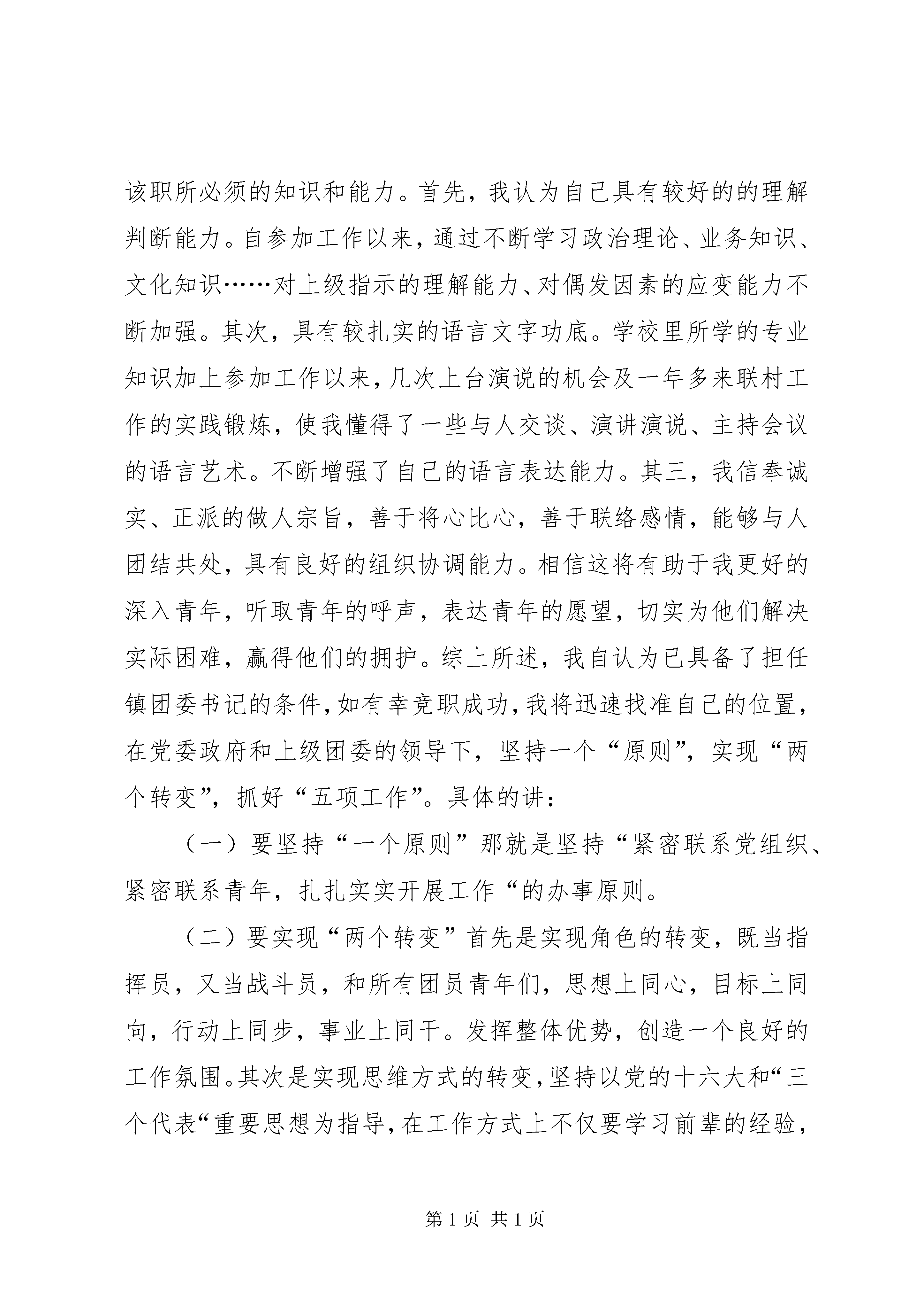 团支部书记竟职演讲...各位领导、各位评委、各位同事:大家好。首先感谢镇党委政府给予我这次展示自己的机会。中层干部实行公平、公正、公开的竞争上岗,我一是坚决拥护、二是积极参与。本着锻炼自己,为大家服务的宗旨我站在了这里,希望能得到大家的支持。我叫,现年岁,某年毕业于,同年十月分配到今天,我竞争的职位是镇团委书记。理由有三点:第一点,我认为这有利于提高自己的综合素质,全面发展自己。我觉得越是新的工作新的环境越富有吸引力和挑战性,越是能够学到新知识,开拓新视野,挖掘新潜力。挑战与机遇同在,压力与动力并存,这次竞争新的岗位,目的在于锻炼自己,提高自身综合素质,从而在今后更好的为人民服务。第二点,我认为自己具备担当该职务所必须的政治素养和个人品质。首先,我有较强的敬业精神,工作认真负责,勤勤恳恳。尤其是一年多来的农村基层工作经历,培养了我严明的组织纪律性,吃苦耐劳的优良品质,相信这是干好一切工作的基础。其二,我兴趣广泛,思想活跃,接受新事物能力较强,工作中注意发挥主观能动性,具备一种勇于接受挑战的信念。锐意进取精神的十足,这将有利于开拓工作新局面。第三,我办事稳妥,处世严谨,信奉“三个臭皮匠,顶个诸葛亮”工作中遇到难以解决的问题,懂得及时征求他人意见,相信集体的力量,而不会盲目的独断专行。第三点,我认为自己具备担当该职所必须的知识和能力。首先,我认为自己具有较好的的理解判断能力。自参加工作以来,通过不断学习政治理论、业务知识、文化知识……对上级指示的理解能力、对偶发因素的应变能力不断加强。其次,具有较扎实的语言文字功底。学校里所学的专业知识加上参加工作以来,几次上台演说的机会及一年多来联村工作的实践锻炼,使我懂得了一些与人交谈、演讲演说、主持会议的语言艺术。不断增强了自己的语言表达能力。其三,我信奉诚实、正派的做人宗旨,善于将心比心,善于联络感情,能够与人团结共处,具有良好的组织协调能力。相信这将有助于我更好的深入青年,听取青年的呼声,表达青年的愿望,切实为他们解决实际困难,赢得他们的拥护。综上所述,我自认为已具备了担任镇团委书记的条件,如有幸竞职成功,我将迅速找准自己的位置,在党委政府和上级团委的领导下,坚持一个“原则”,实现“两个转变”,抓好“五项工作”。具体的讲:(一)要坚持“一个原则”那就是坚持“紧密联系党组织、紧密联系青年,扎扎实实开展工作“的办事原则。(二)要实现“两个转变”首先是实现角色的转变,既当指挥员,又当战斗员,和所有团员青年们,思想上同心,目标上同向,行动上同步,事业上同干。发挥整体优势,创造一个良好的工作氛围。其次是实现思维方式的转变,坚持以党的十六大和“三个代表“重要思想为指导,在工作方式上不仅要学习前辈的经验,更要结合实际,不断开拓创新,与时俱进,把工作做细致,做全面,保证工作落到实处。(三)要抓好“六项工作”包括:⒈抓好队伍建设,打造极聚向心力、战斗力的团组织。首先根据我镇特点,按照抓好两头、发展中间的方法,狠抓整个镇的团组织工作。其次,解决好团干部的政治、生活待遇问题,强学习强培训,狠抓团干队伍建设。其三,通过推优入党、树典型示模范、强管理狠抓团员队伍建设。,选准载体,大力营造宣传氛围。依托简报、宣传窗、互联网等载体,结合重大节日,(更多精彩文章来自“秘书不求人”)联合有关部门,开展形式多样、生动活泼的宣传活动,进一步加强我镇团工作的宣传力度。⒊推进阵地建设,创新活动,切实增强团员青年的凝聚力。切实做好服务青少年的工作。着力推进爱心助学行动,加大对困难学生的救助和服务力度;维护青少年权益,积极推进青少年自我保护教育工作的开展;努力服务农村青年就业创业,培养青年兴业领头人。、深入推进预防青少年违法犯罪工作、加强青少年法制教育;切实帮助困难青少年群体,开展送钱物、送技能和送信息等活动,助困难青年群体解决在工作、学习和生活中遇到的困难。⒌抓好非公有制企业团建工作。通过党建带团,使各企业团建工作上水平、上档次。最后,协助、配合党委政府做好各项党政重点工作,切实当好助手的角色。各位领导、评委、同事们,古人说:“不可以一时之得意,而自夸其能;亦不可以一时之失意,而自坠其志。”竞争上岗,有上有下,无论上、下,我都将以这句话自勉,一如既往的勤奋学习、努力工作。最后我只想说一句话,那就是:给我一次机会,我将还您一个满意。谢谢大家。。