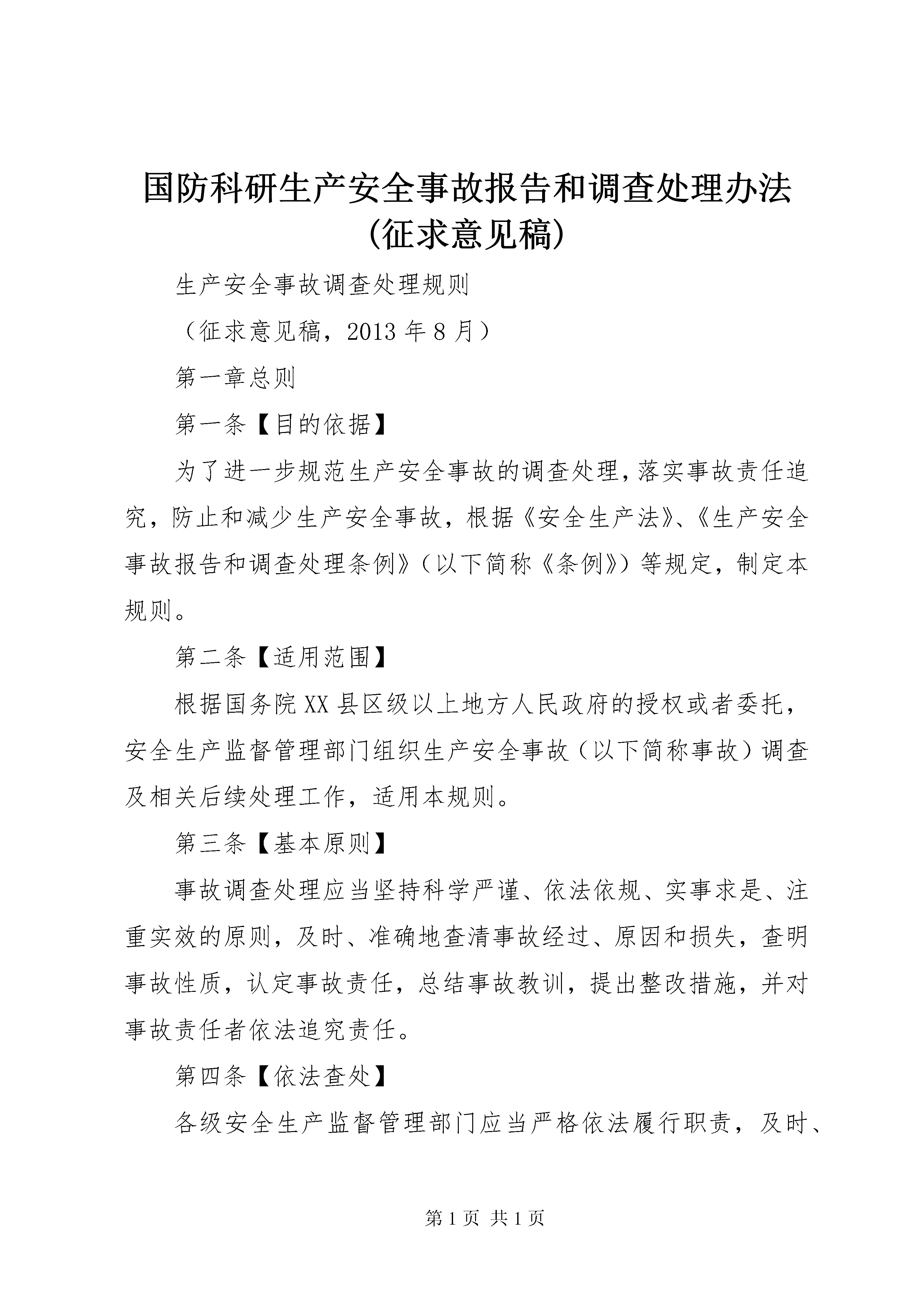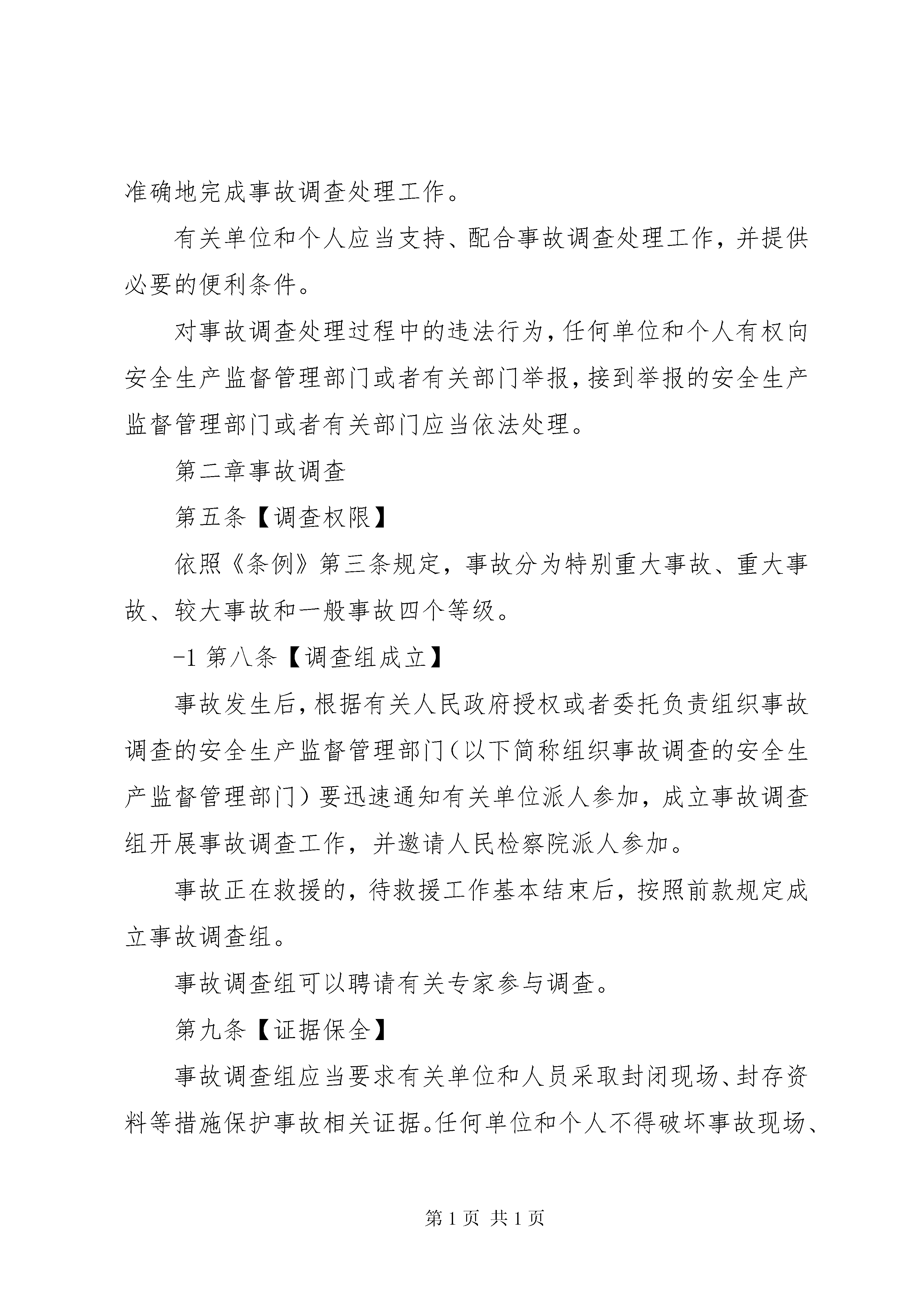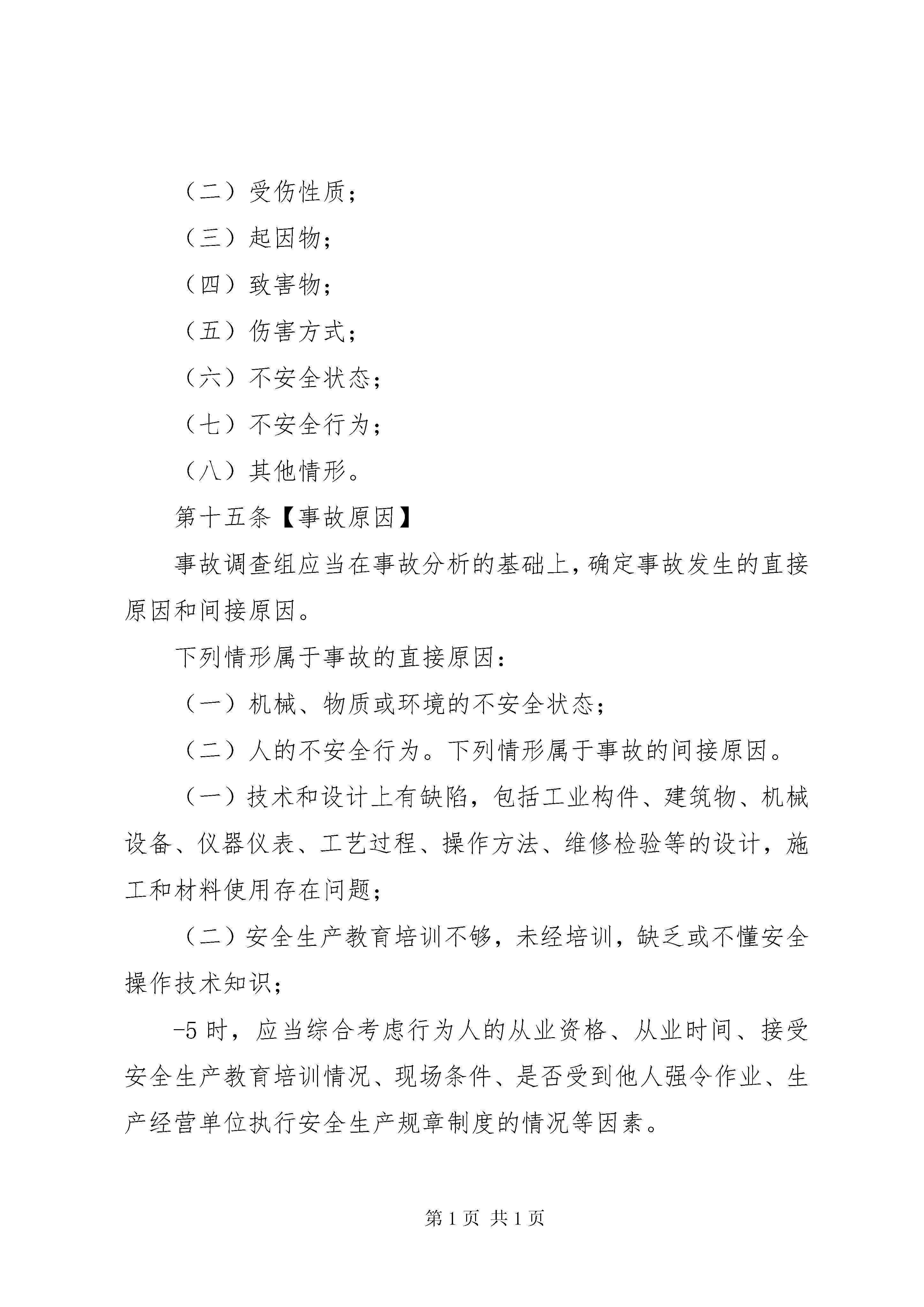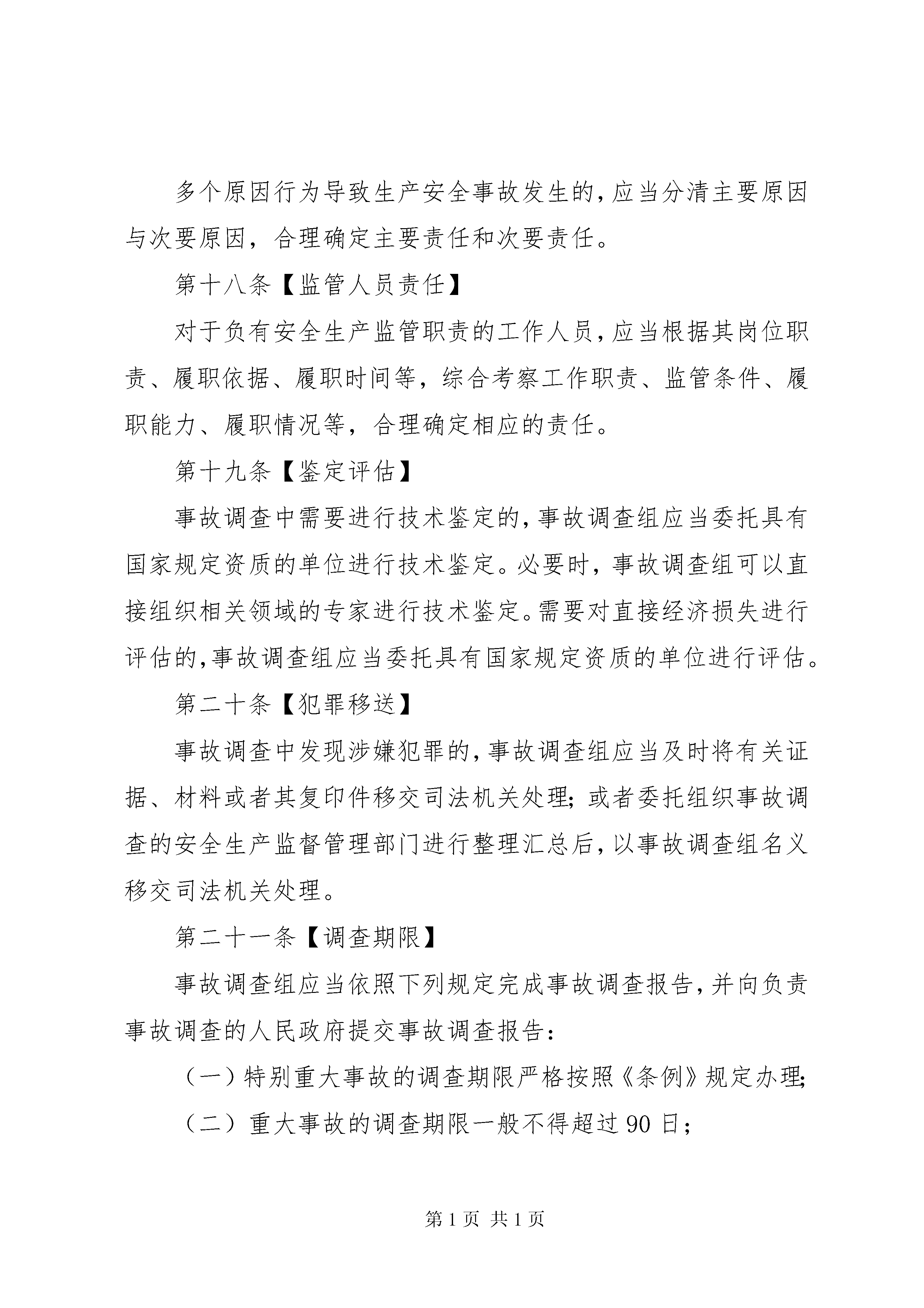 国防科研生产安全事故报告和调查处理办法(征求意见稿)生产安全事故调查处理规则(征求意见稿,2013年8月)第一章总则第一条【目的依据】为了进一步规范生产安全事故的调查处理,落实事故责任追究,防止和减少生产安全事故,根据《安全生产法》、《生产安全事故报告和调查处理条例》(以下简称《条例》)等规定,制定本规则。第二条【适用范围】根据国务院XX县区级以上地方人民政府的授权或者委托,安全生产监督管理部门组织生产安全事故(以下简称事故)调查及相关后续处理工作,适用本规则。第三条【基本原则】事故调查处理应当坚持科学严谨、依法依规、实事求是、注重实效的原则,及时、准确地查清事故经过、原因和损失,查明事故性质,认定事故责任,总结事故教训,提出整改措施,并对事故责任者依法追究责任。第四条【依法查处】各级安全生产监督管理部门应当严格依法履行职责,及时、准确地完成事故调查处理工作。有关单位和个人应当支持、配合事故调查处理工作,并提供必要的便利条件。对事故调查处理过程中的违法行为,任何单位和个人有权向安全生产监督管理部门或者有关部门举报,接到举报的安全生产监督管理部门或者有关部门应当依法处理。第二章事故调查第五条【调查权限】依照《条例》第三条规定,事故分为特别重大事故、重大事故、较大事故和一般事故四个等级。-1第八条【调查组成立】事故发生后,根据有关人民政府授权或者委托负责组织事故调查的安全生产监督管理部门(以下简称组织事故调查的安全生产监督管理部门)要迅速通知有关单位派人参加,成立事故调查组开展事故调查工作,并邀请人民检察院派人参加。事故正在救援的,待救援工作基本结束后,按照前款规定成立事故调查组。事故调查组可以聘请有关专家参与调查。第九条【证据保全】事故调查组应当要求有关单位和人员采取封闭现场、封存资料等措施保护事故相关证据。任何单位和个人不得破坏事故现场、毁灭相关证据。因抢救人员、防止事故扩大以及疏通交通等原因,需要移动事故现场物件的,有关单位和人员应当做出标志,绘制现场简图并做出书面记录,妥善保存现场重要痕迹、物证。第十条【调查方案】事故调查组应当制定事故调查方案,经事故调查组组长批准后执行。事故调查方案包括调查组成员的分工,应当查明的问题和线索,调查步骤、方法,完成相关调查的期限等。事故调查组成员应当将事故调查方案报送所在单位。特别重大事故以下等级事故,事故发生地与事故发生单位不在同一个县级以上行政区域的,事故调查组组长可以提请本级人民政府将事故调查方案转送事故发生单位所在地有关人民政府。第十一条【调查分组】事故调查组可以根据事故调查的-3事故发生之日起或者事故应急救援结束之日起10日内向事故调查组报告。第十四条【事故分析】涉及人员伤亡的事故,事故调查组应当按照《企业职工伤亡事故调查分析规则》(gb6442)等规定,开展以下内容的分析:(一)受伤部位;(二)受伤性质;(三)起因物;(四)致害物;(五)伤害方式;(六)不安全状态;(七)不安全行为;(八)其他情形。第十五条【事故原因】事故调查组应当在事故分析的基础上,确定事故发生的直接原因和间接原因。下列情形属于事故的直接原因:(一)机械、物质或环境的不安全状态;(二)人的不安全行为。下列情形属于事故的间接原因。(一)技术和设计上有缺陷,包括工业构件、建筑物、机械设备、仪器仪表、工艺过程、操作方法、维修检验等的设计,施工和材料使用存在问题;(二)安全生产教育培训不够,未经培训,缺乏或不懂安全操作技术知识;-5时,应当综合考虑行为人的从业资格、从业时间、接受安全生产教育培训情况、现场条件、是否受到他人强令作业、生产经营单位执行安全生产规章制度的情况等因素。多个原因行为导致生产安全事故发生的,应当分清主要原因与次要原因,合理确定主要责任和次要责任。第十八条【监管人员责任】对于负有安全生产监管职责的工作人员,应当根据其岗位职责、履职依据、履职时间等,综合考察工作职责、监管条件、履职能力、履职情况等,合理确定相应的责任。第十九条【鉴定评估】事故调查中需要进行技术鉴定的,事故调查组应当委托具有国家规定资质的单位进行技术鉴定。必要时,事故调查组可以直接组织相关领域的专家进行技术鉴定。需要对直接经济损失进行评估的,事故调查组应当委托具有国家规定资质的单位进行评估。第二十条【犯罪移送】事故调查中发现涉嫌犯罪的,事故调查组应当及时将有关证据、材料或者其复印件移交司法机关处理;或者委托组织事故调查的安全生产监督管理部门进行整理汇总后,以事故调查组名义移交司法机关处理。第二十一条【调查期限】事故调查组应当依照下列规定完成事故调查报告,并向负责事故调查的人民政府提交事故调查报告:(一)特别重大事故的调查期限严格按照《条例》规定办理;(二)重大事故的调查期限一般不得超过90日;-7(一)事故发