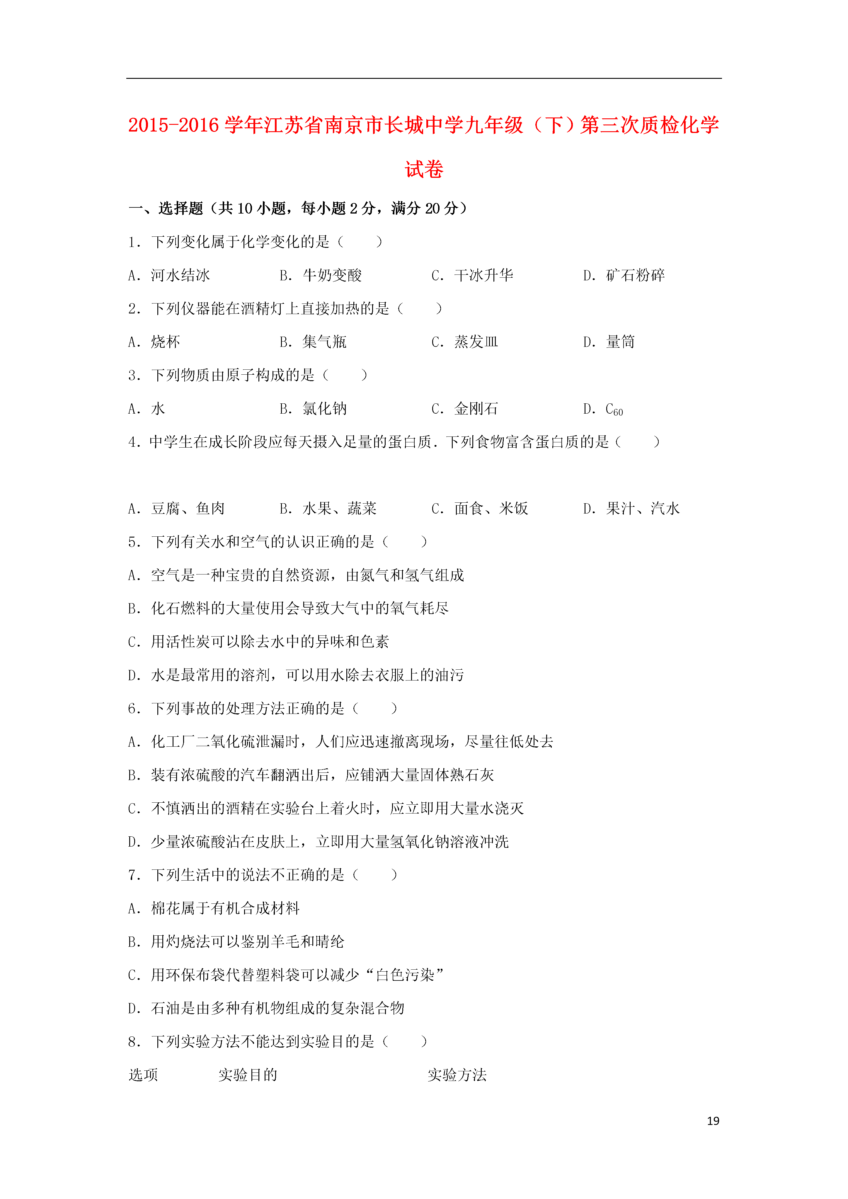 试题-江苏-2016_江苏省南京市长城中学2015-2016学年九年级化学下学期第三次质检试题(含解析) 新人教版.doc
