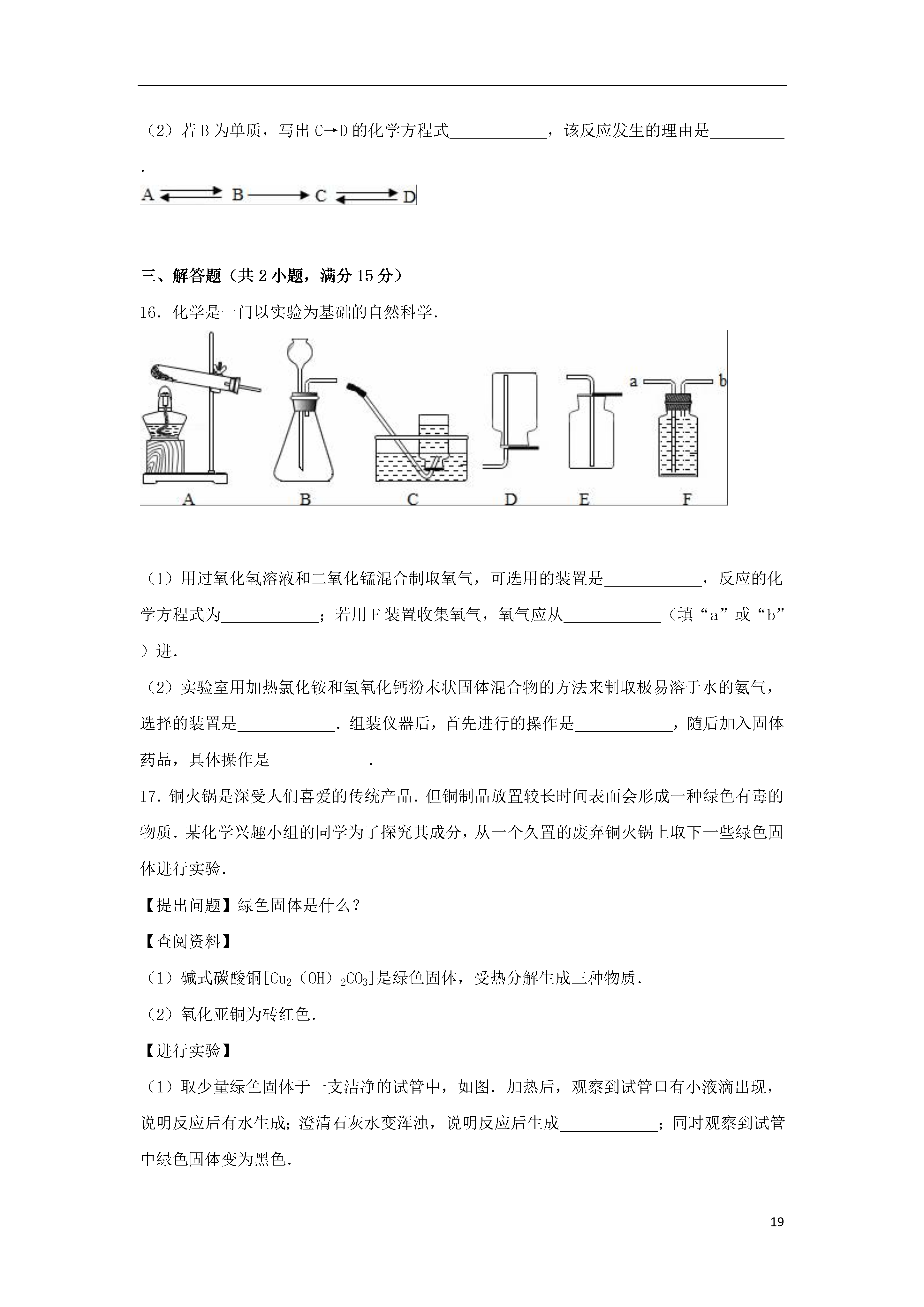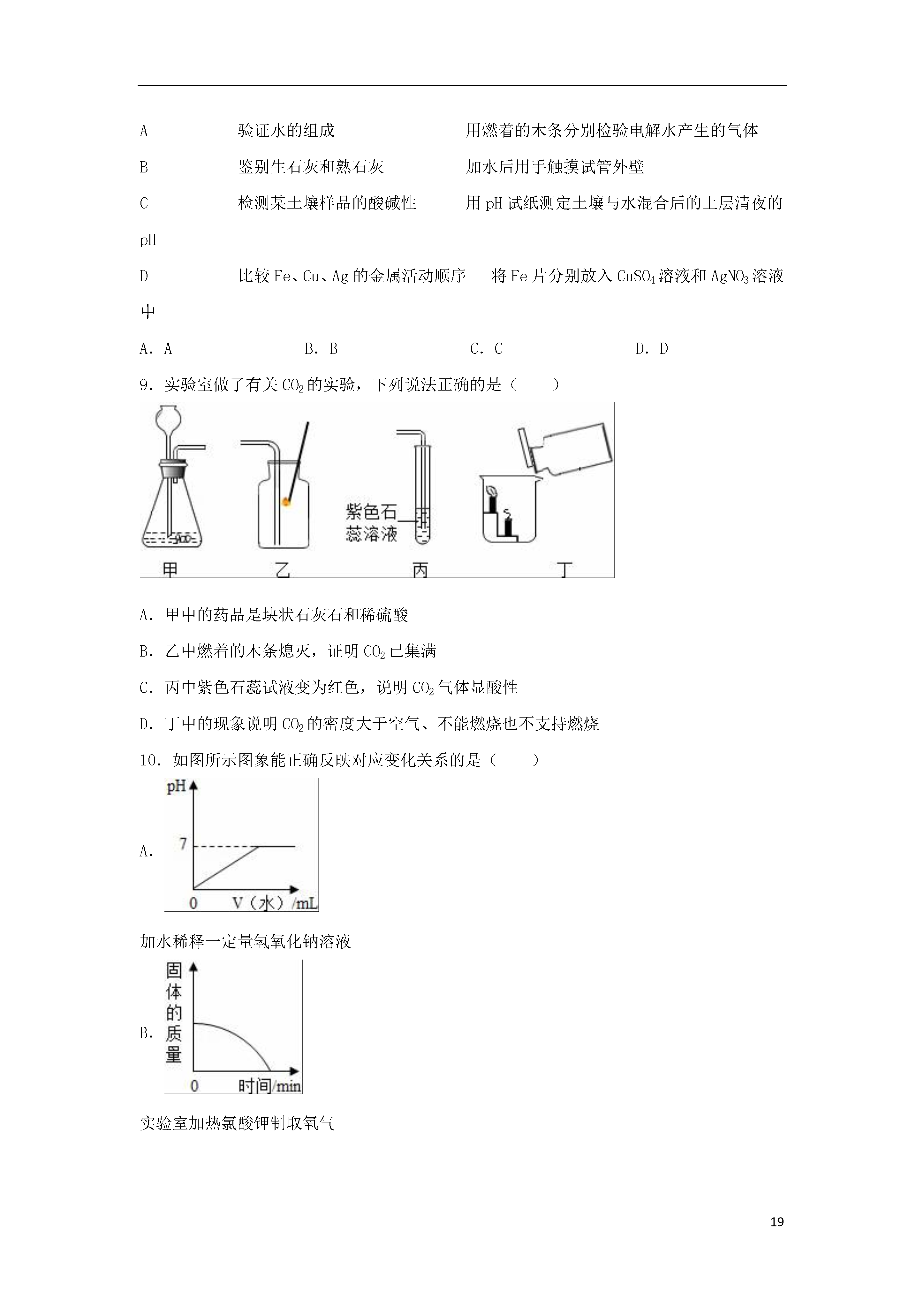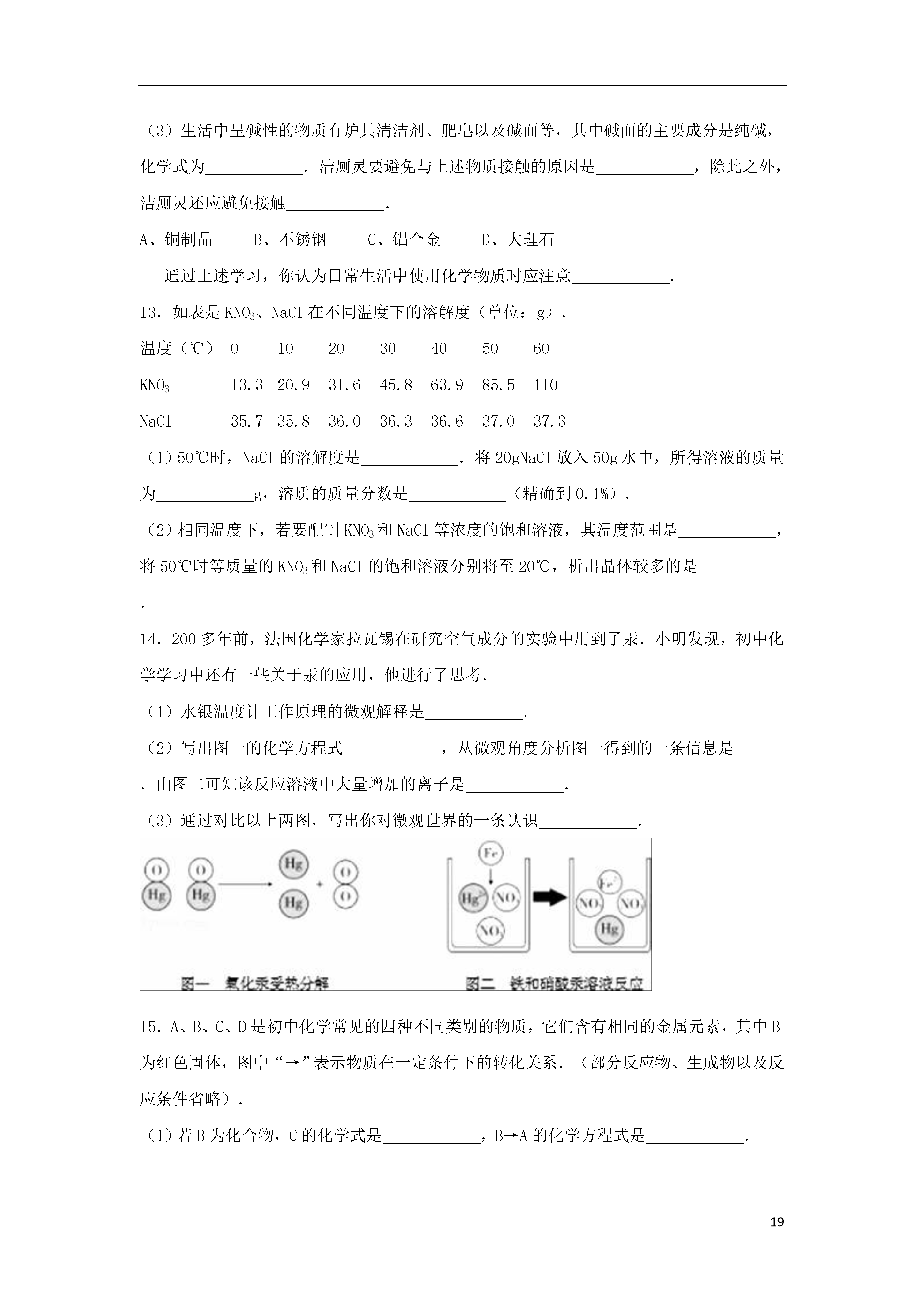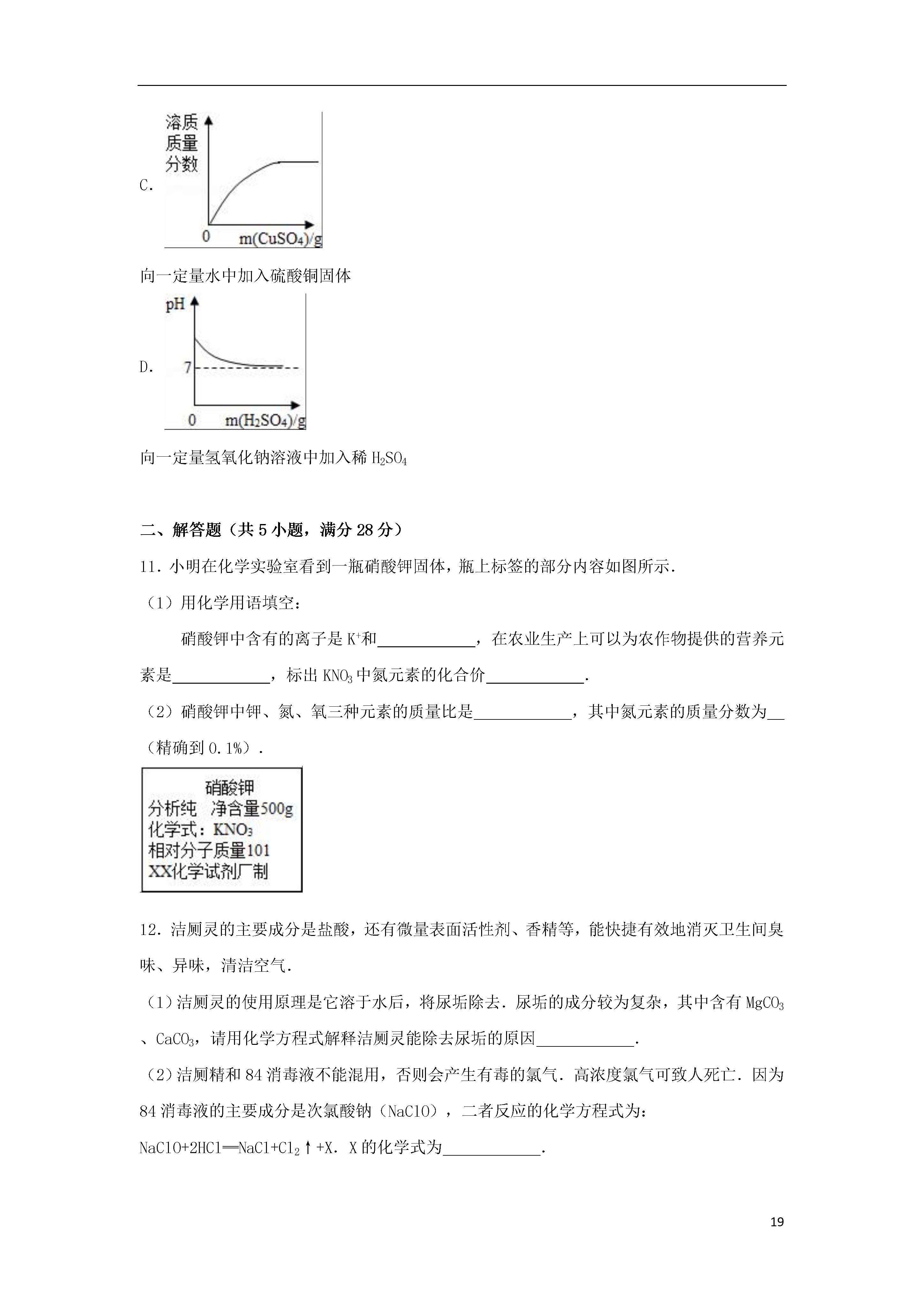 192015-2016学年江苏省南京市长城中学九年级(下)第三次质检化学试卷一、选择题(共10小题,每小题2分,满分20分)1.下列变化属于化学变化的是()A.河水结冰B.牛奶变酸C.干冰升华D.矿石粉碎2.下列仪器能在酒精灯上直接加热的是()A.烧杯B.集气瓶C.蒸发皿D.量筒3.下列物质由原子构成的是()A.水B.氯化钠C.金刚石D.C604.中学生在成长阶段应每天摄入足量的蛋白质.下列食物富含蛋白质的是()A.豆腐、鱼肉B.水果、蔬菜C.面食、米饭D.果汁、汽水5.下列有关水和空气的认识正确的是()A.空气是一种宝贵的自然资源,由氮气和氢气组成B.化石燃料的大量使用会导致大气中的氧气耗尽C.用活性炭可以除去水中的异味和色素D.水是最常用的溶剂,可以用水除去衣服上的油污6.下列事故的处理方法正确的是()A.化工厂二氧化硫泄漏时,人们应迅速撤离现场,尽量往低处去B.装有浓硫酸的汽车翻洒出后,应铺洒大量固体熟石灰C.不慎洒出的酒精在实验台上着火时,应立即用大量水浇灭D.少量浓硫酸沾在皮肤上,立即用大量氢氧化钠溶液冲洗7.下列生活中的说法不正确的是()A.棉花属于有机合成材料B.用灼烧法可以鉴别羊毛和晴纶C.用环保布袋代替塑料袋可以减少“白色污染”D.石油是由多种有机物组成的复杂混合物8.下列实验方法不能达到实验目的是()选项实验目的实验方法A验证水的组成用燃着的木条分别检验电解水产生的气体B鉴别生石灰和熟石灰加水后用手触摸试管外壁C检测某土壤样品的酸碱性用pH试纸测定土壤与水混合后的上层清夜的pHD比较Fe、Cu、Ag的金属活动顺序将Fe片分别放入CuSO4溶液和AgNO3溶液中A.AB.BC.CD.D9.实验室做了有关CO2的实验,下列说法正确的是()A.甲中的药品是块状石灰石和稀硫酸B.乙中燃着的木条熄灭,证明CO2已集满C.丙中紫色石蕊试液变为红色,说明CO2气体显酸性D.丁中的现象说明CO2的密度大于空气、不能燃烧也不支持燃烧10.如图所示图象能正确反映对应变化关系的是()A.加水稀释一定量氢氧化钠溶液B.实验室加热氯酸钾制取氧气C.向一定量水中加入硫酸铜固体D.向一定量氢氧化钠溶液中加入稀H2SO4二、解答题(共5小题,满分28分)11.小明在化学实验室看到一瓶硝酸钾固体,瓶上标签的部分内容如图所示.(1)用化学用语填空:硝酸钾中含有的离子是K+和,在农业生产上可以为农作物提供的营养元素是,标出KNO3中氮元素的化合价.(2)硝酸钾中钾、氮、氧三种元素的质量比是,其中氮元素的质量分数为(精确到0.1%).12.洁厕灵的主要成分是盐酸,还有微量表面活性剂、香精等,能快捷有效地消灭卫生间臭味、异味,清洁空气.(1)洁厕灵的使用原理是它溶于水后,将尿垢除去.尿垢的成分较为复杂,其中含有MgCO3、CaCO3,请用化学方程式解释洁厕灵能除去尿垢的原因.(2)洁厕精和84消毒液不能混用,否则会产生有毒的氯气.高浓度氯气可致人死亡.因为84消毒液的主要成分是次氯酸钠(NaClO),二者反应的化学方程式为:NaClO+2HCl═NaCl+Cl2↑+X.X的化学式为.(3)生活中呈碱性的物质有炉具清洁剂、肥皂以及碱面等,其中碱面的主要成分是纯碱,化学式为.洁厕灵要避免与上述物质接触的原因是,除此之外,洁厕灵还应避免接触.A、铜制品B、不锈钢C、铝合金D、大理石通过上述学习,你认为日常生活中使用化学物质时应注意.13.如表是KNO3、NaCl在不同温度下的溶解度(单位:g).温度(℃)0102030405060KNO313.320.931.645.863.985.5110NaCl35.735.836.036.336.637.037.3(1)50℃时,NaCl的溶解度是.将20gNaCl放入50g水中,所得溶液的质量为g,溶质的质量分数是(精确到0.1%).(2)相同温度下,若要配制KNO3和NaCl等浓度的饱和溶液,其温度范围是,将50℃时等质量的KNO3和NaCl的饱和溶液分别将至20℃,析出晶体较多的是.14.200多年前,法国化学家拉瓦锡在研究空气成分的实验中用到了汞.小明发现,初中化学学习中还有一些关于汞的应用,他进行了思考.(1)水银温度计工作原理的微观解释是.(2)写出图一的化学方程式,从微观角度分析图一得到的一条信息是.由图二可知该反应溶液中大量增加的离子是.(3)通过对比以上两图,写出你对微观世界的一条认识.15.A、B、C、D是初中化学常见的四种不同类别的物质,它们含有相同的金属元素,其中B为红色固体,图中“→”表示物质在一定条件下的转化关系.(部分反应物、生成