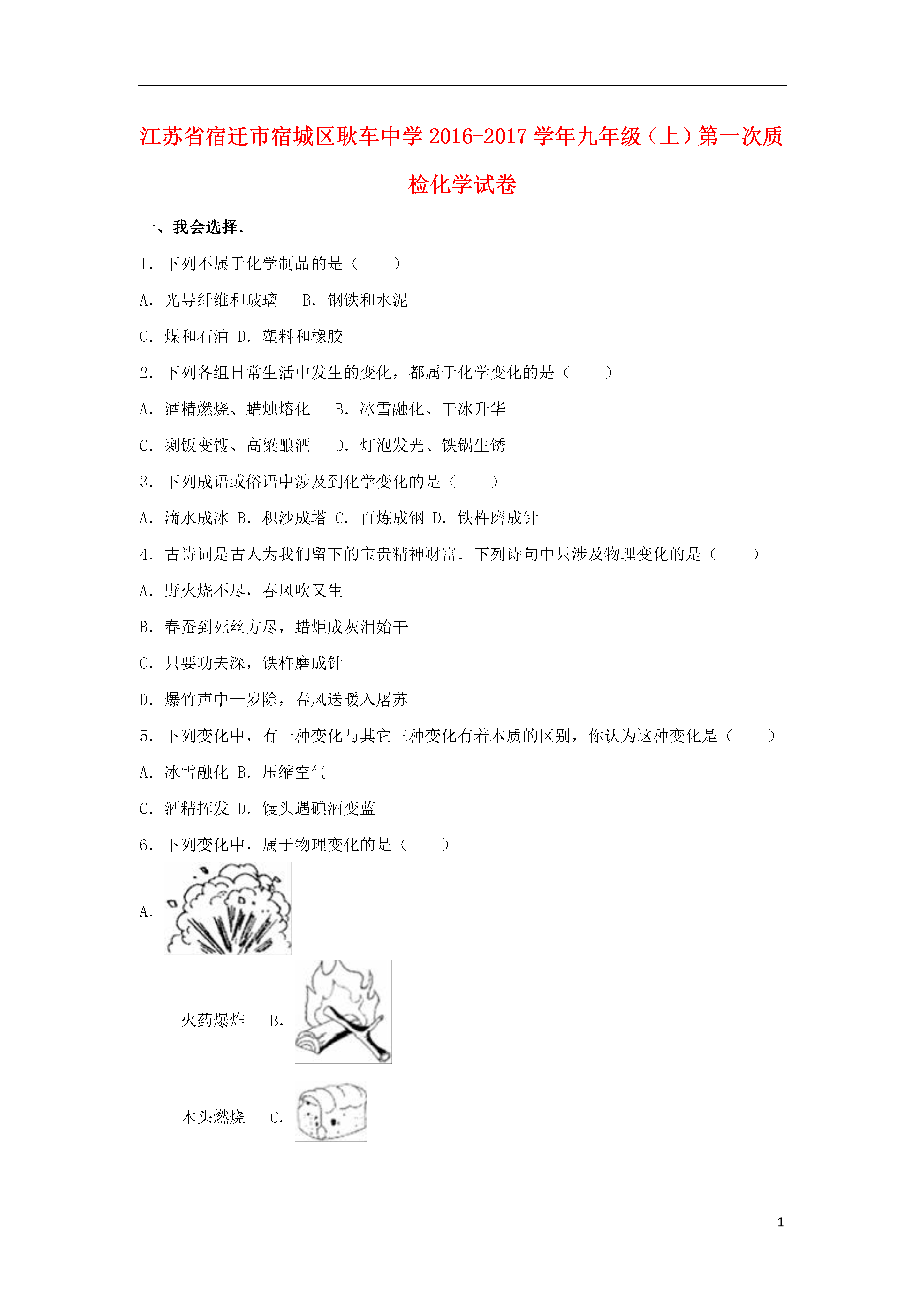 试题-江苏-2016_江苏省宿迁市宿城区耿车中学2016-2017学年九年级化学上学期第一次质检试卷(含解析) 新人教版.doc