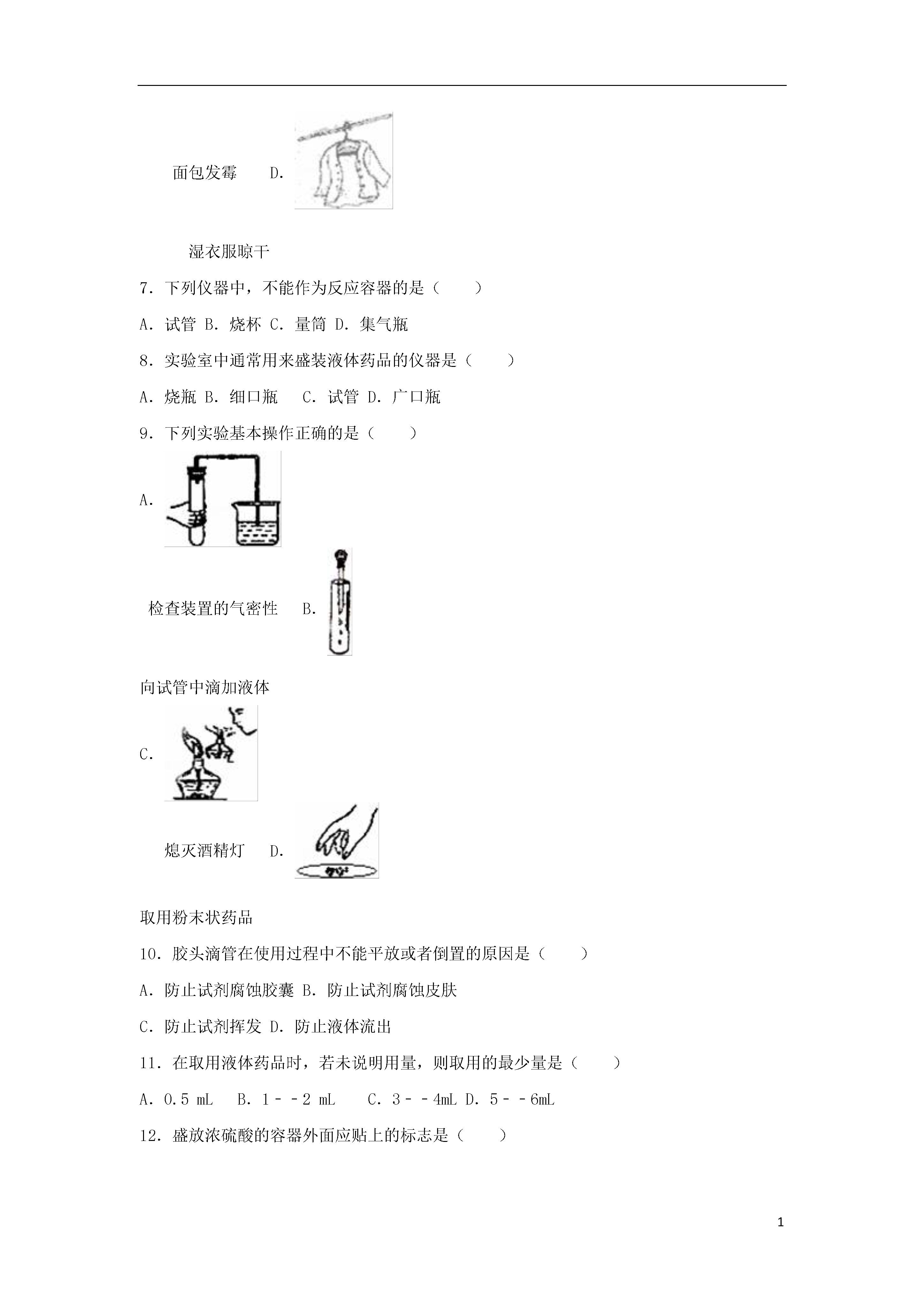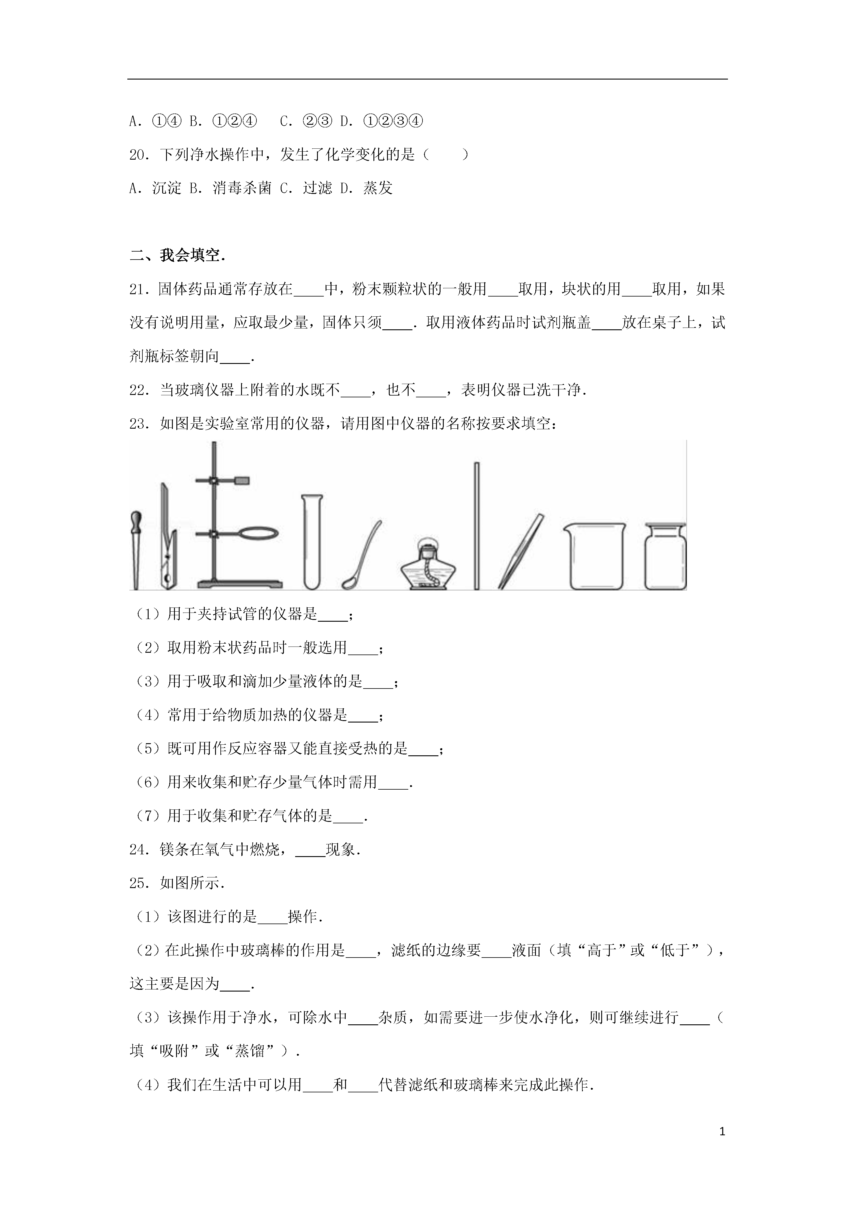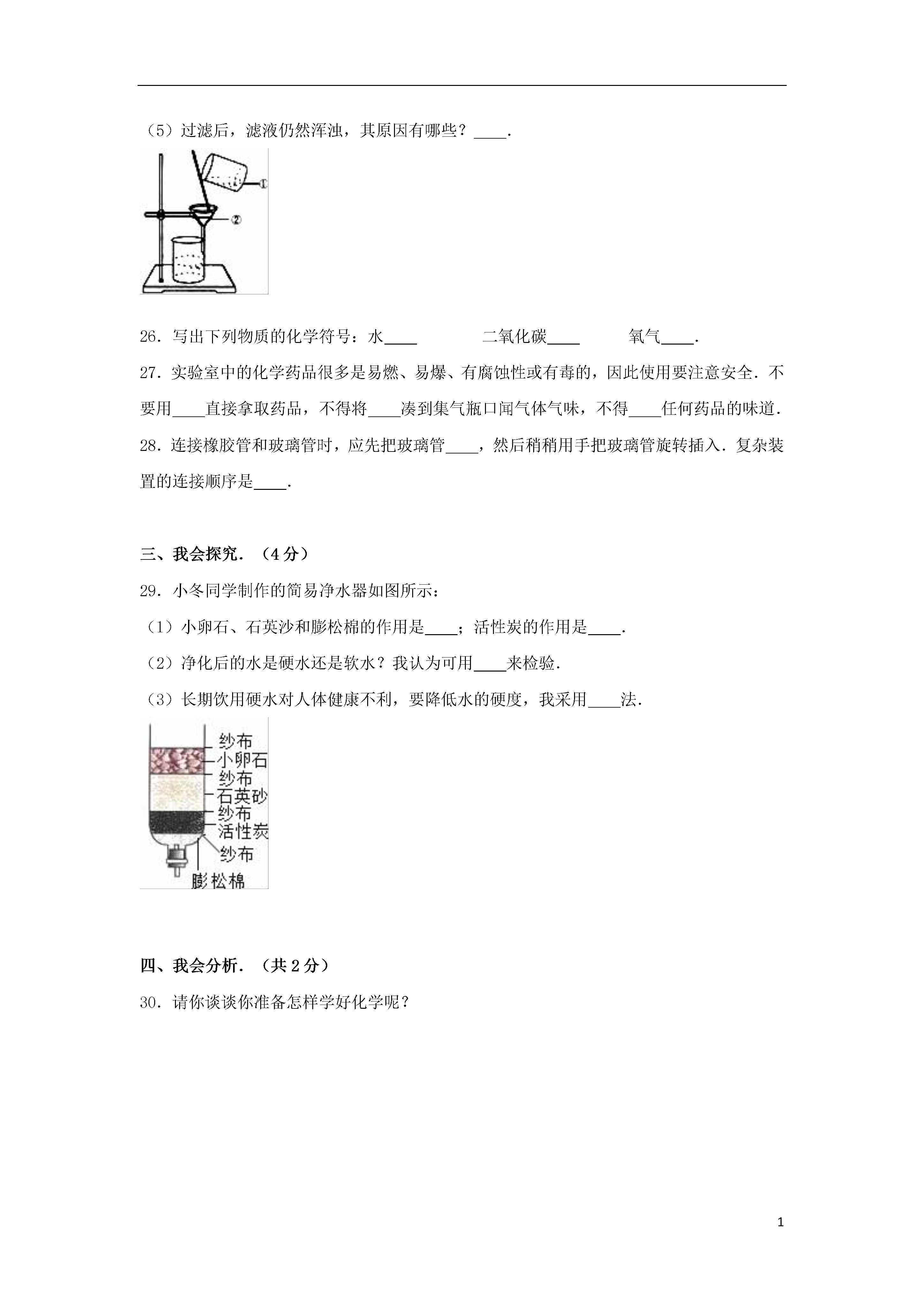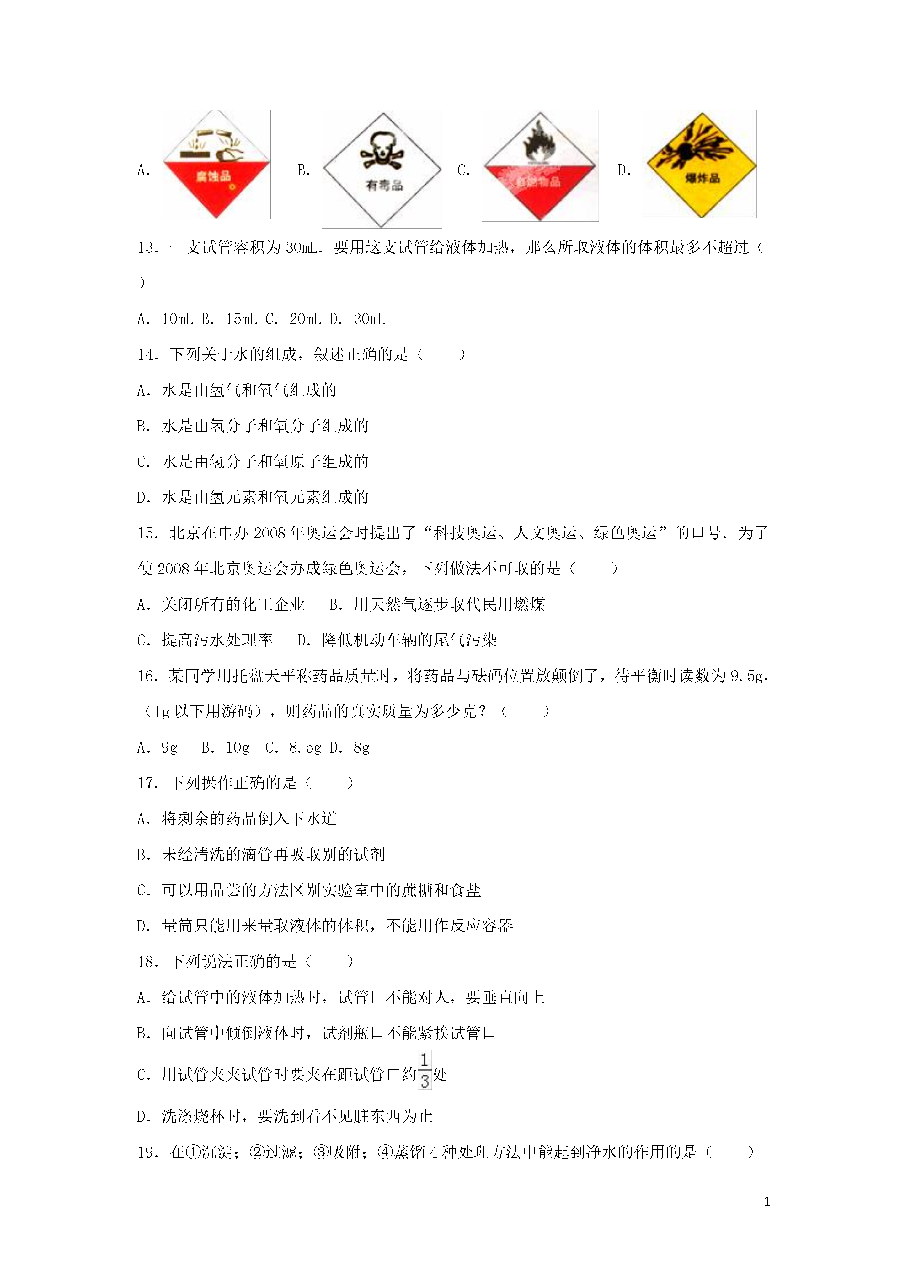 1江苏省宿迁市宿城区耿车中学2016-2017学年九年级(上)第一次质检化学试卷一、我会选择.1.下列不属于化学制品的是()A.光导纤维和玻璃B.钢铁和水泥C.煤和石油D.塑料和橡胶2.下列各组日常生活中发生的变化,都属于化学变化的是()A.酒精燃烧、蜡烛熔化B.冰雪融化、干冰升华C.剩饭变馊、高粱酿酒D.灯泡发光、铁锅生锈3.下列成语或俗语中涉及到化学变化的是()A.滴水成冰B.积沙成塔C.百炼成钢D.铁杵磨成针4.古诗词是古人为我们留下的宝贵精神财富.下列诗句中只涉及物理变化的是()A.野火烧不尽,春风吹又生B.春蚕到死丝方尽,蜡炬成灰泪始干C.只要功夫深,铁杵磨成针D.爆竹声中一岁除,春风送暖入屠苏5.下列变化中,有一种变化与其它三种变化有着本质的区别,你认为这种变化是()A.冰雪融化B.压缩空气C.酒精挥发D.馒头遇碘酒变蓝6.下列变化中,属于物理变化的是()A.火药爆炸B.木头燃烧C.面包发霉D.湿衣服晾干7.下列仪器中,不能作为反应容器的是()A.试管B.烧杯C.量筒D.集气瓶8.实验室中通常用来盛装液体药品的仪器是()A.烧瓶B.细口瓶C.试管D.广口瓶9.下列实验基本操作正确的是()A.检查装置的气密性B.向试管中滴加液体C.熄灭酒精灯D.取用粉末状药品10.胶头滴管在使用过程中不能平放或者倒置的原因是()A.防止试剂腐蚀胶囊B.防止试剂腐蚀皮肤C.防止试剂挥发D.防止液体流出11.在取用液体药品时,若未说明用量,则取用的最少量是()A.0.5mLB.1﹣﹣2mLC.3﹣﹣4mLD.5﹣﹣6mL12.盛放浓硫酸的容器外面应贴上的标志是()A.B.C.D.13.一支试管容积为30mL.要用这支试管给液体加热,那么所取液体的体积最多不超过()A.10mLB.15mLC.20mLD.30mL14.下列关于水的组成,叙述正确的是()A.水是由氢气和氧气组成的B.水是由氢分子和氧分子组成的C.水是由氢分子和氧原子组成的D.水是由氢元素和氧元素组成的15.北京在申办2008年奥运会时提出了“科技奥运、人文奥运、绿色奥运”的口号.为了使2008年北京奥运会办成绿色奥运会,下列做法不可取的是()A.关闭所有的化工企业B.用天然气逐步取代民用燃煤C.提高污水处理率D.降低机动车辆的尾气污染16.某同学用托盘天平称药品质量时,将药品与砝码位置放颠倒了,待平衡时读数为9.5g,(1g以下用游码),则药品的真实质量为多少克?()A.9gB.10gC.8.5gD.8g17.下列操作正确的是()A.将剩余的药品倒入下水道B.未经清洗的滴管再吸取别的试剂C.可以用品尝的方法区别实验室中的蔗糖和食盐D.量筒只能用来量取液体的体积,不能用作反应容器18.下列说法正确的是()A.给试管中的液体加热时,试管口不能对人,要垂直向上B.向试管中倾倒液体时,试剂瓶口不能紧挨试管口C.用试管夹夹试管时要夹在距试管口约处D.洗涤烧杯时,要洗到看不见脏东西为止19.在①沉淀;②过滤;③吸附;④蒸馏4种处理方法中能起到净水的作用的是()A.①④B.①②④C.②③D.①②③④20.下列净水操作中,发生了化学变化的是()A.沉淀B.消毒杀菌C.过滤D.蒸发二、我会填空.21.固体药品通常存放在中,粉末颗粒状的一般用取用,块状的用取用,如果没有说明用量,应取最少量,固体只须.取用液体药品时试剂瓶盖放在桌子上,试剂瓶标签朝向.22.当玻璃仪器上附着的水既不,也不,表明仪器已洗干净.23.如图是实验室常用的仪器,请用图中仪器的名称按要求填空:(1)用于夹持试管的仪器是;(2)取用粉末状药品时一般选用;(3)用于吸取和滴加少量液体的是;(4)常用于给物质加热的仪器是;(5)既可用作反应容器又能直接受热的是;(6)用来收集和贮存少量气体时需用.(7)用于收集和贮存气体的是.24.镁条在氧气中燃烧,现象.25.如图所示.(1)该图进行的是操作.(2)在此操作中玻璃棒的作用是,滤纸的边缘要液面(填“高于”或“低于”),这主要是因为.(3)该操作用于净水,可除水中杂质,如需要进一步使水净化,则可继续进行(填“吸附”或“蒸馏”).(4)我们在生活中可以用和代替滤纸和玻璃棒来完成此操作.(5)过滤后,滤液仍然浑浊,其原因有哪些?.26.写出下列物质的化学符号:水二氧化碳氧气.27.实验室中的化学药品很多是易燃、易爆、有腐蚀性或有毒的,因此使用要注意安全.不要用直接拿取药品,不得将凑到集气瓶口闻气体气味,不得任何药品的味道.28.连接橡胶管和玻璃管时,应先把玻璃管,然后稍稍用手把玻璃管旋转插入