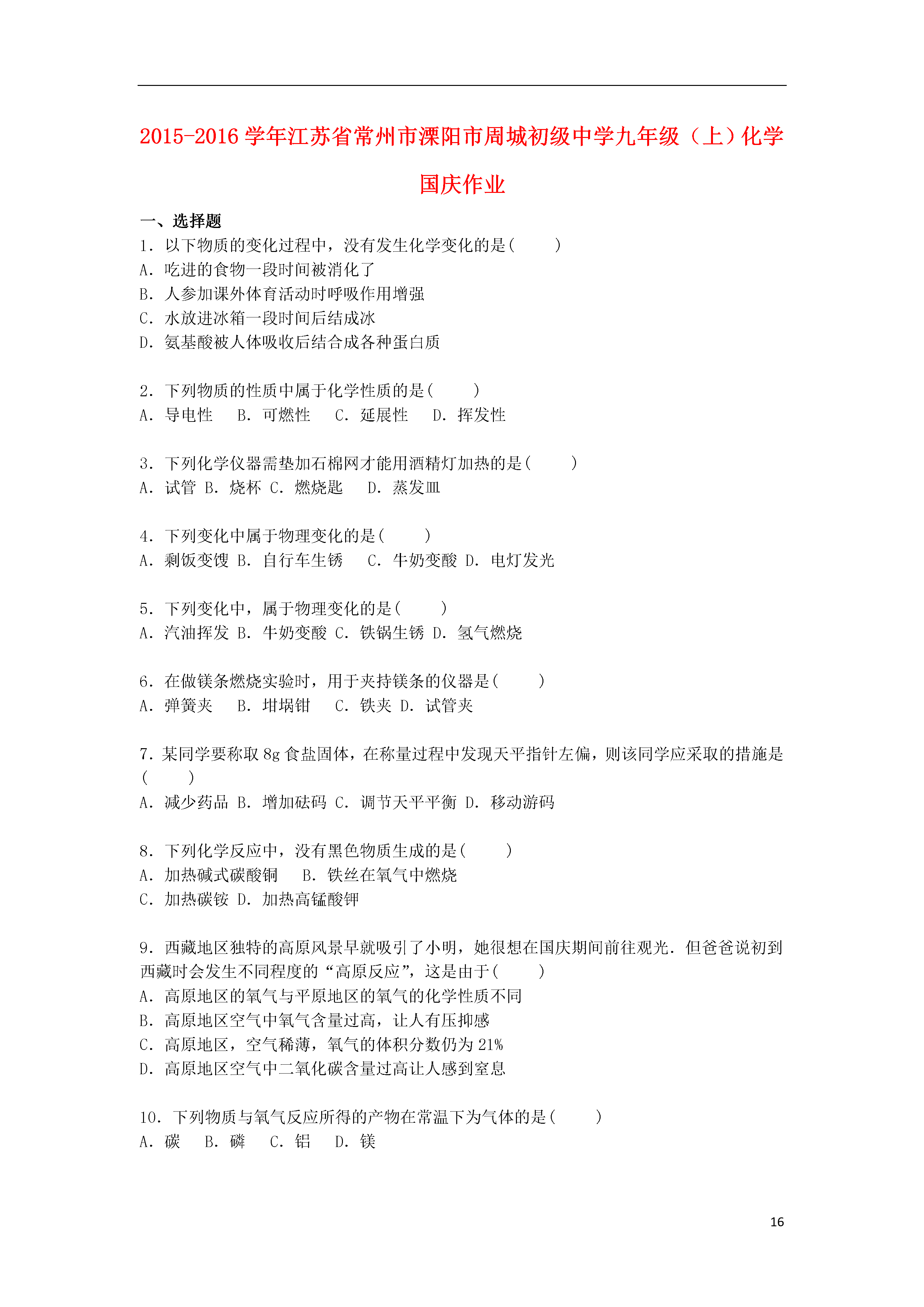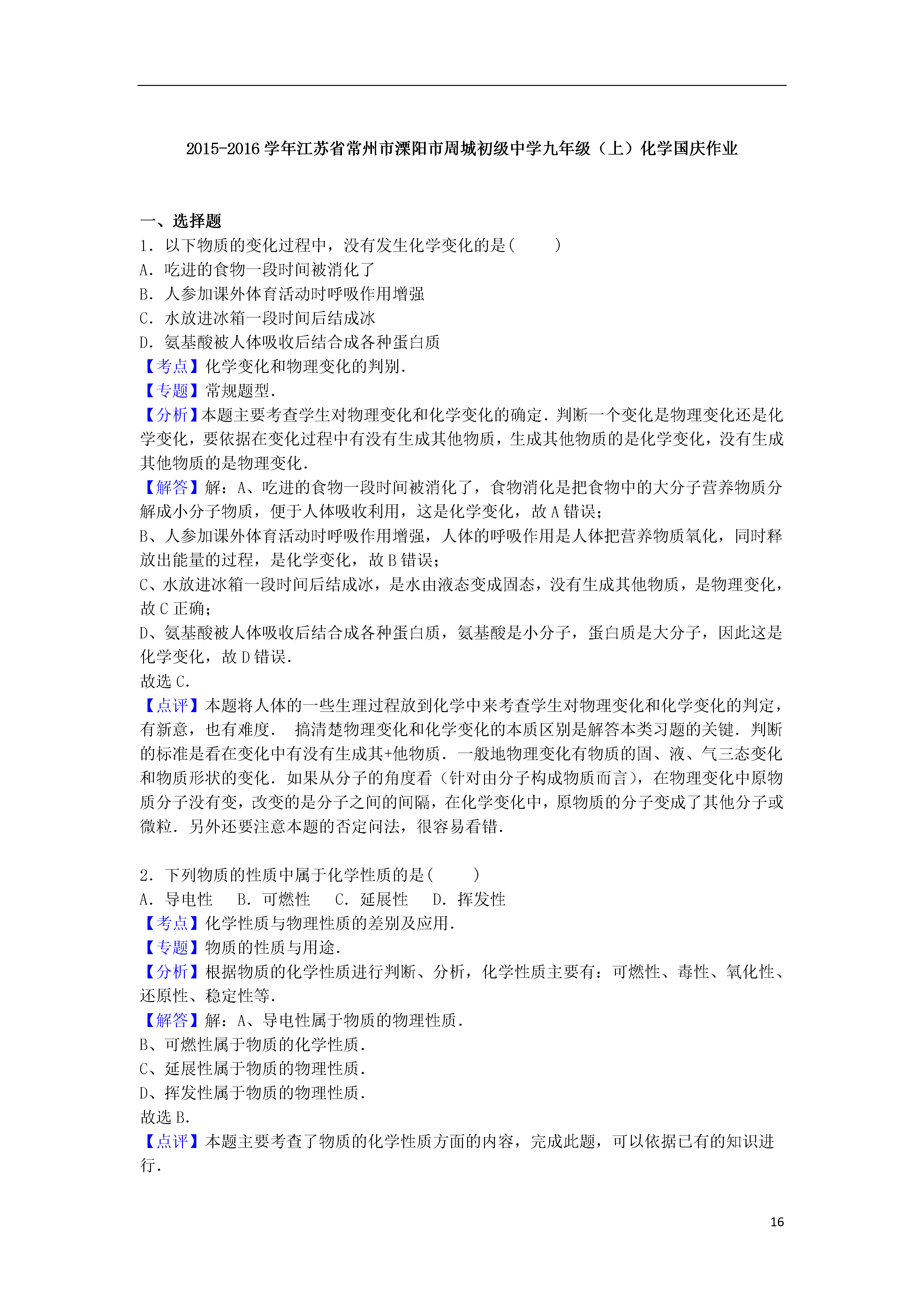 试题-江苏-2016_江苏省常州市溧阳市周城初级中学2016届九年级化学上学期国庆作业(含解析) 新人教版.doc