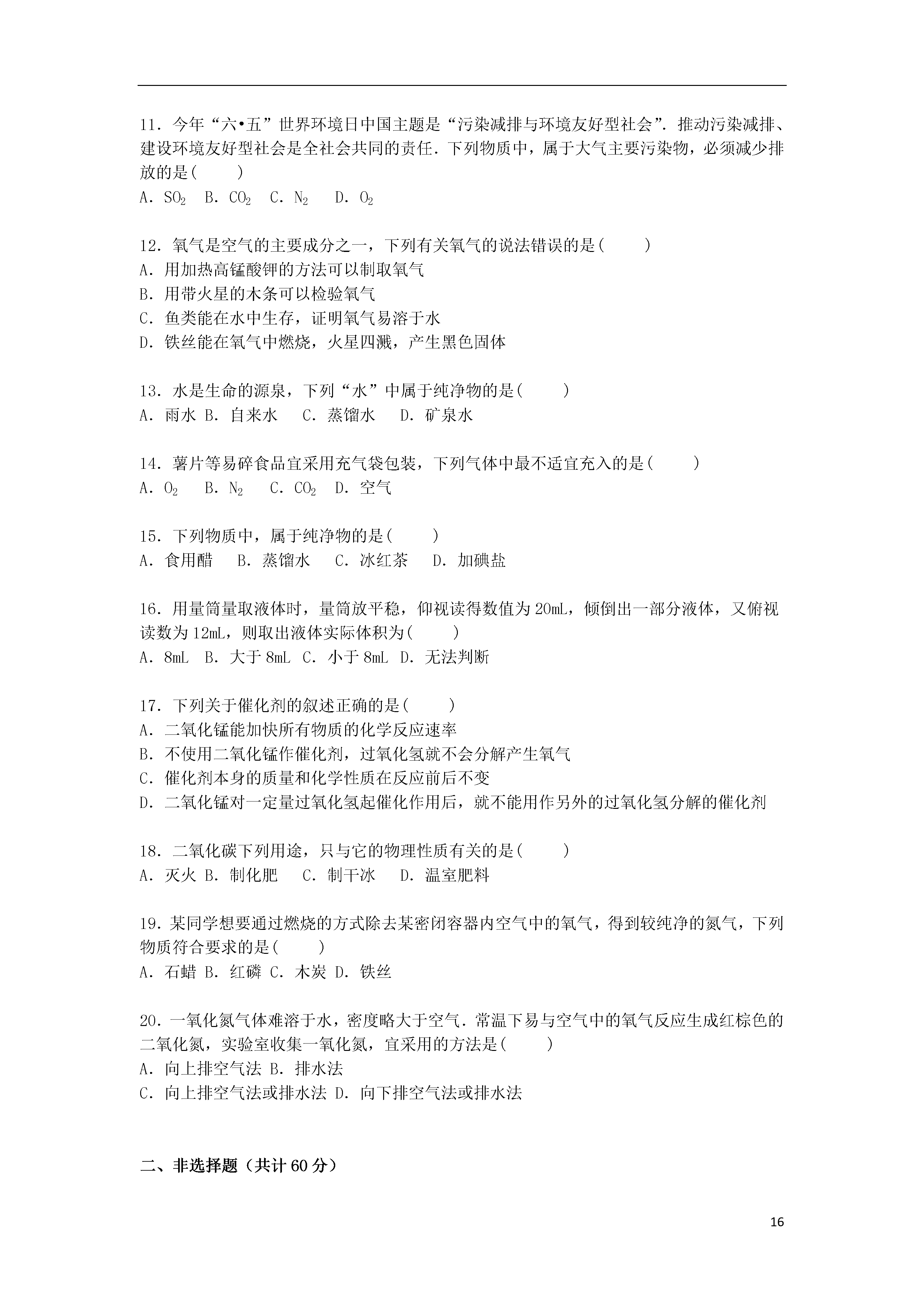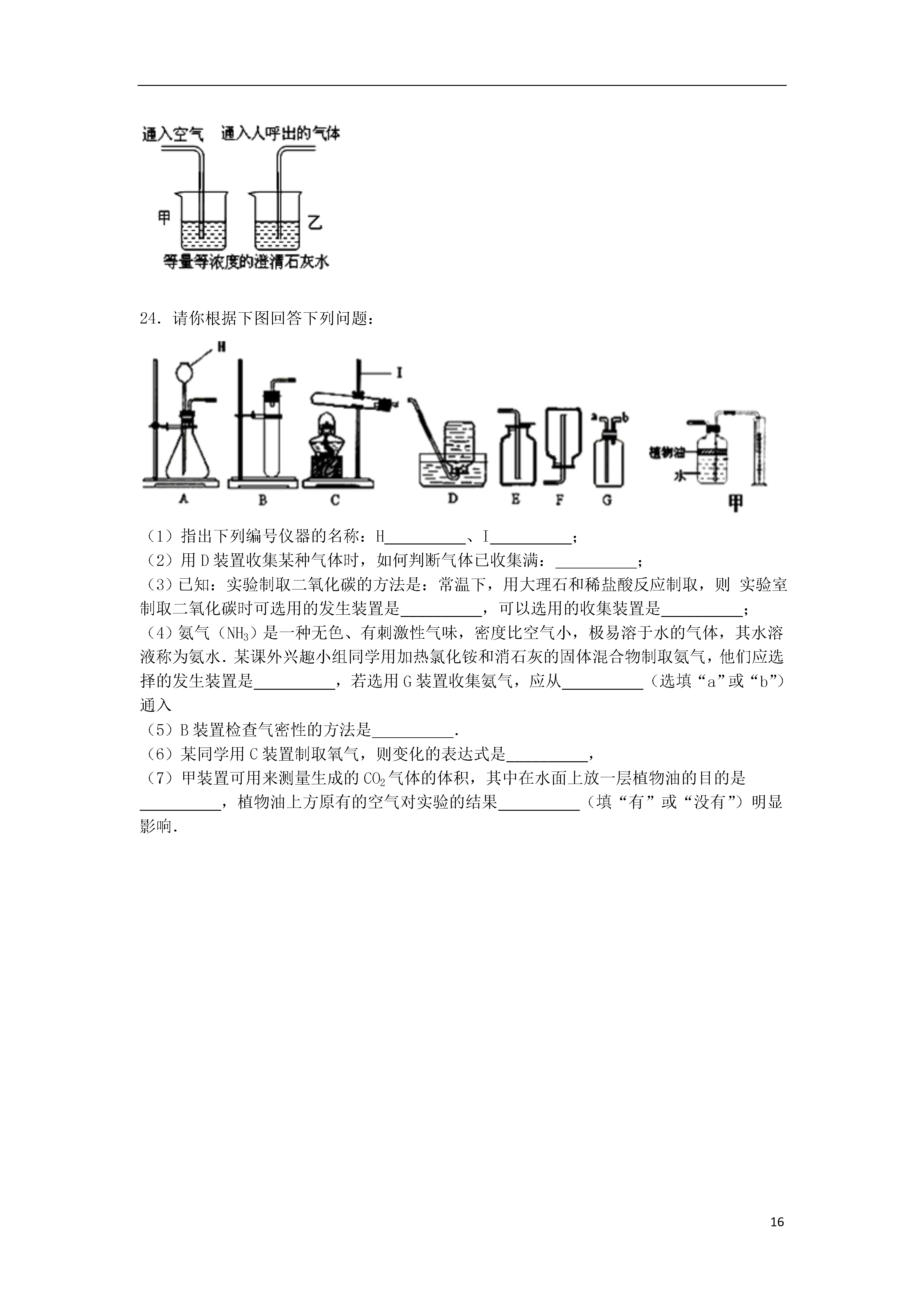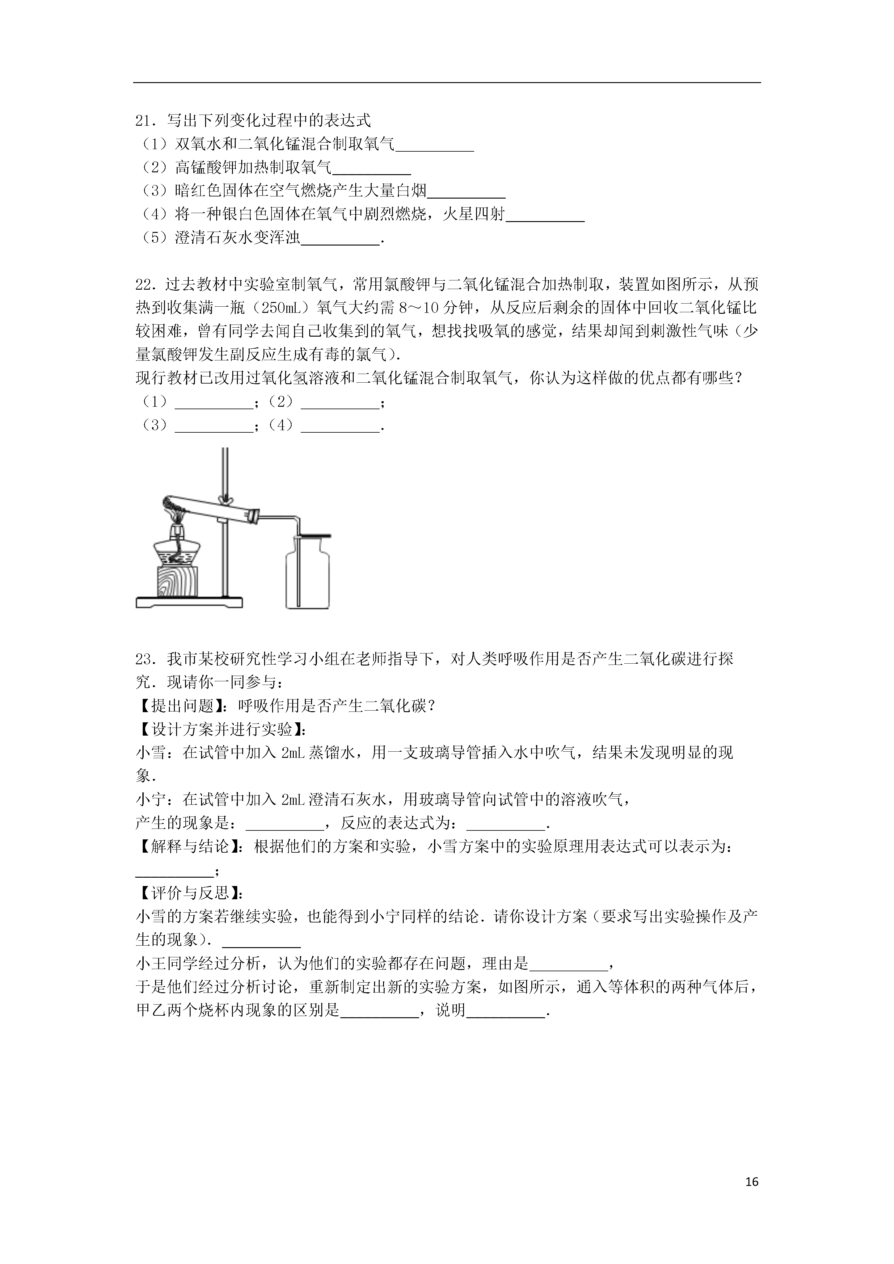 162015-2016学年江苏省常州市溧阳市周城初级中学九年级(上)化学国庆作业一、选择题1.以下物质的变化过程中,没有发生化学变化的是()A.吃进的食物一段时间被消化了B.人参加课外体育活动时呼吸作用增强C.水放进冰箱一段时间后结成冰D.氨基酸被人体吸收后结合成各种蛋白质2.下列物质的性质中属于化学性质的是()A.导电性B.可燃性C.延展性D.挥发性3.下列化学仪器需垫加石棉网才能用酒精灯加热的是()A.试管B.烧杯C.燃烧匙D.蒸发皿4.下列变化中属于物理变化的是()A.剩饭变馊B.自行车生锈C.牛奶变酸D.电灯发光5.下列变化中,属于物理变化的是()A.汽油挥发B.牛奶变酸C.铁锅生锈D.氢气燃烧6.在做镁条燃烧实验时,用于夹持镁条的仪器是()A.弹簧夹B.坩埚钳C.铁夹D.试管夹7.某同学要称取8g食盐固体,在称量过程中发现天平指针左偏,则该同学应采取的措施是()A.减少药品B.增加砝码C.调节天平平衡D.移动游码8.下列化学反应中,没有黑色物质生成的是()A.加热碱式碳酸铜B.铁丝在氧气中燃烧C.加热碳铵D.加热高锰酸钾9.西藏地区独特的高原风景早就吸引了小明,她很想在国庆期间前往观光.但爸爸说初到西藏时会发生不同程度的“高原反应”,这是由于()A.高原地区的氧气与平原地区的氧气的化学性质不同B.高原地区空气中氧气含量过高,让人有压抑感C.高原地区,空气稀薄,氧气的体积分数仍为21%D.高原地区空气中二氧化碳含量过高让人感到窒息10.下列物质与氧气反应所得的产物在常温下为气体的是()A.碳B.磷C.铝D.镁11.今年“六•五”世界环境日中国主题是“污染减排与环境友好型社会”.推动污染减排、建设环境友好型社会是全社会共同的责任.下列物质中,属于大气主要污染物,必须减少排放的是()A.SO2B.CO2C.N2D.O212.氧气是空气的主要成分之一,下列有关氧气的说法错误的是()A.用加热高锰酸钾的方法可以制取氧气B.用带火星的木条可以检验氧气C.鱼类能在水中生存,证明氧气易溶于水D.铁丝能在氧气中燃烧,火星四溅,产生黑色固体13.水是生命的源泉,下列“水”中属于纯净物的是()A.雨水B.自来水C.蒸馏水D.矿泉水14.薯片等易碎食品宜采用充气袋包装,下列气体中最不适宜充入的是()A.O2B.N2C.CO2D.空气15.下列物质中,属于纯净物的是()A.食用醋B.蒸馏水C.冰红茶D.加碘盐16.用量筒量取液体时,量筒放平稳,仰视读得数值为20mL,倾倒出一部分液体,又俯视读数为12mL,则取出液体实际体积为()A.8mLB.大于8mLC.小于8mLD.无法判断17.下列关于催化剂的叙述正确的是()A.二氧化锰能加快所有物质的化学反应速率B.不使用二氧化锰作催化剂,过氧化氢就不会分解产生氧气C.催化剂本身的质量和化学性质在反应前后不变D.二氧化锰对一定量过氧化氢起催化作用后,就不能用作另外的过氧化氢分解的催化剂18.二氧化碳下列用途,只与它的物理性质有关的是()A.灭火B.制化肥C.制干冰D.温室肥料19.某同学想要通过燃烧的方式除去某密闭容器内空气中的氧气,得到较纯净的氮气,下列物质符合要求的是()A.石蜡B.红磷C.木炭D.铁丝20.一氧化氮气体难溶于水,密度略大于空气.常温下易与空气中的氧气反应生成红棕色的二氧化氮,实验室收集一氧化氮,宜采用的方法是()A.向上排空气法B.排水法C.向上排空气法或排水法D.向下排空气法或排水法二、非选择题(共计60分)21.写出下列变化过程中的表达式(1)双氧水和二氧化锰混合制取氧气__________(2)高锰酸钾加热制取氧气__________(3)暗红色固体在空气燃烧产生大量白烟__________(4)将一种银白色固体在氧气中剧烈燃烧,火星四射__________(5)澄清石灰水变浑浊__________.22.过去教材中实验室制氧气,常用氯酸钾与二氧化锰混合加热制取,装置如图所示,从预热到收集满一瓶(250mL)氧气大约需8~10分钟,从反应后剩余的固体中回收二氧化锰比较困难,曾有同学去闻自己收集到的氧气,想找找吸氧的感觉,结果却闻到刺激性气味(少量氯酸钾发生副反应生成有毒的氯气).现行教材已改用过氧化氢溶液和二氧化锰混合制取氧气,你认为这样做的优点都有哪些?(1)__________;(2)__________;(3)__________;(4)__________.23.我市某校研究性学习小组在老师指导下,对人类呼吸作用是否产生二氧化碳进行探究.现请你一同参与:【提出问题】: