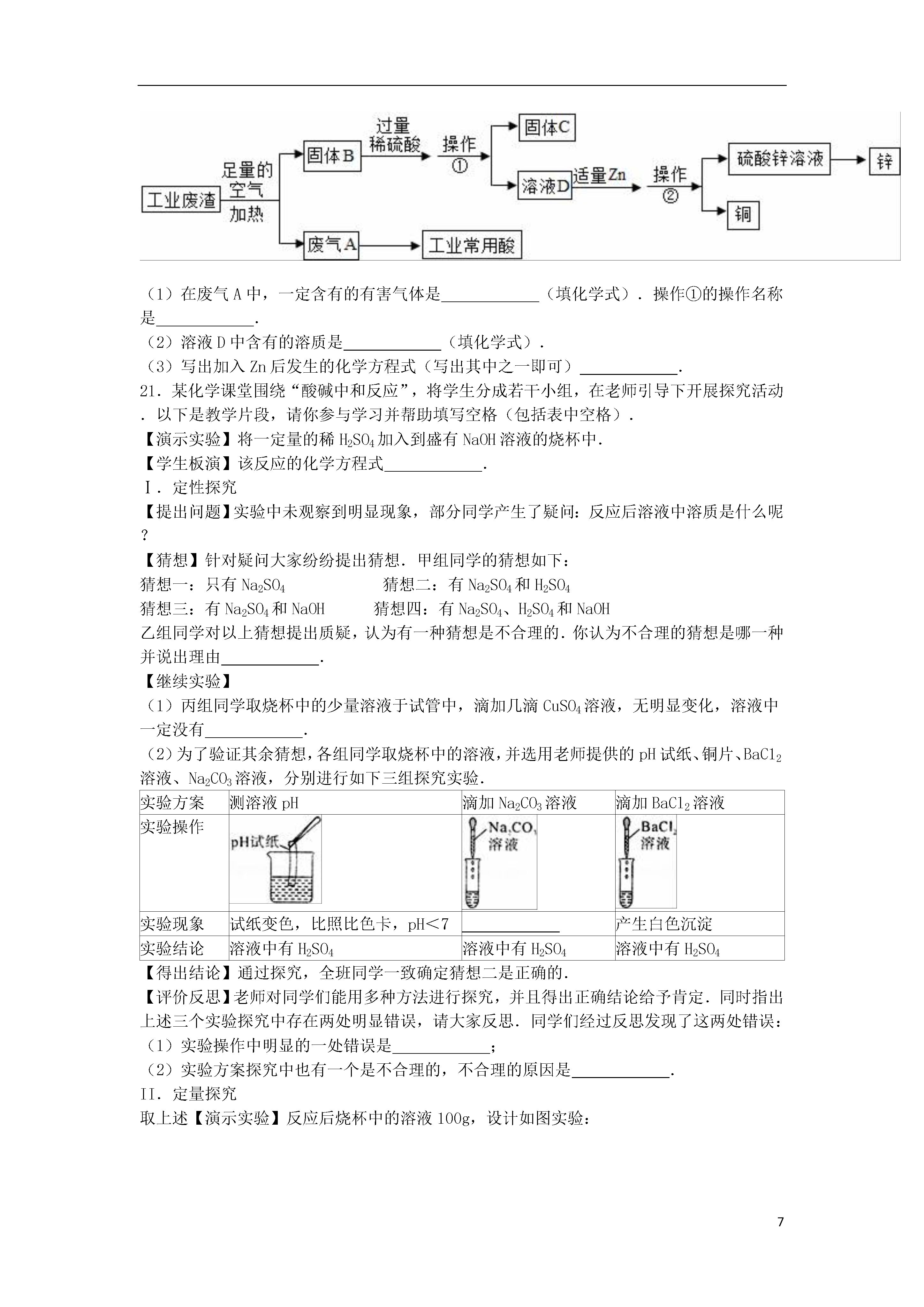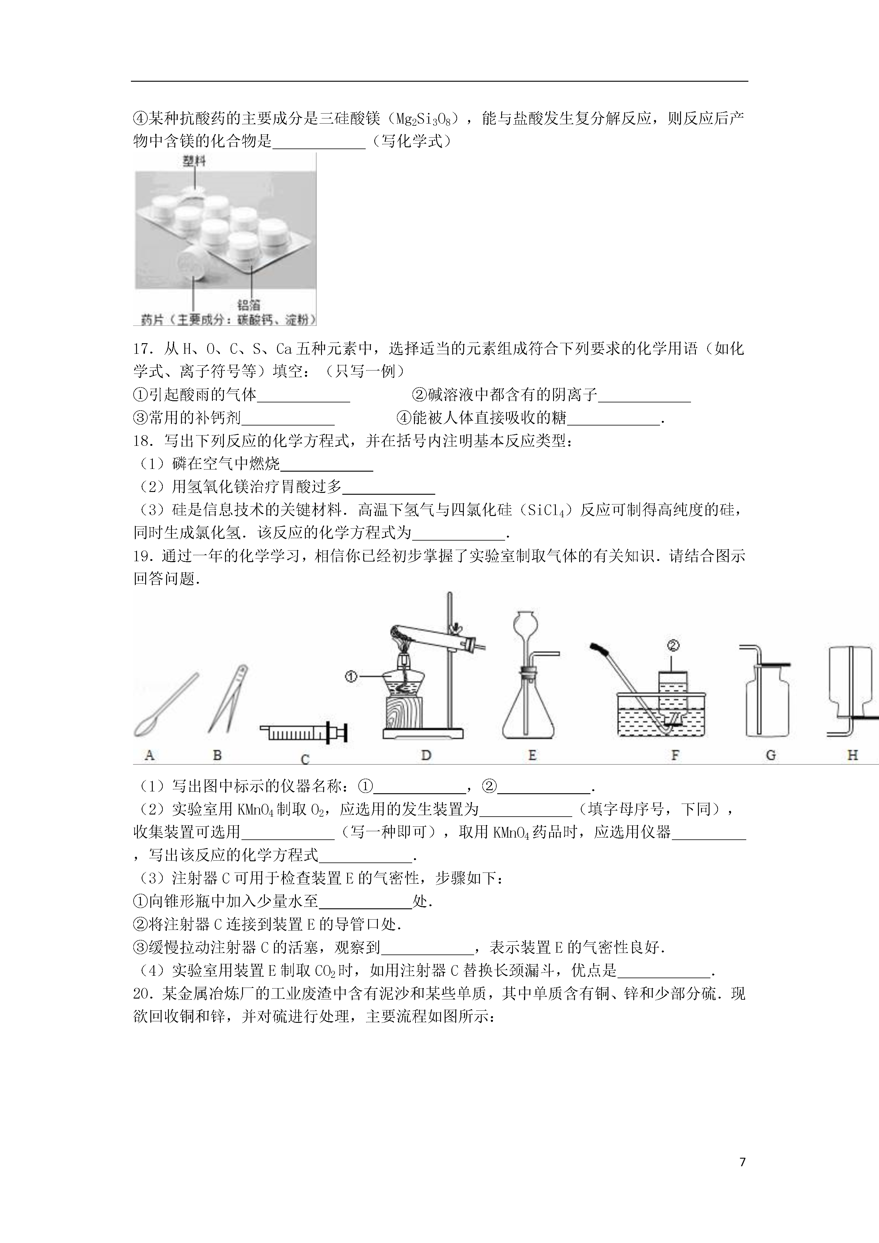 72015-2016学年江苏省无锡市南菁高级中学实验学校九年级(下)第一次月考化学试卷一、单项选择题(本题包括15小题,每题只有1个选项符合题意,每题1分,共15分)1.下列变化过程中既有物理变化又有化学变化的是()A.活性炭吸附冰箱中的异味B.干冰汽化C.点燃蜡烛D.分离液态空气制取氧气2.下列叙述错误的是()A.金属汞由汞原子直接构成B.分子在不停地运动C.水分子保持水的化学性质D.原子不可再分3.如图所示实验操作正确的是()A.B.C.D.4.大蒜具有一定的抗病功能和食疗价值,大蒜新素(C6H10S3)是其有效成分之一.下列关于大蒜新素的说法正确的是()A.C,H,S元素质量比为6:10:3B.属于无机化合物C.一个分子中含有三个硫原子D.相对分子质量为178g5.化学是一门以实验为基础的科学.下列有关实验现象的描述中正确的是()A.红磷在氧气中燃烧发出耀眼的白光,产生大量的白雾B.硫在空气中燃烧发出蓝紫色火焰,生成二氧化硫C.打开浓盐酸的试剂瓶盖,瓶口有白烟D.镁条中加入稀盐酸有大量气泡产生,试管外壁发烫6.下列物质中,属于有机合成材料的是()A.塑料B.棉花C.羊毛D.蚕丝7.X、Y、Z三种金属中,只有Z不能和稀盐酸反应;将Y放入X的化合物溶液中,Y表面有X析出.则X、Y、Z三种金属的活动性顺序为()A.Z>Y>XB.Y>X>ZC.Y>Z>XD.X>Z>Y8.下列物质的化学式、俗名和类别全部正确的是()A.烧碱Na2CO3盐B.酒精C2H5OH氧化物C.熟石灰Ca(OH)2碱D.小苏打NaHCO3酸9.下列物质的鉴别方法错误的是()A.用燃着的木条鉴别N2和CO2B.用酚酞试液鉴别稀盐酸和碳酸钠溶液C.用点燃法鉴别棉纤维和羊毛纤维D.用CO2鉴别烧碱溶液和澄清石灰水10.将铁粉加到一定量AgNO3、Cu(NO3)2的混合溶液中,等充分反应后过滤,向滤渣中加入稀盐酸,有气体产生,则滤渣含有的物质是()A.铁、铜、银B.铜和银C.铁和银D.铁和铜11.善于梳理化学知识,能使你头脑更聪明.以下有错误的一组()A化学变化中的能量变化B化肥知识蜡烛燃烧﹣﹣放热反应碳还原二氧化碳﹣﹣吸热反应钾肥作用﹣﹣增强抗寒、抗旱能力使用事项﹣﹣不能与碱性物质共用C元素与人体健康D化学原理解释生活常识缺锌﹣﹣易引起食欲不振,发育不良缺钙﹣﹣易骨质疏松或得佝偻病用氢氧化钠去油污﹣﹣与油脂反应用汽油除去油污﹣﹣溶解作用A.AB.BC.CD.D12.如图是甲、乙两种固体物质的溶解度曲线.下列说法正确的是()A.甲的溶解度随温度变化比乙小B.t2℃时甲的饱和溶液的溶质质量分数小于30%C.t1℃时,甲、乙饱和溶液的溶质质量分数不相等D.可采用降低温度的方法使乙的饱和溶液变为不饱和溶液13.下列各组离子在水中能大量共存的是()A.Na+、H+、Cl﹣、CO32﹣﹣B.Na+、K+、NO3﹣、Cl﹣C.H+、Na+、OH﹣、SO42﹣D.Ag+、Ca2+、Cl﹣、NO3﹣14.下列各组转化中,一定条件下均能一步实现的组合是()A.①②B.①③C.②③D.①②③15.如表中,除去物质所含杂质的方法正确的是()选项物质所含杂质除去杂质的方法AH2气体HCl气体先通过NaOH溶液,再通过浓硫酸BNaCl溶液Na2CO3加入稀硫酸至不再产生气泡CCO气体CO2气体通过灼热的Fe2O3DH2SO4溶液HCl加入AgNO3溶液,过滤A.AB.BC.CD.D二、解答题(共6小题,满分35分)16.化学与生活、生产关系密切.请回答下列问题:①如图为某抗酸药的实物图.该图标示的物质中,含有的金属元素是(写出一种即可).②沾染了油污的衣物用洗洁精就可以洗干净,这是利用了洗洁精的作用.③生产加碘盐通常是在食盐中加入碘酸钾(KIO3),碘酸钾中碘元素的化合价为价.④某种抗酸药的主要成分是三硅酸镁(Mg2Si3O8),能与盐酸发生复分解反应,则反应后产物中含镁的化合物是(写化学式)17.从H、O、C、S、Ca五种元素中,选择适当的元素组成符合下列要求的化学用语(如化学式、离子符号等)填空:(只写一例)①引起酸雨的气体②碱溶液中都含有的阴离子③常用的补钙剂④能被人体直接吸收的糖.18.写出下列反应的化学方程式,并在括号内注明基本反应类型:(1)磷在空气中燃烧(2)用氢氧化镁治疗胃酸过多(3)硅是信息技术的关键材料.高温下氢气与四氯化硅(SiCl4)反应可制得高纯度的硅,同时生成氯化氢.该反应的化学方程式为.19.通过一年的化学学习,相信你已经初步掌握了实验室制取气体的有关知识.请结合图示回答问题.(1)写出图中标示的仪器名称: