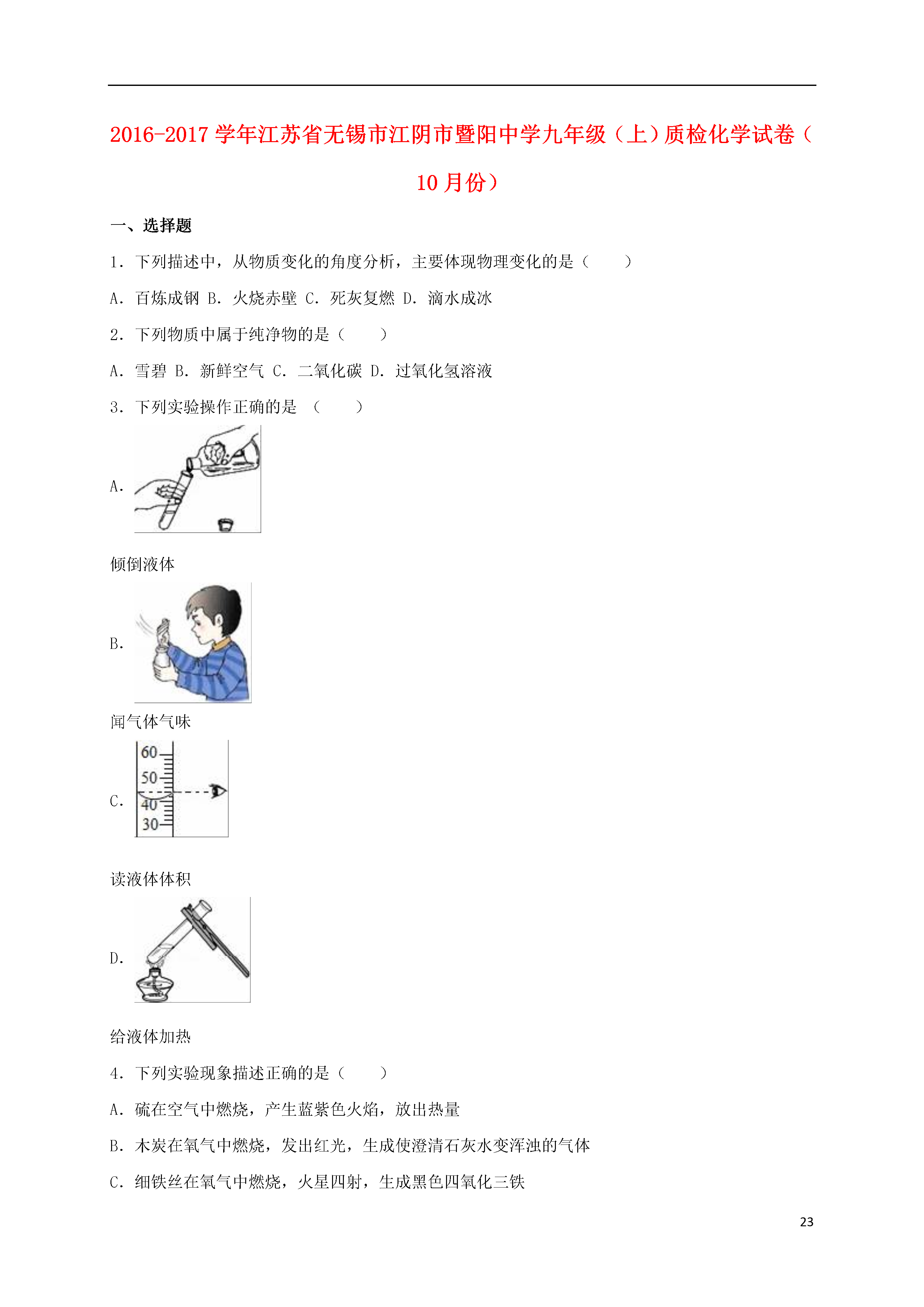 试题-江苏-2016_江苏省无锡市江阴市暨阳中学2017届九年级化学上学期10月质检试卷(含解析) 新人教版.doc