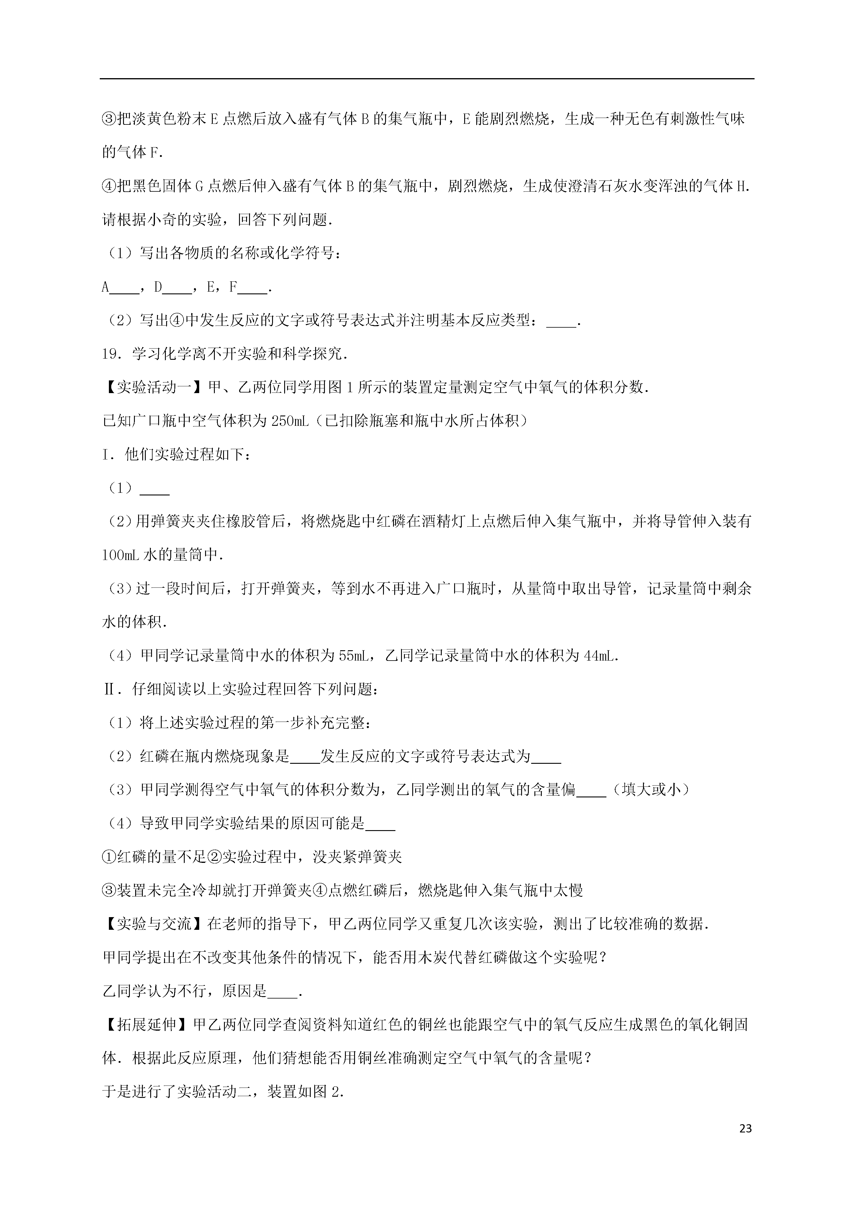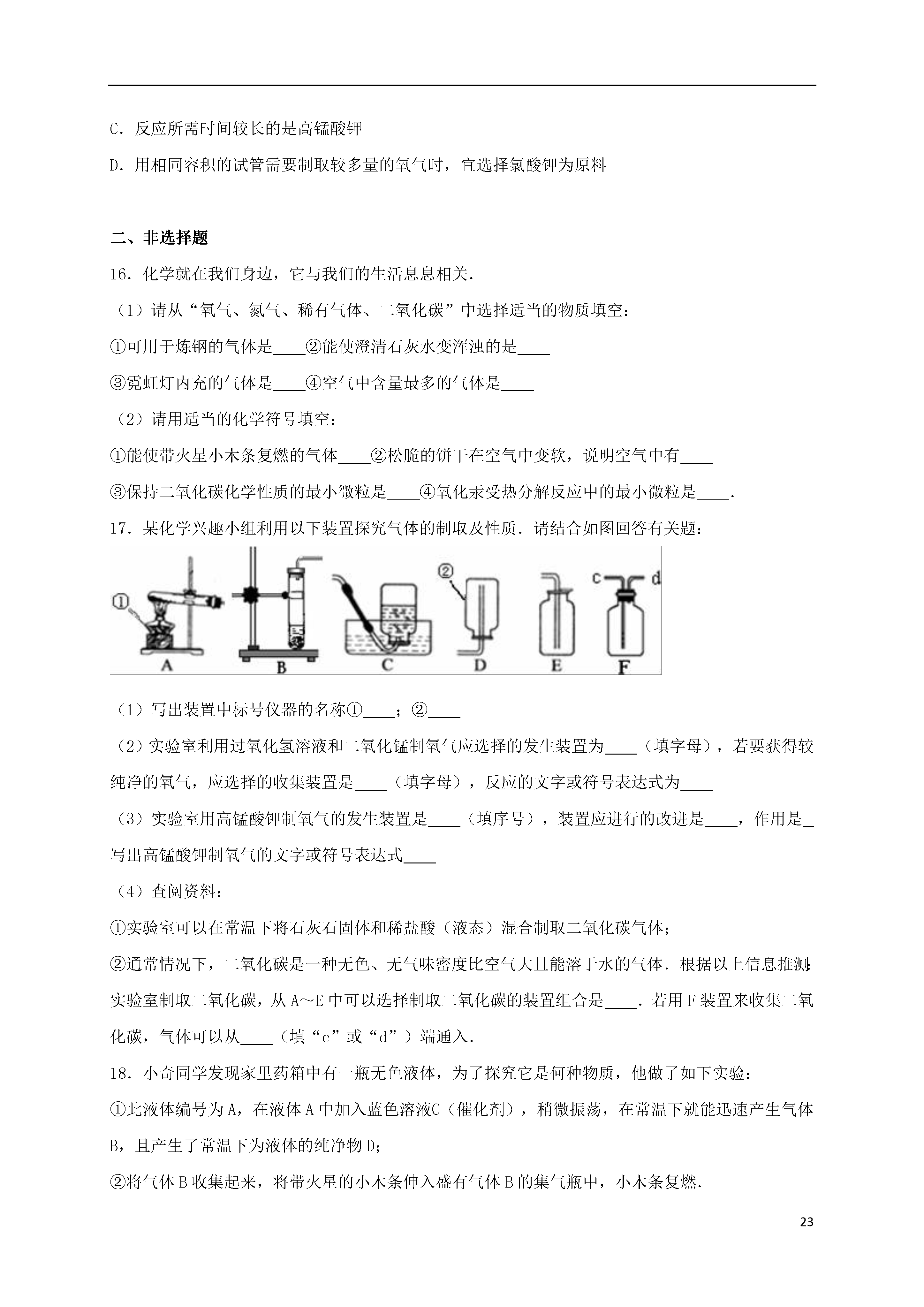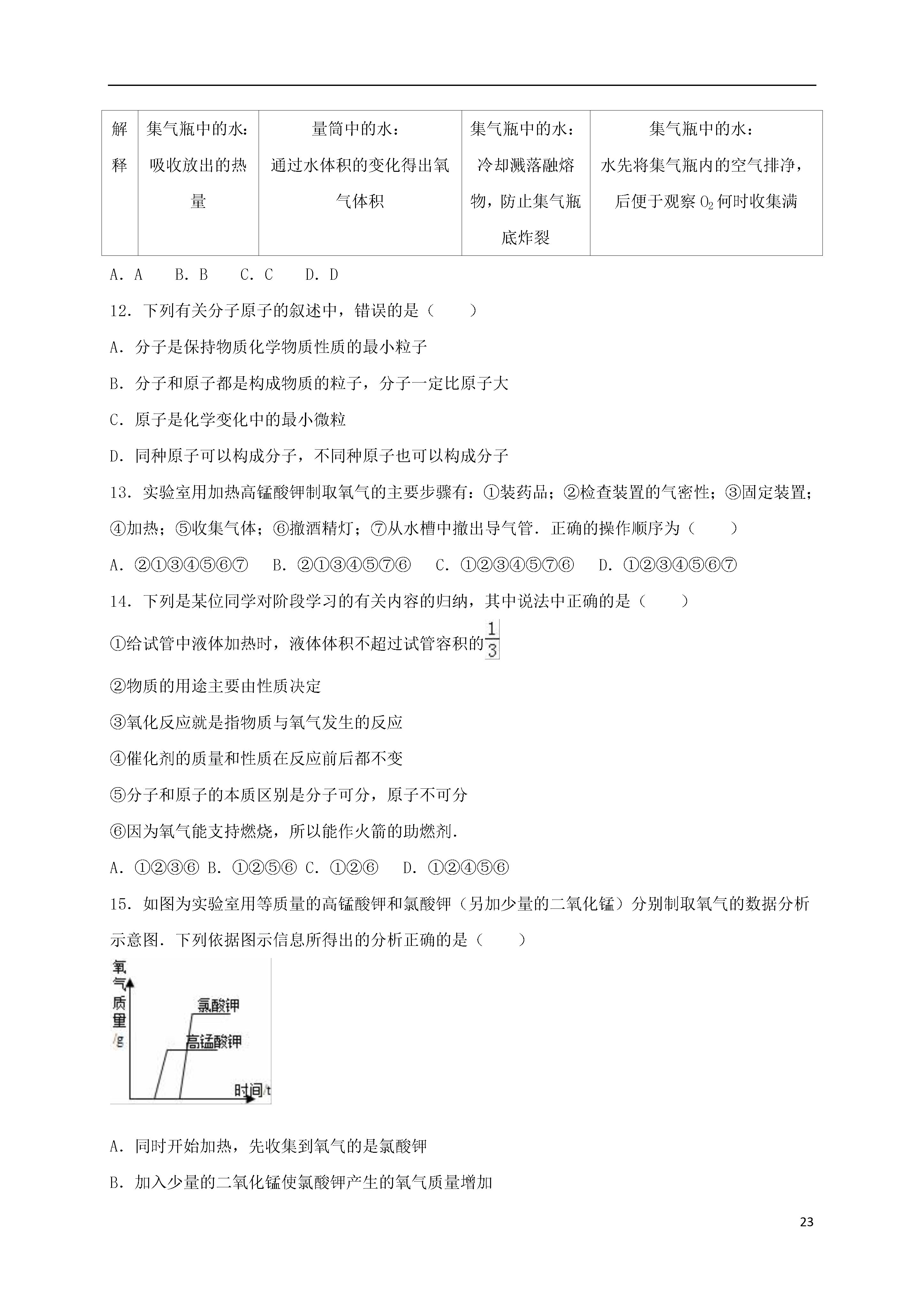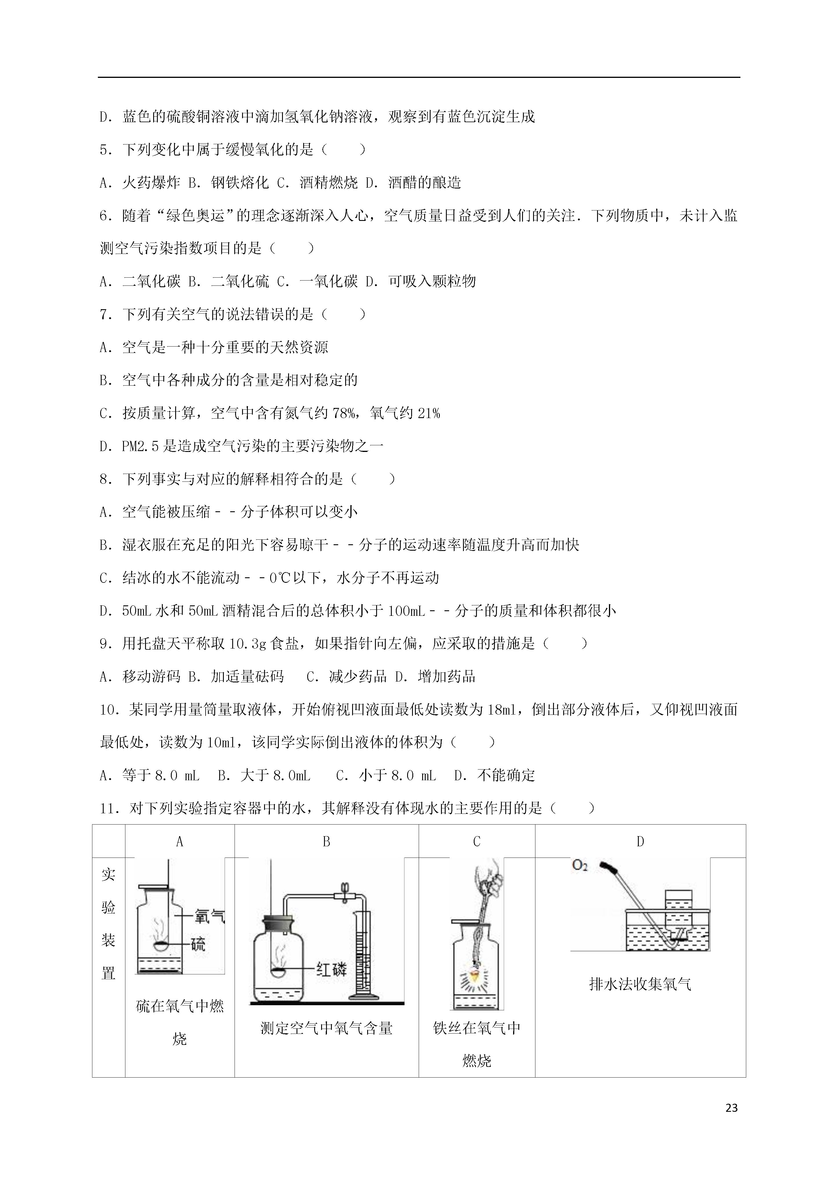232016-2017学年江苏省无锡市江阴市暨阳中学九年级(上)质检化学试卷(10月份)一、选择题1.下列描述中,从物质变化的角度分析,主要体现物理变化的是()A.百炼成钢B.火烧赤壁C.死灰复燃D.滴水成冰2.下列物质中属于纯净物的是()A.雪碧B.新鲜空气C.二氧化碳D.过氧化氢溶液3.下列实验操作正确的是()A.倾倒液体B.闻气体气味C.读液体体积D.给液体加热4.下列实验现象描述正确的是()A.硫在空气中燃烧,产生蓝紫色火焰,放出热量B.木炭在氧气中燃烧,发出红光,生成使澄清石灰水变浑浊的气体C.细铁丝在氧气中燃烧,火星四射,生成黑色四氧化三铁D.蓝色的硫酸铜溶液中滴加氢氧化钠溶液,观察到有蓝色沉淀生成5.下列变化中属于缓慢氧化的是()A.火药爆炸B.钢铁熔化C.酒精燃烧D.酒醋的酿造6.随着“绿色奥运”的理念逐渐深入人心,空气质量日益受到人们的关注.下列物质中,未计入监测空气污染指数项目的是()A.二氧化碳B.二氧化硫C.一氧化碳D.可吸入颗粒物7.下列有关空气的说法错误的是()A.空气是一种十分重要的天然资源B.空气中各种成分的含量是相对稳定的C.按质量计算,空气中含有氮气约78%,氧气约21%D.PM2.5是造成空气污染的主要污染物之一8.下列事实与对应的解释相符合的是()A.空气能被压缩﹣﹣分子体积可以变小B.湿衣服在充足的阳光下容易晾干﹣﹣分子的运动速率随温度升高而加快C.结冰的水不能流动﹣﹣0℃以下,水分子不再运动D.50mL水和50mL酒精混合后的总体积小于100mL﹣﹣分子的质量和体积都很小9.用托盘天平称取10.3g食盐,如果指针向左偏,应采取的措施是()A.移动游码B.加适量砝码C.减少药品D.增加药品10.某同学用量筒量取液体,开始俯视凹液面最低处读数为18ml,倒出部分液体后,又仰视凹液面最低处,读数为10ml,该同学实际倒出液体的体积为()A.等于8.0mLB.大于8.0mLC.小于8.0mLD.不能确定11.对下列实验指定容器中的水,其解释没有体现水的主要作用的是()ABCD实验装置硫在氧气中燃烧测定空气中氧气含量铁丝在氧气中燃烧排水法收集氧气解释集气瓶中的水:吸收放出的热量量筒中的水:通过水体积的变化得出氧气体积集气瓶中的水:冷却溅落融熔物,防止集气瓶底炸裂集气瓶中的水:水先将集气瓶内的空气排净,后便于观察O2何时收集满A.AB.BC.CD.D12.下列有关分子原子的叙述中,错误的是()A.分子是保持物质化学物质性质的最小粒子B.分子和原子都是构成物质的粒子,分子一定比原子大C.原子是化学变化中的最小微粒D.同种原子可以构成分子,不同种原子也可以构成分子13.实验室用加热高锰酸钾制取氧气的主要步骤有:①装药品;②检查装置的气密性;③固定装置;④加热;⑤收集气体;⑥撤酒精灯;⑦从水槽中撤出导气管.正确的操作顺序为()A.②①③④⑤⑥⑦B.②①③④⑤⑦⑥C.①②③④⑤⑦⑥D.①②③④⑤⑥⑦14.下列是某位同学对阶段学习的有关内容的归纳,其中说法中正确的是()①给试管中液体加热时,液体体积不超过试管容积的②物质的用途主要由性质决定③氧化反应就是指物质与氧气发生的反应④催化剂的质量和性质在反应前后都不变⑤分子和原子的本质区别是分子可分,原子不可分⑥因为氧气能支持燃烧,所以能作火箭的助燃剂.A.①②③⑥B.①②⑤⑥C.①②⑥D.①②④⑤⑥15.如图为实验室用等质量的高锰酸钾和氯酸钾(另加少量的二氧化锰)分别制取氧气的数据分析示意图.下列依据图示信息所得出的分析正确的是()A.同时开始加热,先收集到氧气的是氯酸钾B.加入少量的二氧化锰使氯酸钾产生的氧气质量增加C.反应所需时间较长的是高锰酸钾D.用相同容积的试管需要制取较多量的氧气时,宜选择氯酸钾为原料二、非选择题16.化学就在我们身边,它与我们的生活息息相关.(1)请从“氧气、氮气、稀有气体、二氧化碳”中选择适当的物质填空:①可用于炼钢的气体是②能使澄清石灰水变浑浊的是③霓虹灯内充的气体是④空气中含量最多的气体是(2)请用适当的化学符号填空:①能使带火星小木条复燃的气体②松脆的饼干在空气中变软,说明空气中有③保持二氧化碳化学性质的最小微粒是④氧化汞受热分解反应中的最小微粒是.17.某化学兴趣小组利用以下装置探究气体的制取及性质.请结合如图回答有关题:(1)写出装置中标号仪器的名称①;②(2)实验室利用过氧化氢溶液和二氧化锰制氧气应选择的发生装置为(填字母),若要获得较纯净的氧气,应选择的收集装置是(填字母),反应的文字或符号表达式为(3)实验室用高锰酸钾制氧气的发生