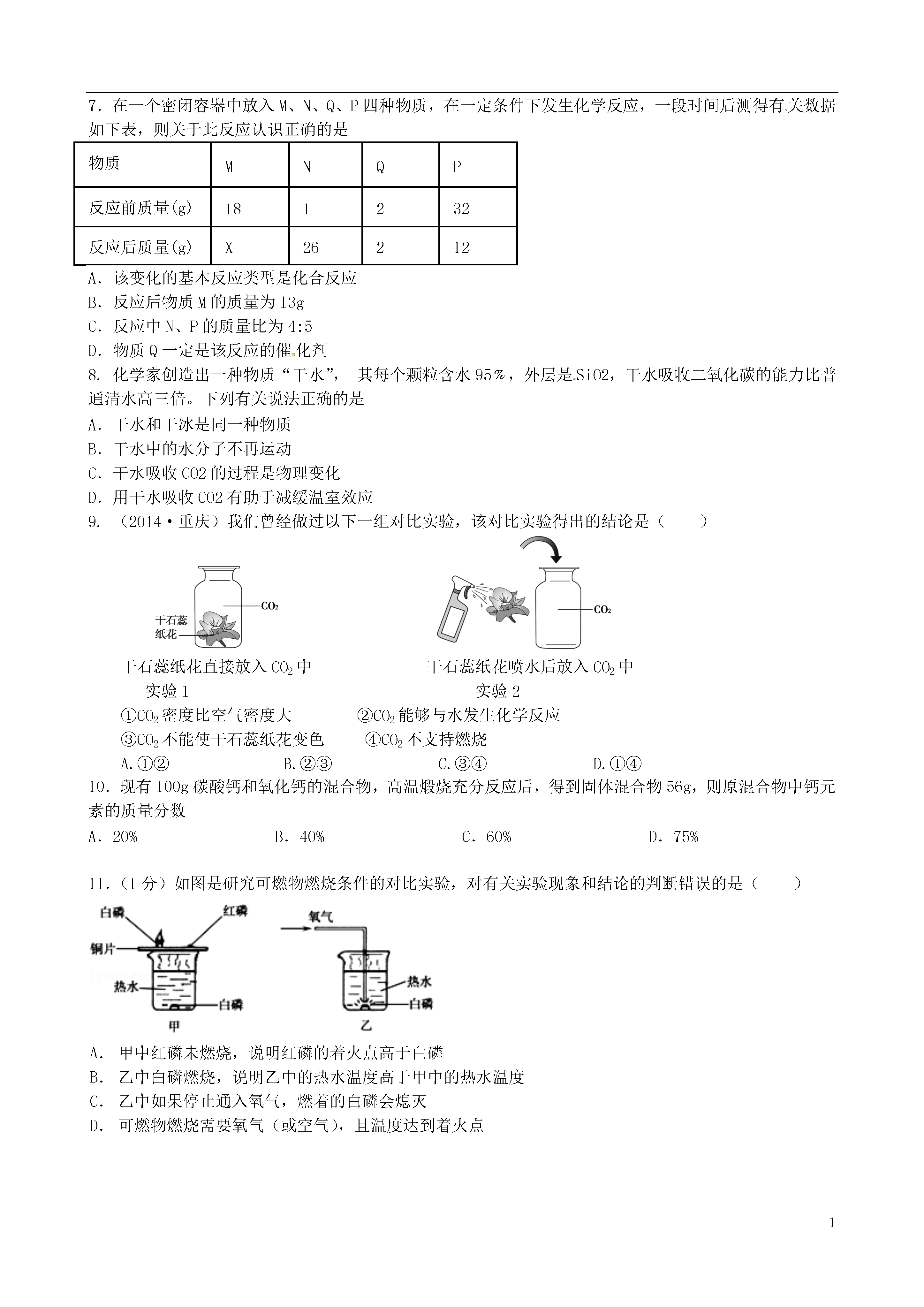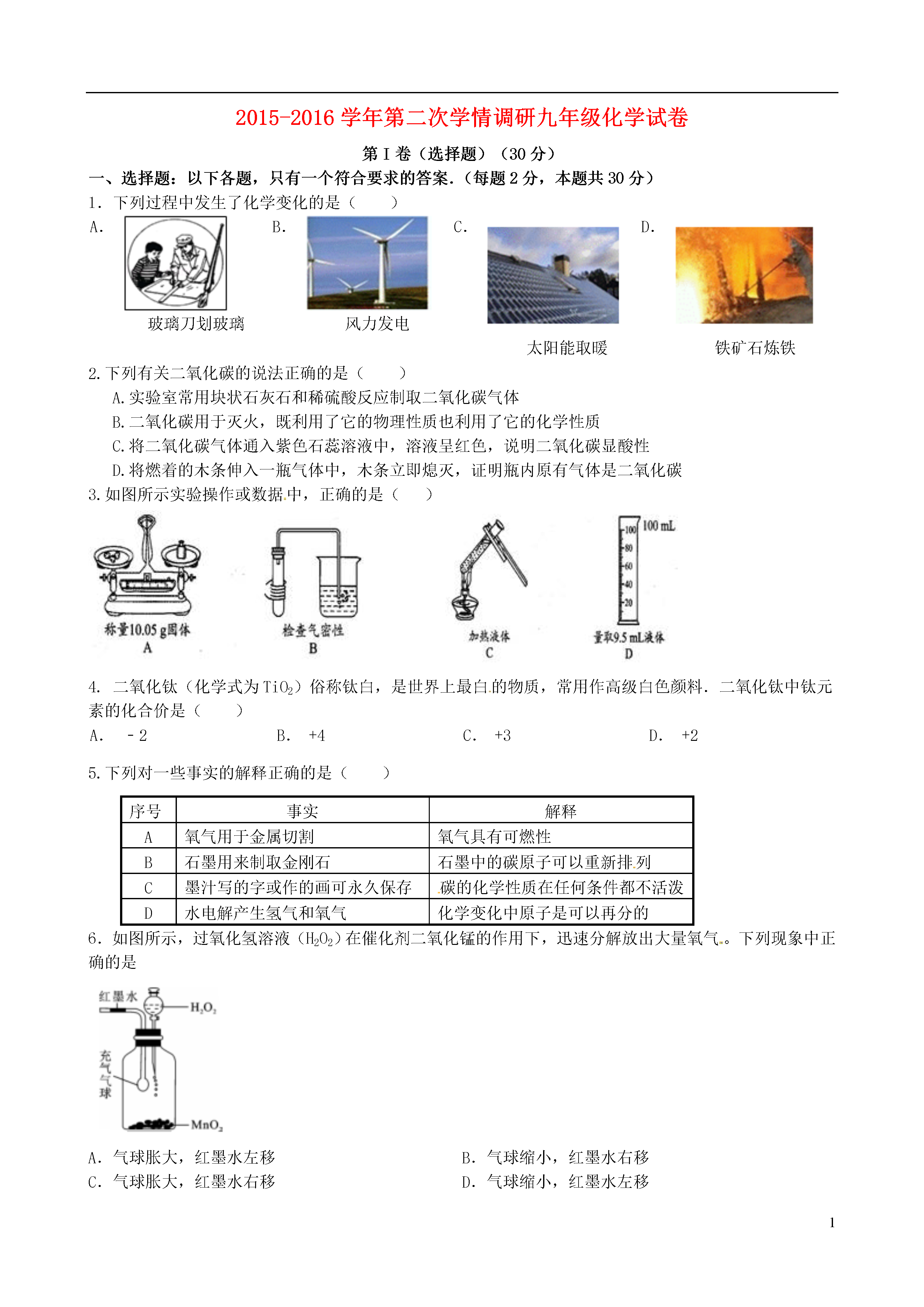 12015-2016学年第二次学情调研九年级化学试卷第I卷(选择题)(30分)一、选择题:以下各题,只有一个符合要求的答案.(每题2分,本题共30分)1.下列过程中发生了化学变化的是()A.玻璃刀划玻璃B.风力发电C.太阳能取暖D.铁矿石炼铁2.下列有关二氧化碳的说法正确的是()A.实验室常用块状石灰石和稀硫酸反应制取二氧化碳气体B.二氧化碳用于灭火,既利用了它的物理性质也利用了它的化学性质C.将二氧化碳气体通入紫色石蕊溶液中,溶液呈红色,说明二氧化碳显酸性D.将燃着的木条伸入一瓶气体中,木条立即熄灭,证明瓶内原有气体是二氧化碳3.如图所示实验操作或数据中,正确的是()4.二氧化钛(化学式为TiO2)俗称钛白,是世界上最白的物质,常用作高级白色颜料.二氧化钛中钛元素的化合价是()A.﹣2B.+4C.+3D.+25.下列对一些事实的解释正确的是()序号事实解释A氧气用于金属切割氧气具有可燃性B石墨用来制取金刚石石墨中的碳原子可以重新排列C墨汁写的字或作的画可永久保存碳的化学性质在任何条件都不活泼D水电解产生氢气和氧气化学变化中原子是可以再分的6.如图所示,过氧化氢溶液(H2O2)在催化剂二氧化锰的作用下,迅速分解放出大量氧气。下列现象中正确的是A.气球胀大,红墨水左移B.气球缩小,红墨水右移C.气球胀大,红墨水右移D.气球缩小,红墨水左移7.在一个密闭容器中放入M、N、Q、P四种物质,在一定条件下发生化学反应,一段时间后测得有关数据如下表,则关于此反应认识正确的是物质MNQP反应前质量(g)181232反应后质量(g)X26212A.该变化的基本反应类型是化合反应B.反应后物质M的质量为l3gC.反应中N、P的质量比为4:5D.物质Q一定是该反应的催化剂8.化学家创造出一种物质“干水”,其每个颗粒含水95﹪,外层是SiO2,干水吸收二氧化碳的能力比普通清水高三倍。下列有关说法正确的是A.干水和干冰是同一种物质B.干水中的水分子不再运动C.干水吸收CO2的过程是物理变化D.用干水吸收CO2有助于减缓温室效应9.(2014·重庆)我们曾经做过以下一组对比实验,该对比实验得出的结论是()干石蕊纸花直接放入CO2中干石蕊纸花喷水后放入CO2中实验1实验2①CO2密度比空气密度大②CO2能够与水发生化学反应③CO2不能使干石蕊纸花变色④CO2不支持燃烧A.①②B.②③C.③④D.①④10.现有100g碳酸钙和氧化钙的混合物,高温煅烧充分反应后,得到固体混合物56g,则原混合物中钙元素的质量分数A.20%B.40%C.60%D.75%11.(1分)如图是研究可燃物燃烧条件的对比实验,对有关实验现象和结论的判断错误的是()A.甲中红磷未燃烧,说明红磷的着火点高于白磷B.乙中白磷燃烧,说明乙中的热水温度高于甲中的热水温度C.乙中如果停止通入氧气,燃着的白磷会熄灭D.可燃物燃烧需要氧气(或空气),且温度达到着火点12.科学家发现半胱氨酸(一种氨基酸)能增强艾滋病毒感染者的免疫能力,半胱氨酸的化学式为C3H7NSO2,下列说法正确的是()A.半胱氨酸属于一种化合物B.半胱氨酸的相对分子质量为131C.半胱氨酸中碳元素、硫元素和氧元素的质量比为9:8:8D.半胱氨酸中硫元素的质量分数最大13.恰当的安全措施能减少生命财产损失.下列事故处理措施正确的是()A.图书档案失火用水基型灭火器灭火B.油锅着火,立即盖上锅盖C.高层住房内着火,立即打开所有门窗D.煤气泄漏,立即打开排气扇的电源开关14.关于一氧化碳和二氧化碳的叙述正确的是()A.一氧化碳和二氧化碳均有可燃性B.室内放一盆水能防止一氧化碳中毒C.CO可以在O2中燃烧D.用闻气味的方法能够区别CO2和CO15.有甲、乙、丙三种金属,如果将甲、乙、丙分别投入到CuSO4溶液中,一段时间后,甲、丙表面出现红色物质,乙没有明显现象;再将大小相同的甲、丙分别放到相同的盐酸中,甲、丙均产生气泡,但甲产生气泡的速度明显快于丙,则甲、乙、丙三种金属的活动性顺序是A.甲>丙>乙B.丙>乙>甲C.甲>乙>丙D.丙>甲>乙第II卷(非选择题)(40分)二、填空题16.(6分)化学知识与生活联系密切。请从①氧气②氮气③晶体硅·④钛合金⑤酒精⑥一氧化碳中选择适当物质,并用其序号填空:(1)食品包装袋中充填的气体是___________;(2)可用于制造航天器的是_______________;(3)急救病人时可供呼吸的是_____________;(4)制造计算机芯片____________。(5)_______________可用于人工降雨(6)_______________是实验室中常用的燃料17.(4
