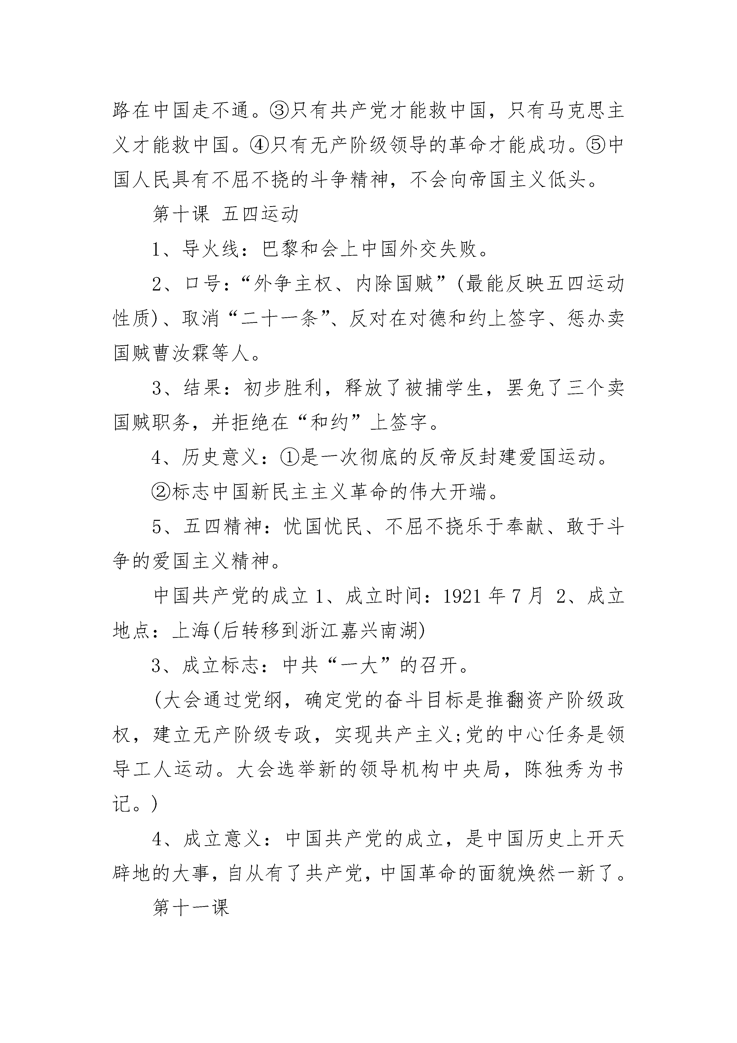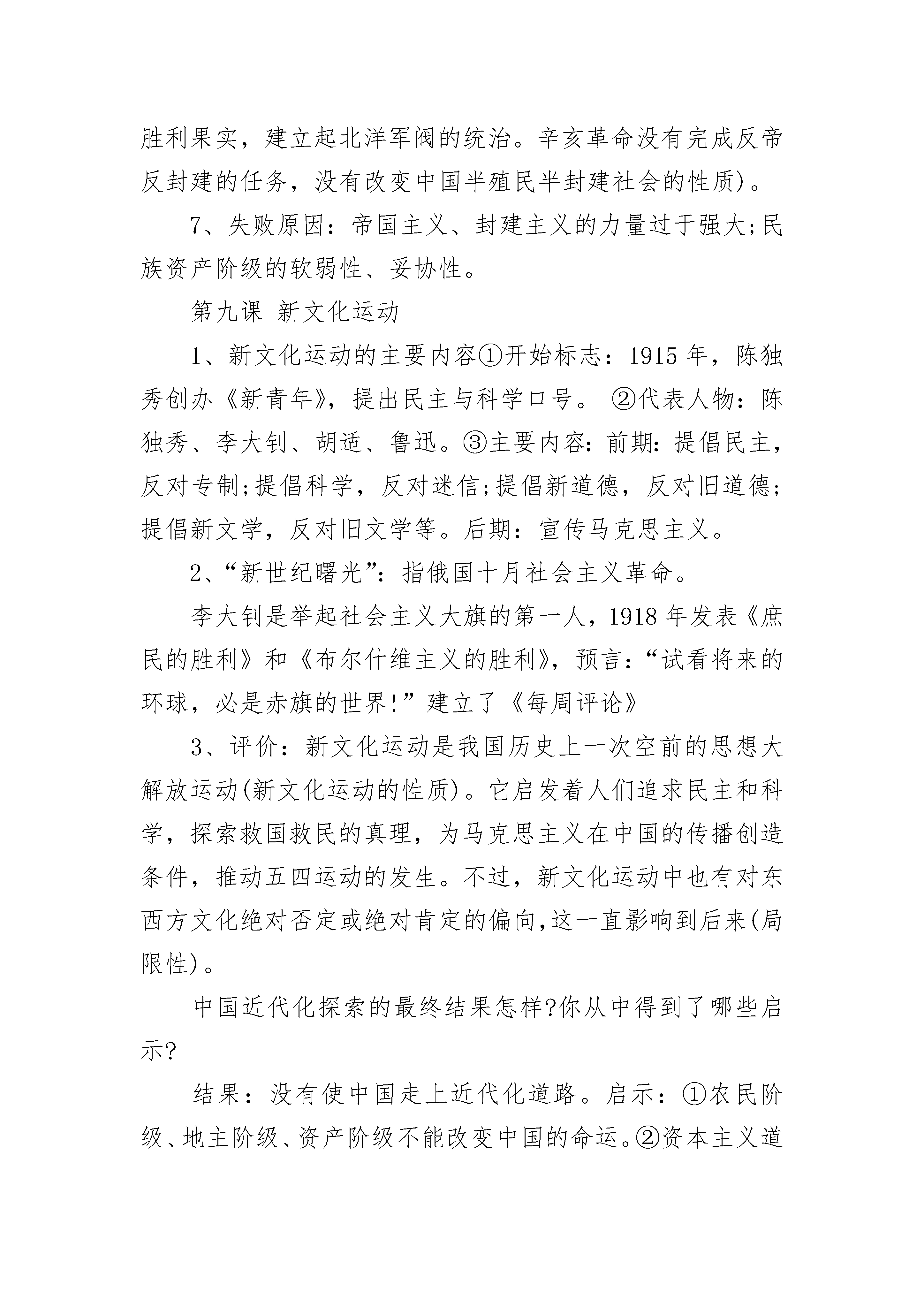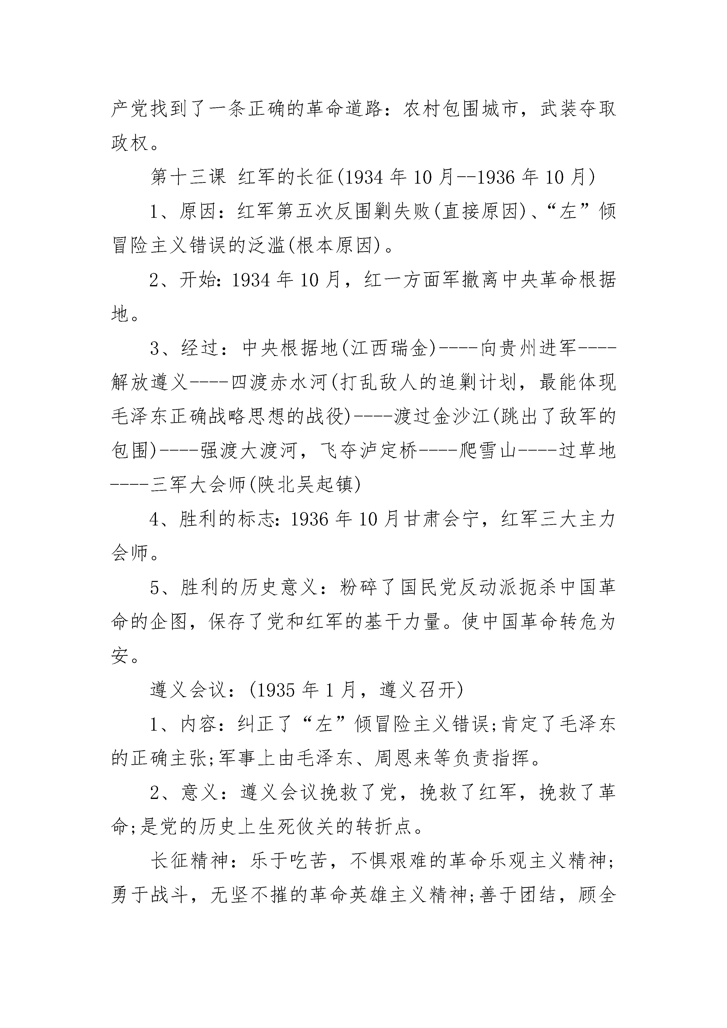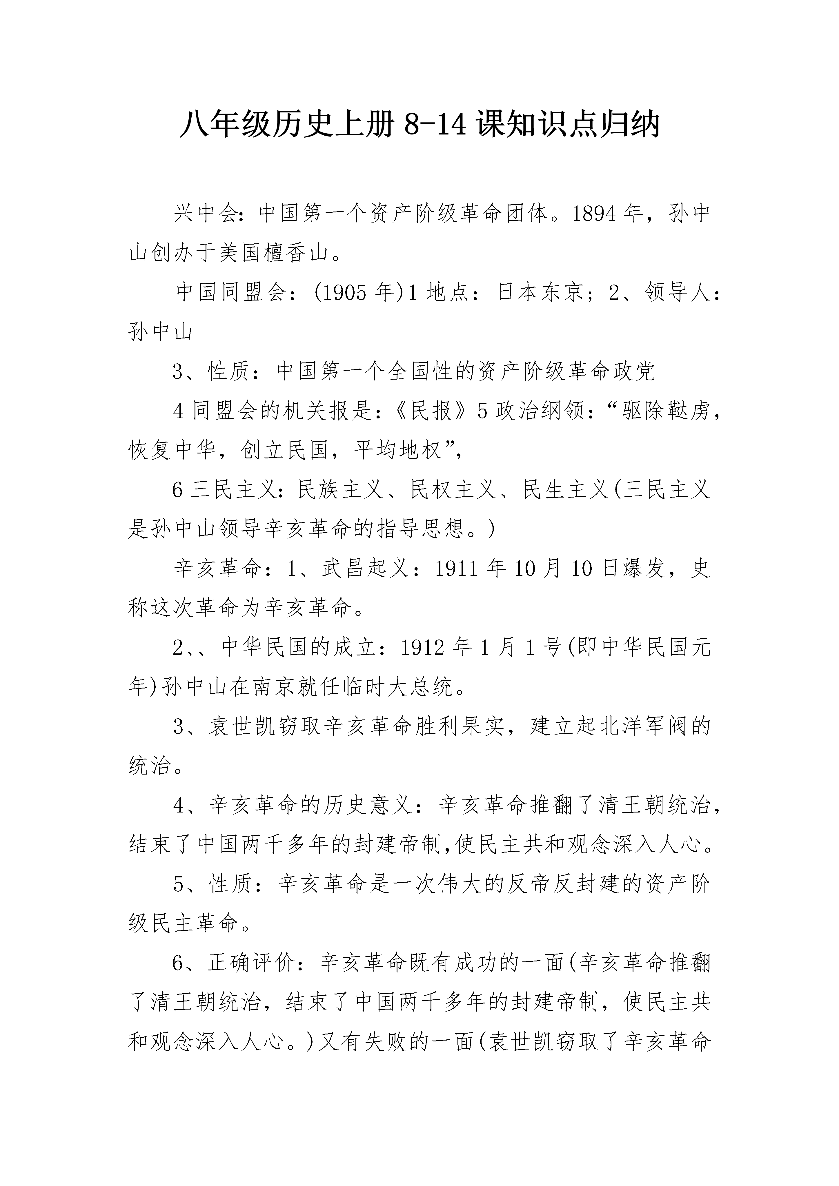 八年级历史上册8-14课知识点归纳兴中会:中国第一个资产阶级革命团体。1894年,孙中山创办于美国檀香山。中国同盟会:(1905年)1地点:日本东京;2、领导人:孙中山3、性质:中国第一个全国性的资产阶级革命政党4同盟会的机关报是:《民报》5政治纲领:“驱除鞑虏,恢复中华,创立民国,平均地权”,6三民主义:民族主义、民权主义、民生主义(三民主义是孙中山领导辛亥革命的指导思想。)辛亥革命:1、武昌起义:1911年10月10日爆发,史称这次革命为辛亥革命。2、、中华民国的成立:1912年1月1号(即中华民国元年)孙中山在南京就任临时大总统。3、袁世凯窃取辛亥革命胜利果实,建立起北洋军阀的统治。4、辛亥革命的历史意义:辛亥革命推翻了清王朝统治,结束了中国两千多年的封建帝制,使民主共和观念深入人心。5、性质:辛亥革命是一次伟大的反帝反封建的资产阶级民主革命。6、正确评价:辛亥革命既有成功的一面(辛亥革命推翻了清王朝统治,结束了中国两千多年的封建帝制,使民主共和观念深入人心。)又有失败的一面(袁世凯窃取了辛亥革命胜利果实,建立起北洋军阀的统治。辛亥革命没有完成反帝反封建的任务,没有改变中国半殖民半封建社会的性质)。7、失败原因:帝国主义、封建主义的力量过于强大;民族资产阶级的软弱性、妥协性。第九课新文化运动1、新文化运动的主要内容①开始标志:1915年,陈独秀创办《新青年》,提出民主与科学口号。②代表人物:陈独秀、李大钊、胡适、鲁迅。③主要内容:前期:提倡民主,反对专制;提倡科学,反对迷信;提倡新道德,反对旧道德;提倡新文学,反对旧文学等。后期:宣传马克思主义。2、“新世纪曙光”:指俄国十月社会主义革命。李大钊是举起社会主义大旗的第一人,1918年发表《庶民的胜利》和《布尔什维主义的胜利》,预言:“试看将来的环球,必是赤旗的世界!”建立了《每周评论》3、评价:新文化运动是我国历史上一次空前的思想大解放运动(新文化运动的性质)。它启发着人们追求民主和科学,探索救国救民的真理,为马克思主义在中国的传播创造条件,推动五四运动的发生。不过,新文化运动中也有对东西方文化绝对否定或绝对肯定的偏向,这一直影响到后来(局限性)。中国近代化探索的最终结果怎样?你从中得到了哪些启示?结果:没有使中国走上近代化道路。启示:①农民阶级、地主阶级、资产阶级不能改变中国的命运。②资本主义道路在中国走不通。③只有共产党才能救中国,只有马克思主义才能救中国。④只有无产阶级领导的革命才能成功。⑤中国人民具有不屈不挠的斗争精神,不会向帝国主义低头。第十课五四运动1、导火线:巴黎和会上中国外交失败。2、口号:“外争主权、内除国贼”(最能反映五四运动性质)、取消“二十一条”、反对在对德和约上签字、惩办卖国贼曹汝霖等人。3、结果:初步胜利,释放了被捕学生,罢免了三个卖国贼职务,并拒绝在“和约”上签字。4、历史意义:①是一次彻底的反帝反封建爱国运动。②标志中国新民主主义革命的伟大开端。5、五四精神:忧国忧民、不屈不挠乐于奉献、敢于斗争的爱国主义精神。中国共产党的成立1、成立时间:1921年7月2、成立地点:上海(后转移到浙江嘉兴南湖)3、成立标志:中共“一大”的召开。(大会通过党纲,确定党的奋斗目标是推翻资产阶级政权,建立无产阶级专政,实现共产主义;党的中心任务是领导工人运动。大会选举新的领导机构中央局,陈独秀为书记。)4、成立意义:中国共产党的成立,是中国历史上开天辟地的大事,自从有了共产党,中国革命的面貌焕然一新了。第十一课国共两党第一次合作:1924年国民党“一大”召开,标志着以国共合作为基础的革命统一战线正式建立,即第一次国共合作实现了。北伐战争(1926年)1、北伐的目标:推翻北洋军阀的统治,统一全国。2、北伐的主要对象:张作霖;吴佩俘;孙传芳。北伐主战场:湖南、湖北3、北伐的先遣队:叶挺独立团。(先后取得汀泗桥、贺胜桥等战役的胜利)4、北伐的成果:基本推翻了北洋军阀的统治。南京国民政府成立:1927年4月,蒋介石叛变革命,在南京建立了代表大地主大资产阶级利益的政府。第十二课南昌起义:1927年8月1日,在中国共产党的领导下,周恩来、贺龙、朱德等人,率领革命军在南昌举行武装起义。意义:南昌起义打响了武装反抗国民党反动统治的第一枪。秋收起义(1927年9月9日):毛泽东领导,三湾改编确立了党对军队的绝对领导,为建设一支新型人民军队奠定基础。起义队伍后来在井冈山建立革命根据地,开创中国革命胜利道路。井冈山革命根据地——第一个农村革命根据地。建立者:毛泽东大革命的失败、农村革命根据地的建立,标志着中国共产党找到了一条正确的革命道路:农村包围城市,武装夺取政权。第十三课红军的长征(1934年10月--1936年10月)1、原因:红军第五次反围剿失败(直接原因)、“左”倾冒险