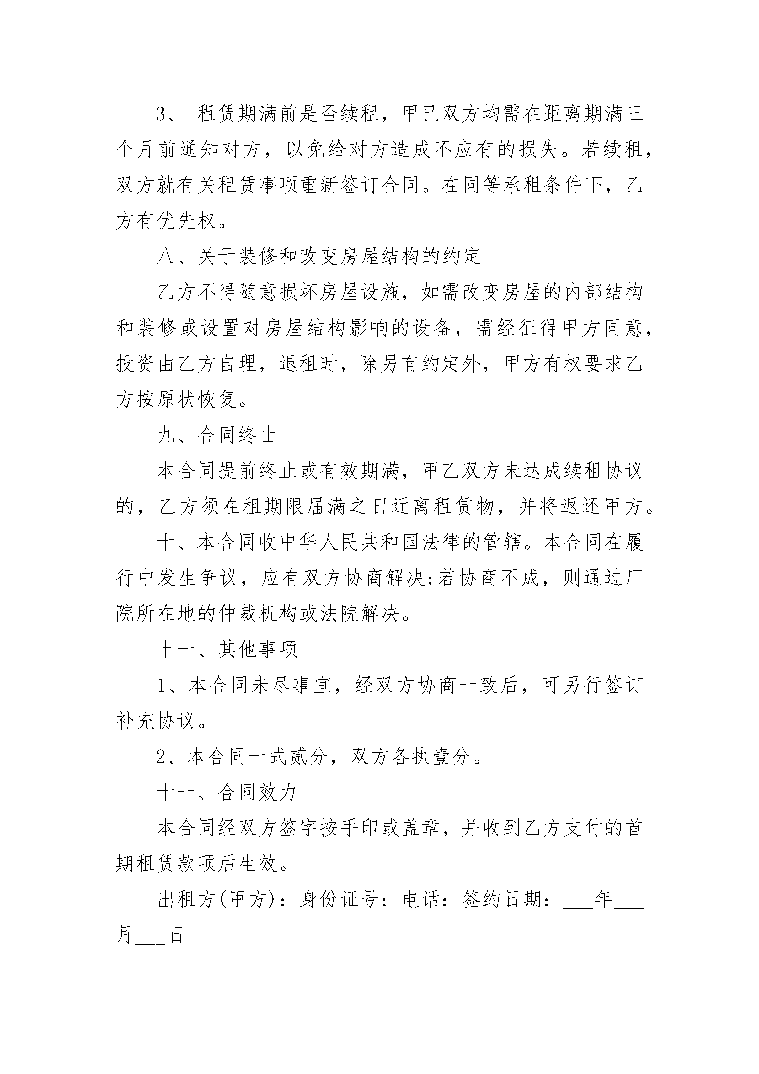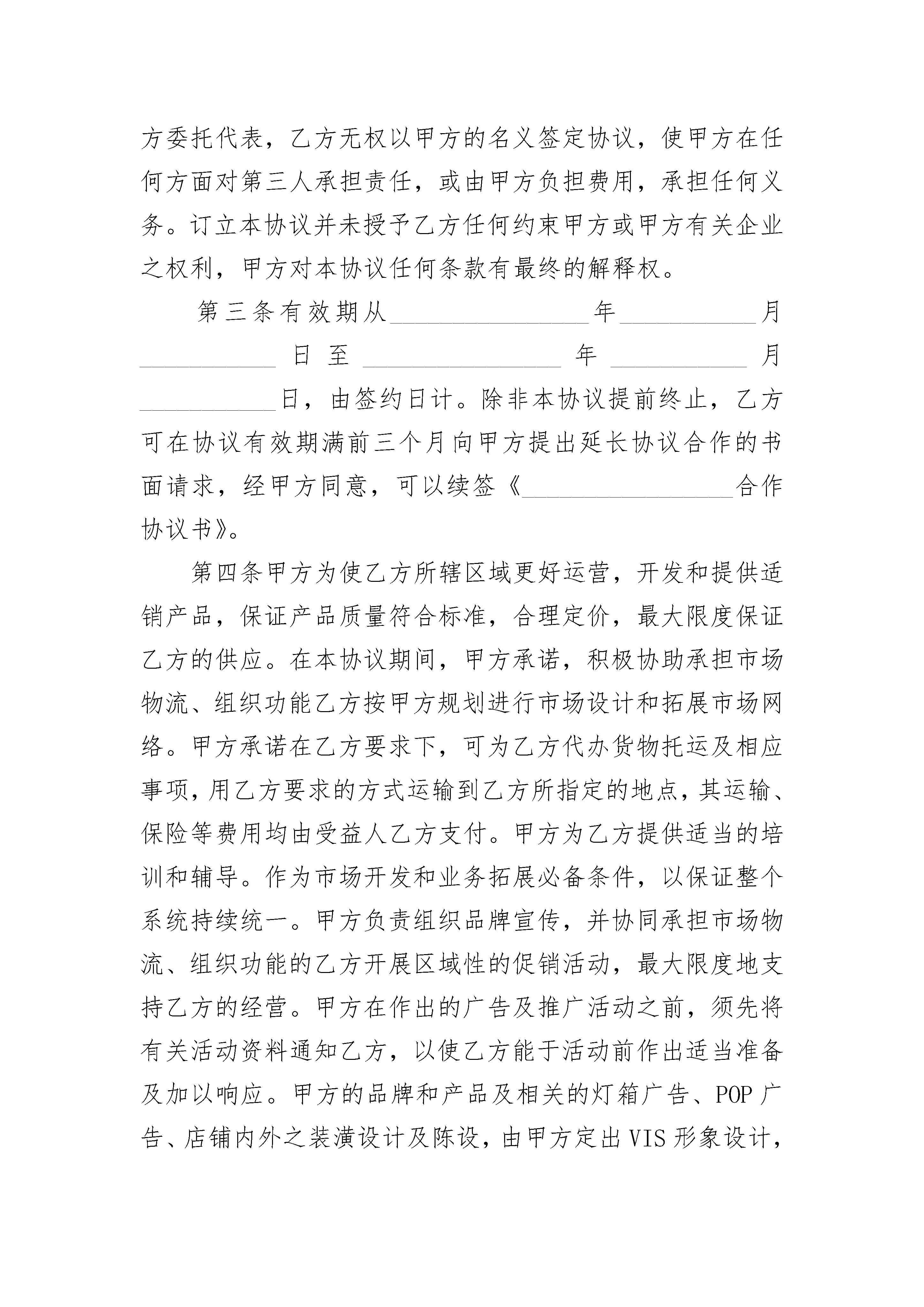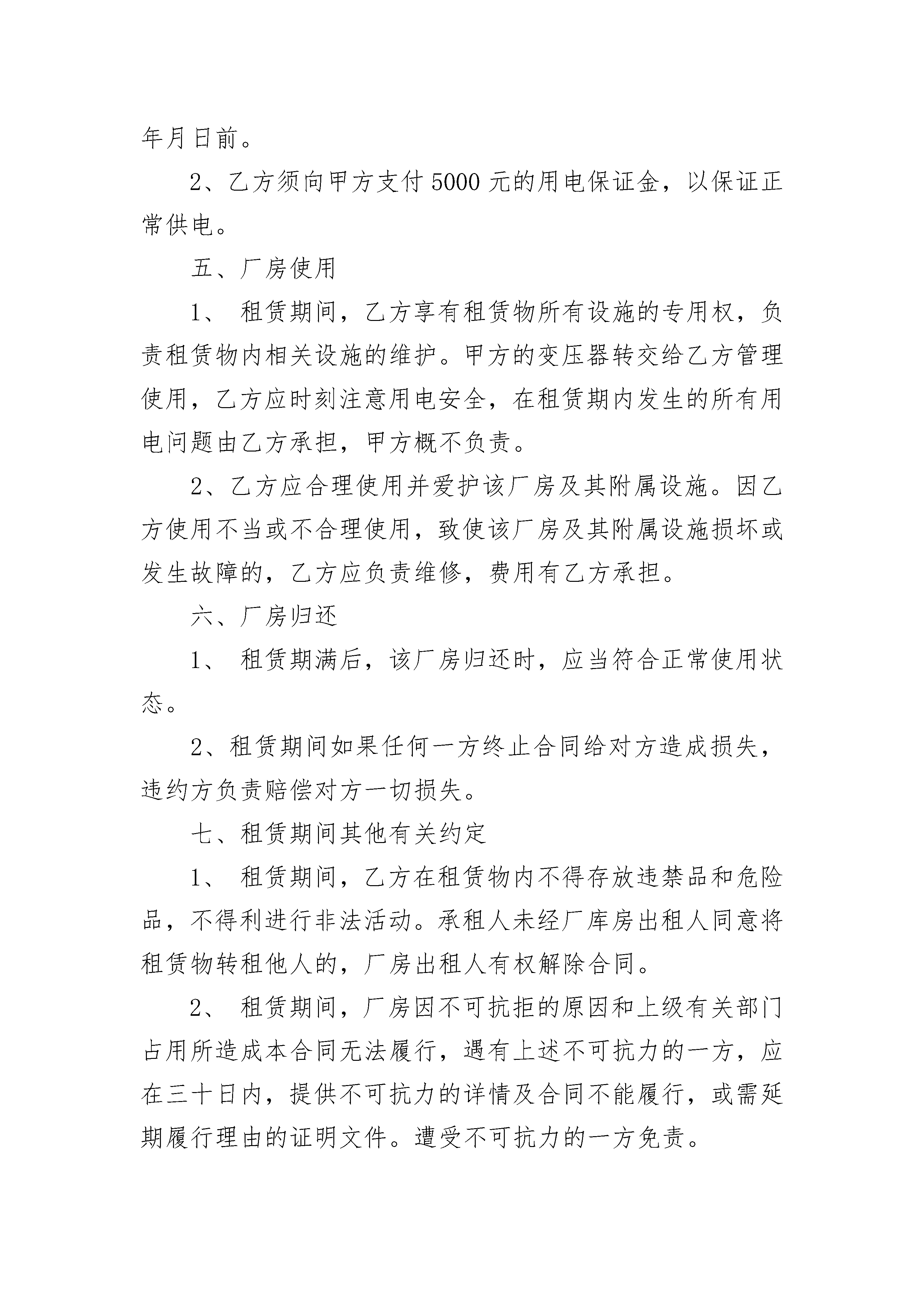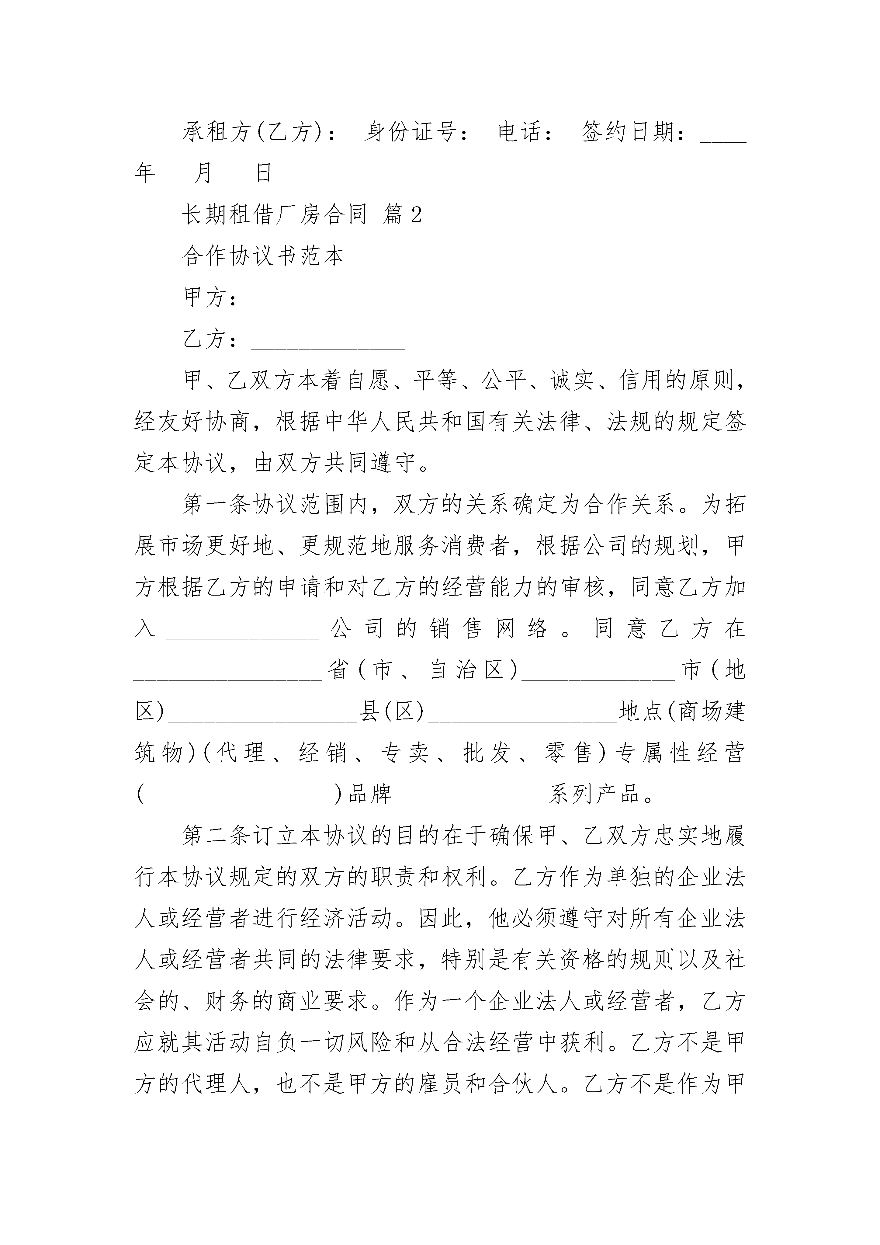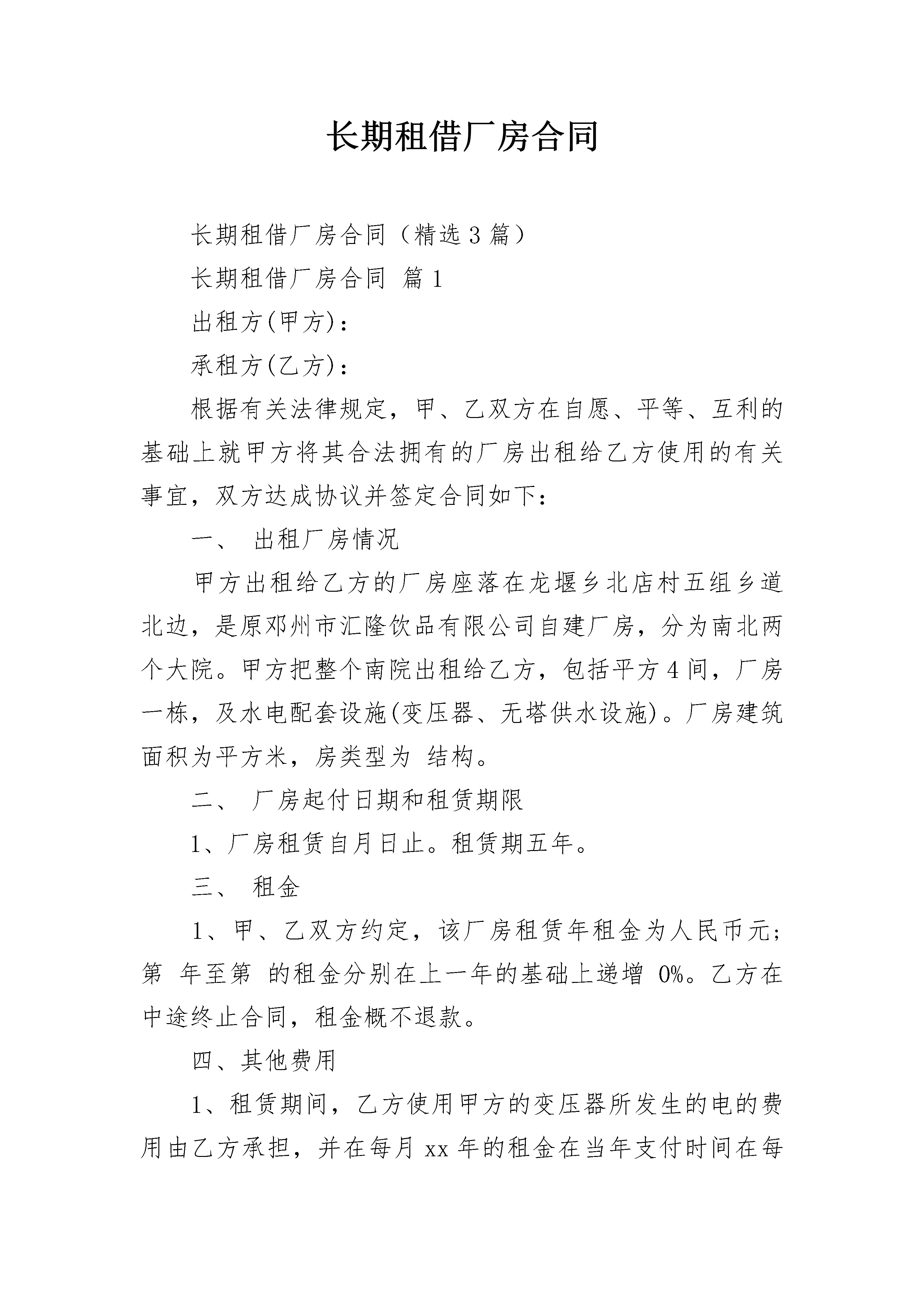 长期租借厂房合同长期租借厂房合同(精选3篇)长期租借厂房合同篇1出租方(甲方):承租方(乙方):根据有关法律规定,甲、乙双方在自愿、平等、互利的基础上就甲方将其合法拥有的厂房出租给乙方使用的有关事宜,双方达成协议并签定合同如下:一、出租厂房情况甲方出租给乙方的厂房座落在龙堰乡北店村五组乡道北边,是原邓州市汇隆饮品有限公司自建厂房,分为南北两个大院。甲方把整个南院出租给乙方,包括平方4间,厂房一栋,及水电配套设施(变压器、无塔供水设施)。厂房建筑面积为平方米,房类型为结构。二、厂房起付日期和租赁期限1、厂房租赁自月日止。租赁期五年。三、租金1、甲、乙双方约定,该厂房租赁年租金为人民币元;第年至第的租金分别在上一年的基础上递增0%。乙方在中途终止合同,租金概不退款。四、其他费用1、租赁期间,乙方使用甲方的变压器所发生的电的费用由乙方承担,并在每月xx年的租金在当年支付时间在每年月日前。2、乙方须向甲方支付5000元的用电保证金,以保证正常供电。五、厂房使用1、租赁期间,乙方享有租赁物所有设施的专用权,负责租赁物内相关设施的维护。甲方的变压器转交给乙方管理使用,乙方应时刻注意用电安全,在租赁期内发生的所有用电问题由乙方承担,甲方概不负责。2、乙方应合理使用并爱护该厂房及其附属设施。因乙方使用不当或不合理使用,致使该厂房及其附属设施损坏或发生故障的,乙方应负责维修,费用有乙方承担。六、厂房归还1、租赁期满后,该厂房归还时,应当符合正常使用状态。2、租赁期间如果任何一方终止合同给对方造成损失,违约方负责赔偿对方一切损失。七、租赁期间其他有关约定1、租赁期间,乙方在租赁物内不得存放违禁品和危险品,不得利进行非法活动。承租人未经厂库房出租人同意将租赁物转租他人的,厂房出租人有权解除合同。2、租赁期间,厂房因不可抗拒的原因和上级有关部门占用所造成本合同无法履行,遇有上述不可抗力的一方,应在三十日内,提供不可抗力的详情及合同不能履行,或需延期履行理由的证明文件。遭受不可抗力的一方免责。3、租赁期满前是否续租,甲已双方均需在距离期满三个月前通知对方,以免给对方造成不应有的损失。若续租,双方就有关租赁事项重新签订合同。在同等承租条件下,乙方有优先权。八、关于装修和改变房屋结构的约定乙方不得随意损坏房屋设施,如需改变房屋的内部结构和装修或设置对房屋结构影响的设备,需经征得甲方同意,投资由乙方自理,退租时,除另有约定外,甲方有权要求乙方按原状恢复。九、合同终止本合同提前终止或有效期满,甲乙双方未达成续租协议的,乙方须在租期限届满之日迁离租赁物,并将返还甲方。十、本合同收中华人民共和国法律的管辖。本合同在履行中发生争议,应有双方协商解决;若协商不成,则通过厂院所在地的仲裁机构或法院解决。十一、其他事项1、本合同未尽事宜,经双方协商一致后,可另行签订补充协议。2、本合同一式贰分,双方各执壹分。十一、合同效力本合同经双方签字按手印或盖章,并收到乙方支付的首期租赁款项后生效。出租方(甲方):身份证号:电话:签约日期:___年___月___日承租方(乙方):身份证号:电话:签约日期:____年___月___日长期租借厂房合同篇2合作协议书范本甲方:_____________乙方:_____________甲、乙双方本着自愿、平等、公平、诚实、信用的原则,经友好协商,根据中华人民共和国有关法律、法规的规定签定本协议,由双方共同遵守。第一条协议范围内,双方的关系确定为合作关系。为拓展市场更好地、更规范地服务消费者,根据公司的规划,甲方根据乙方的申请和对乙方的经营能力的审核,同意乙方加入_____________公司的销售网络。同意乙方在________________省(市、自治区)_____________市(地区)________________县(区)________________地点(商场建筑物)(代理、经销、专卖、批发、零售)专属性经营(________________)品牌_____________系列产品。第二条订立本协议的目的在于确保甲、乙双方忠实地履行本协议规定的双方的职责和权利。乙方作为单独的企业法人或经营者进行经济活动。因此,他必须遵守对所有企业法人或经营者共同的法律要求,特别是有关资格的规则以及社会的、财务的商业要求。作为一个企业法人或经营者,乙方应就其活动自负一切风险和从合法经营中获利。乙方不是甲方的代理人,也不是甲方的雇员和合伙人。乙方不是作为甲方委托代表,乙方无权以甲方的名义签定协议,使甲方在任何方面对第三人承担责任,或由甲方负担费用,承担任何义务。订立本协议并未授予乙方任何约束甲方或甲方有关企业之权利,甲方对本协议任何条款有最终的解释权。第三条有效期从________________年___________月__________